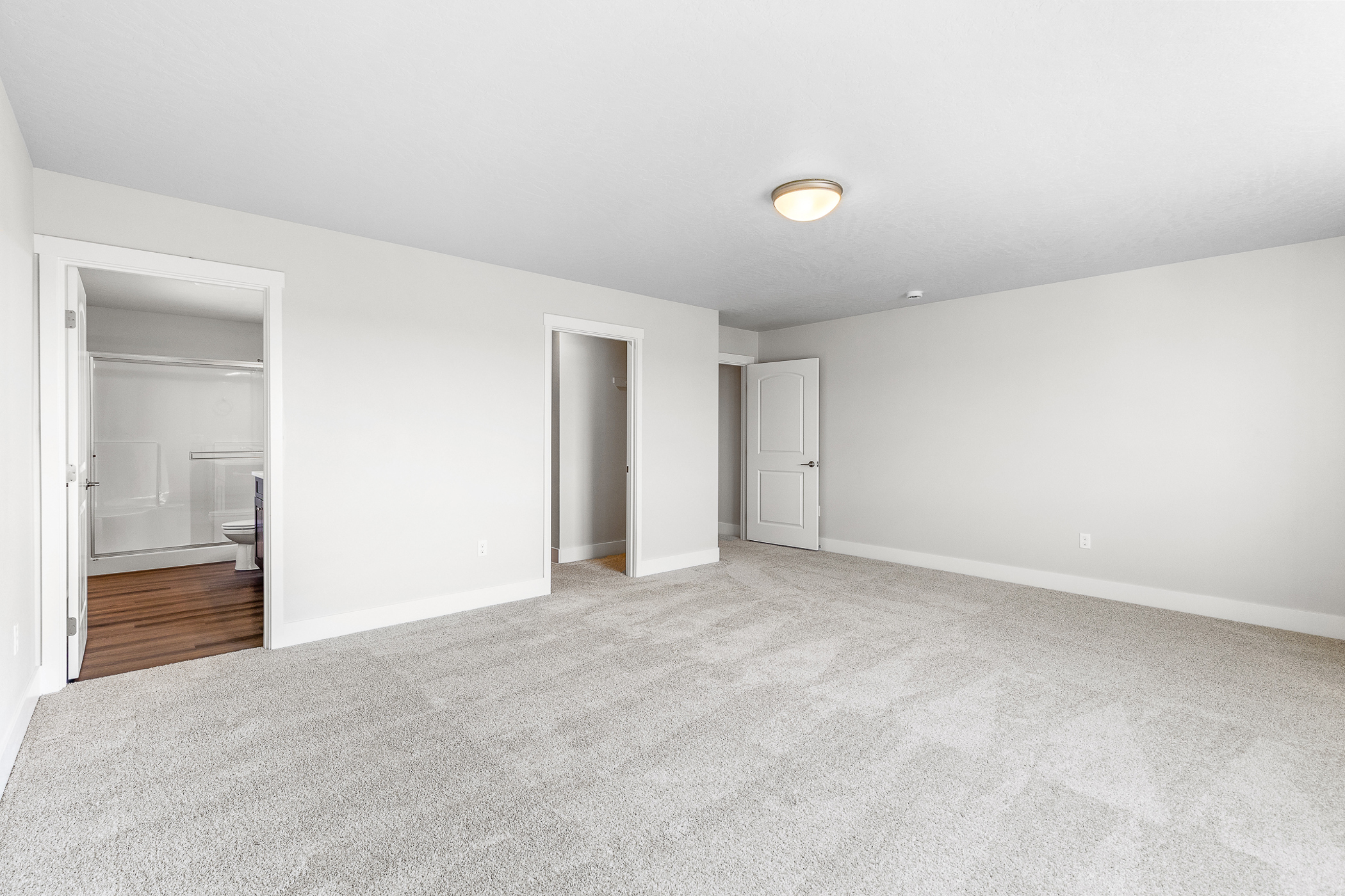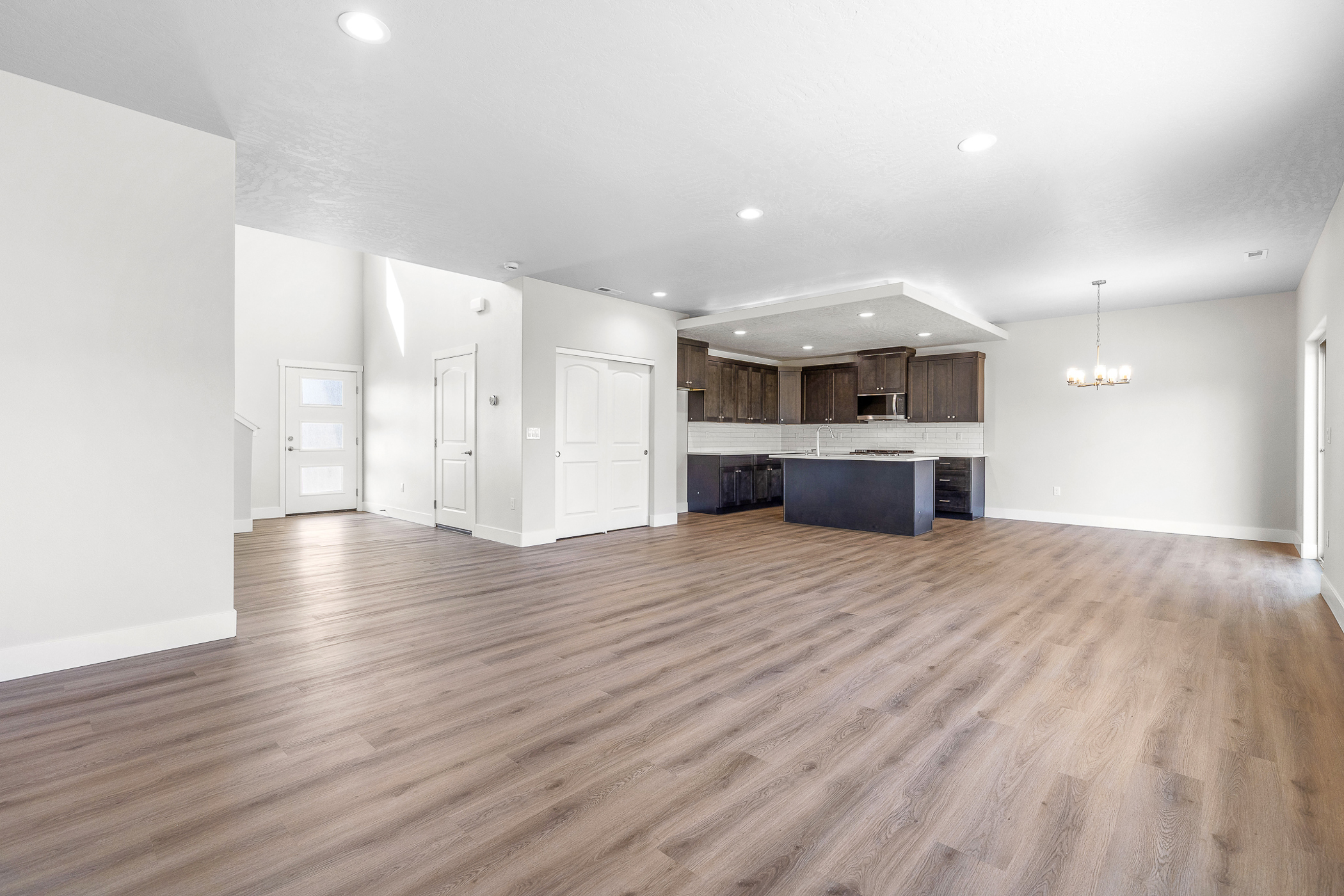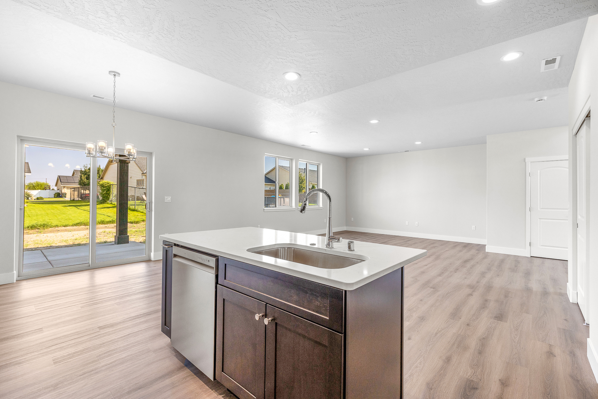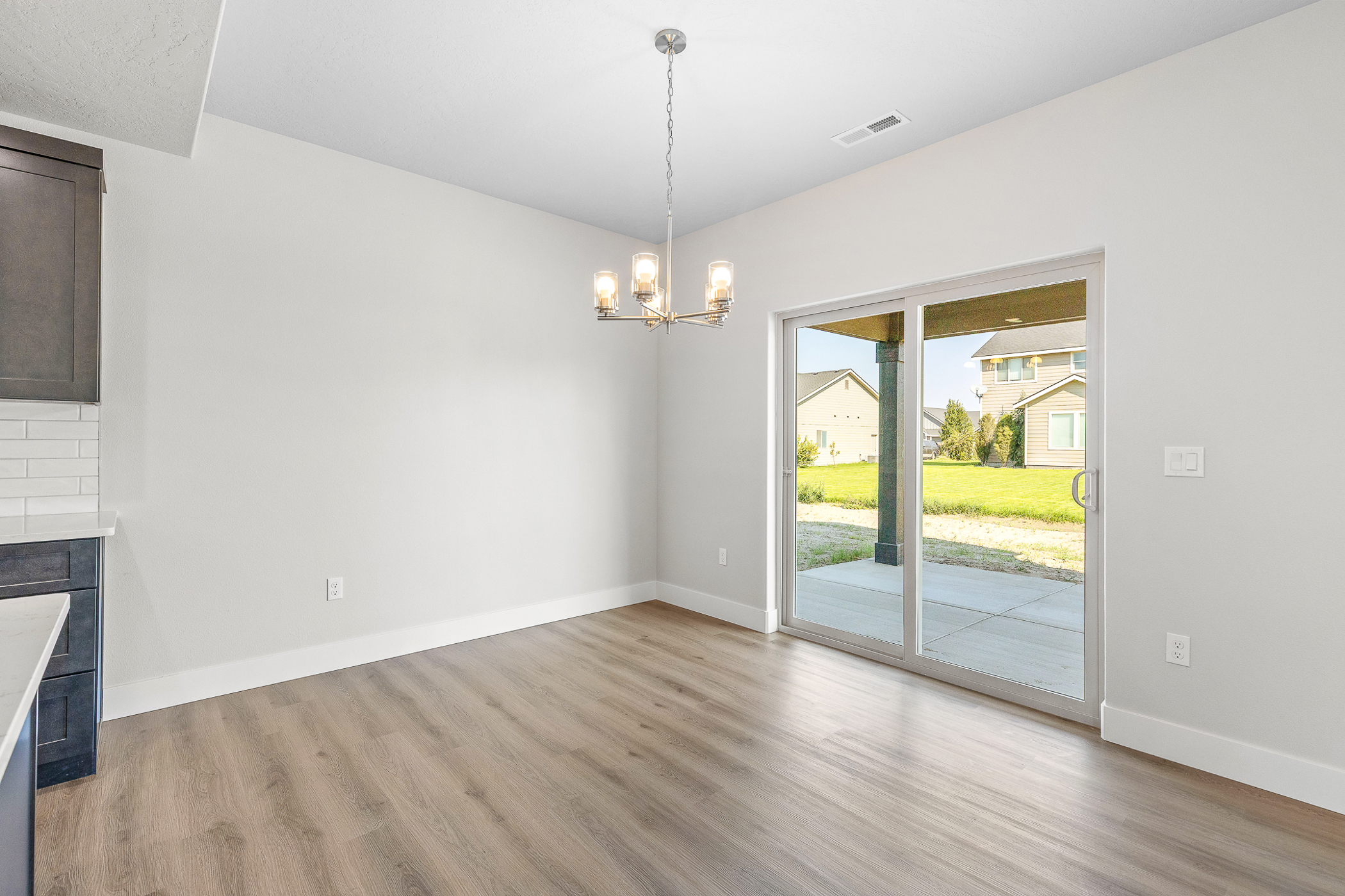 Designed with modern elegance, the 2061 plan features a spacious living area that flows into a well-appointed kitchen with modern appliances and a central island perfect for casual dining or entertainment. Sliding glass doors in the dining area effortlessly connect indoor and outdoor spaces.