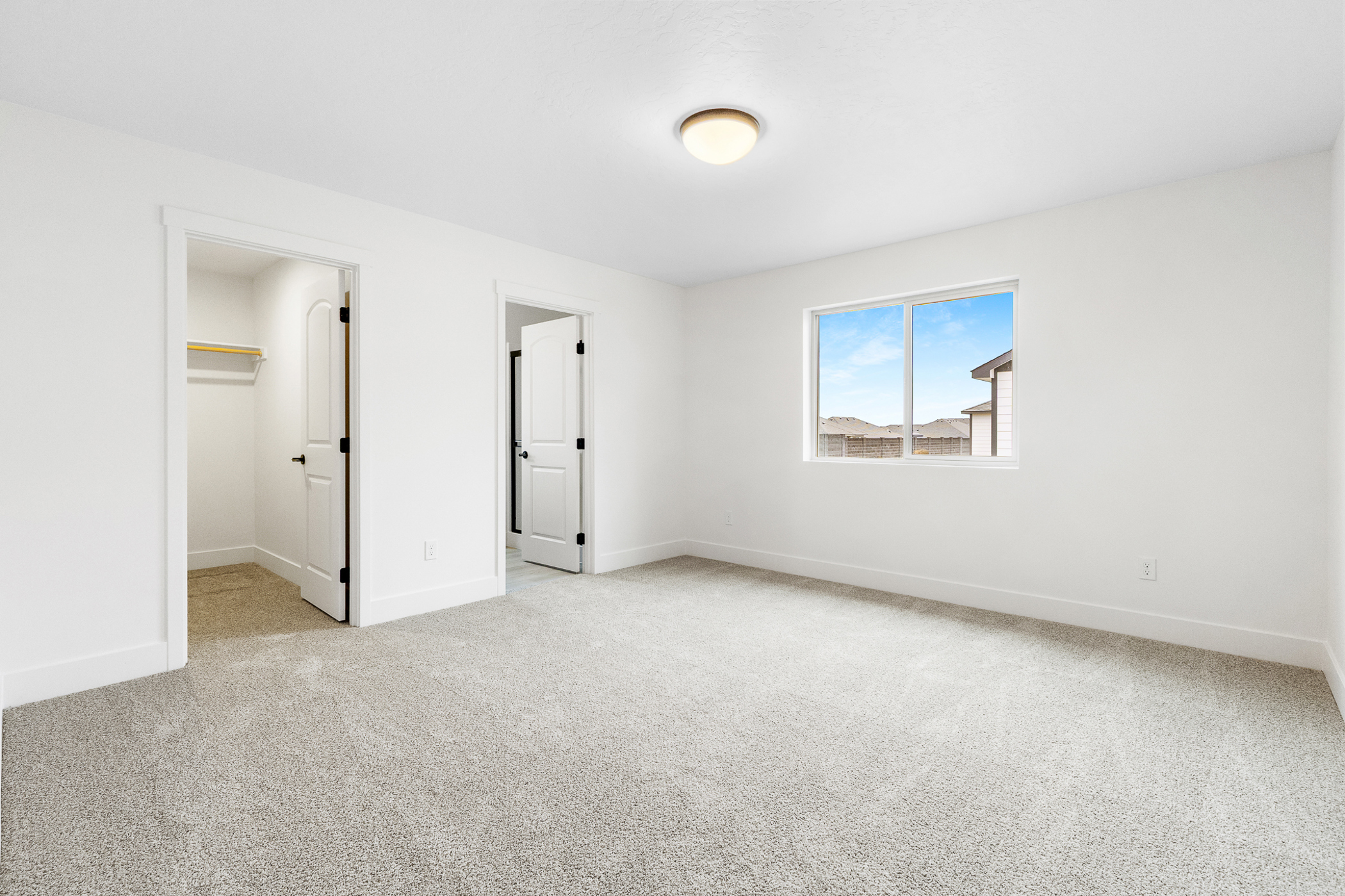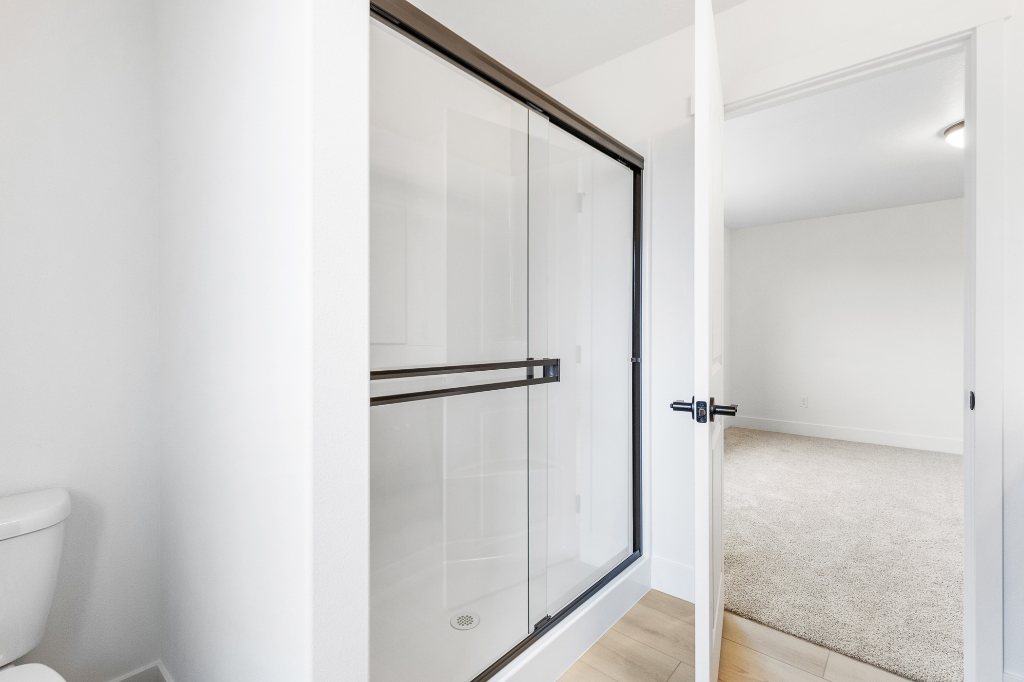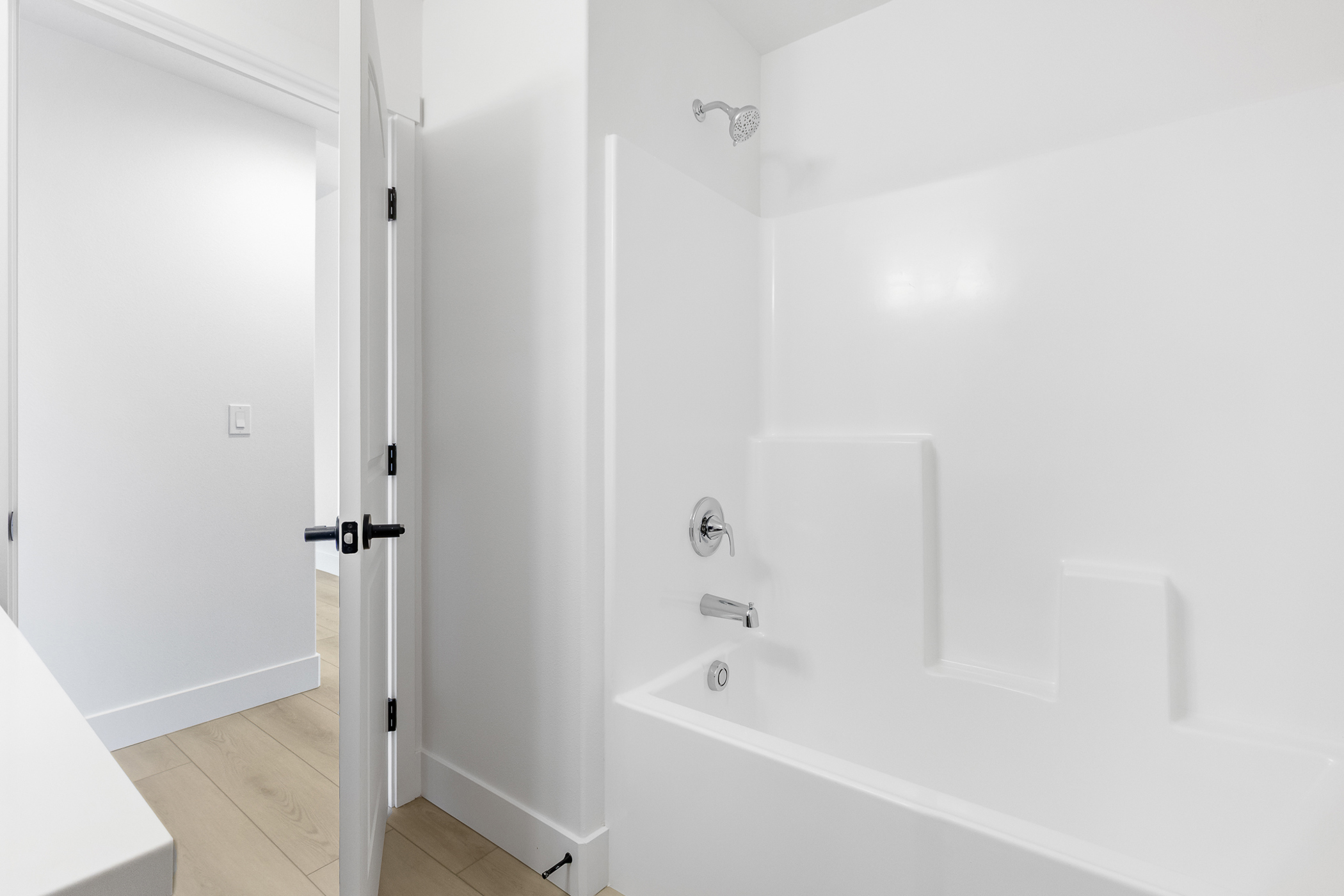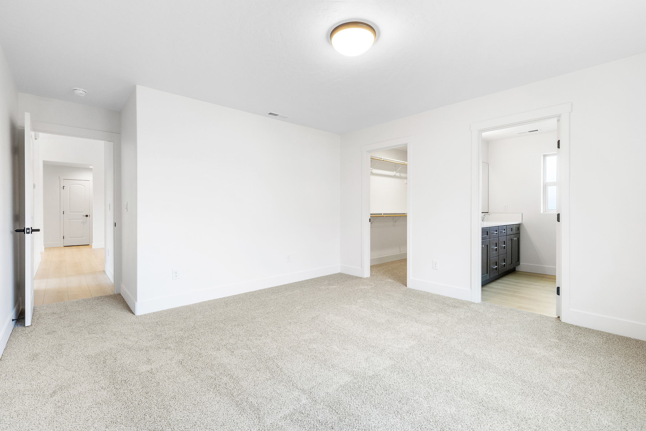 Retreat to the main suite featuring a dual vanity bathroom with options for a fiberglass shower or customizable tiled walls. Plus, indulge in the dream-worthy walk-in closet. At the opposite end, two bedrooms share a well-appointed bathroom.