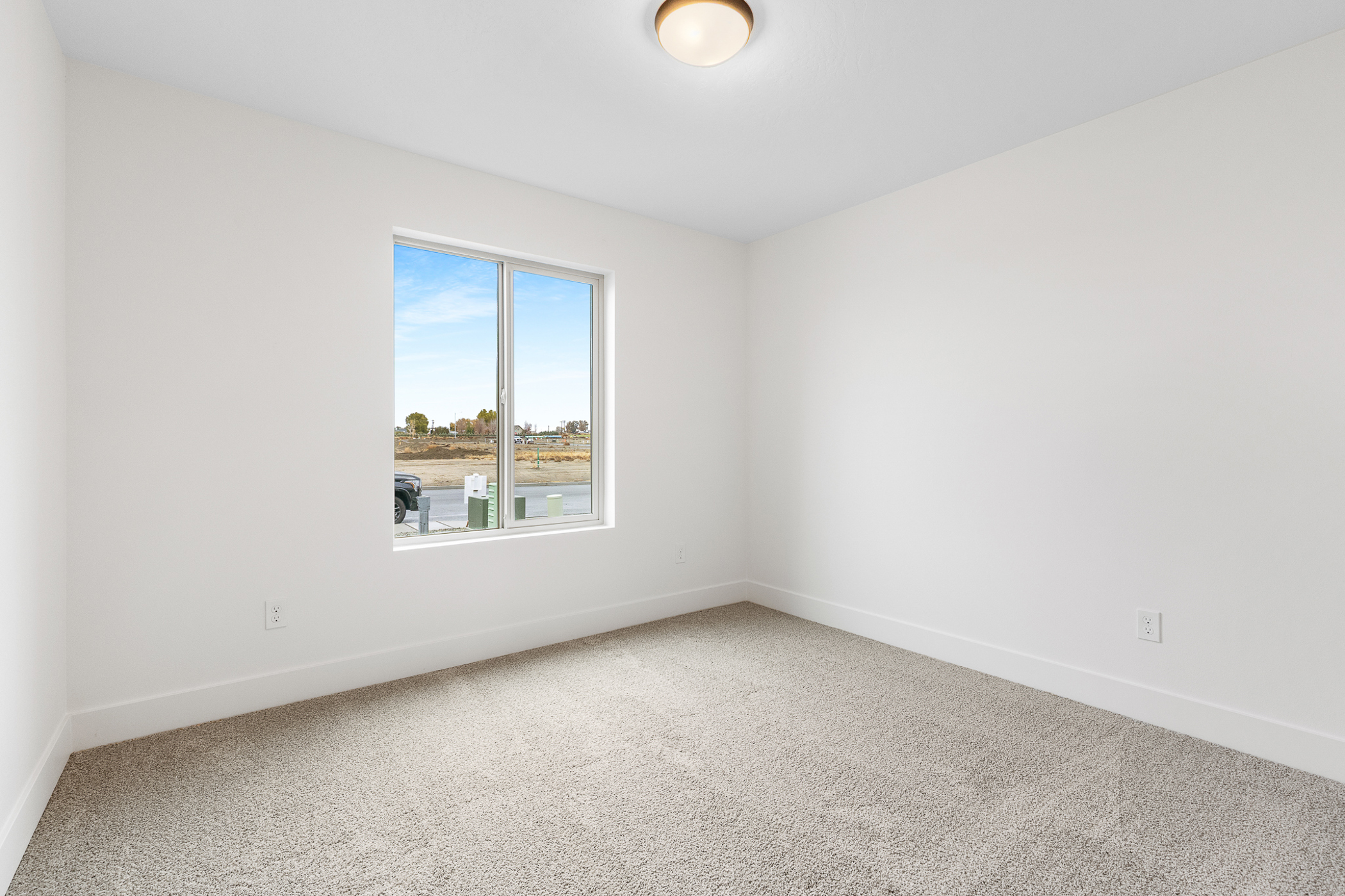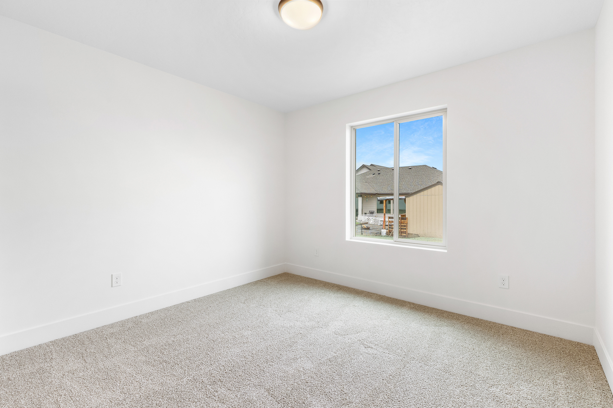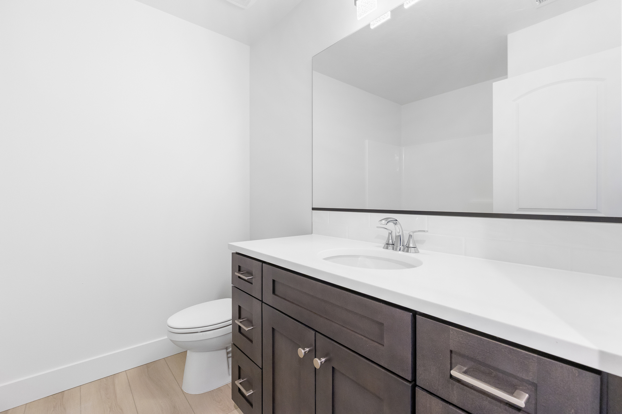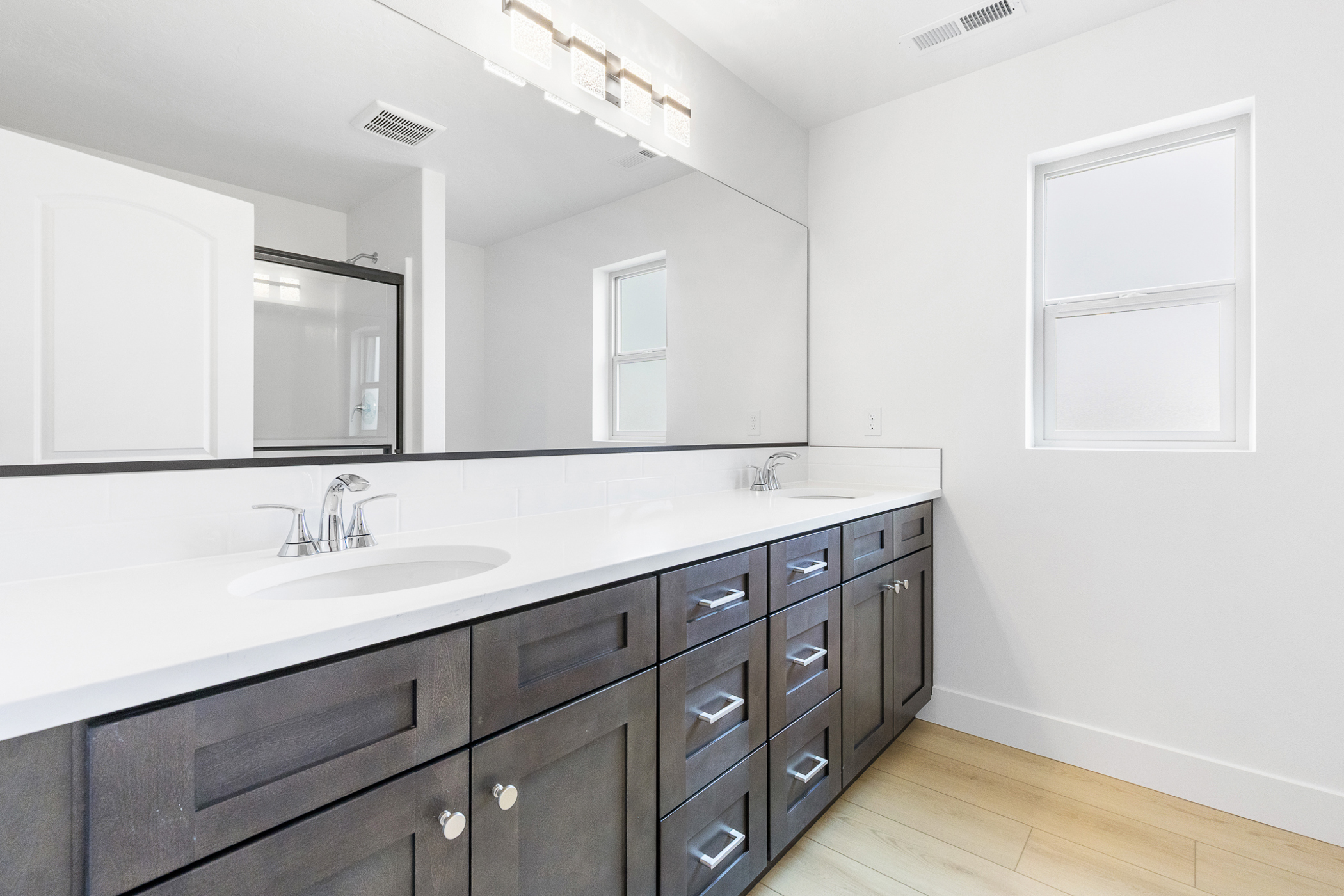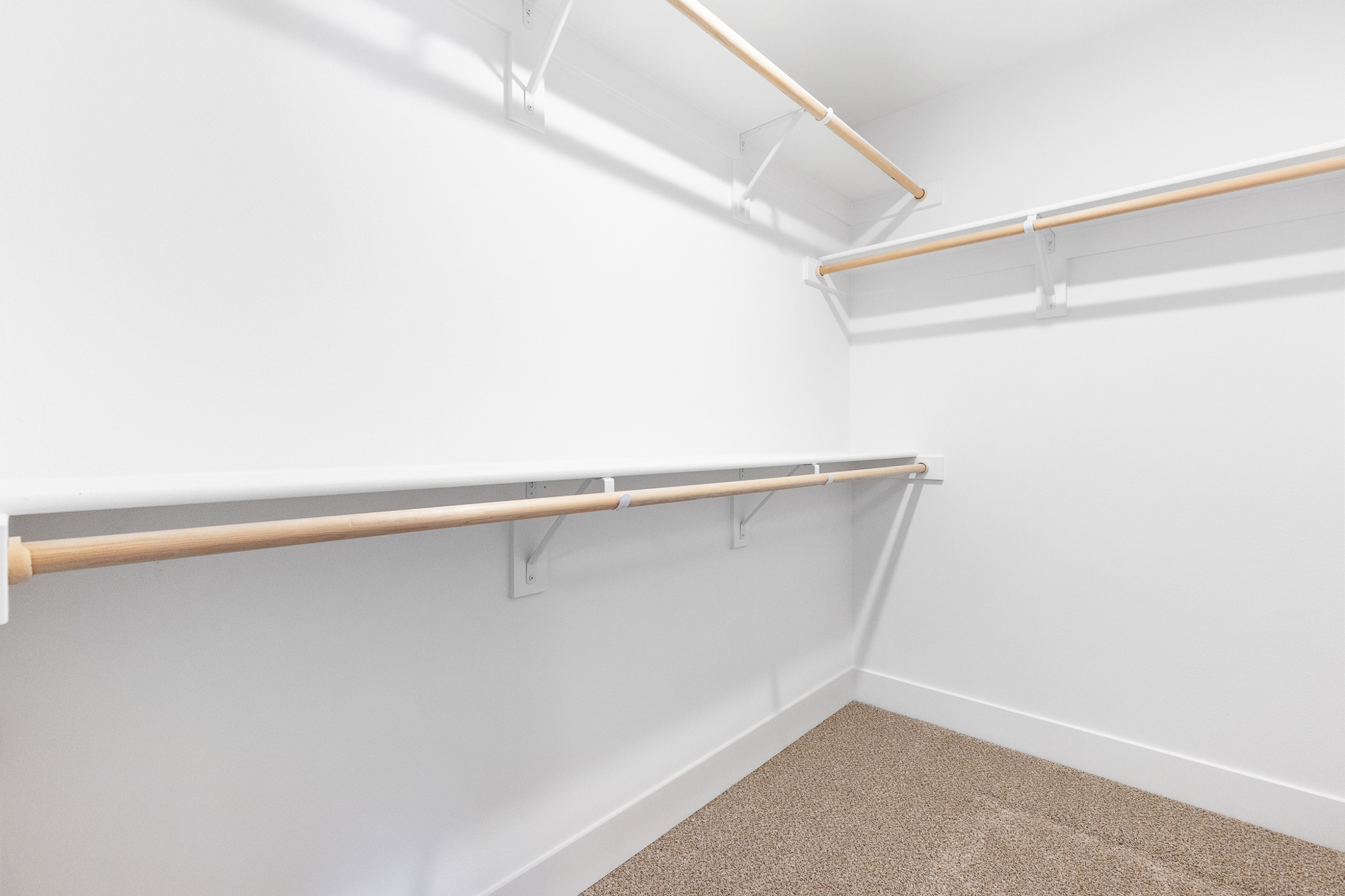 Retreat to the main suite featuring a dual vanity bathroom with options for a fiberglass shower or customizable tiled walls. Plus, indulge in the dream-worthy walk-in closet. At the opposite end, two bedrooms share a well-appointed bathroom.