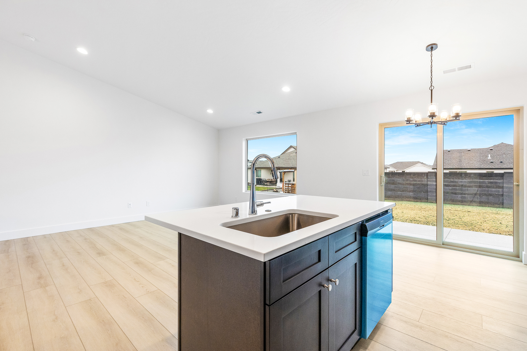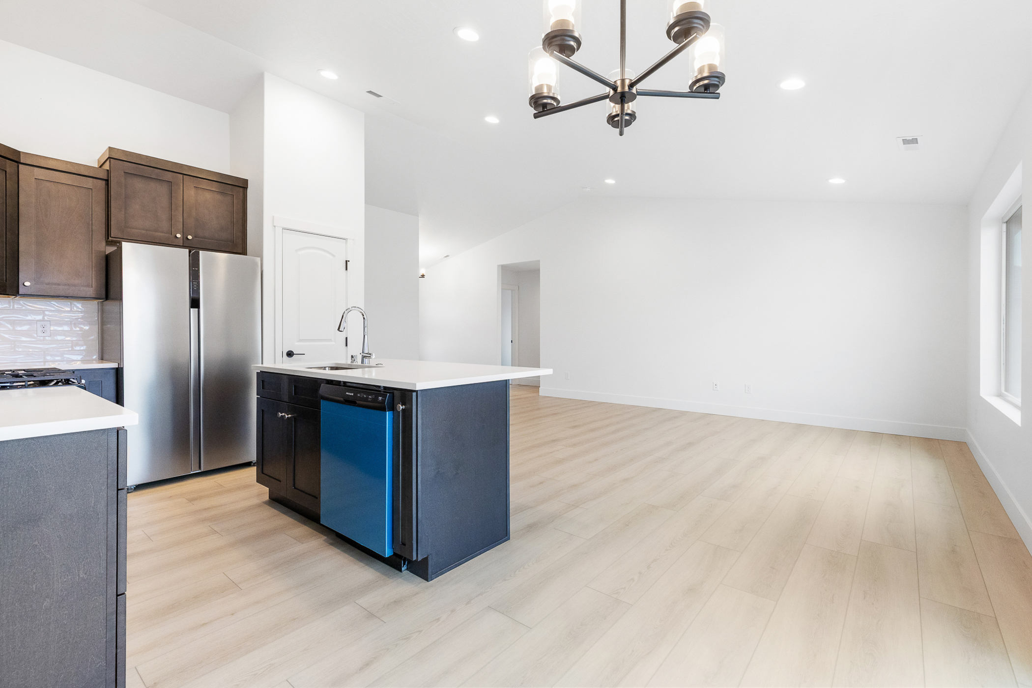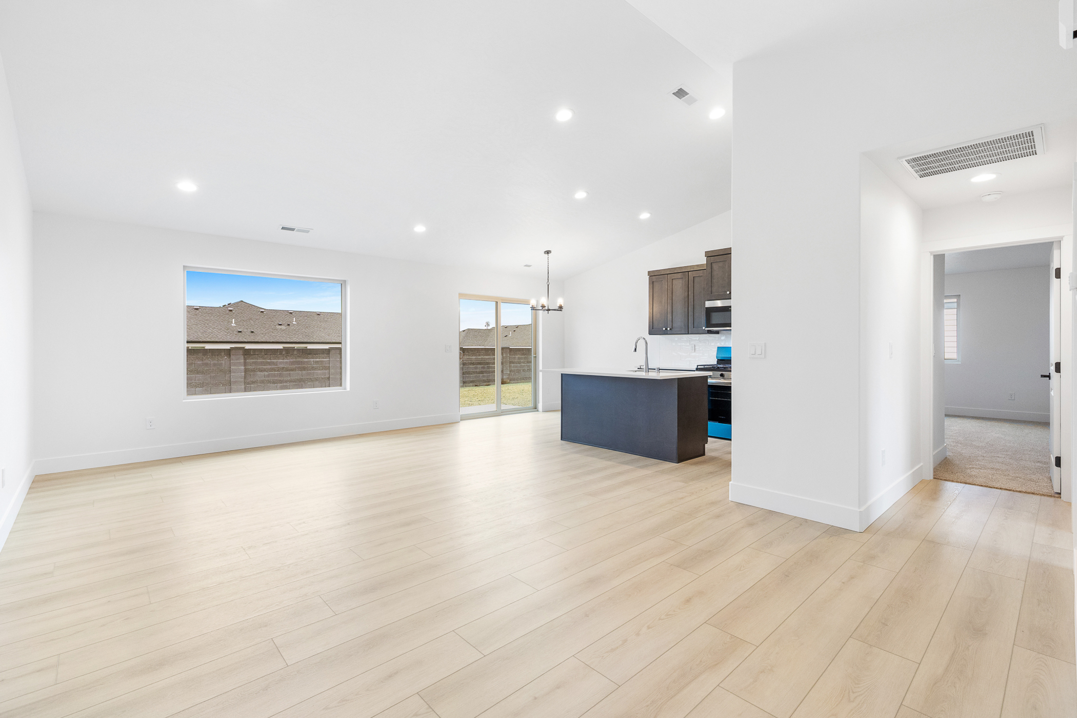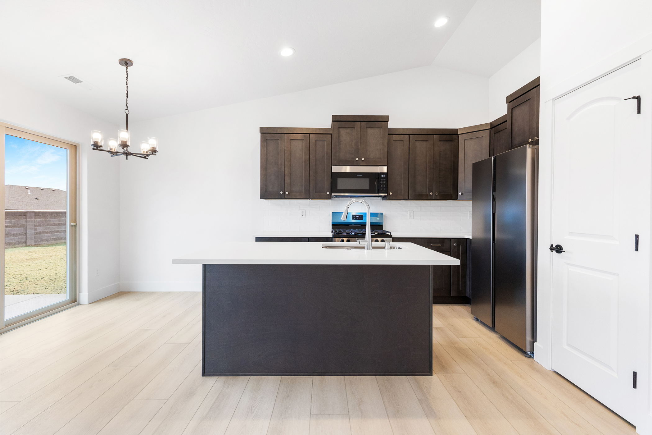 In the 1403 floor plan, you’ll be greeted by the grandeur of the high vaulted ceiling in the great room, seamlessly flowing into the spacious kitchen and dining area. Flooded with natural light from the large window and patio slide door, this space feels open and inviting. Conveniently located near the garage entrance, the laundry room offers ease and functionality.