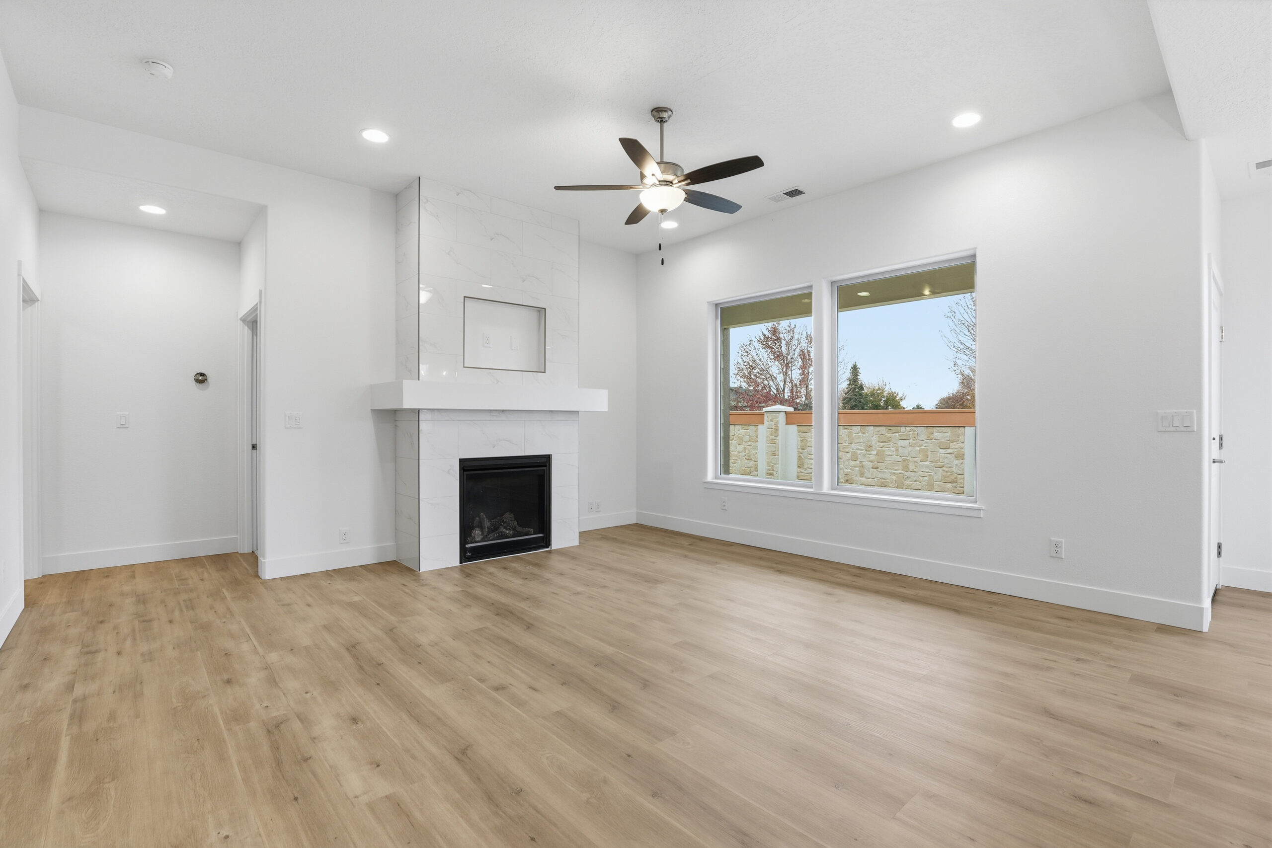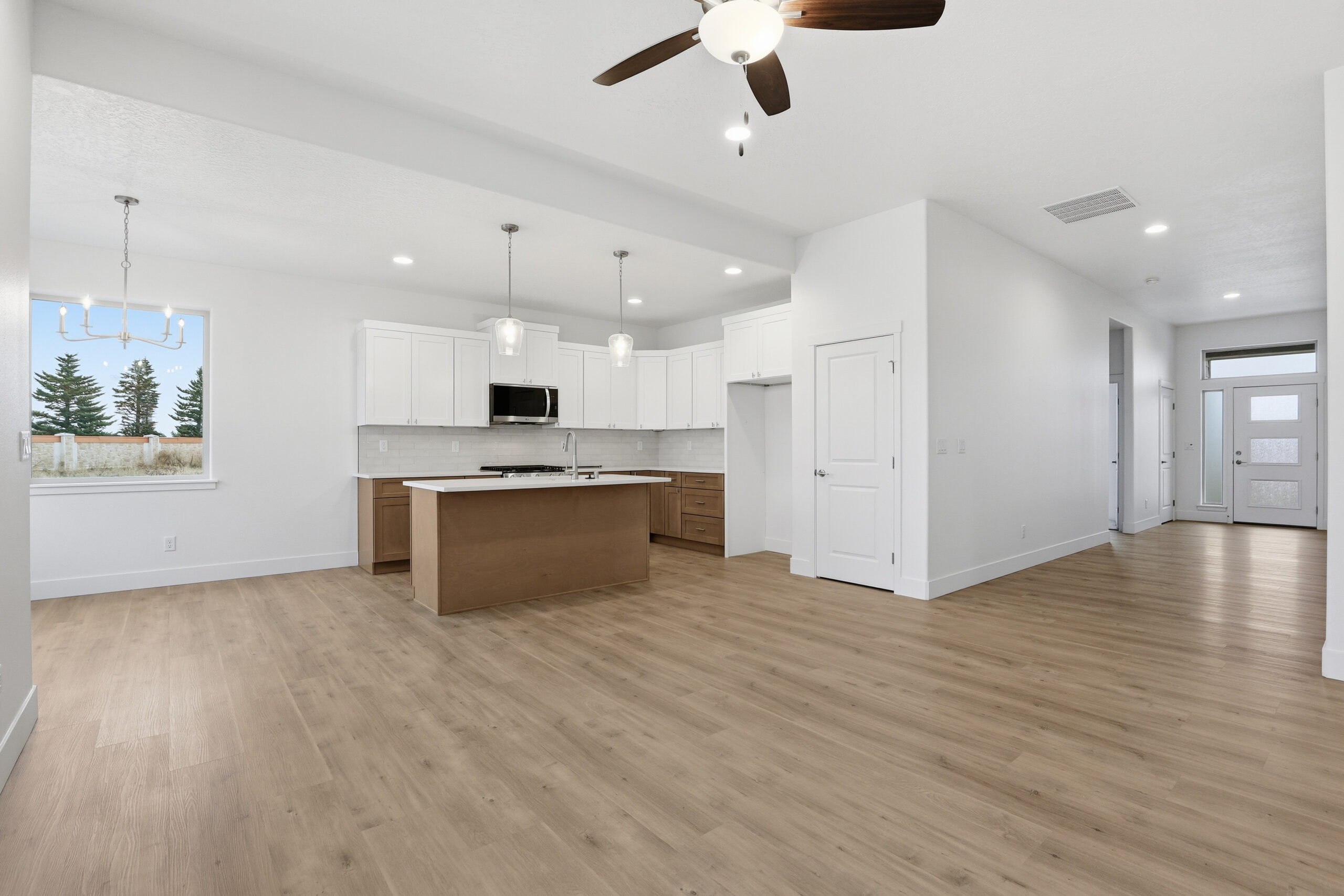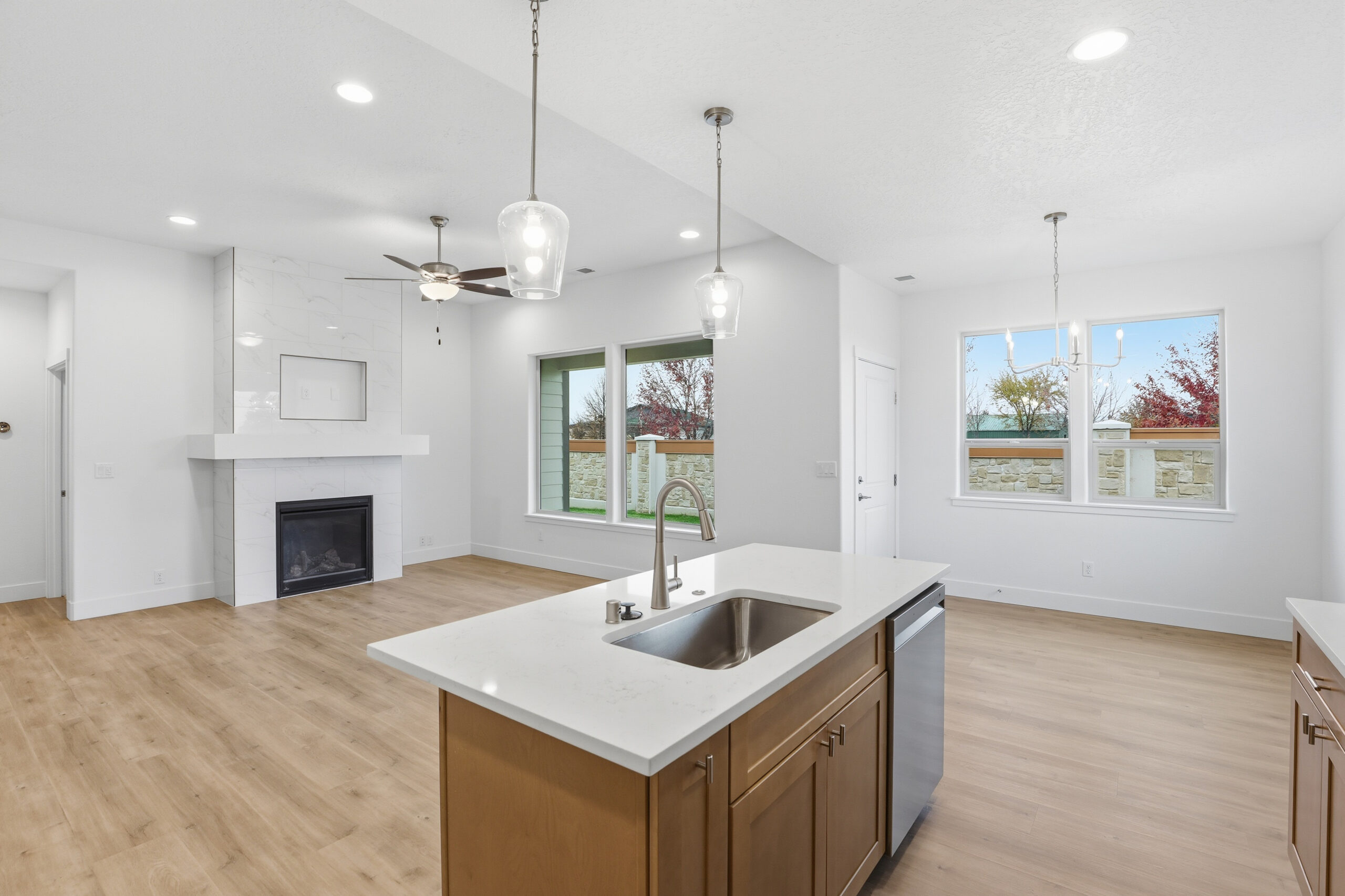 The spacious open design of the 1603 plan effortlessly links the kitchen and great room, creating a warm and inviting dining area ideal for memorable gatherings. The kitchen features an L-shaped layout that provides generous counter space, a convenient island, and a thoughtfully tucked-away pantry with custom wooden shelving.