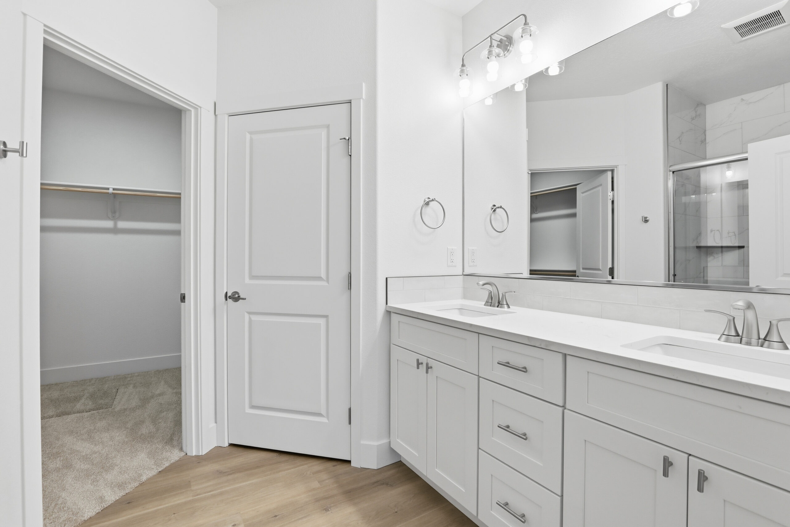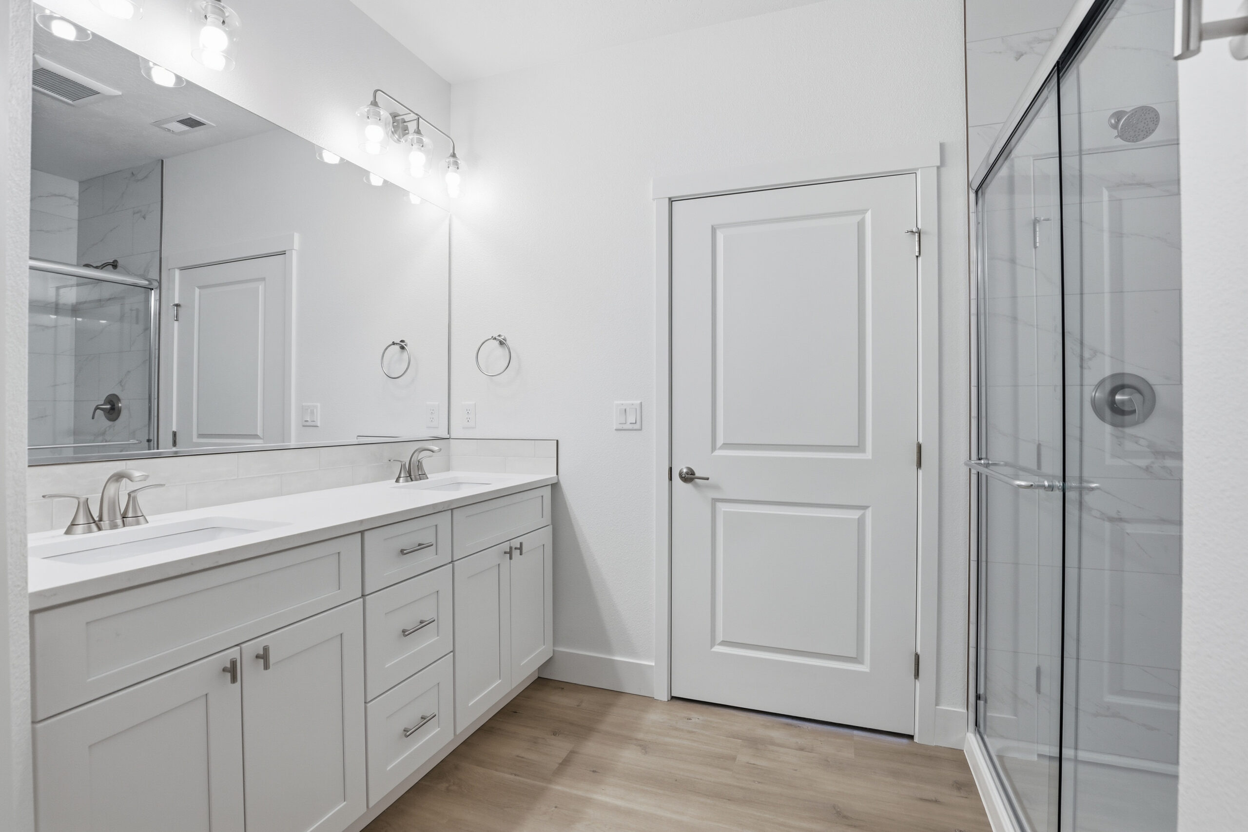 Walk-in shower with tile surround and fiberglass pan in master bath