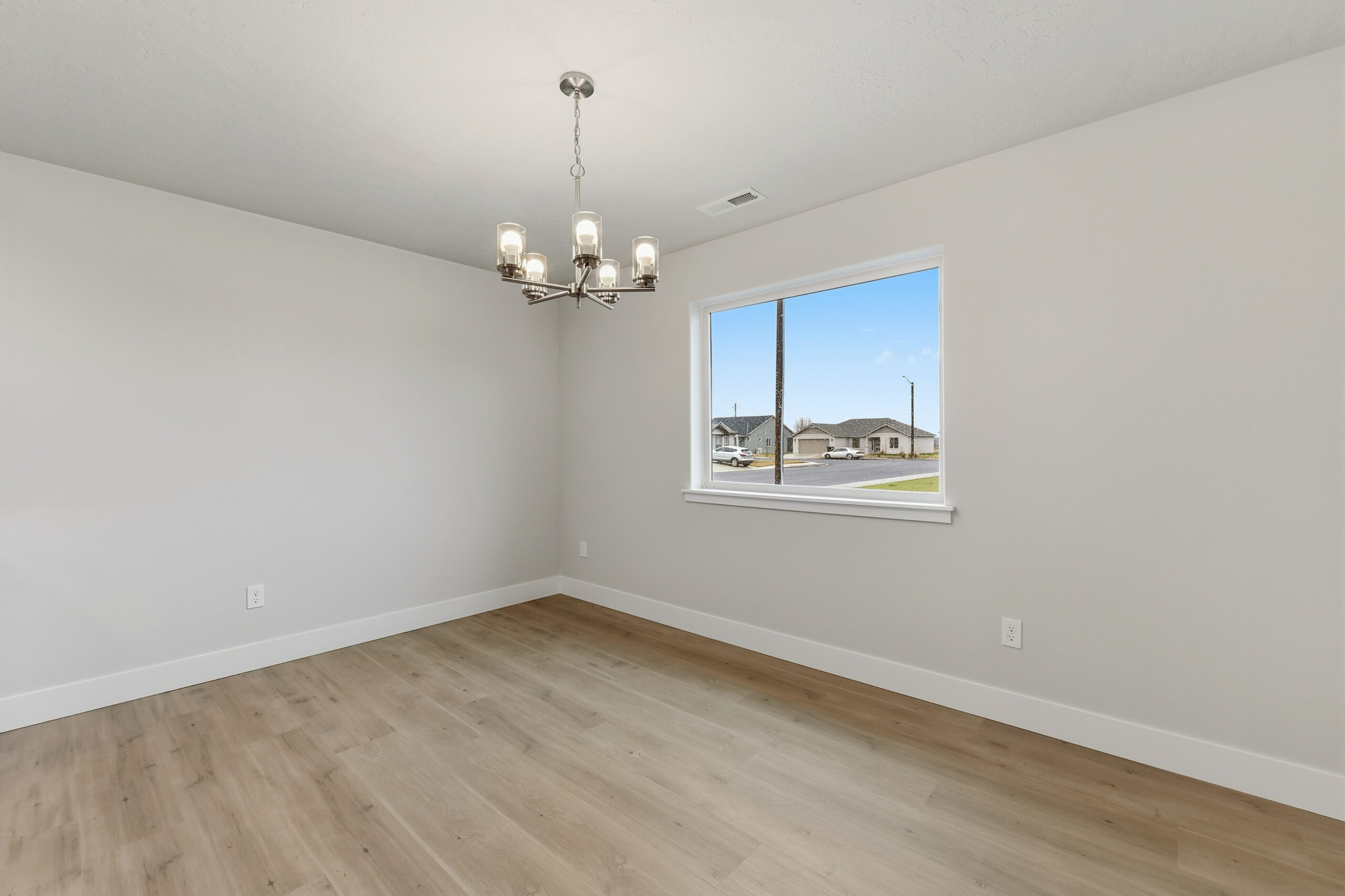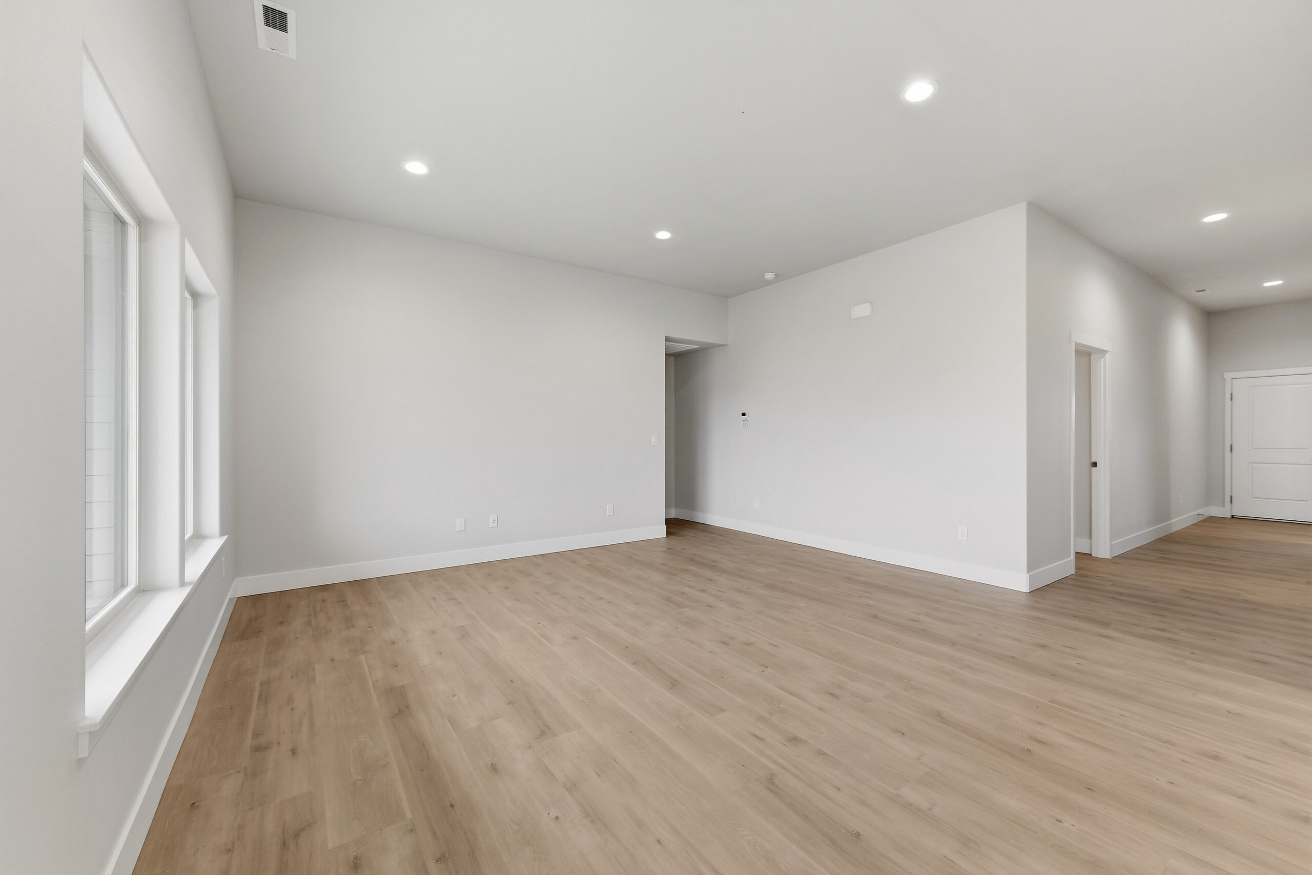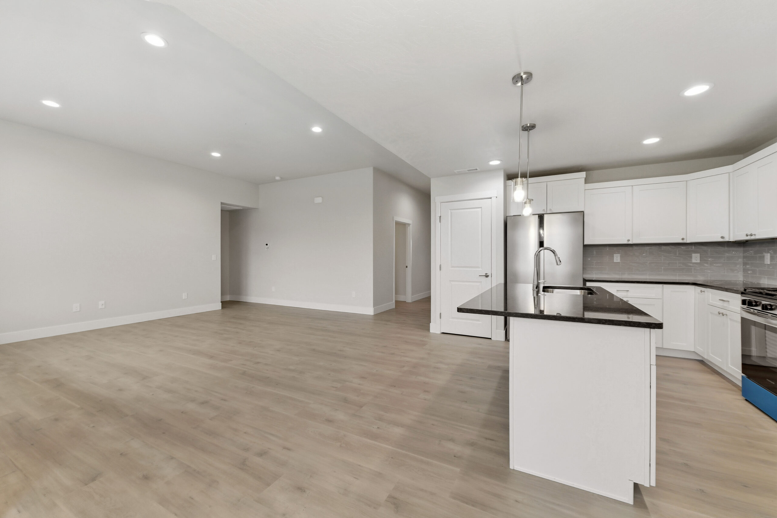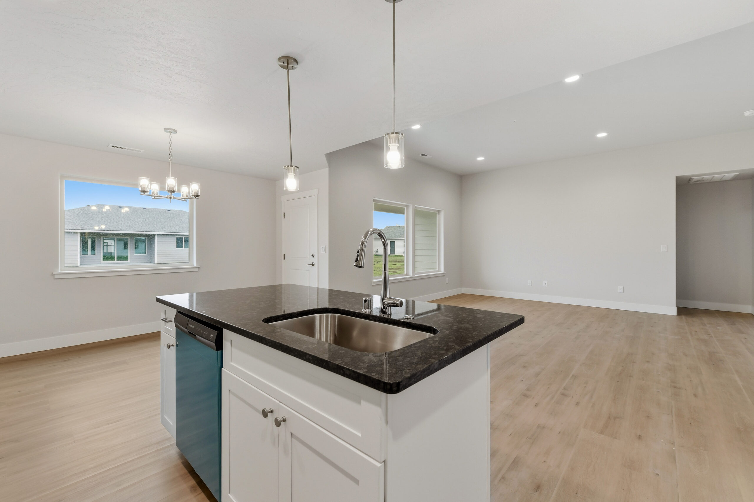 Airy open space in the 1598 floor plan seamlessly connects the kitchen and great room, while maintaining a warm ambiance in the dining area for memorable gatherings. The kitchen offers an L-shaped layout, offering ample counter space, a convenient island, and a discreetly tucked pantry with custom wooden shelfing.