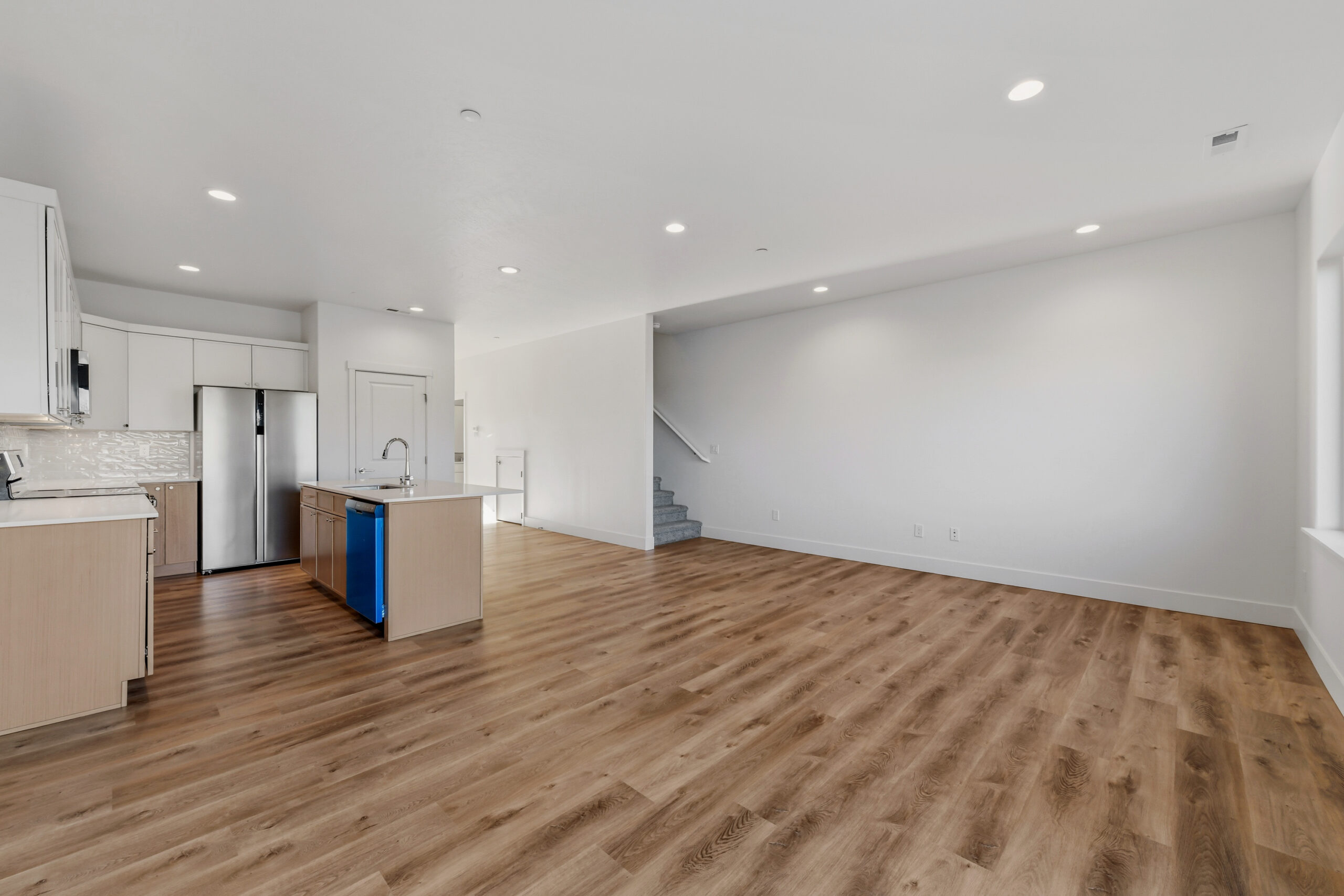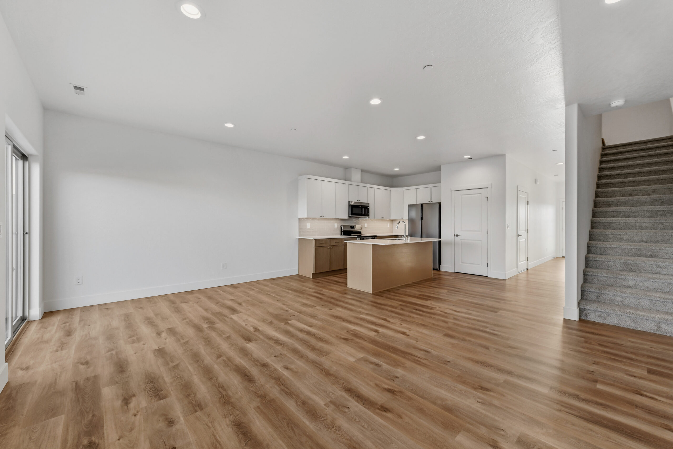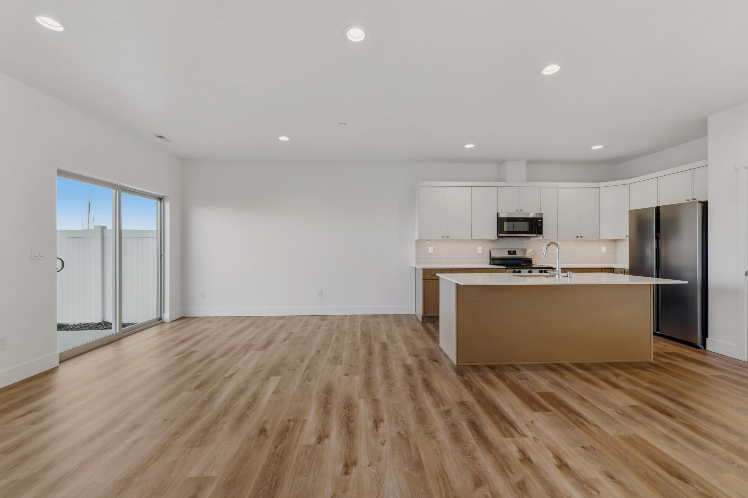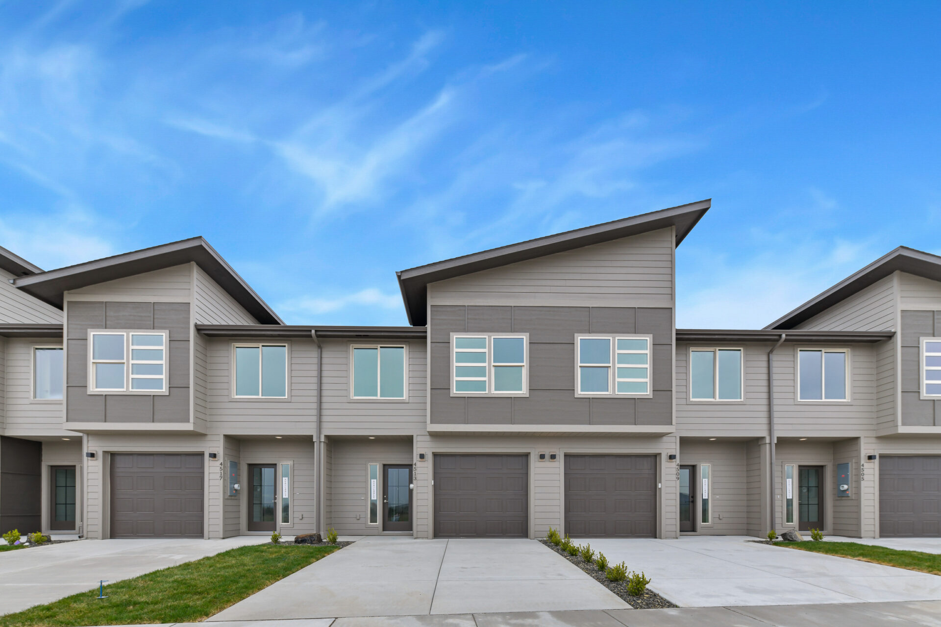 This thoughtfully designed 1,673 sq. ft. townhouse plan offers a spacious and functional layout ideal for modern living. Upon entry, a convenient half bathroom and access to the garage lead into an expansive open-concept main floor featuring a well-appointed kitchen with a large island, flowing seamlessly into the dining and living areas—perfect for everyday living and entertaining. Sliding doors open to a private outdoor patio, extending the living space.