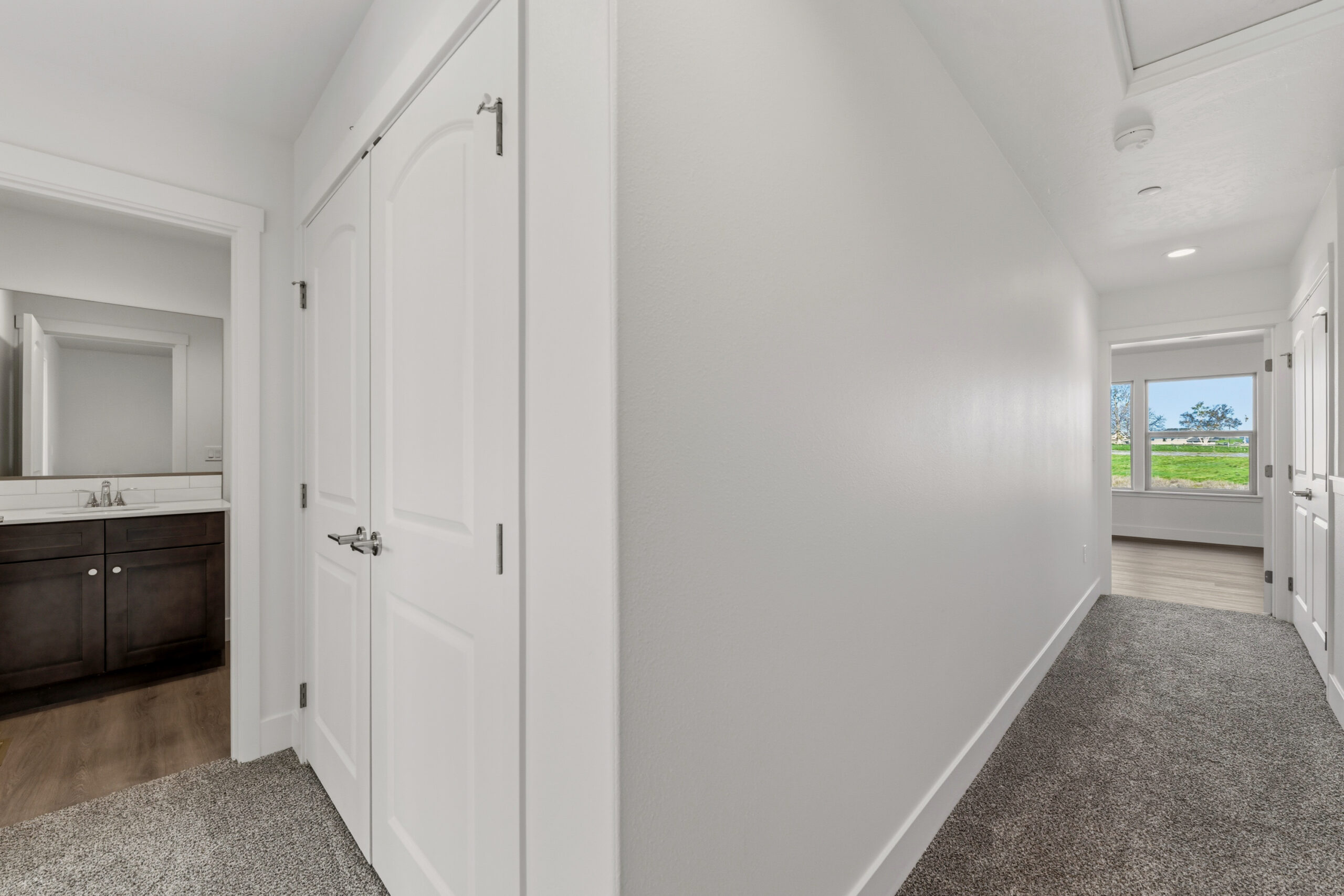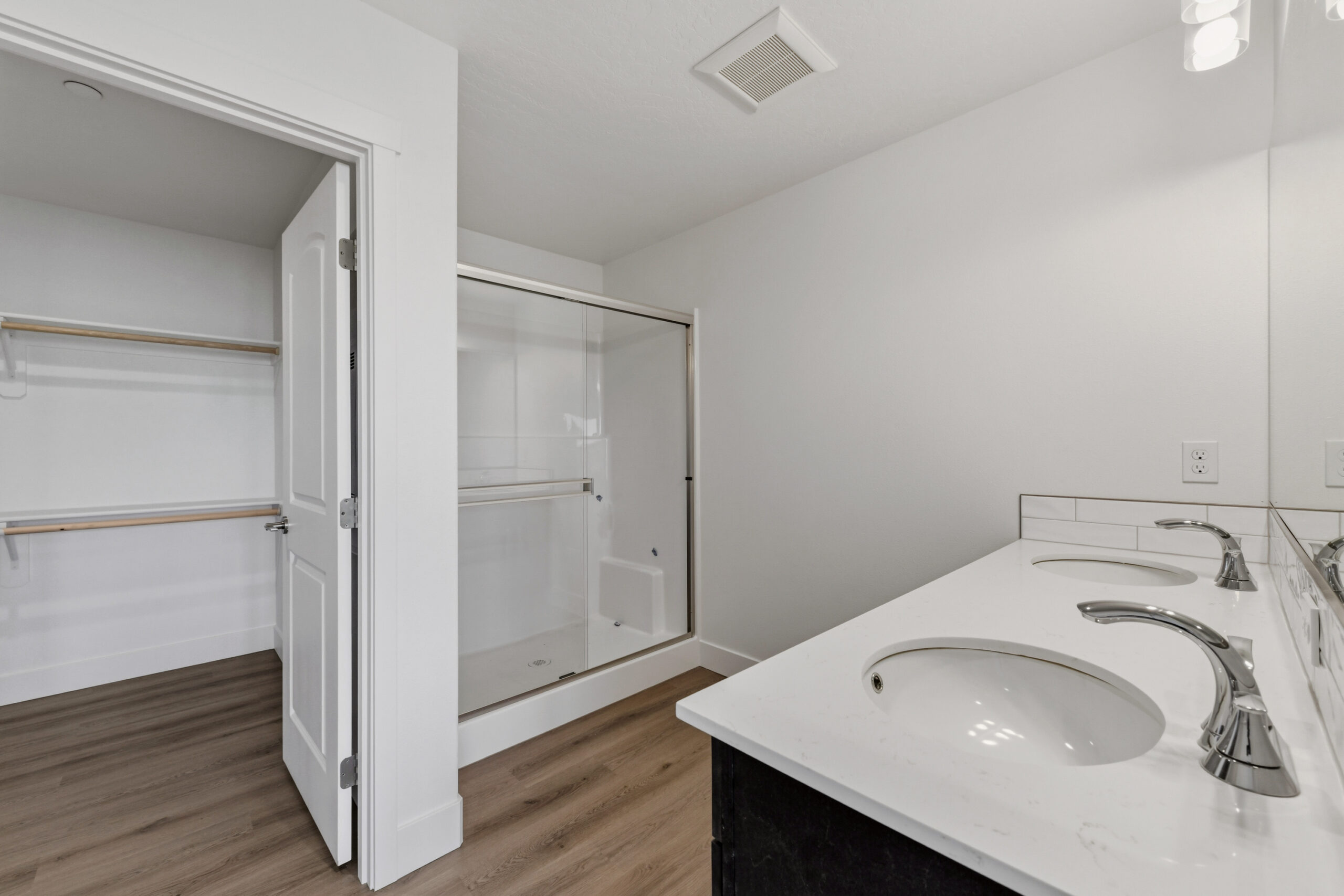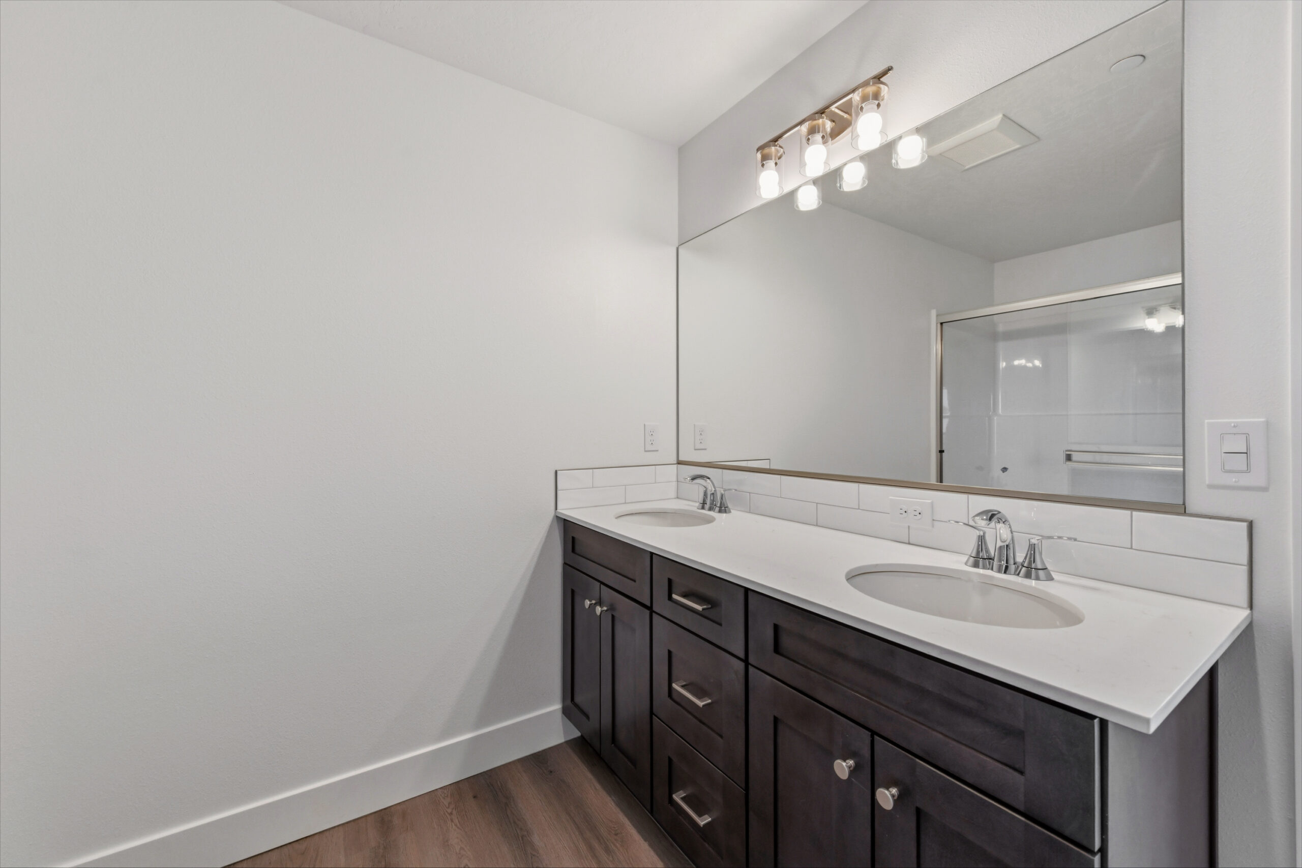 Upstairs, you’ll find three spacious bedrooms and two full bathrooms, including a thoughtfully designed primary suite with a dual-sink vanity, walk-in shower, and generous closet space. A centrally located laundry area adds to the home’s convenience, while two additional bedrooms share a well-appointed bathroom. This layout offers a perfect balance of comfort, privacy, and flexibility for modern lifestyles.
