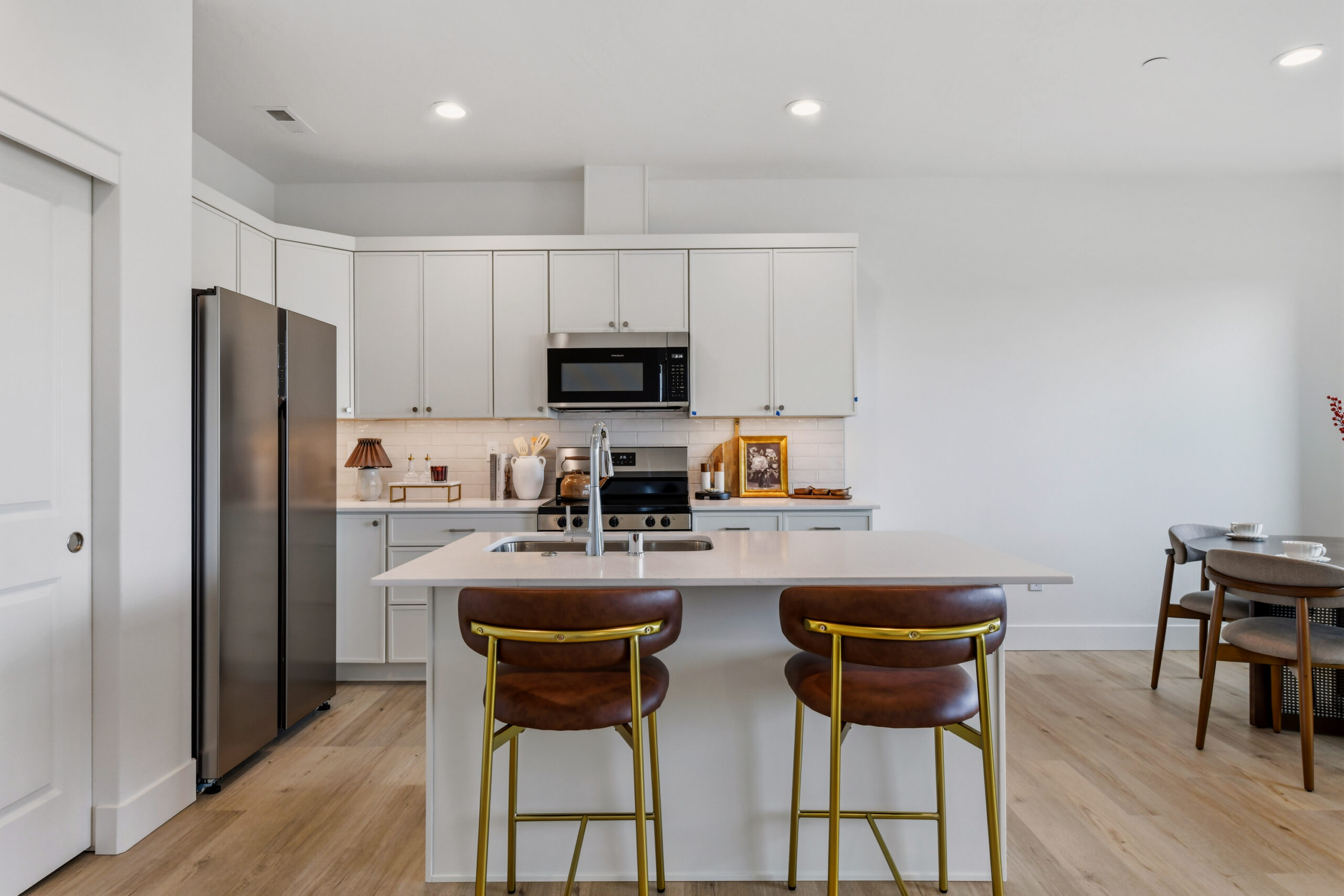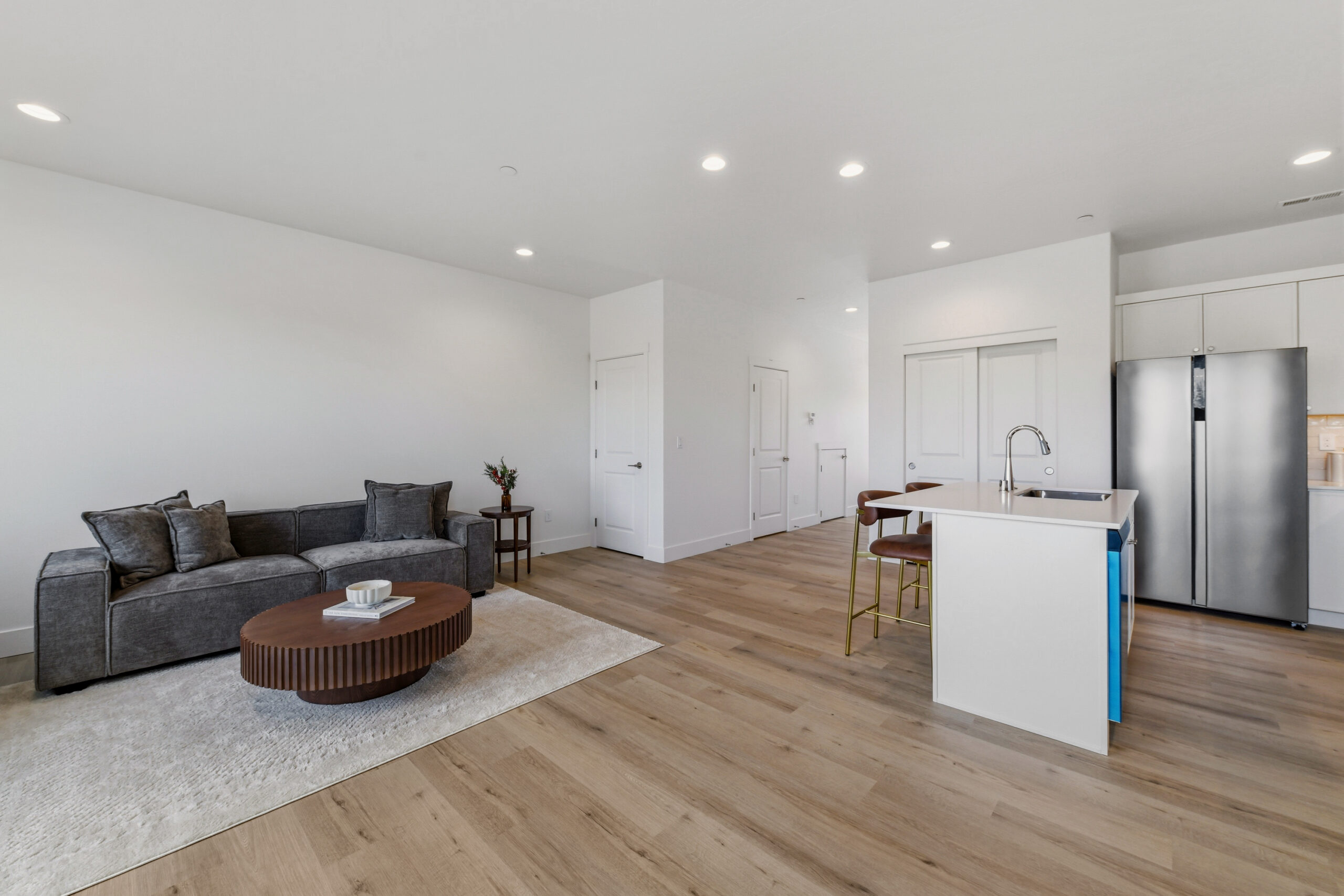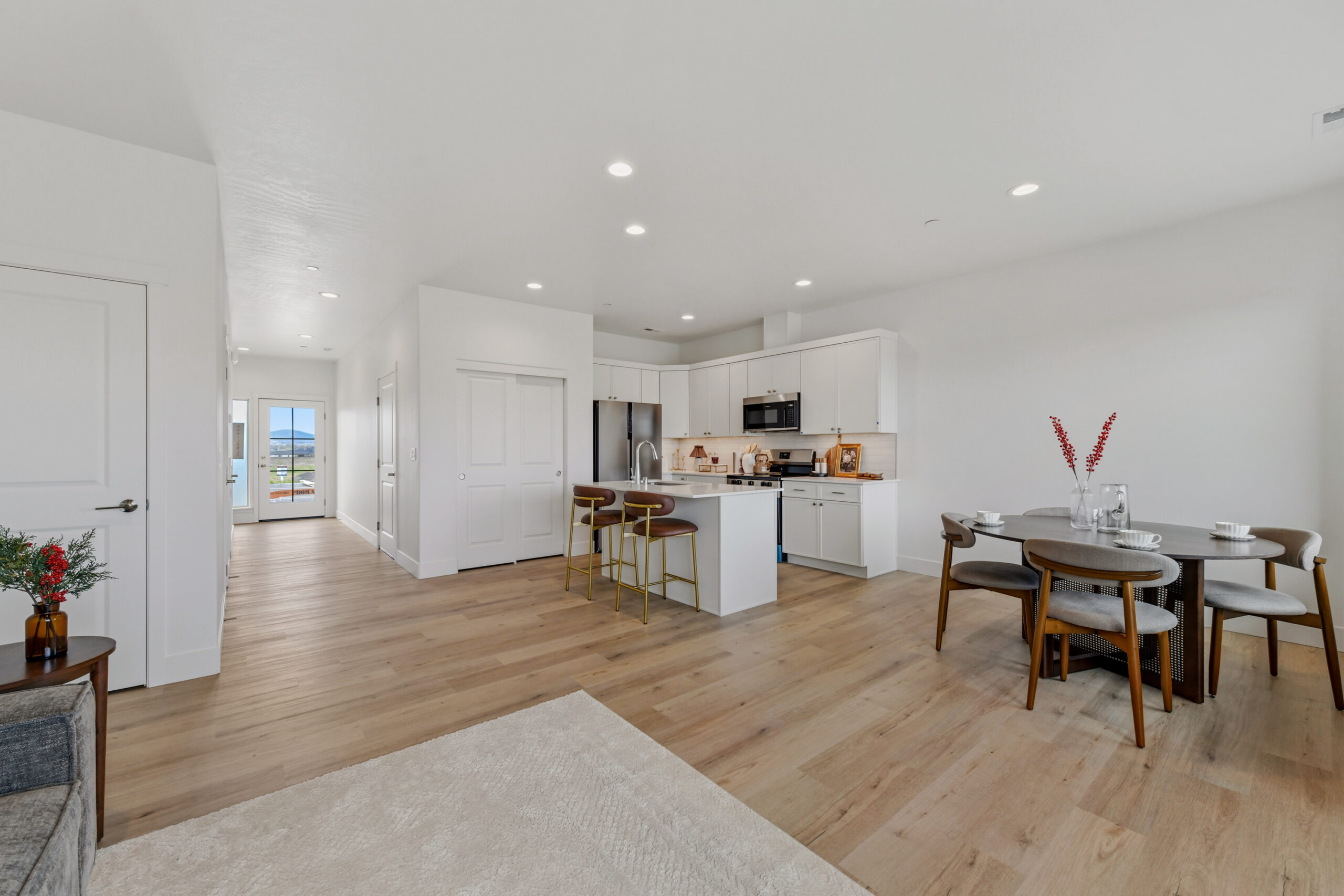This well-designed 1,651 sq. ft. townhouse plan combines open living with smart functionality. The main floor features a welcoming entry with a conveniently located half bathroom and direct access to the garage. The open-concept kitchen, complete with a large island and ample cabinetry, flows seamlessly into the dining and living areas, creating an ideal space for both everyday living and entertaining. Sliding doors lead to a private outdoor patio, perfect for relaxing or dining al fresco.