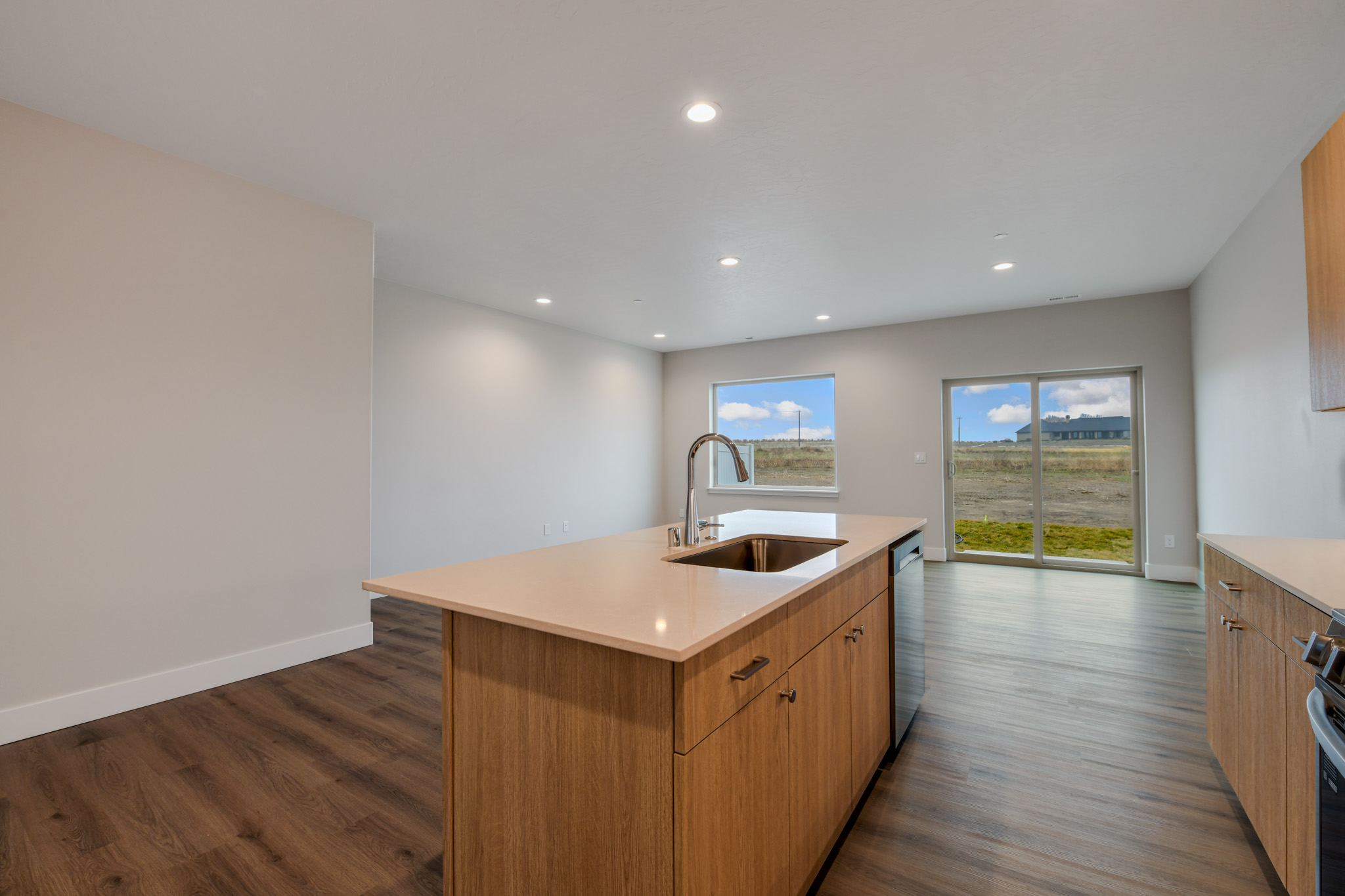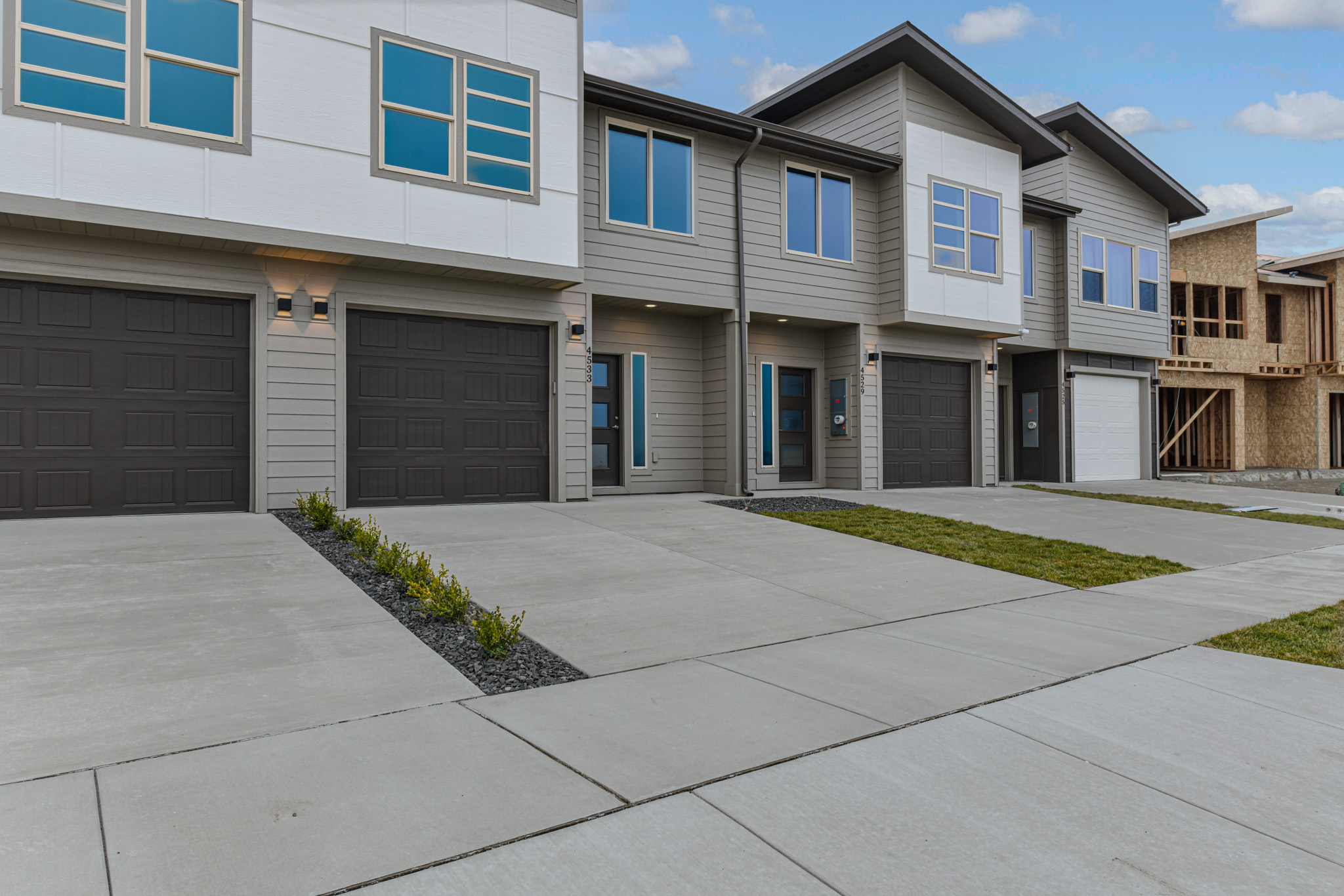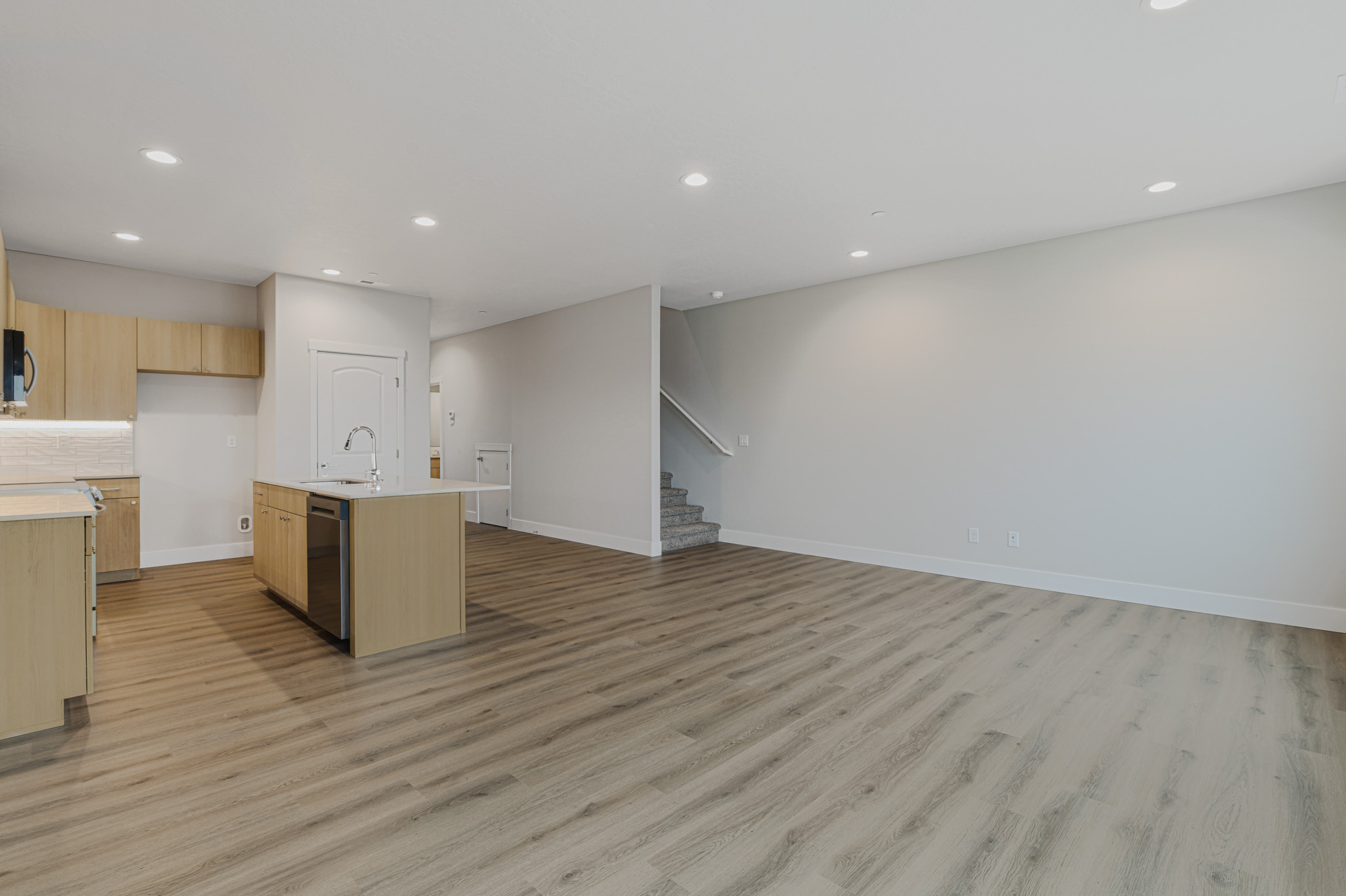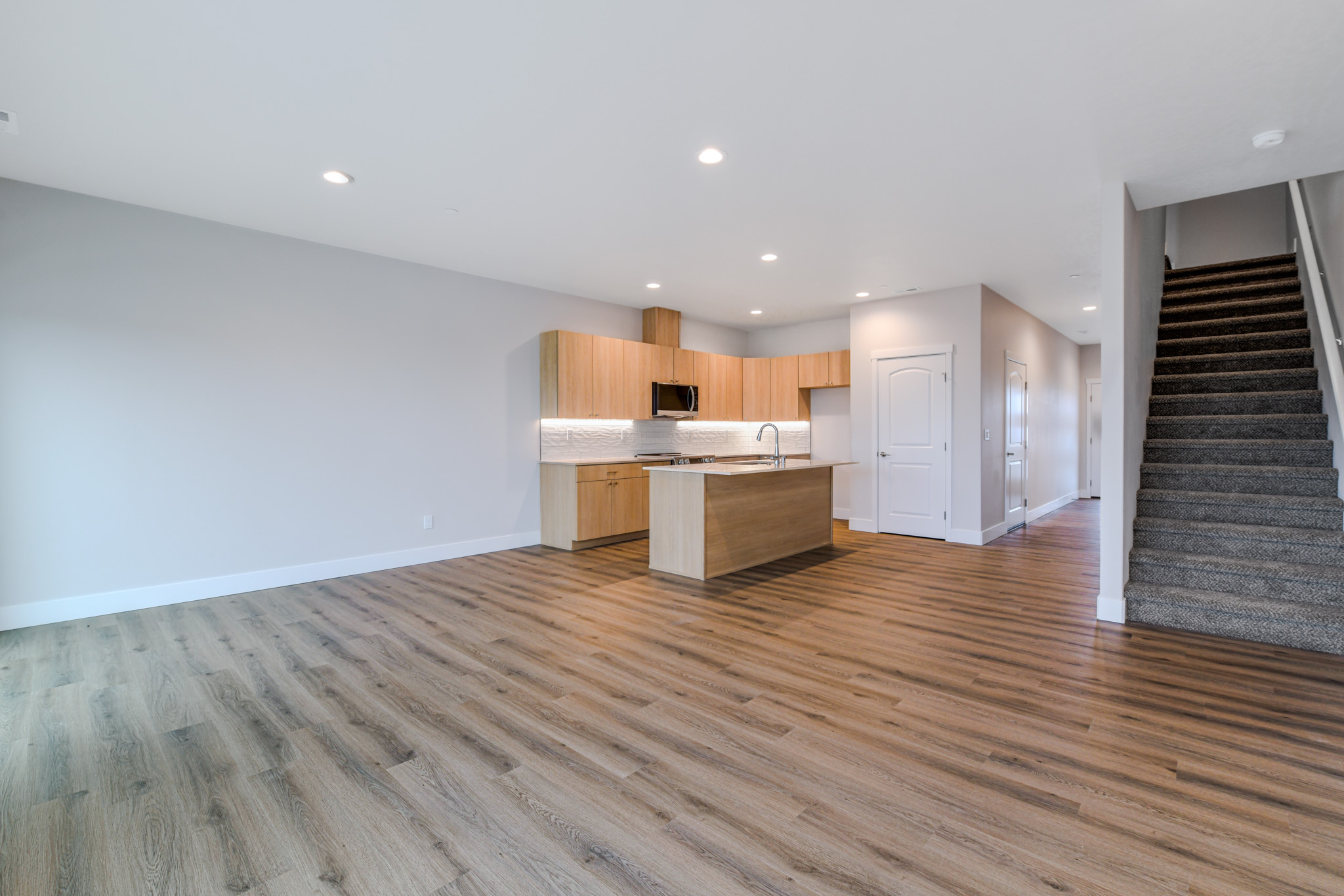 This thoughtfully designed 1,673 sq. ft. townhouse plan offers a spacious and functional layout ideal for modern living. Upon entry, a convenient half bathroom and access to the garage lead into an expansive open-concept main floor featuring a well-appointed kitchen with a large island, flowing seamlessly into the dining and living areas—perfect for everyday living and entertaining. Sliding doors open to a private outdoor patio, extending the living space.