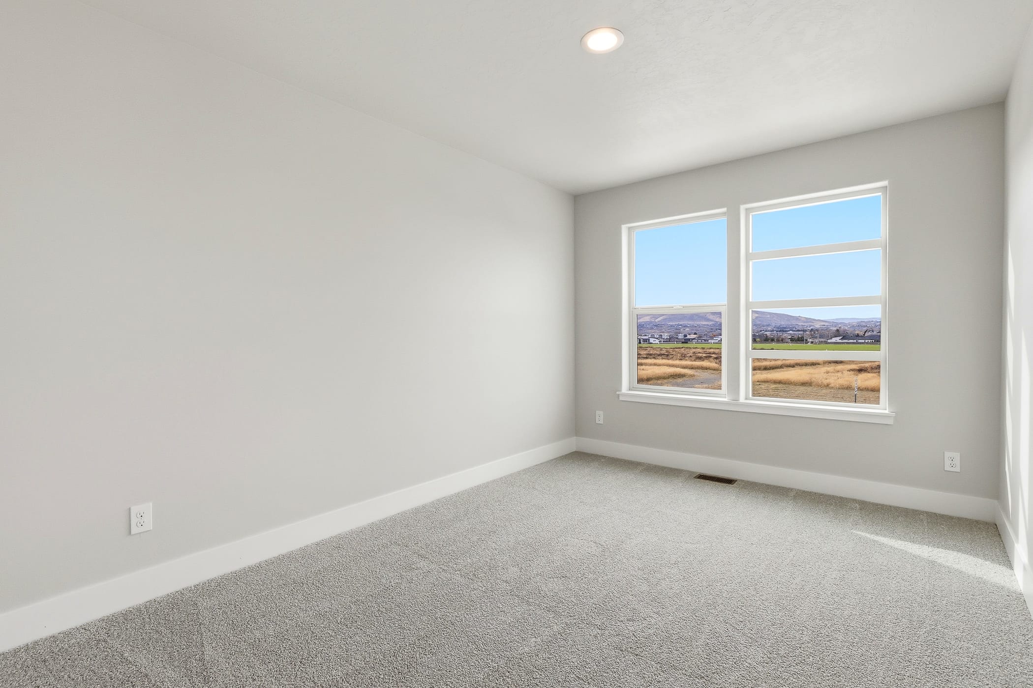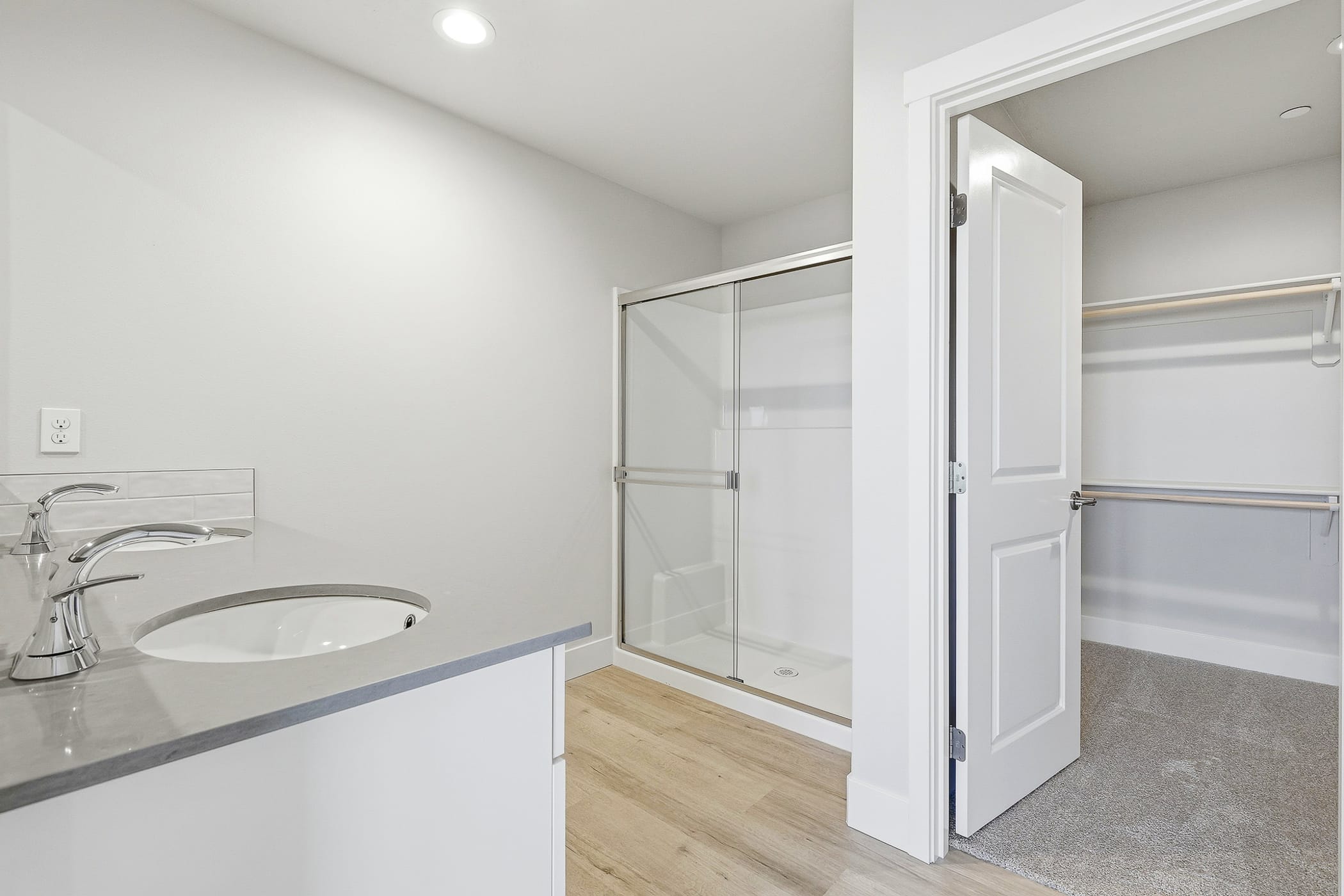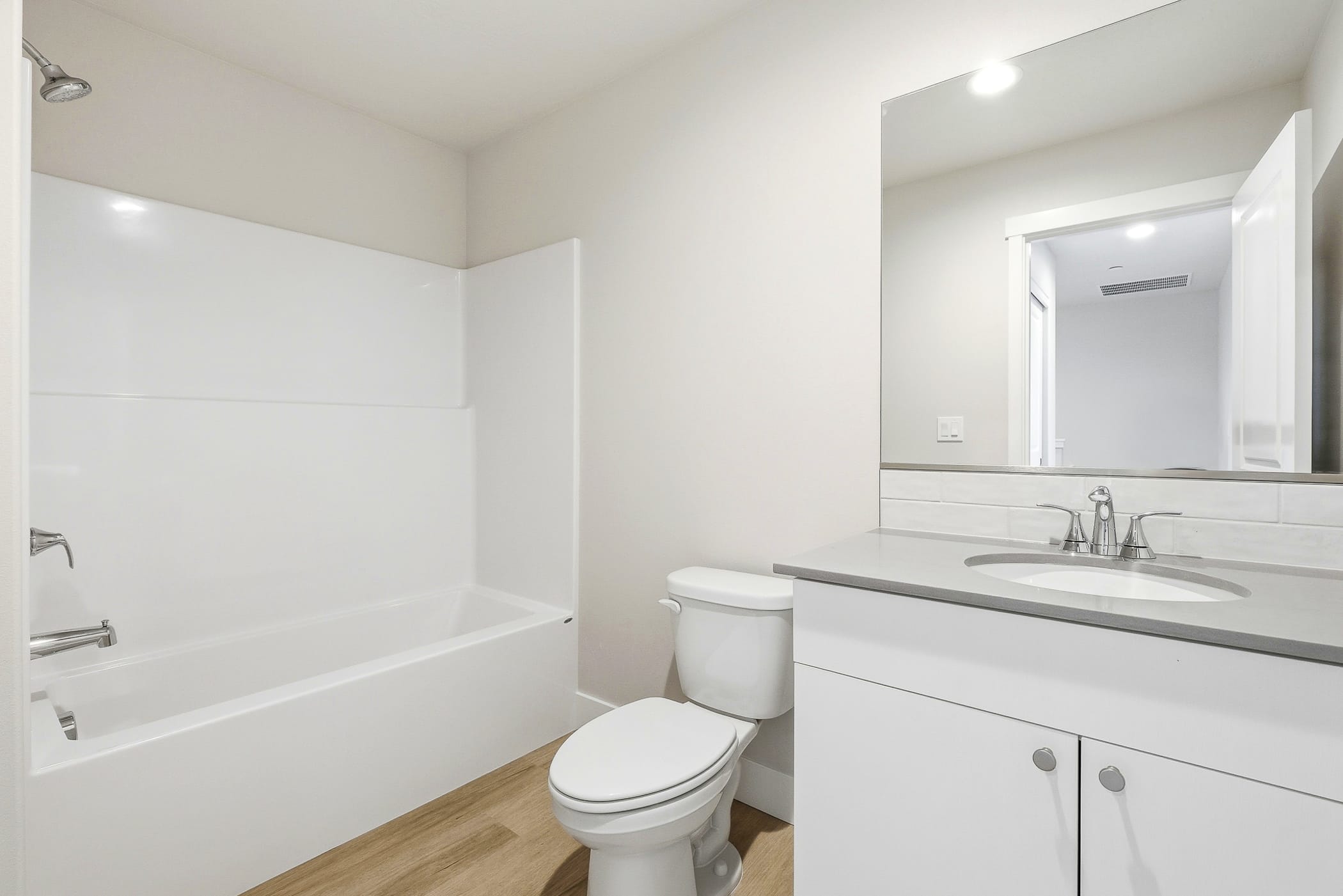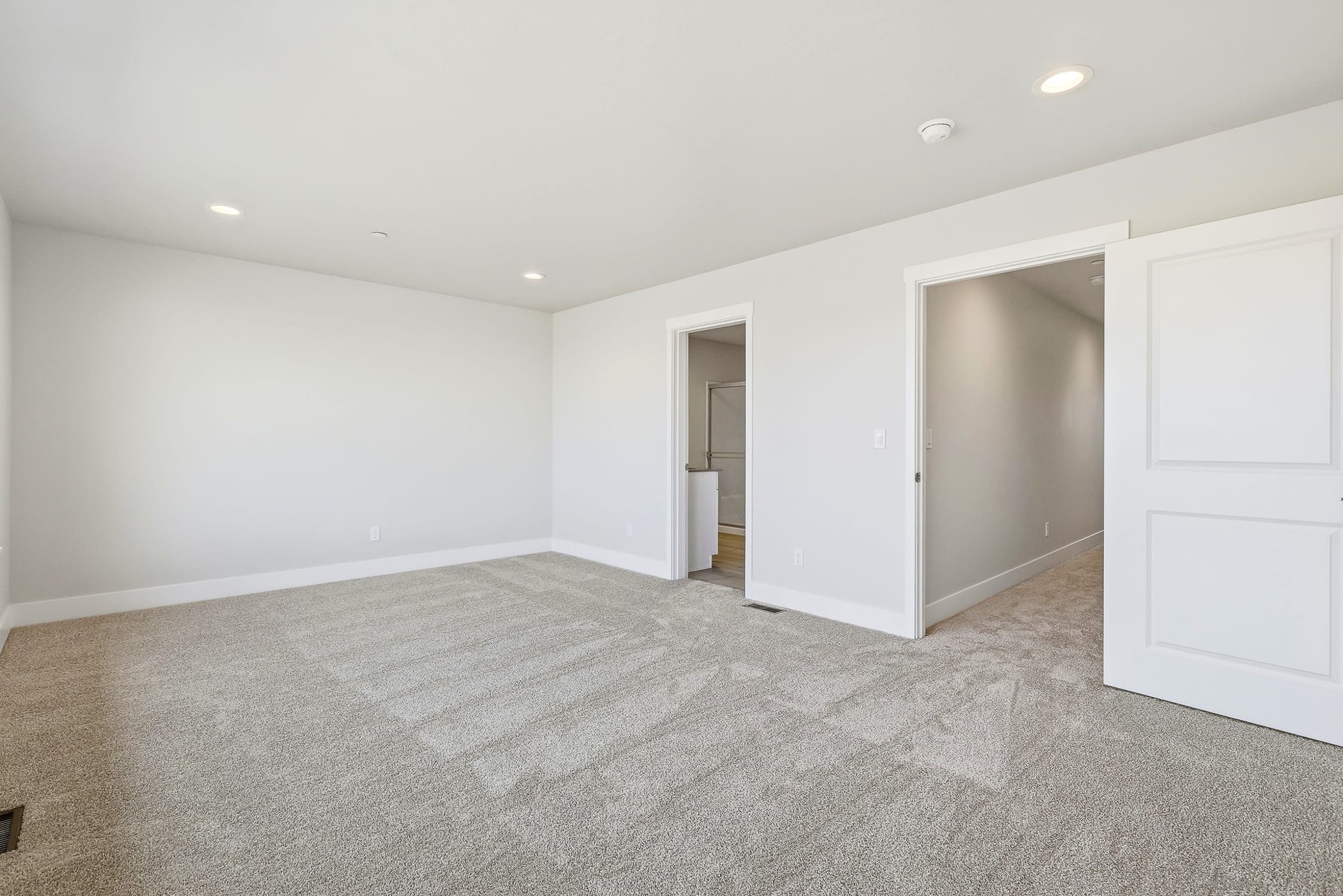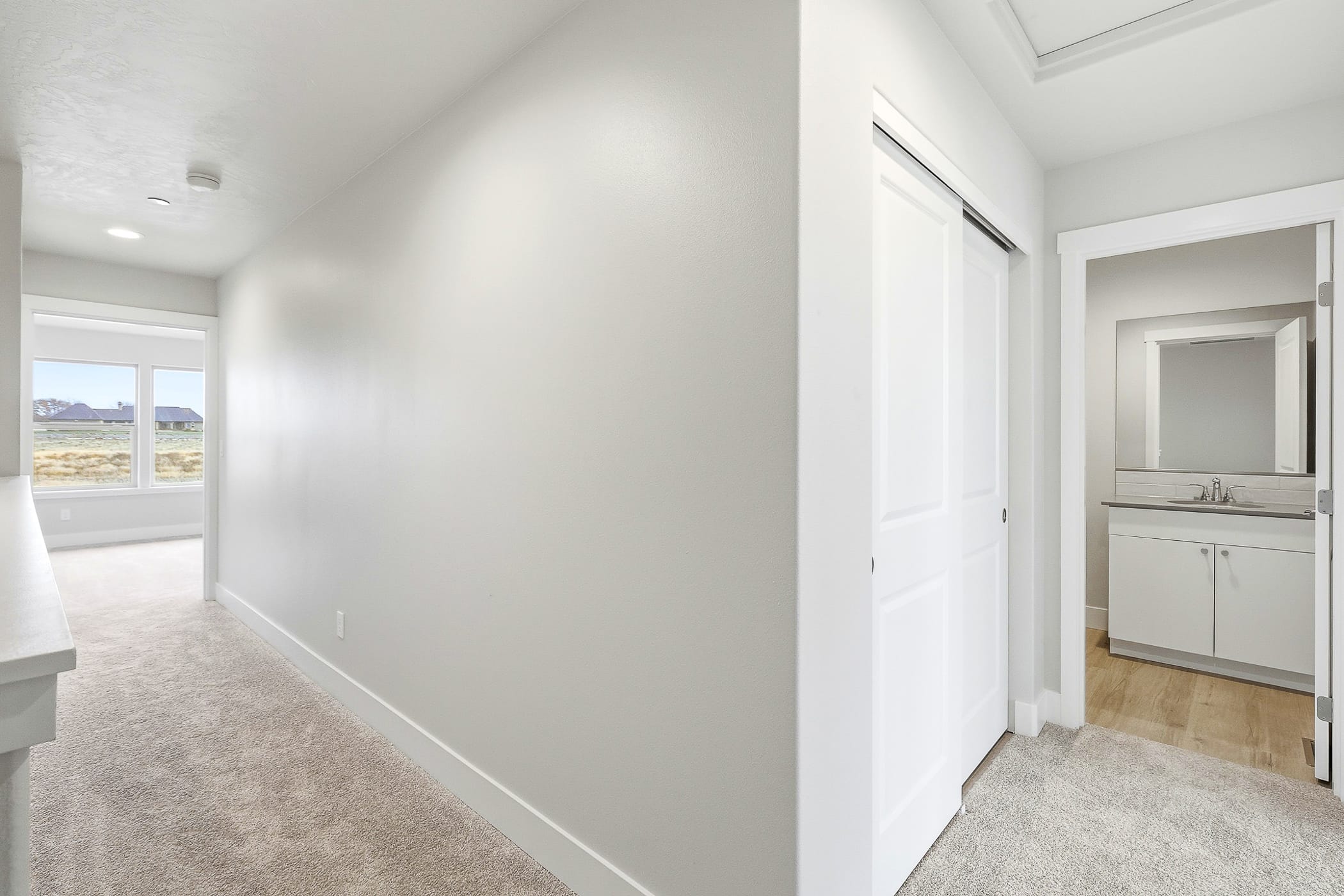 Upstairs, the second floor features three bedrooms and two full bathrooms, including a generously sized primary suite complete with a dual-sink vanity, walk-in shower, and ample closet space. Two additional bedrooms share a full bathroom, while a centrally located laundry area adds everyday convenience. This plan balances open living with private retreats, creating a home that’s both versatile and inviting.