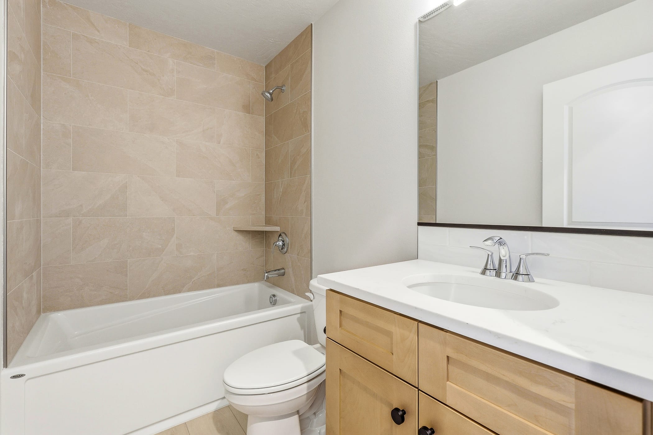 Walk-in shower with tile surround and fiberglass pan in master bath