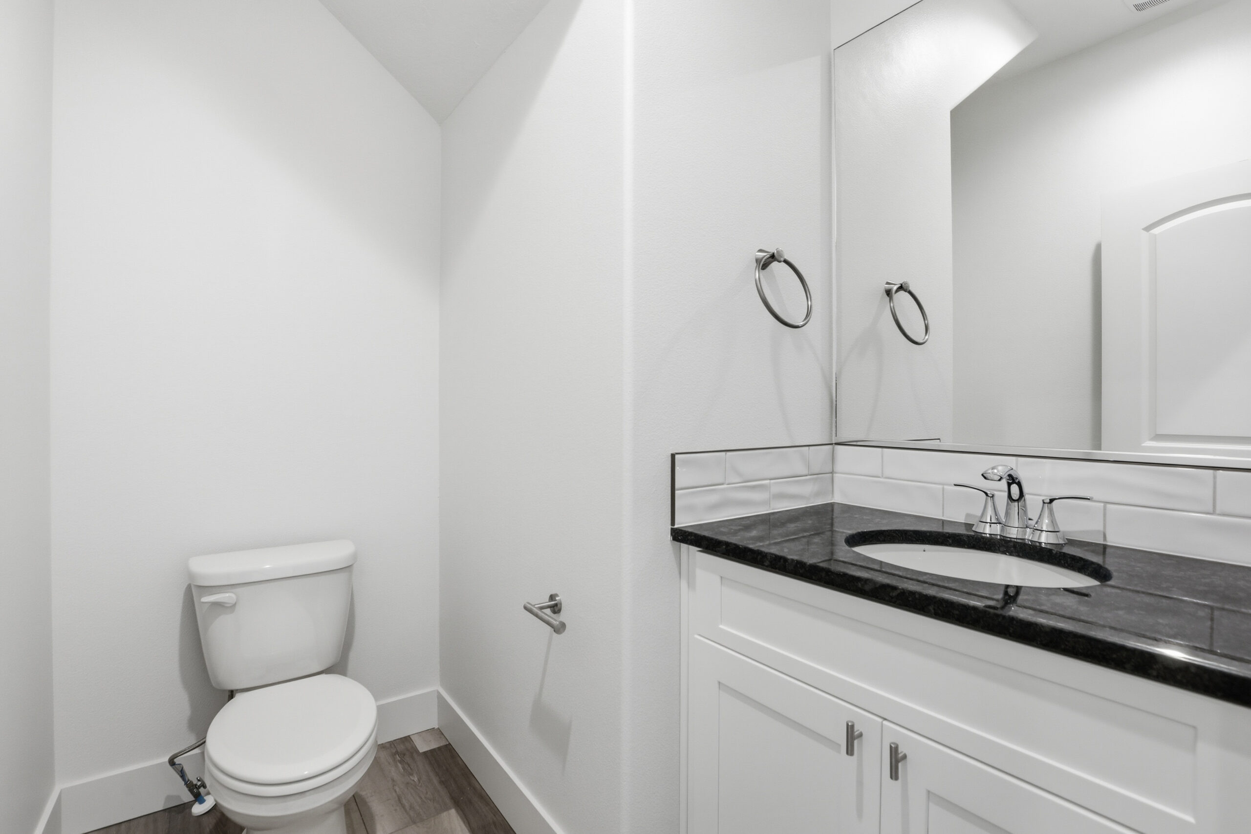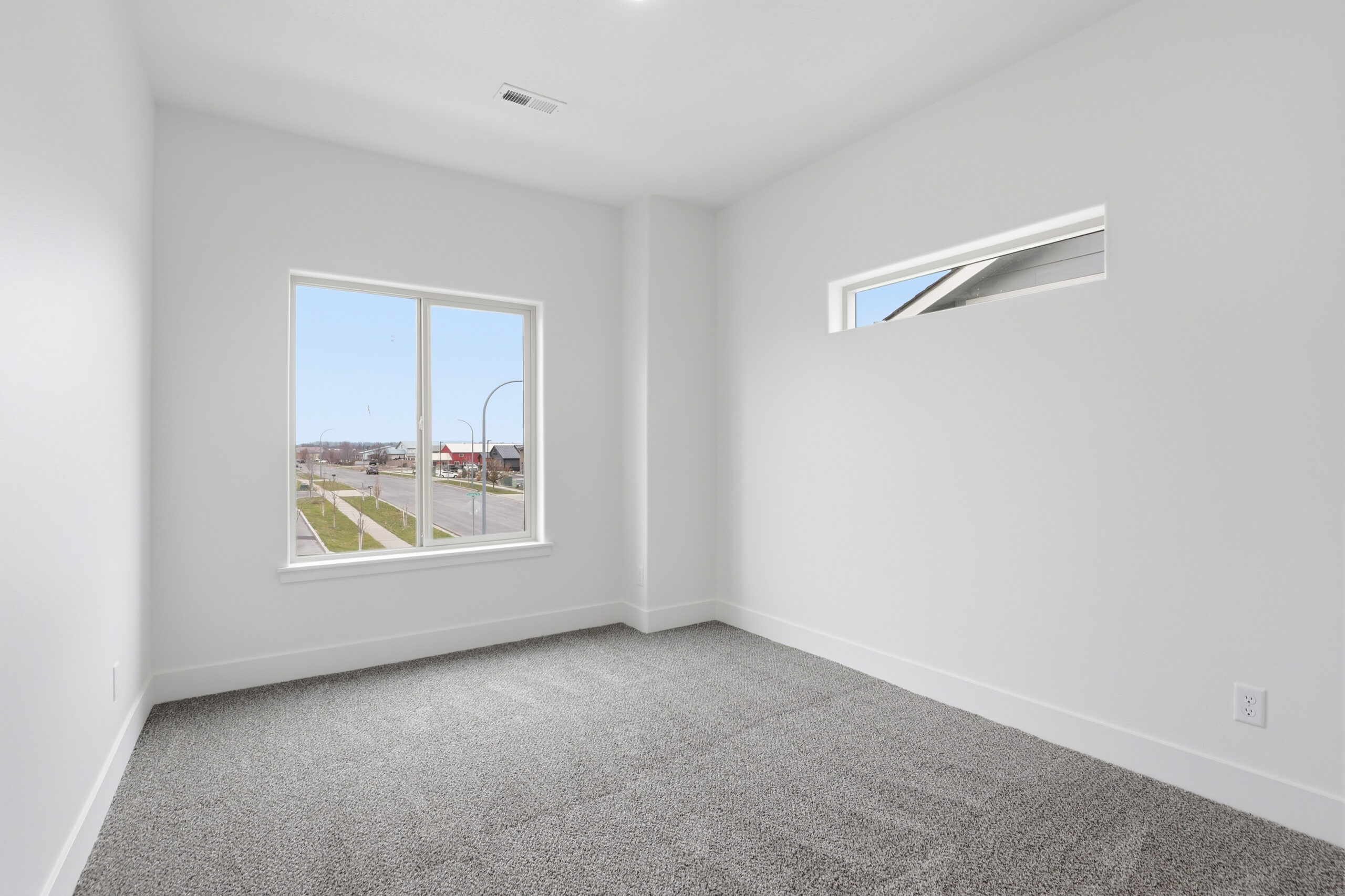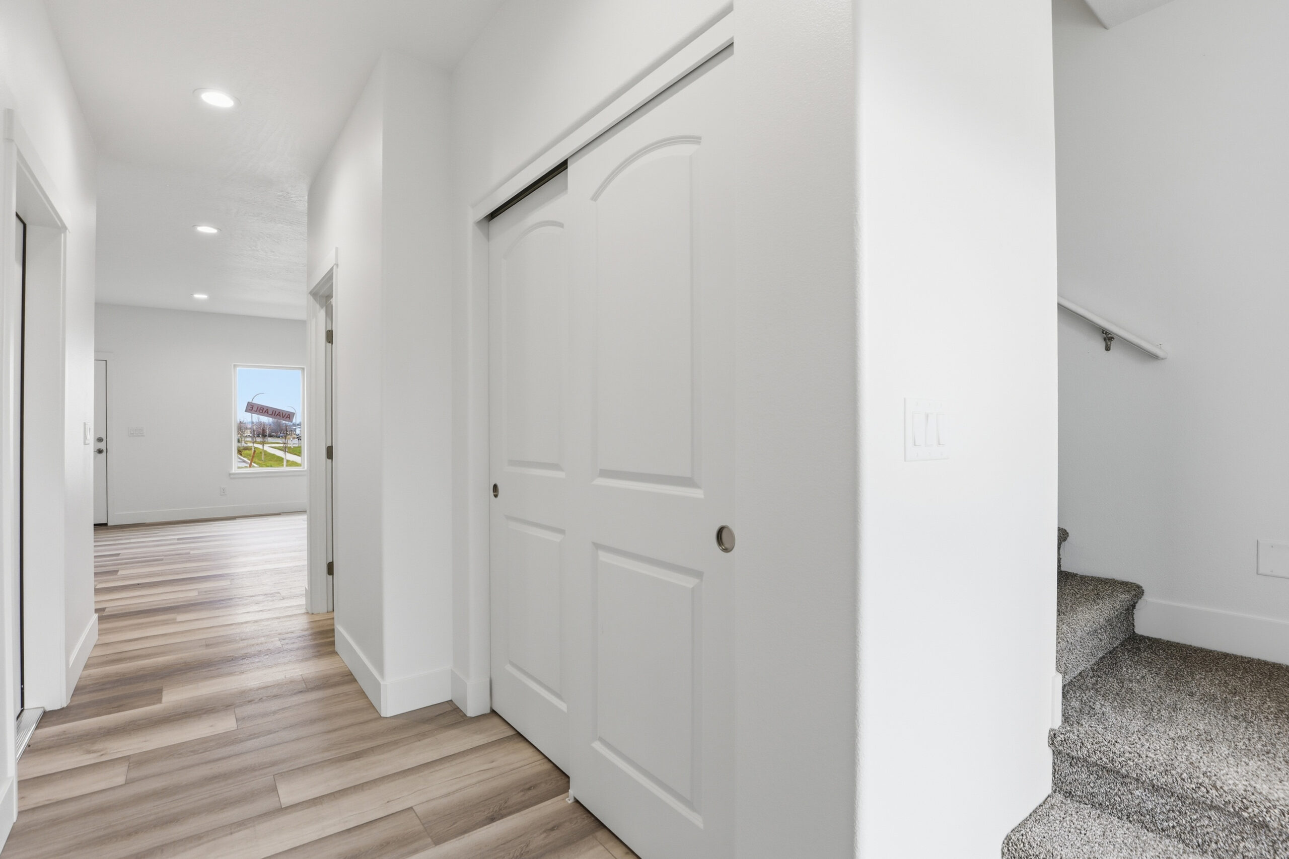 Upstairs, three bedrooms and two bathrooms maximize comfort and privacy. The primary bedroom is set apart for added seclusion, while a central hallway connects all rooms. A linen closet and laundry area enhance convenience for modern living.