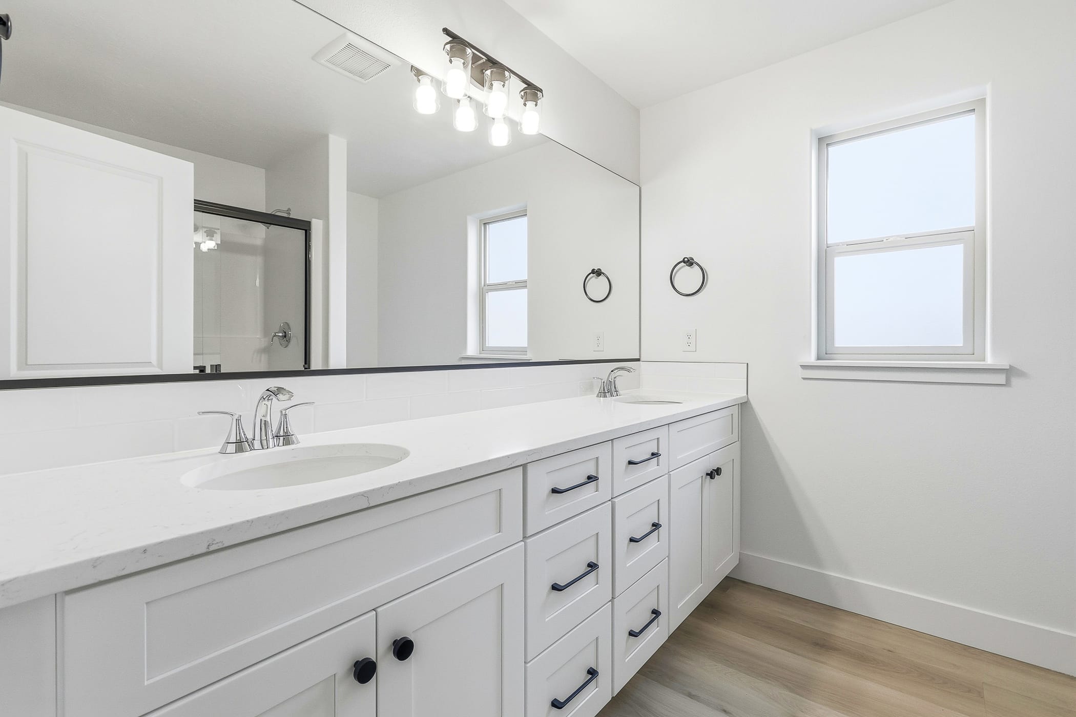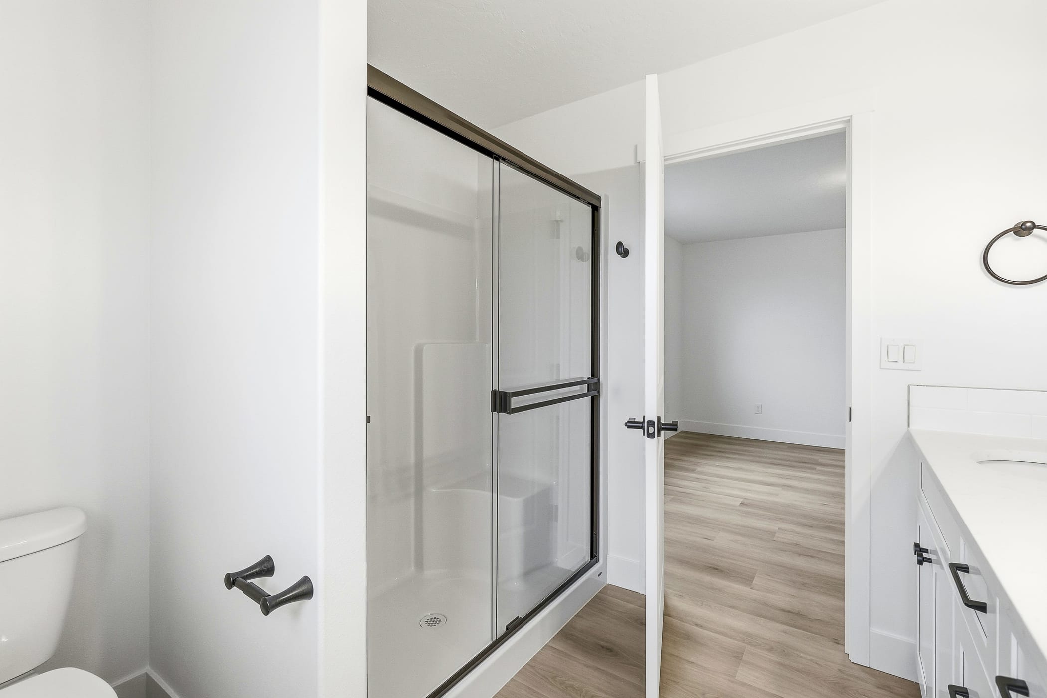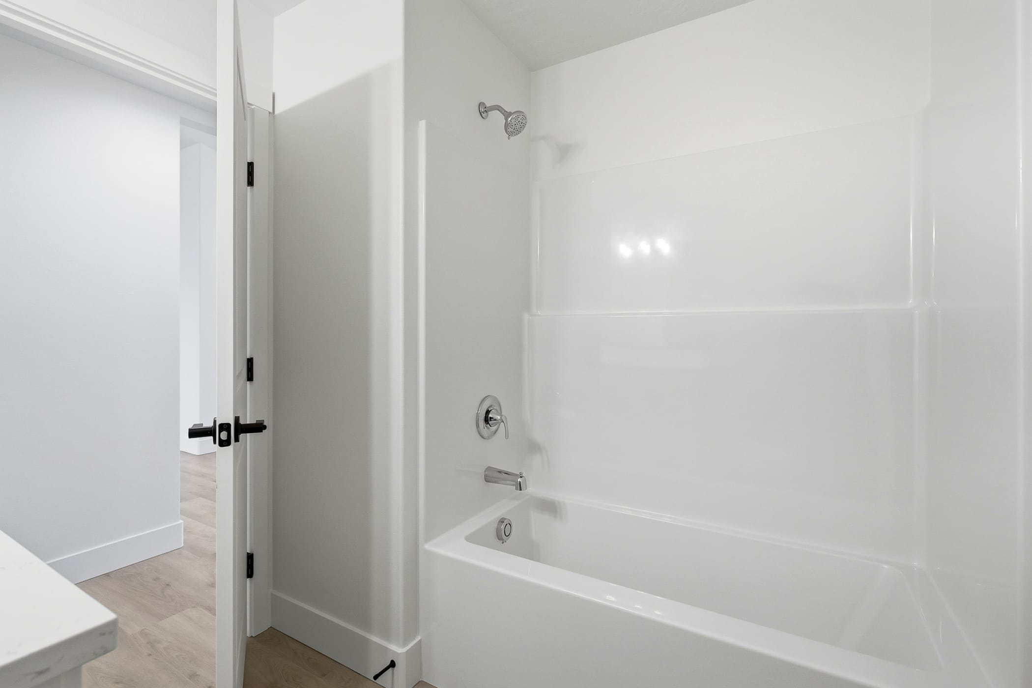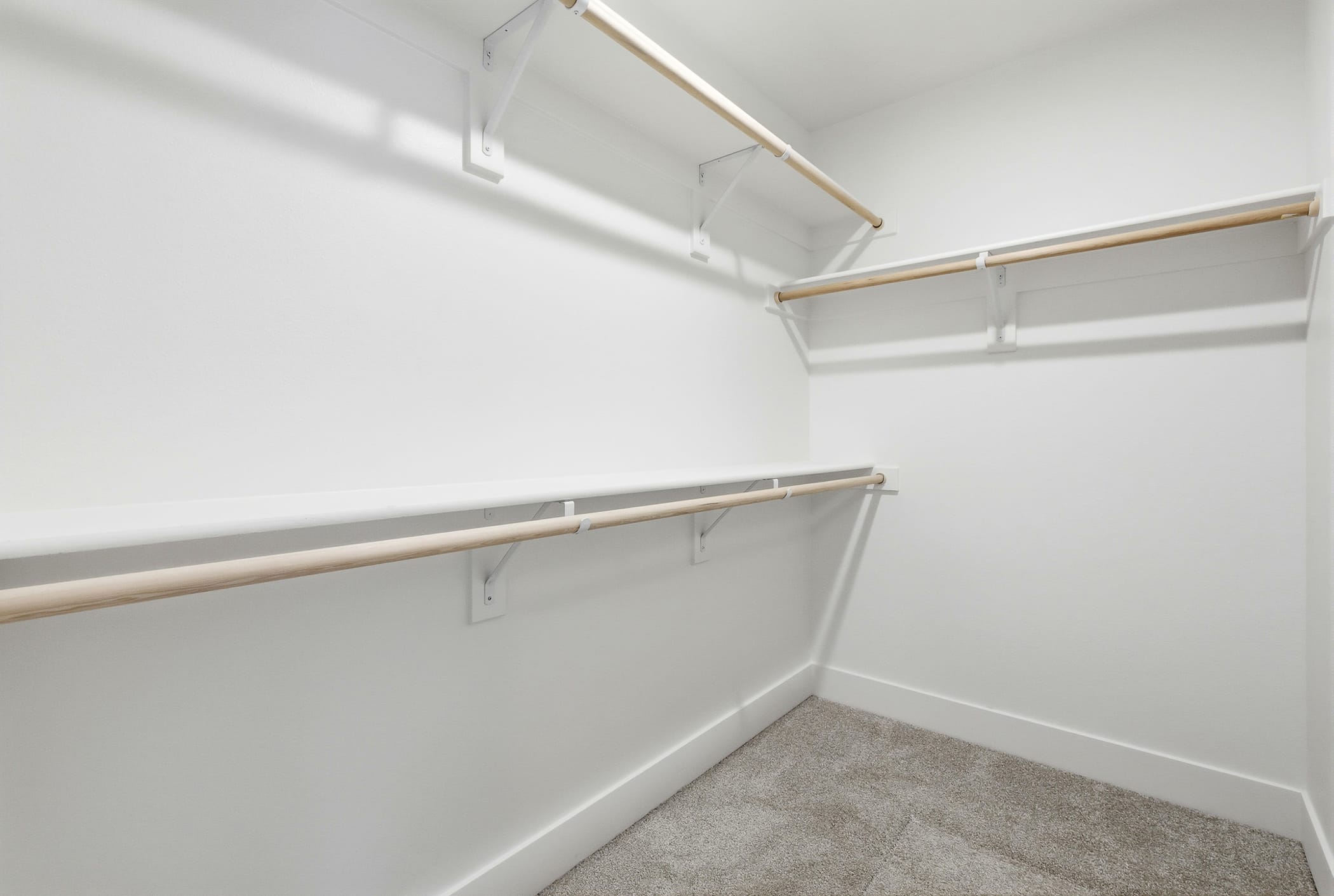 Retreat to the main suite featuring a dual vanity bathroom with options for a fiberglass shower or customizable tiled walls. Plus, indulge in the dream-worthy walk-in closet. At the opposite end, two bedrooms share a well-appointed bathroom.
