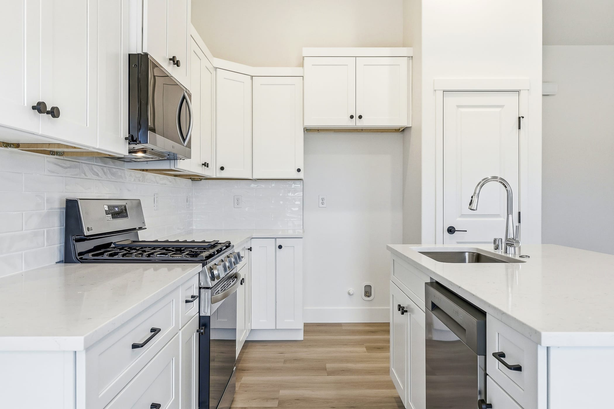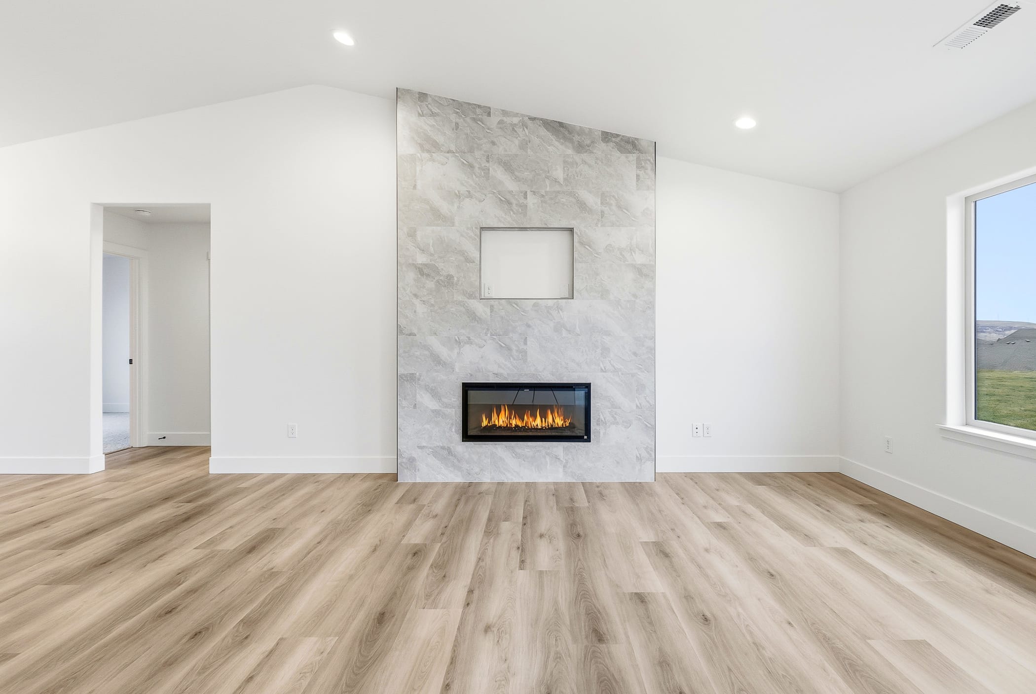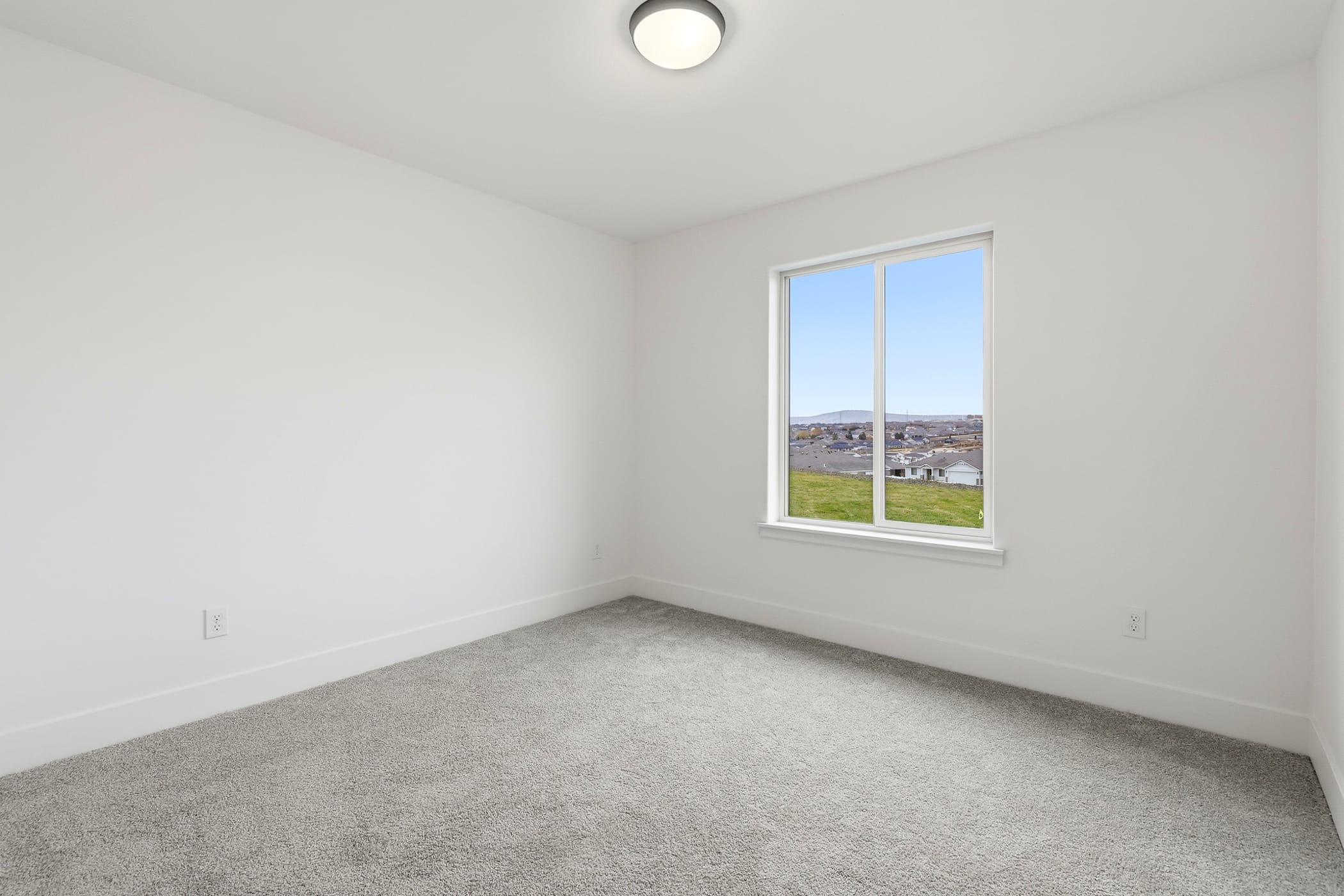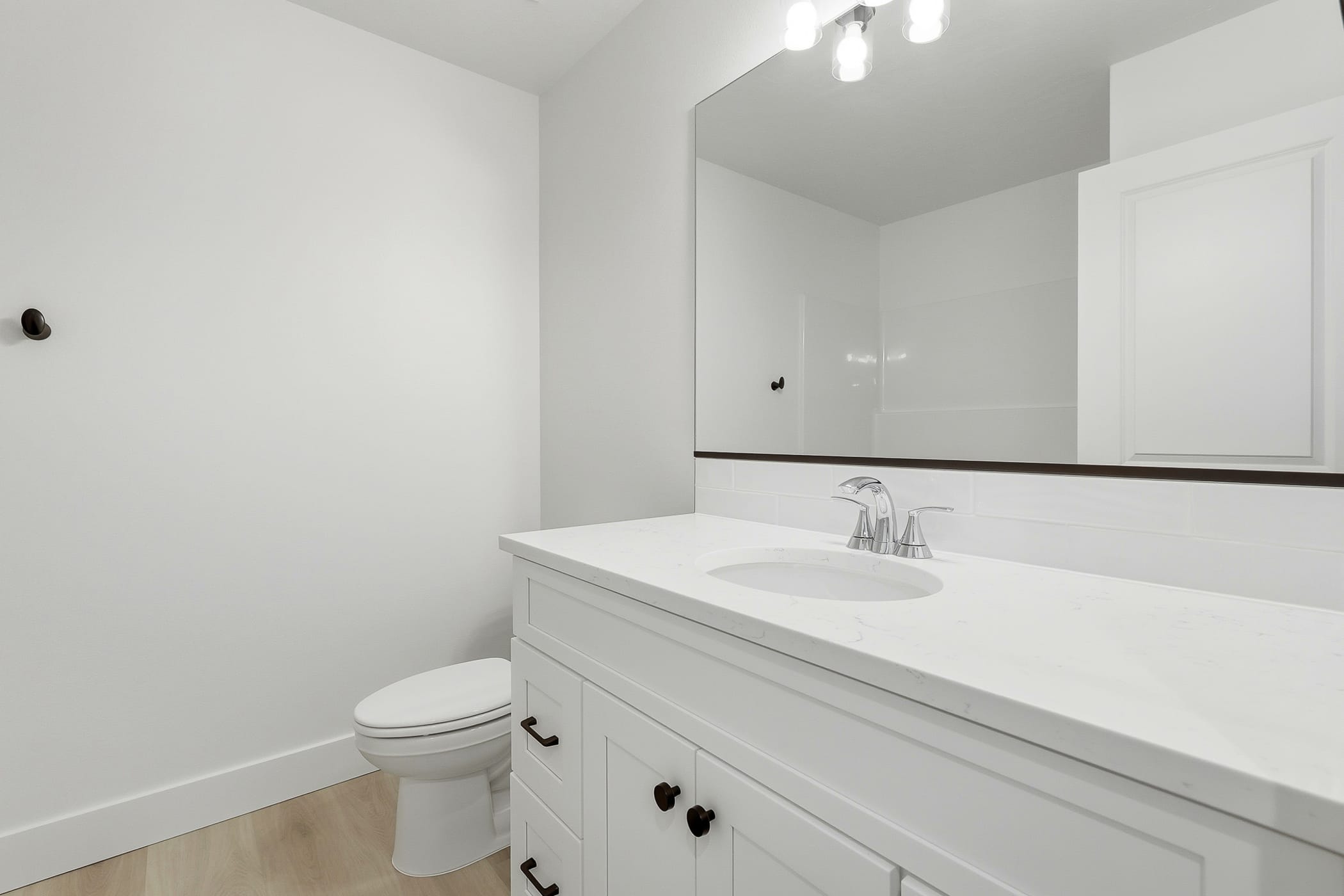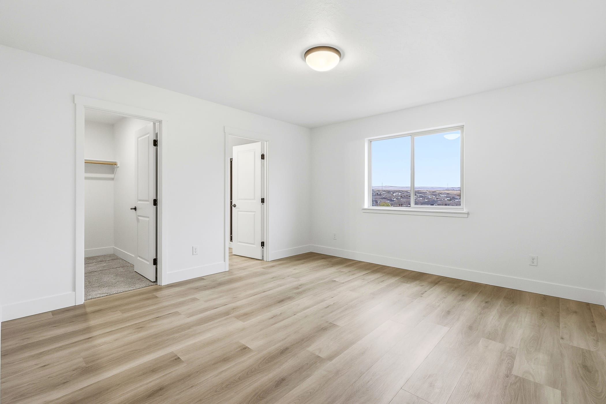Retreat to the main suite featuring a dual vanity bathroom with options for a fiberglass shower or customizable tiled walls. Plus, indulge in the dream-worthy walk-in closet. At the opposite end, two bedrooms share a well-appointed bathroom.