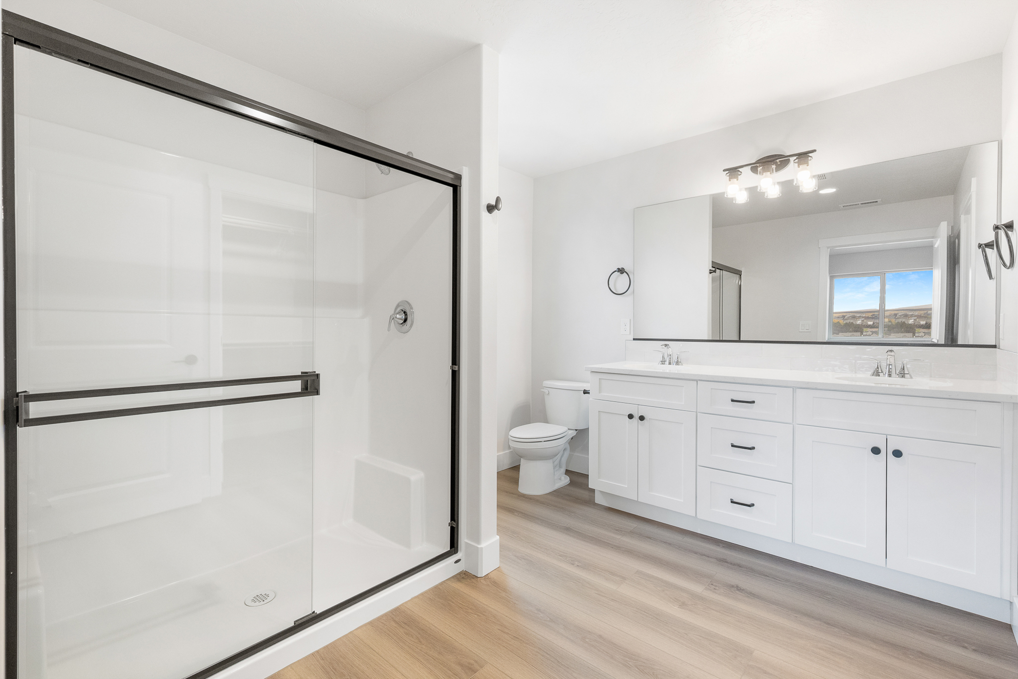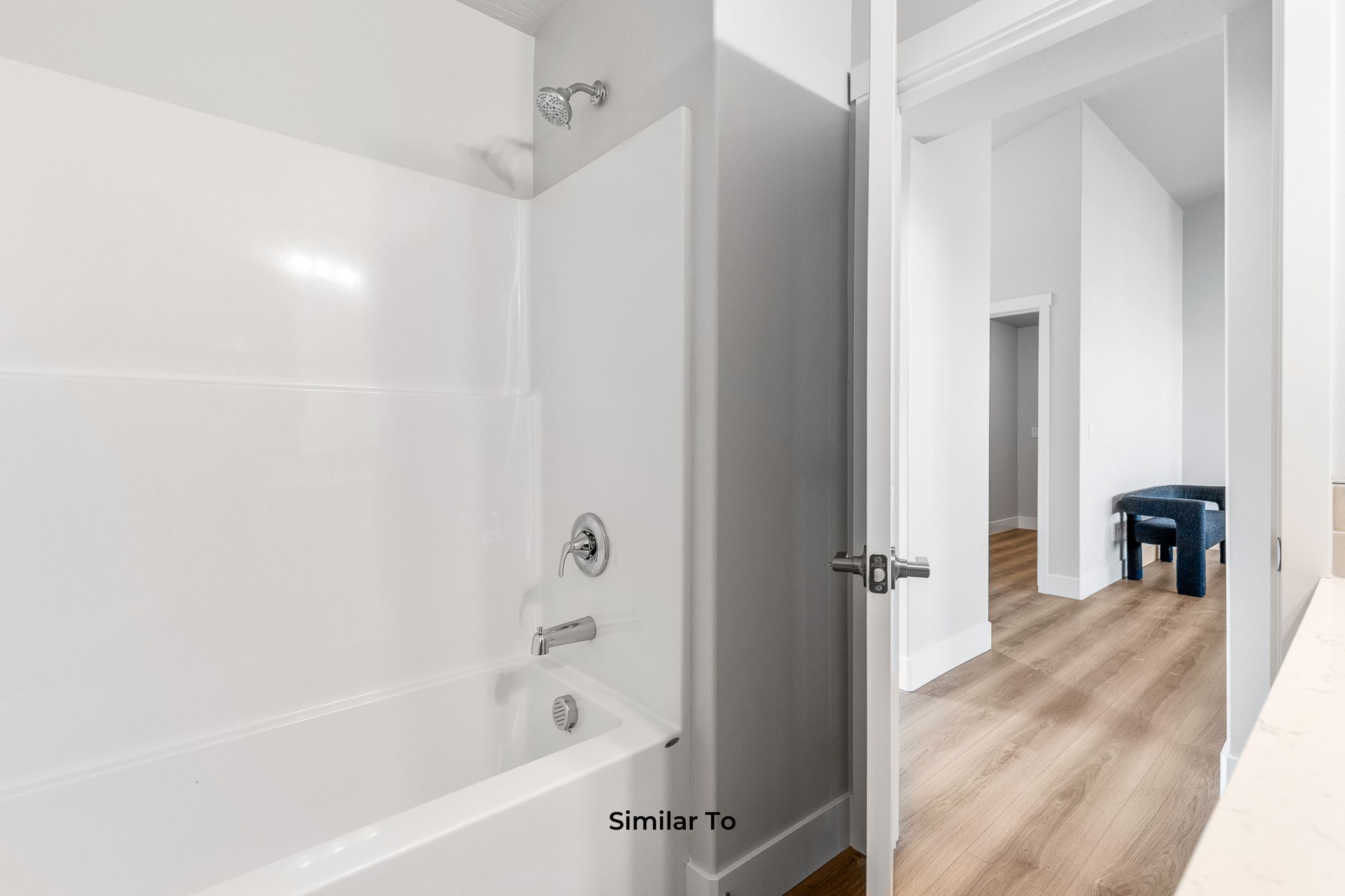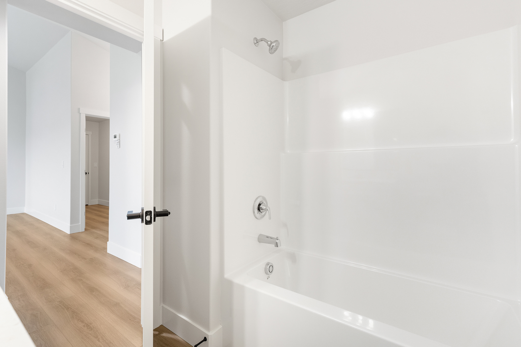 Walk-in shower with tile surround and fiberglass pan in master bath