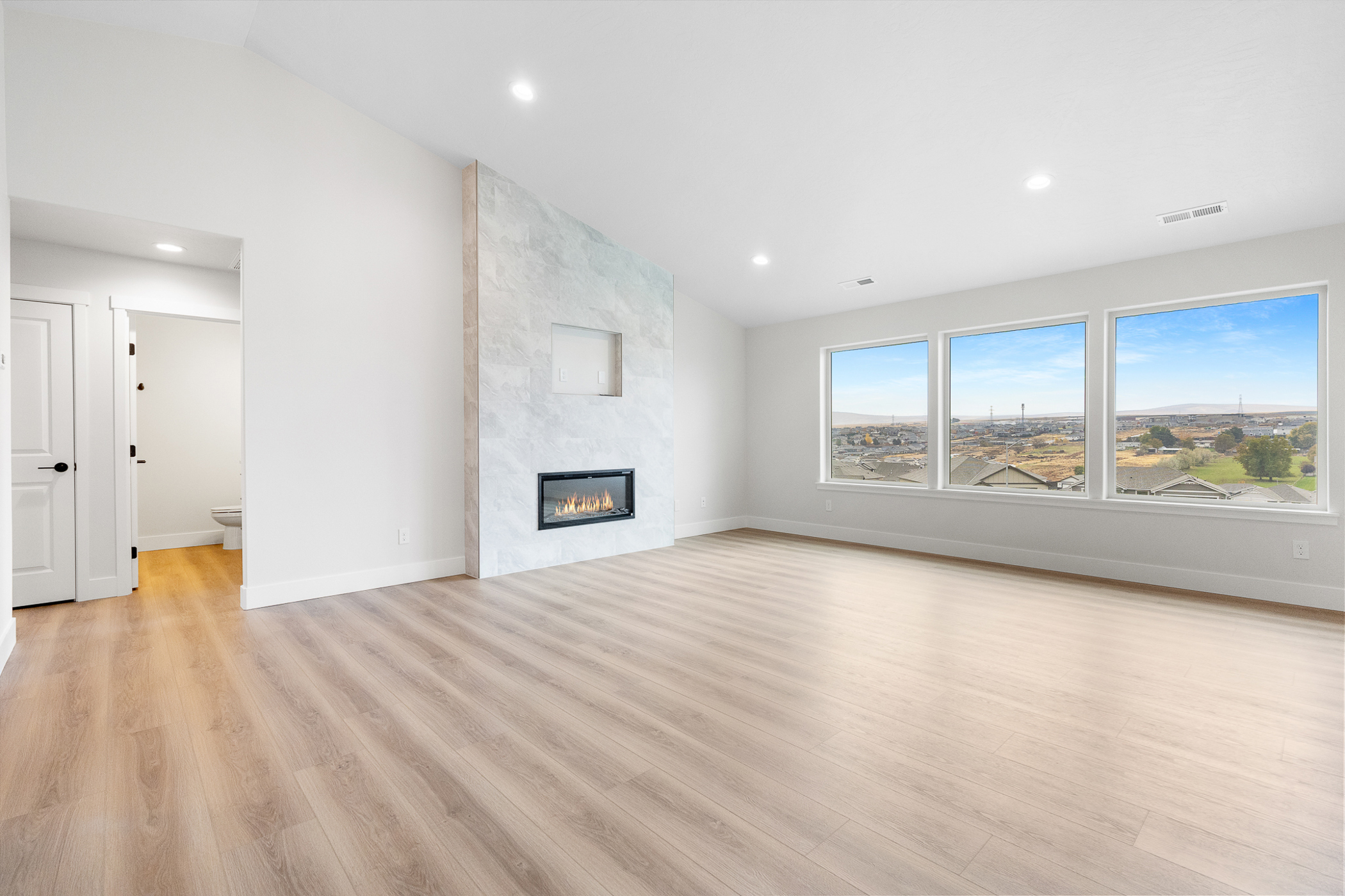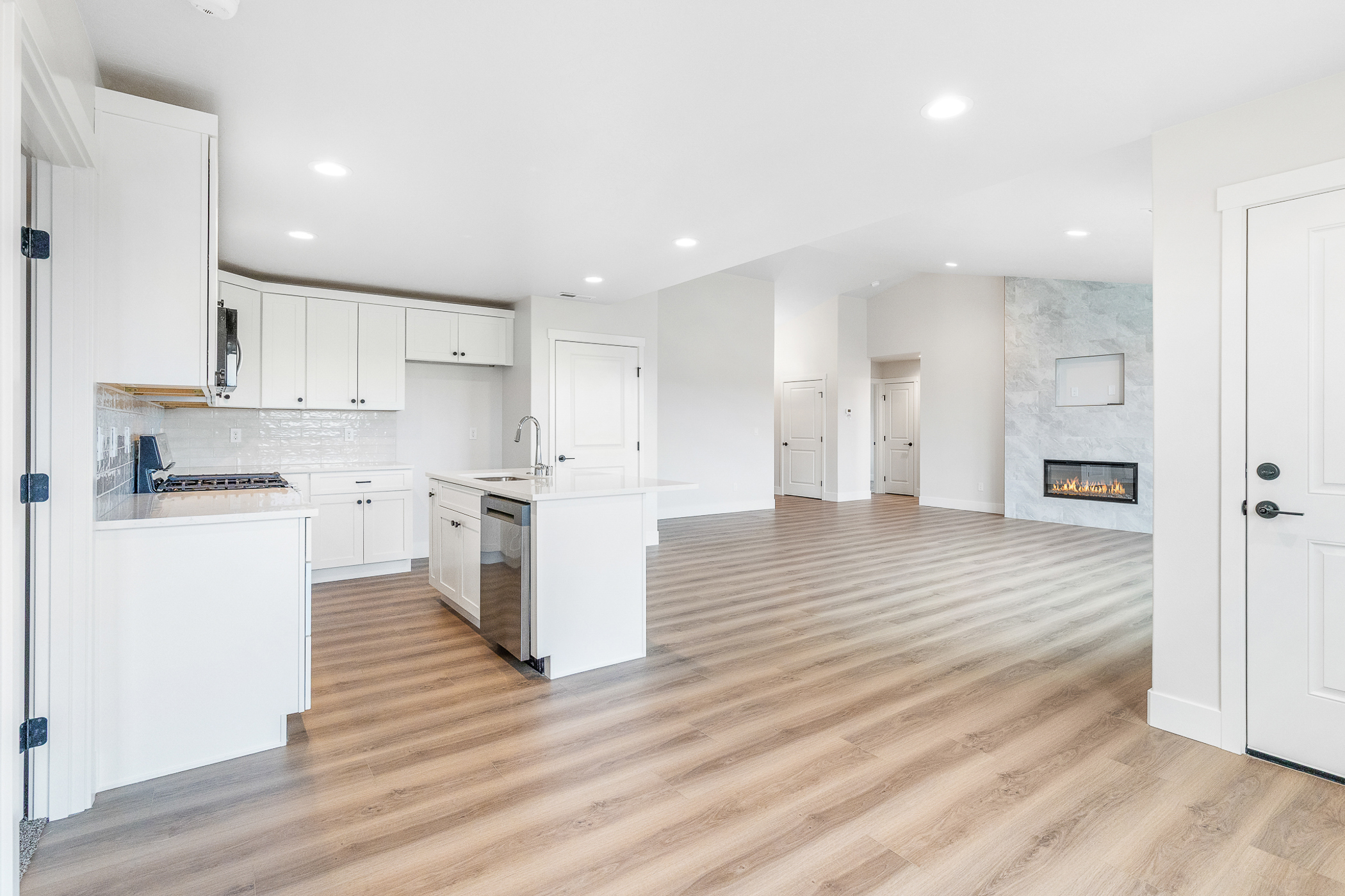 Airy open space in the 1682 plan seamlessly connects the kitchen and great room, while maintaining a warm ambiance in the dining area for memorable gatherings. The kitchen offers an L-shaped layout, offering ample counter space, a convenient island, and a discreetly tucked pantry with custom wooden shelfing.