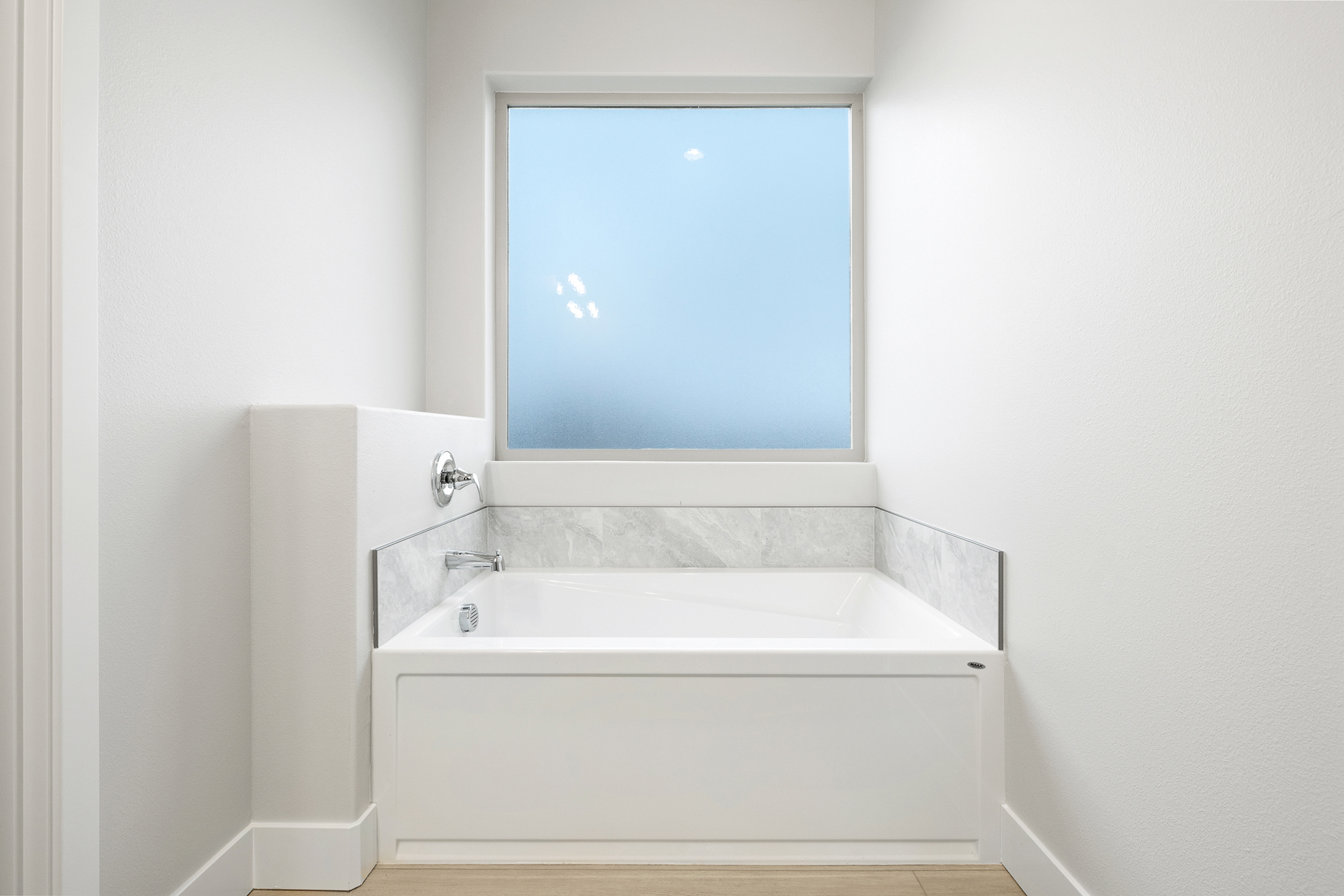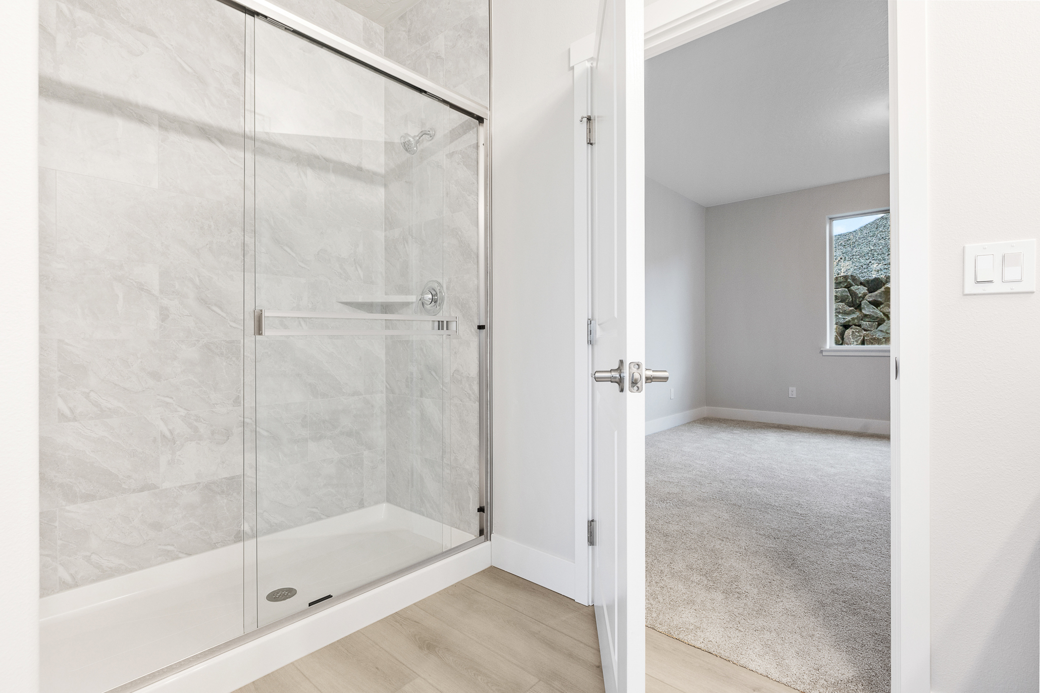 Walk-in shower with tile surround and fiberglass pan in master bath