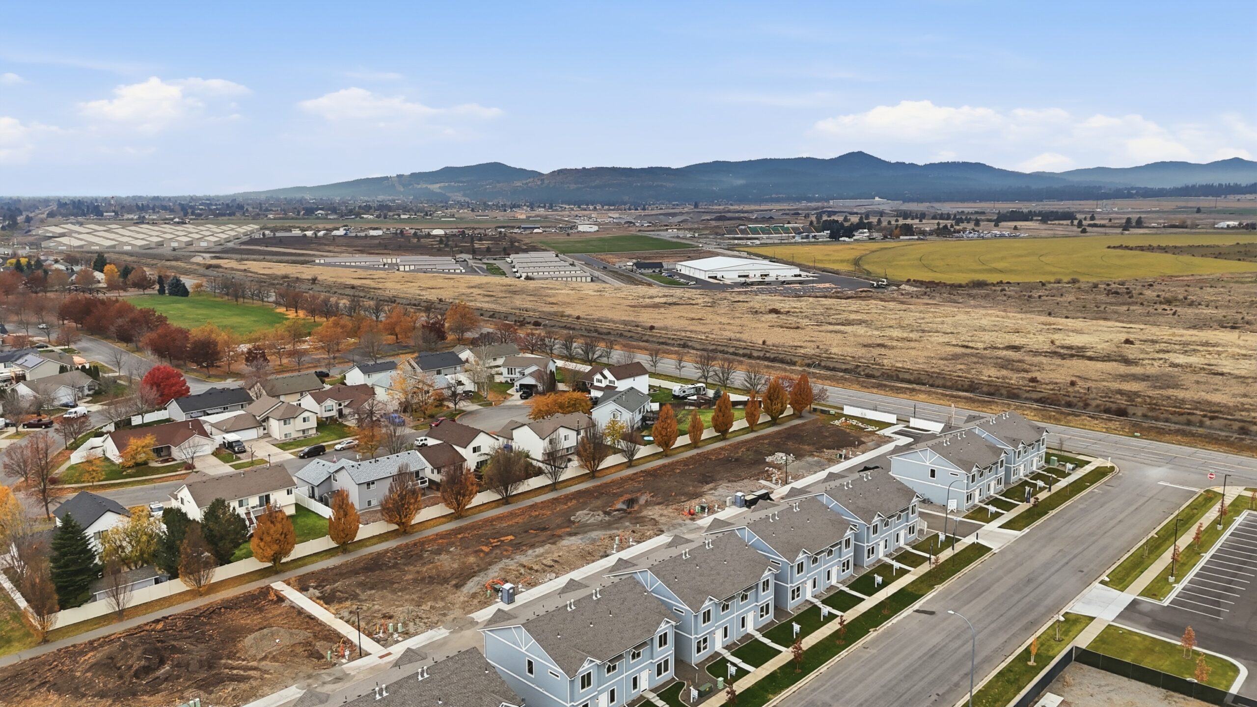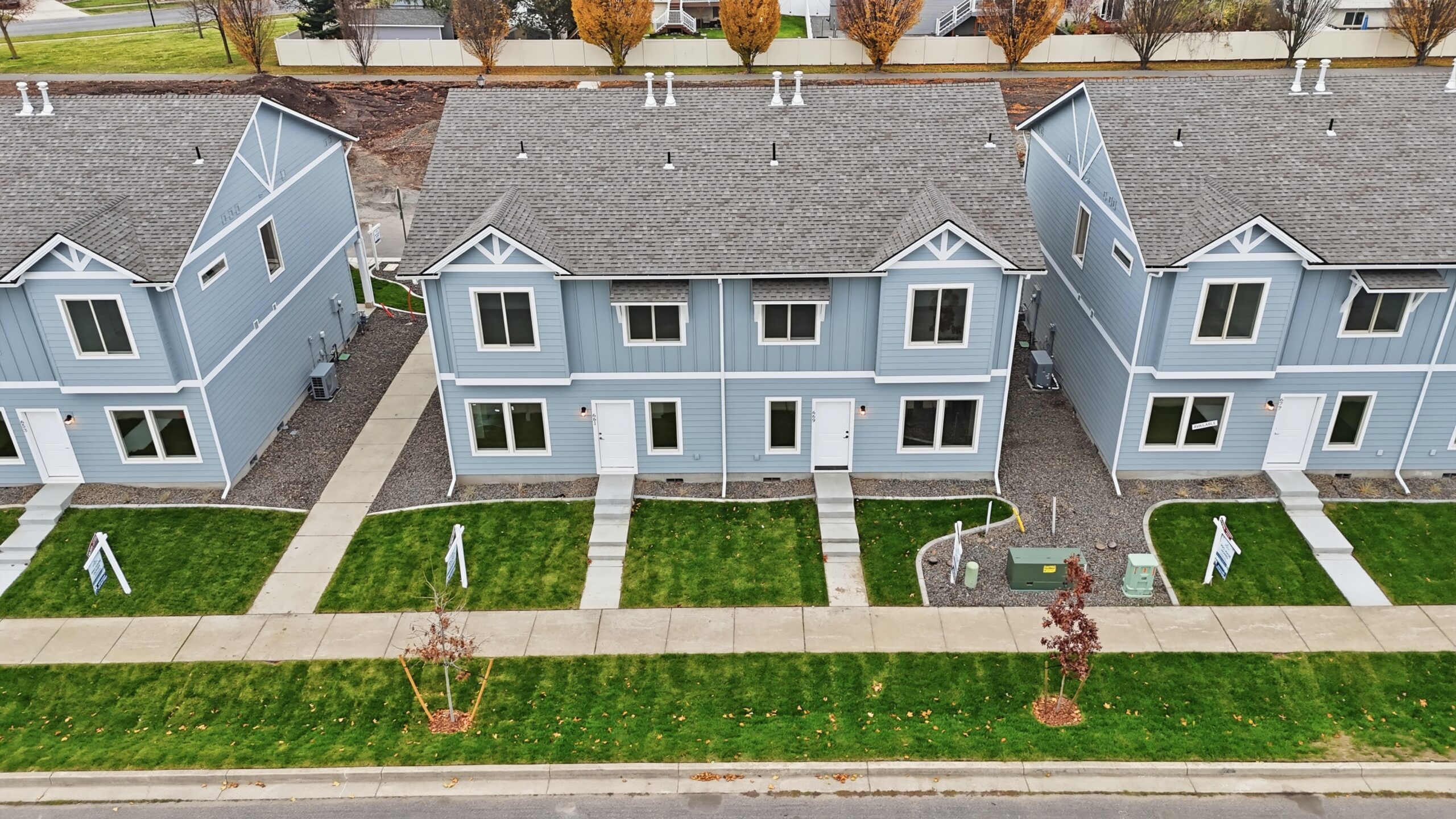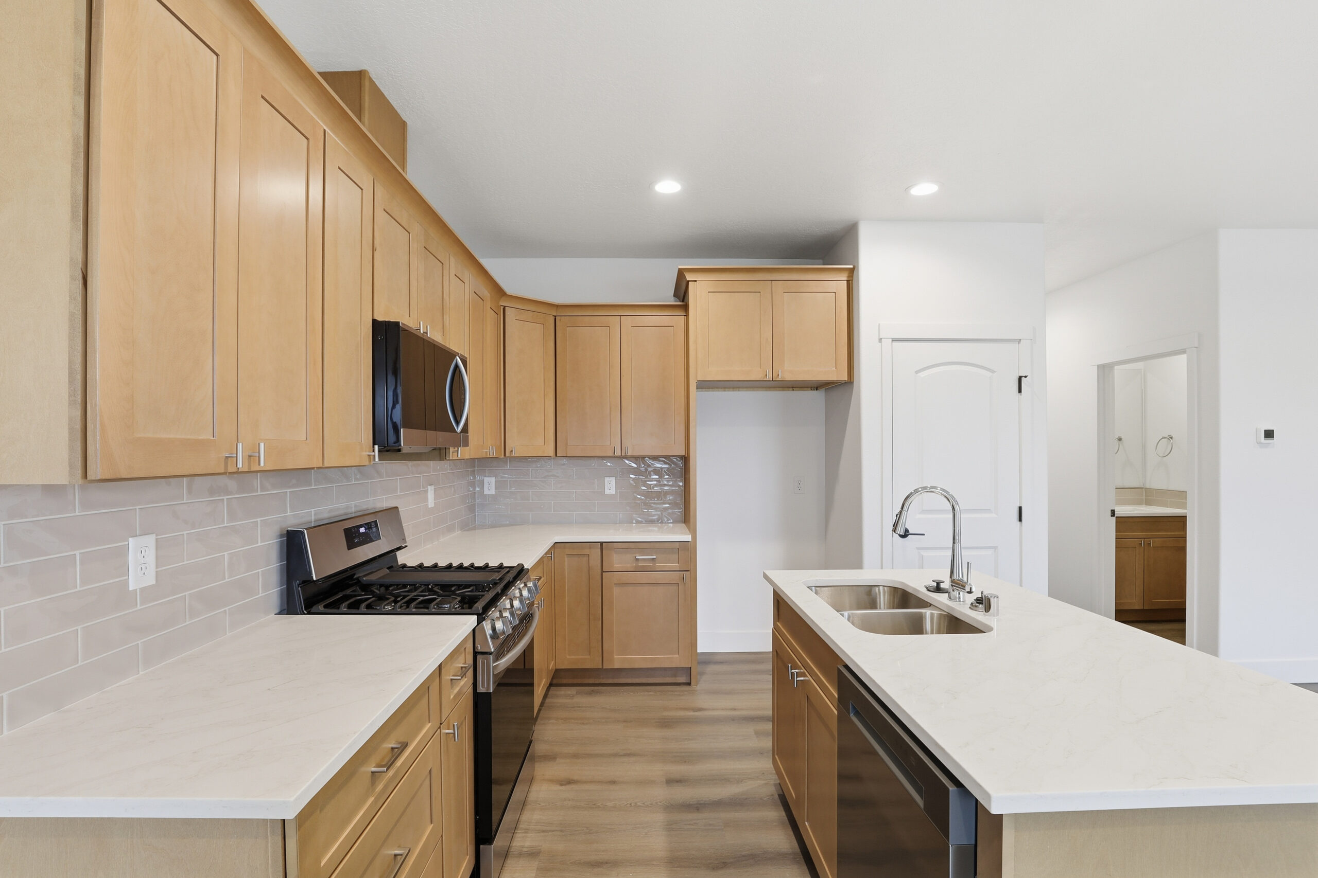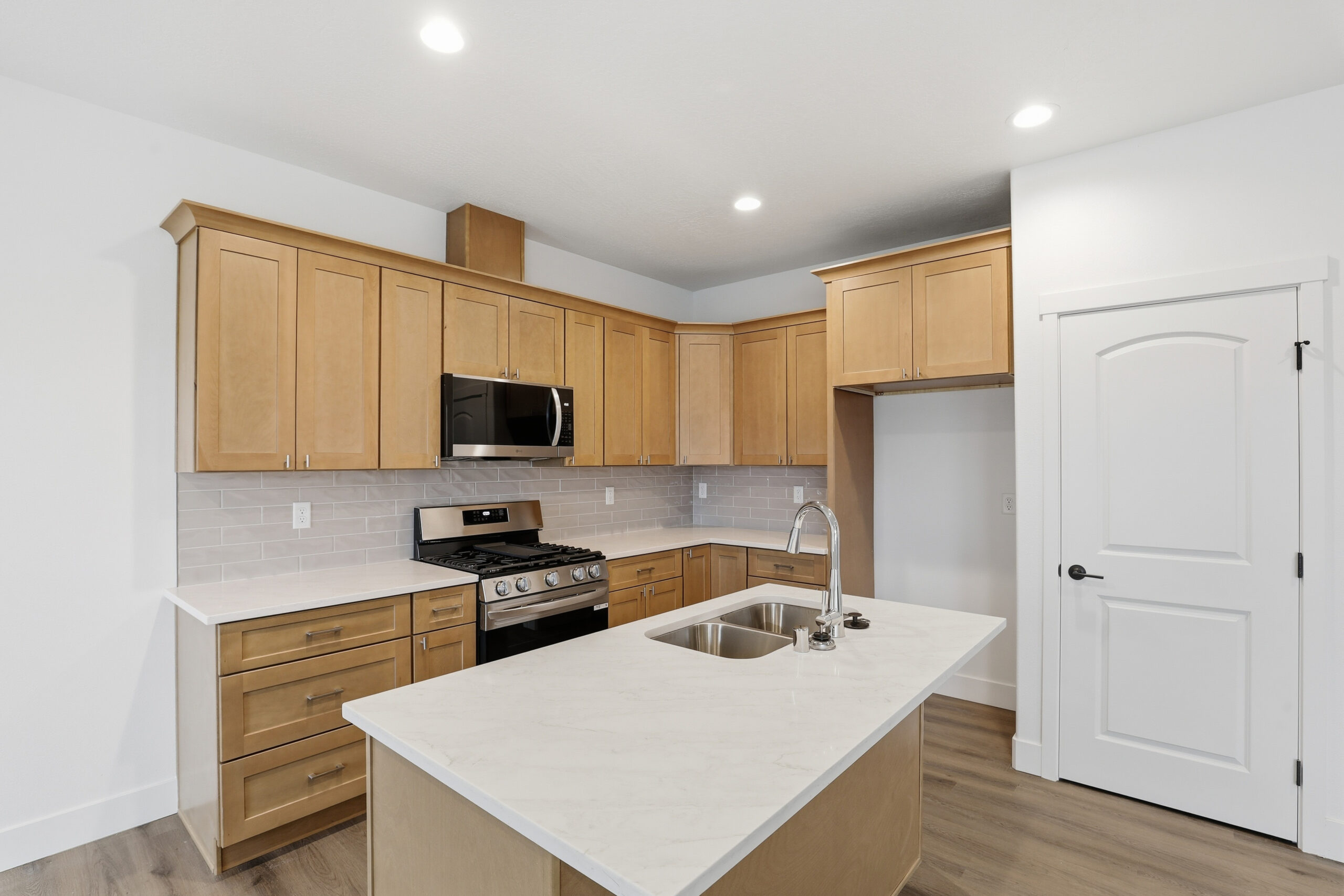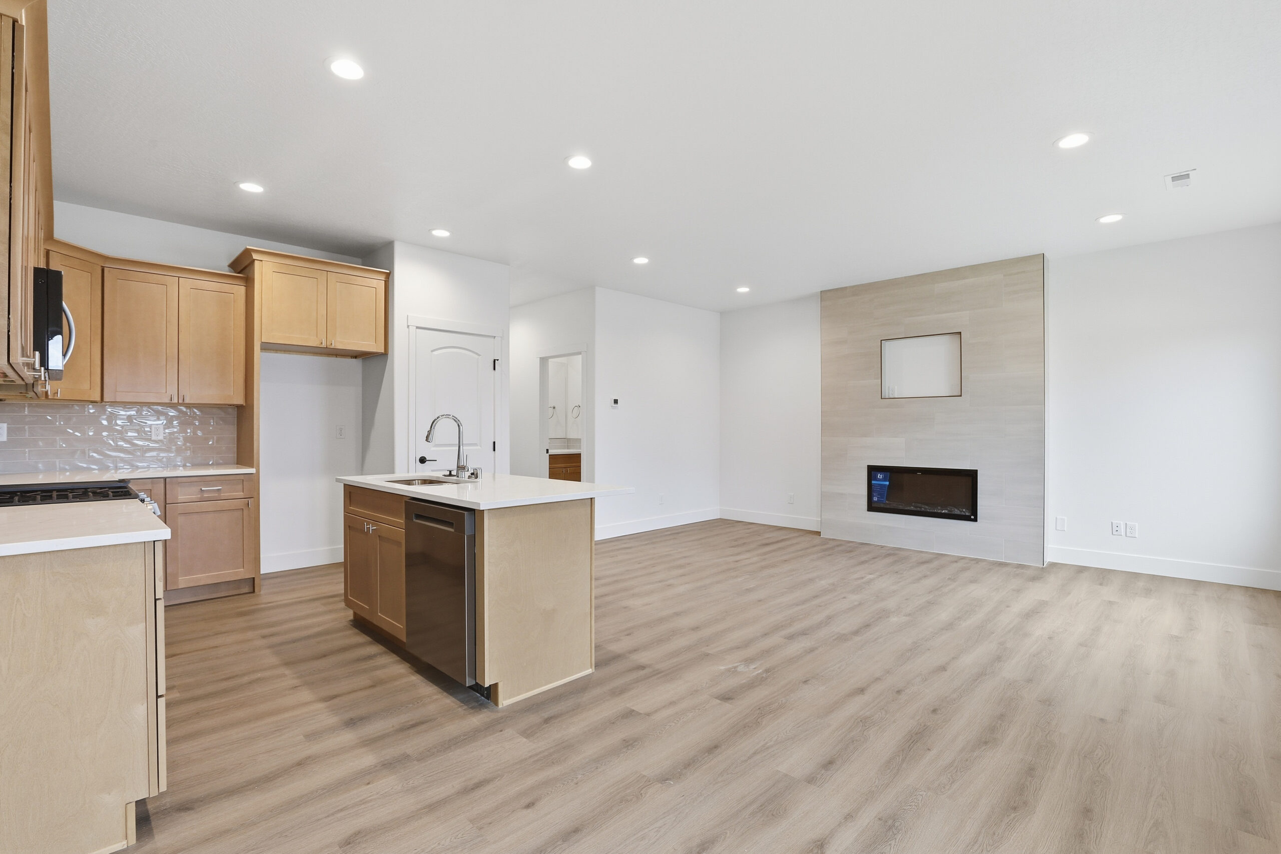 This 1593 townhouse plan highlights a spacious, open-concept design. The living room flows seamlessly into the dining area and a U-shaped kitchen with generous counter space and a pantry. Near the entrance, a powder room and staircase add functionality, along with convenient storage space.