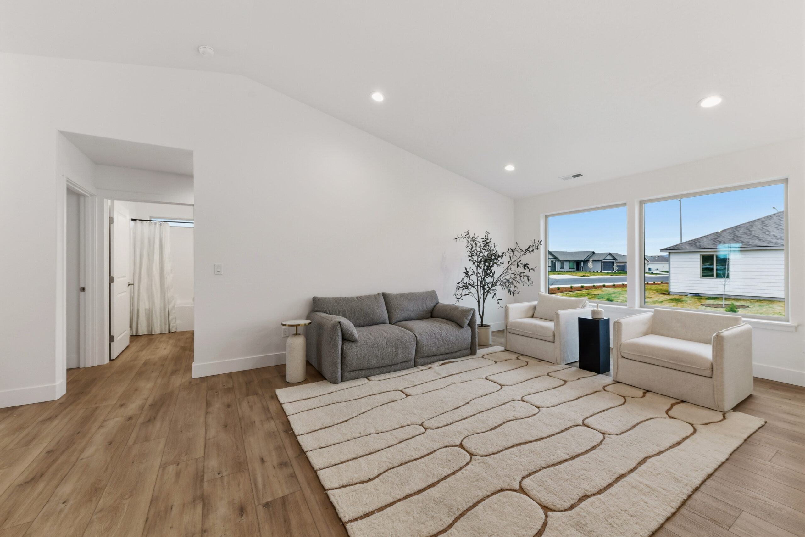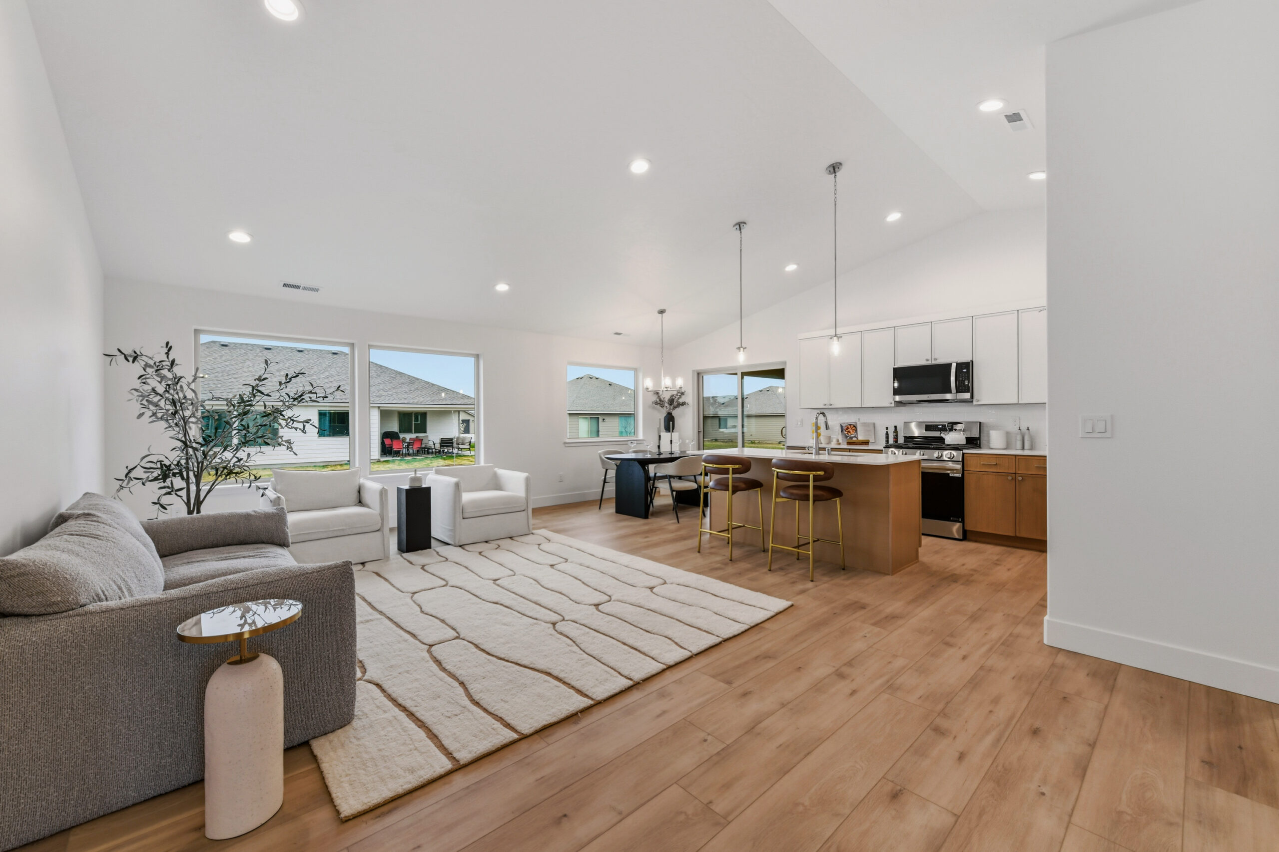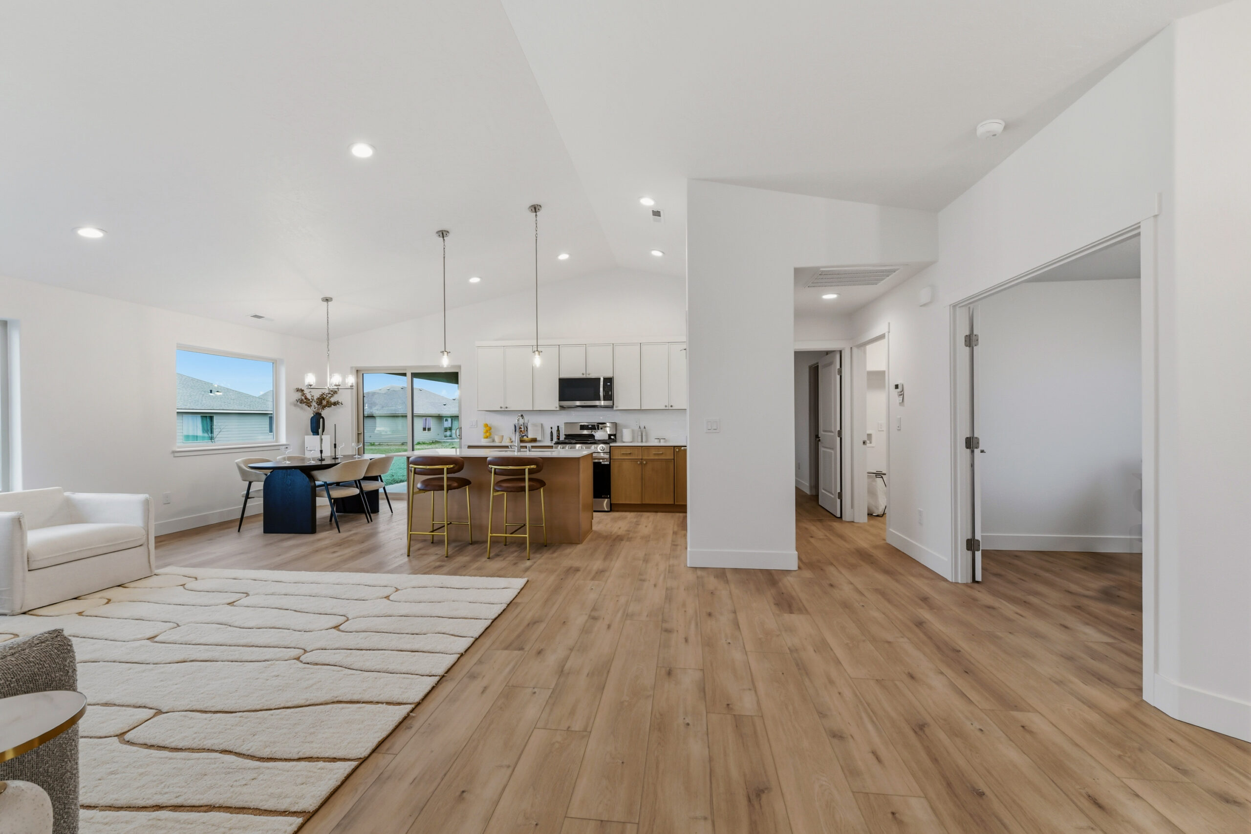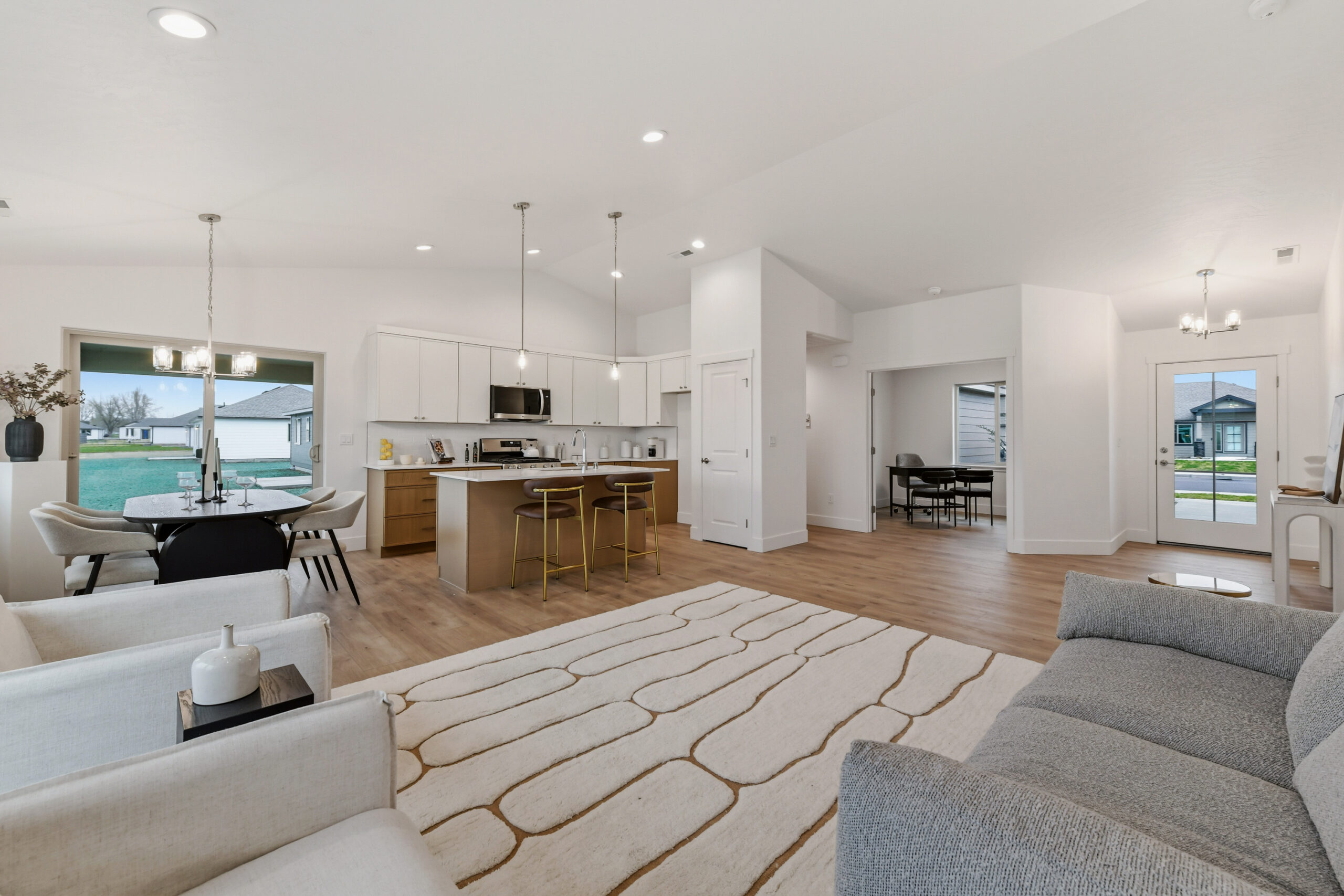Two additional bedrooms and a flex/office space provide versatility, with easy access to the second bathroom from the great room. Vaulted ceilings add to the warm and intimate atmosphere.