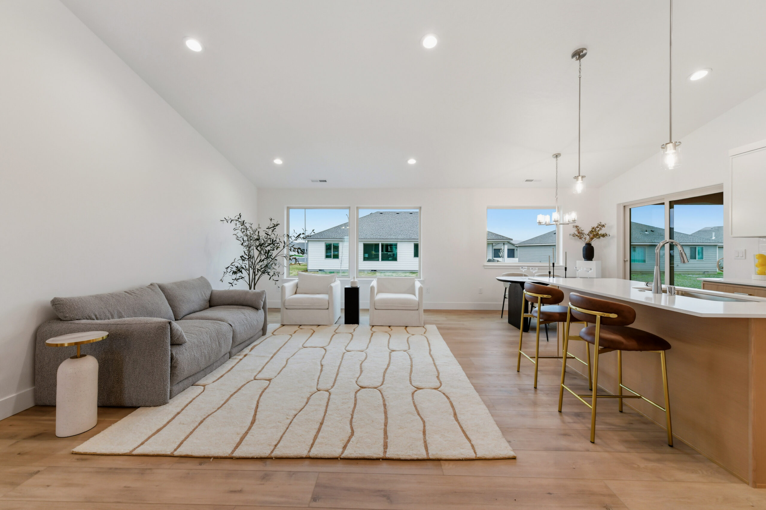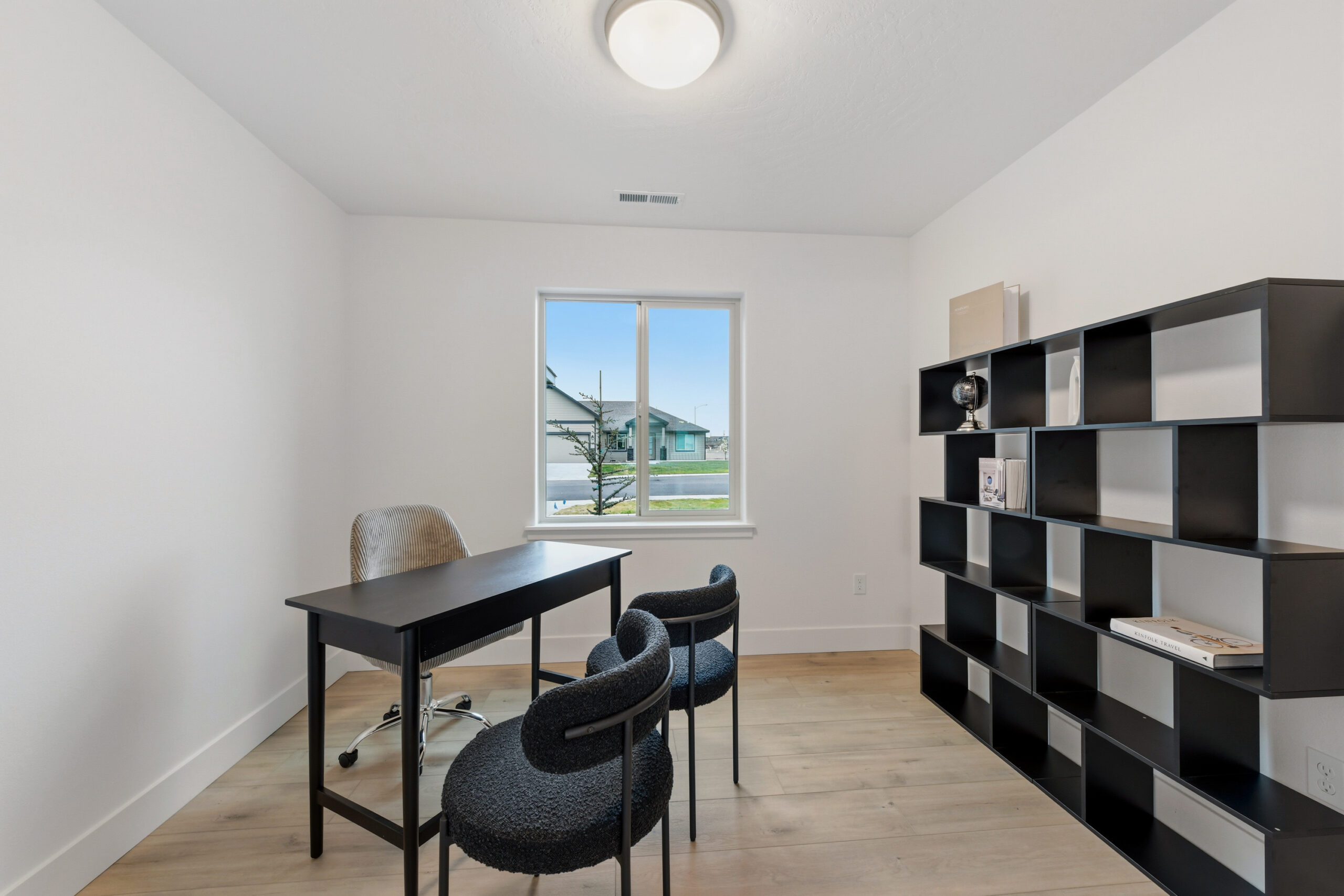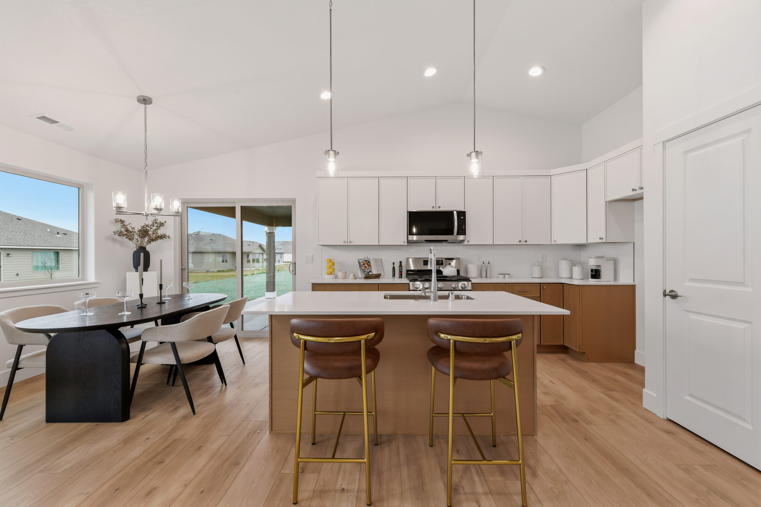Two additional bedrooms and a flex/office space provide versatility, with easy access to the second bathroom from the great room. Vaulted ceilings add to the warm and intimate atmosphere.