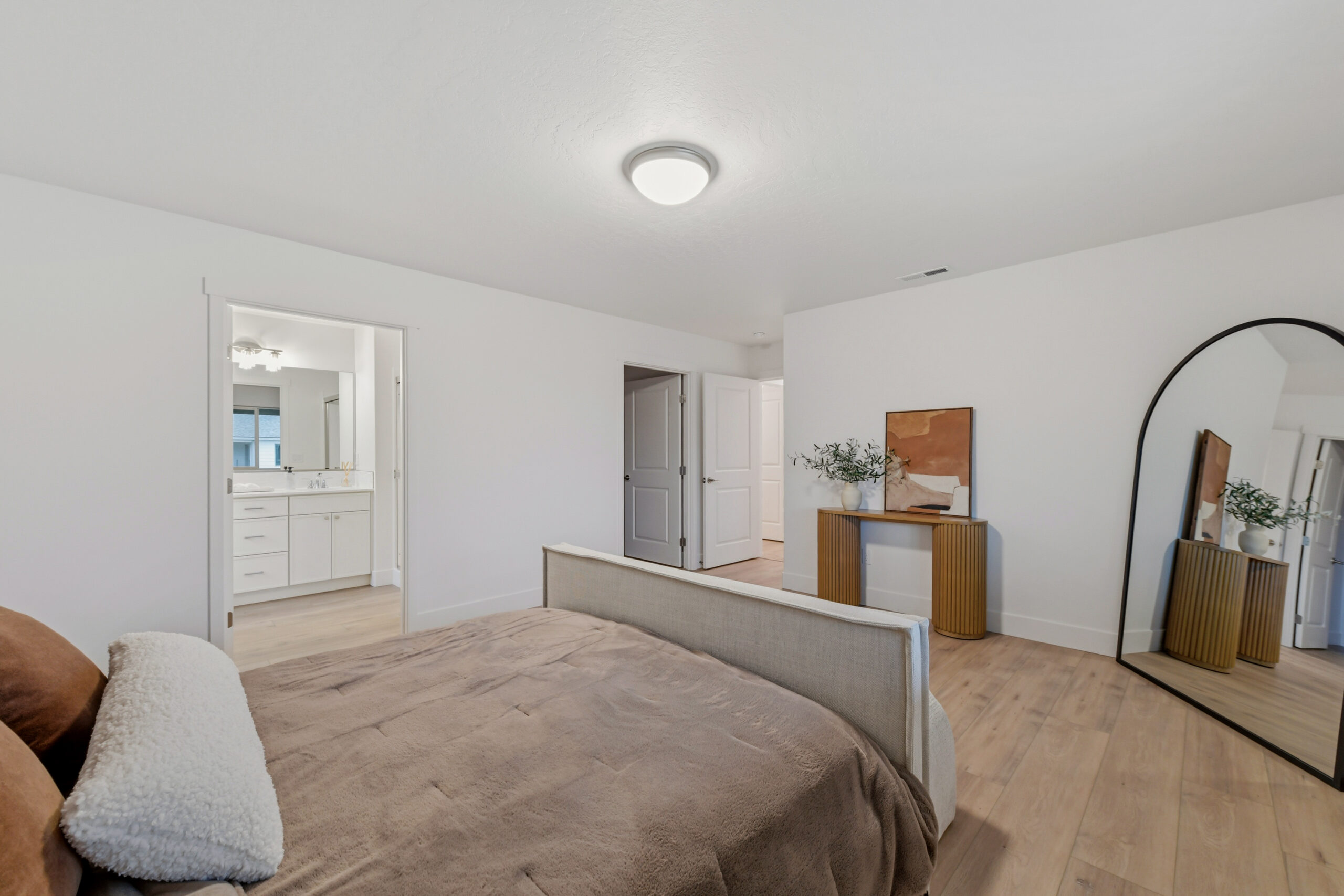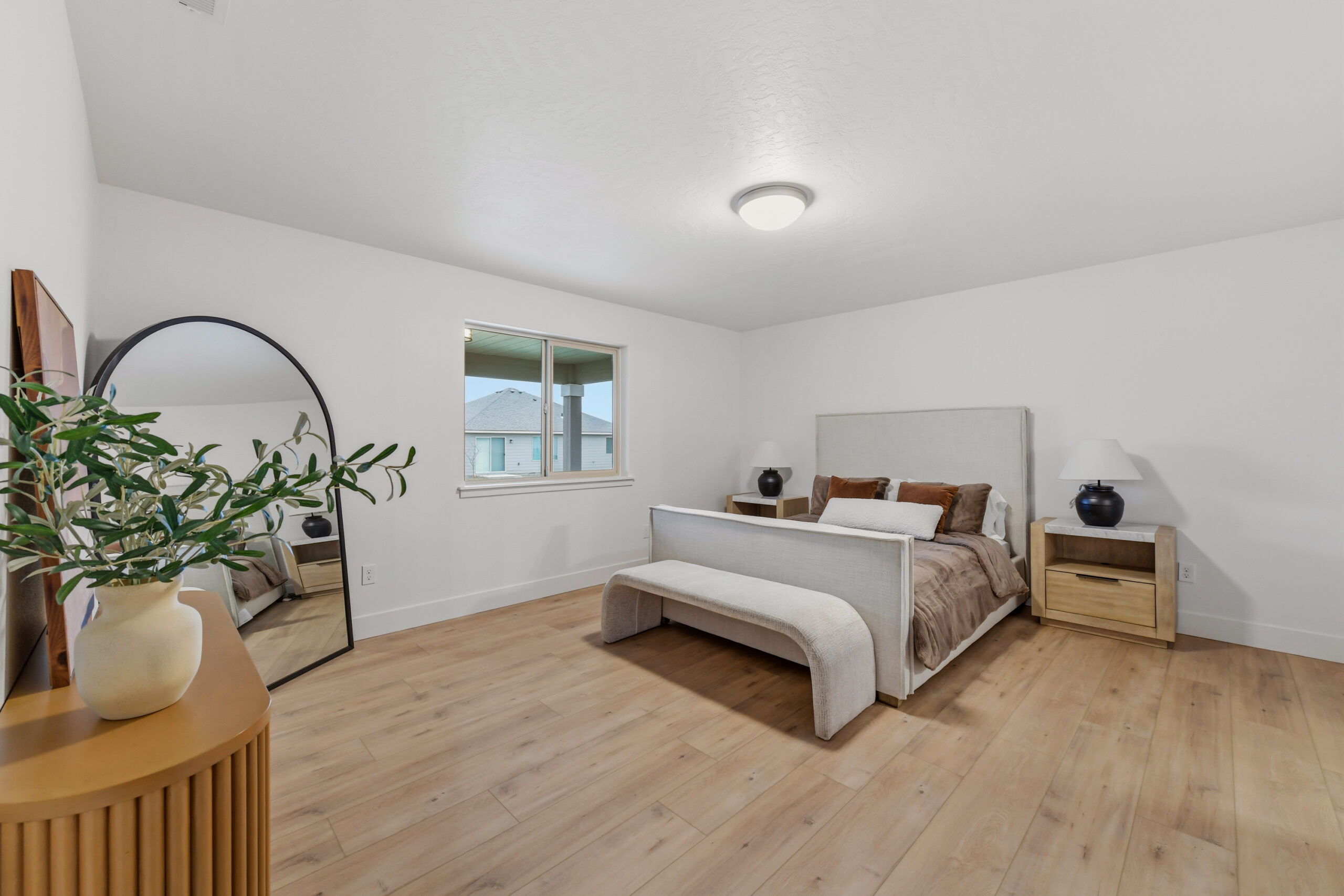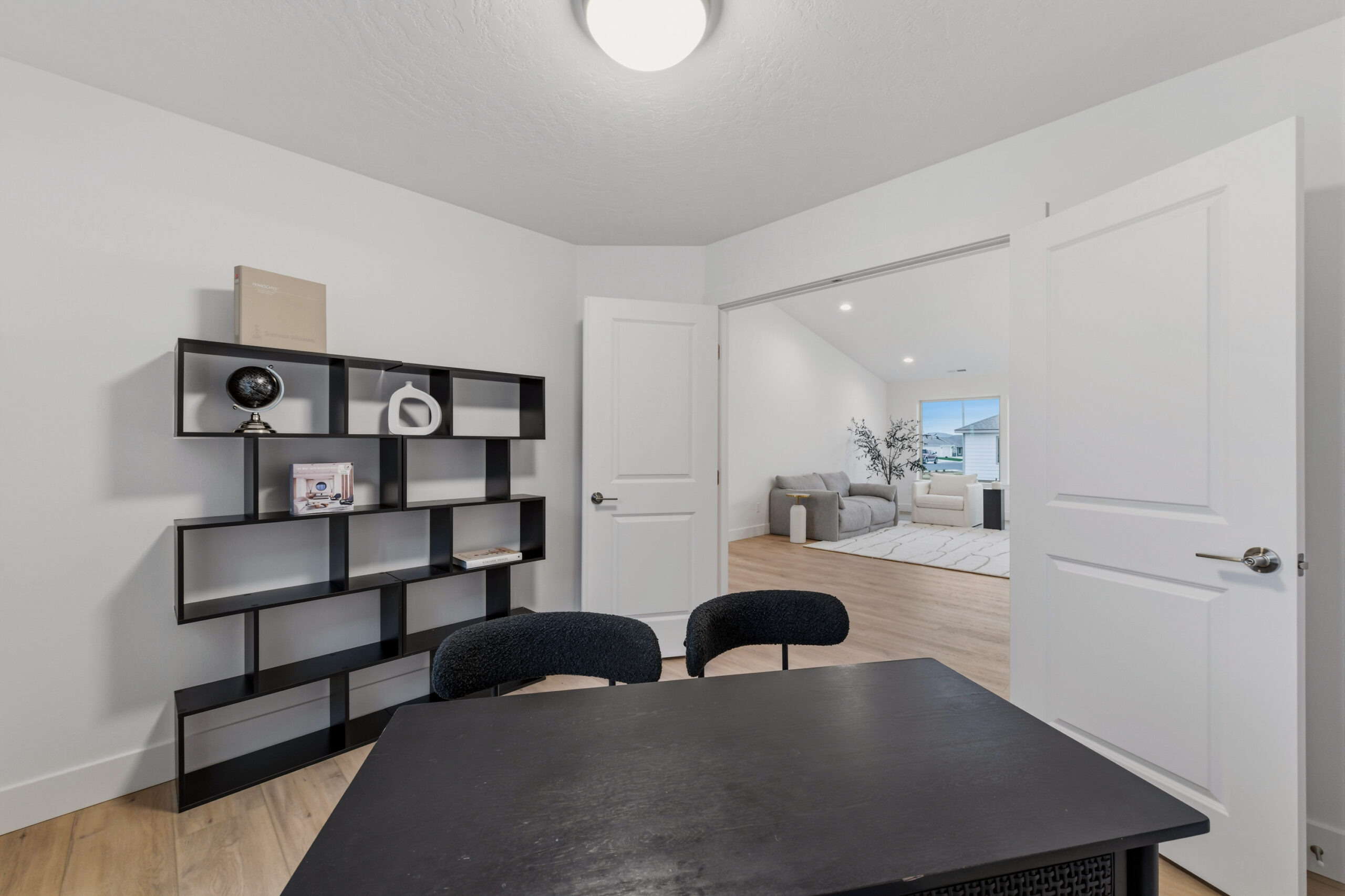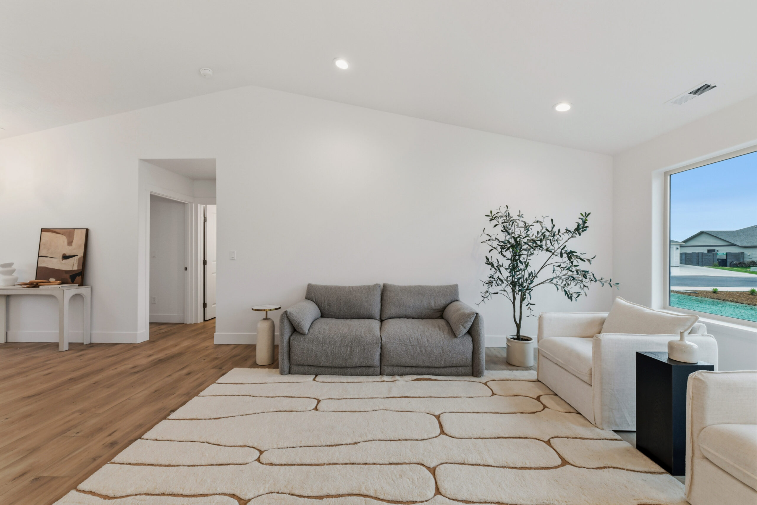 Two additional bedrooms and a flex/office space provide versatility, with easy access to the second bathroom from the great room. Vaulted ceilings add to the warm and intimate atmosphere.