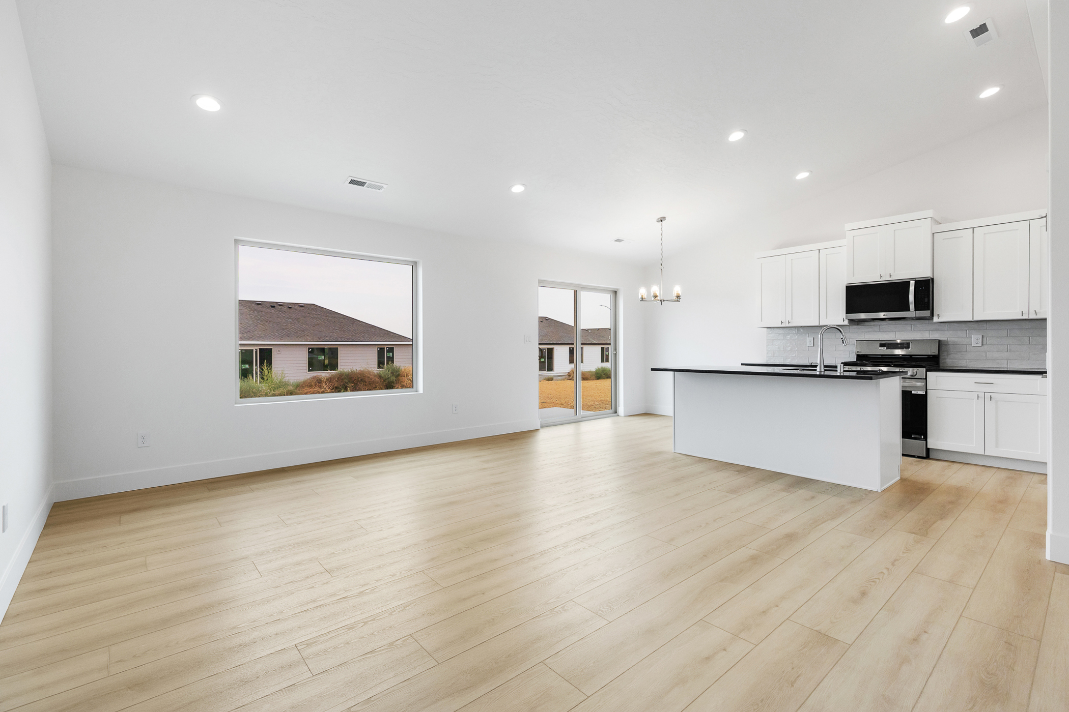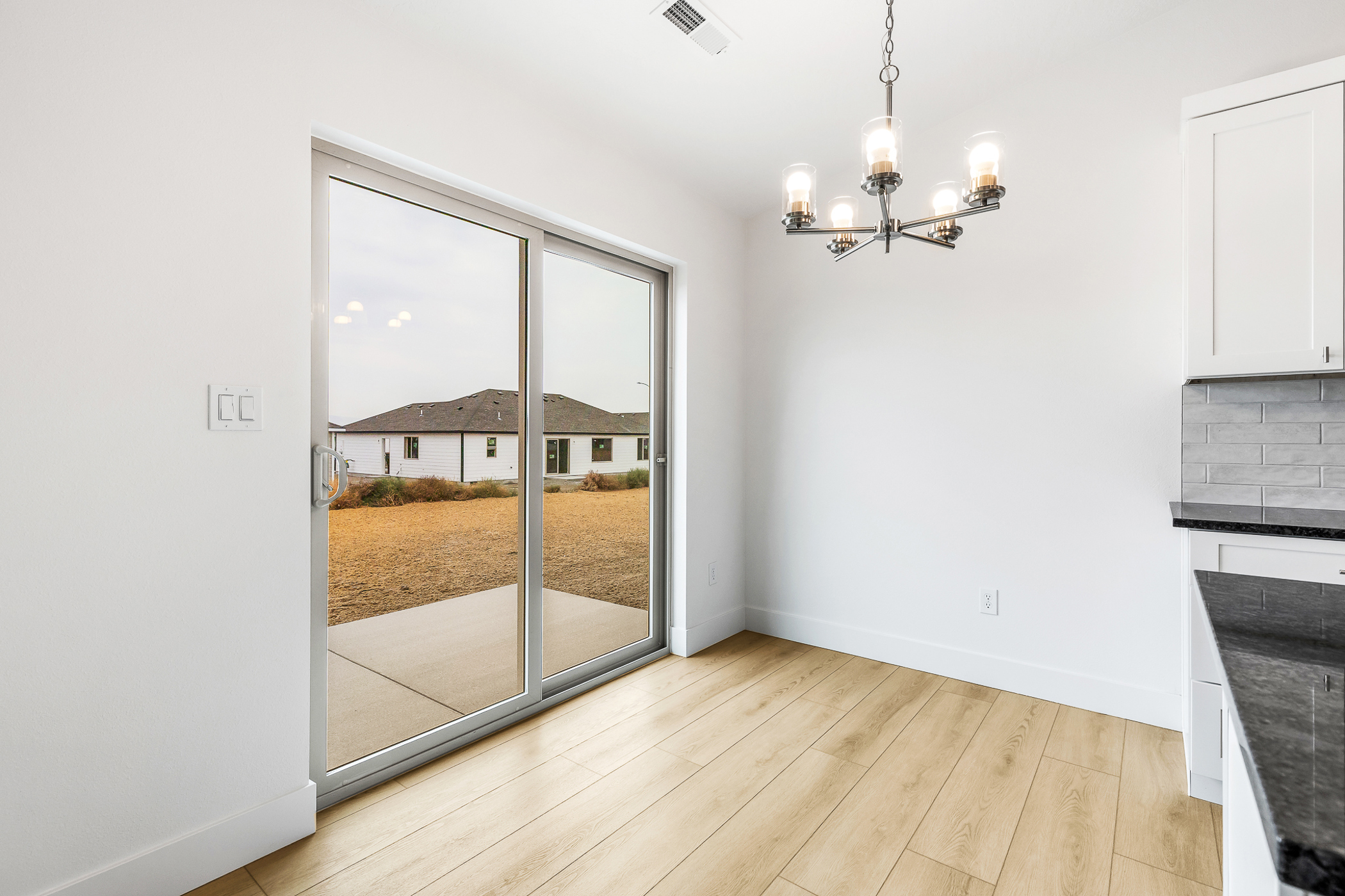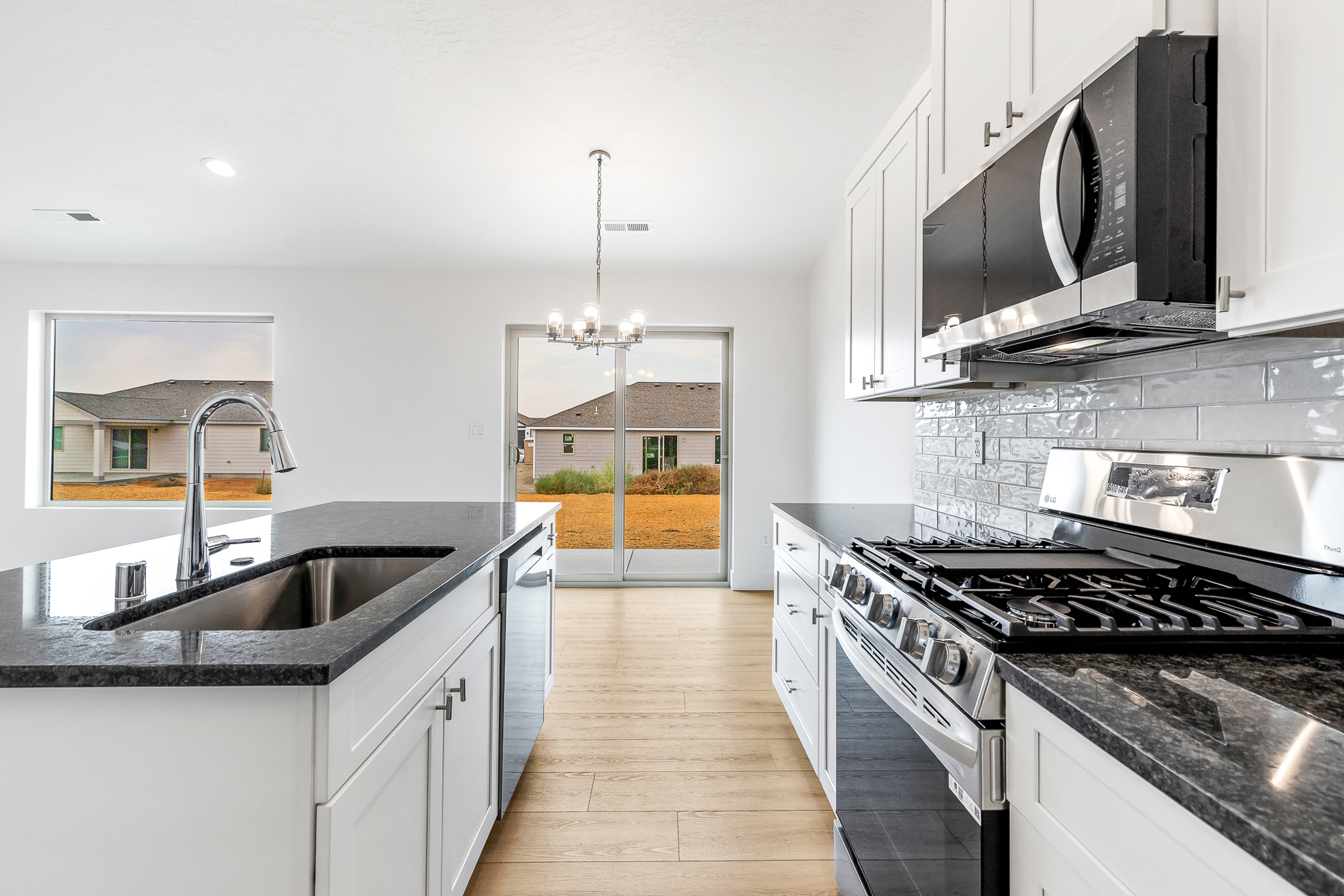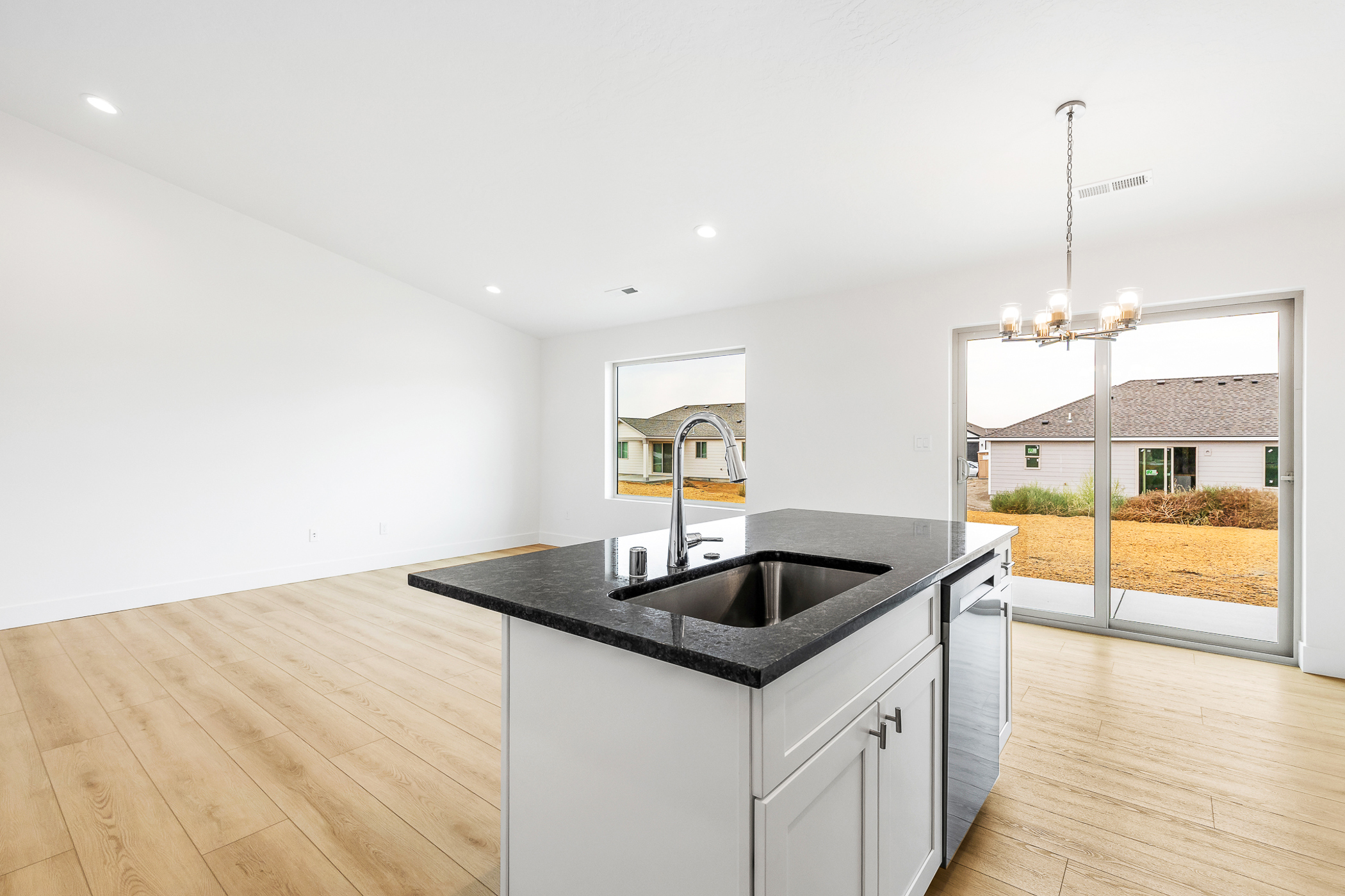 In the 1403 floor plan, you’ll be greeted by the grandeur of the high vaulted ceiling in the great room, seamlessly flowing into the spacious kitchen and dining area. Flooded with natural light from the large window and patio slide door, this space feels open and inviting. Conveniently located near the garage entrance, the laundry room offers ease and functionality.