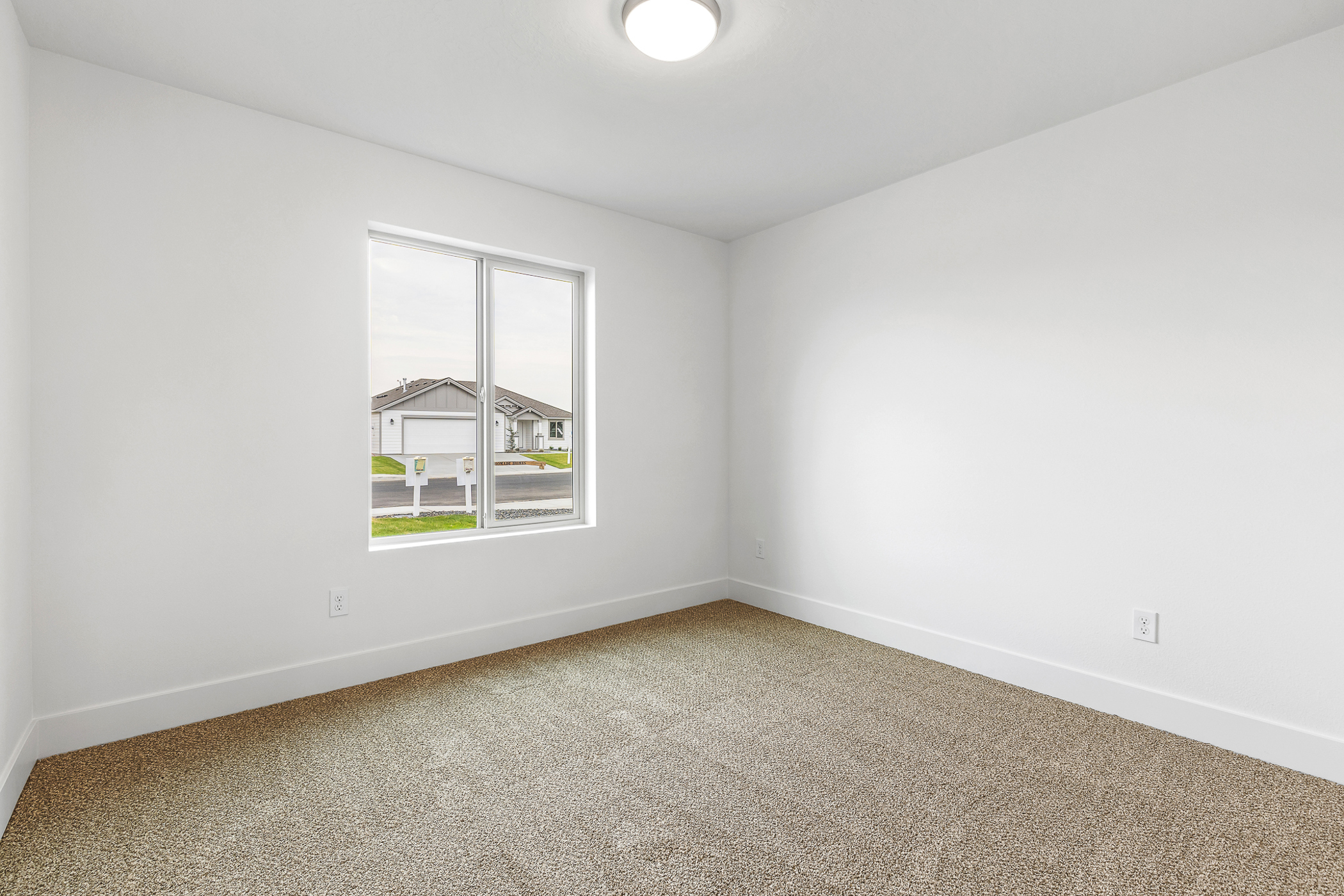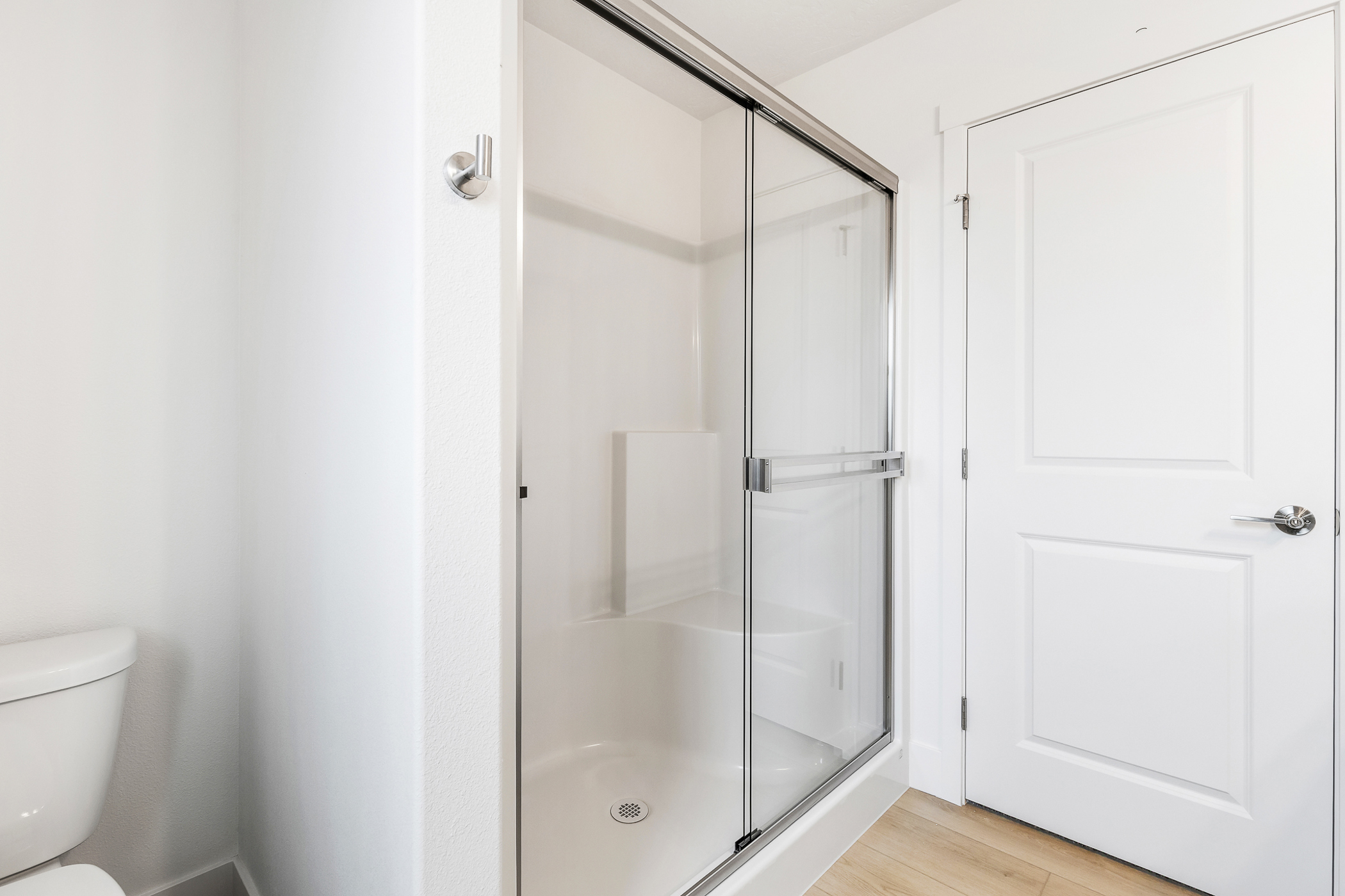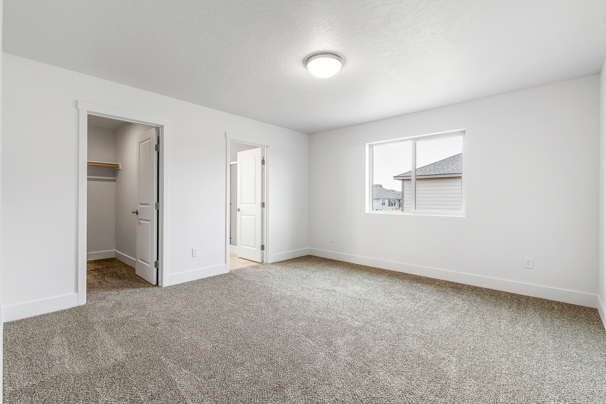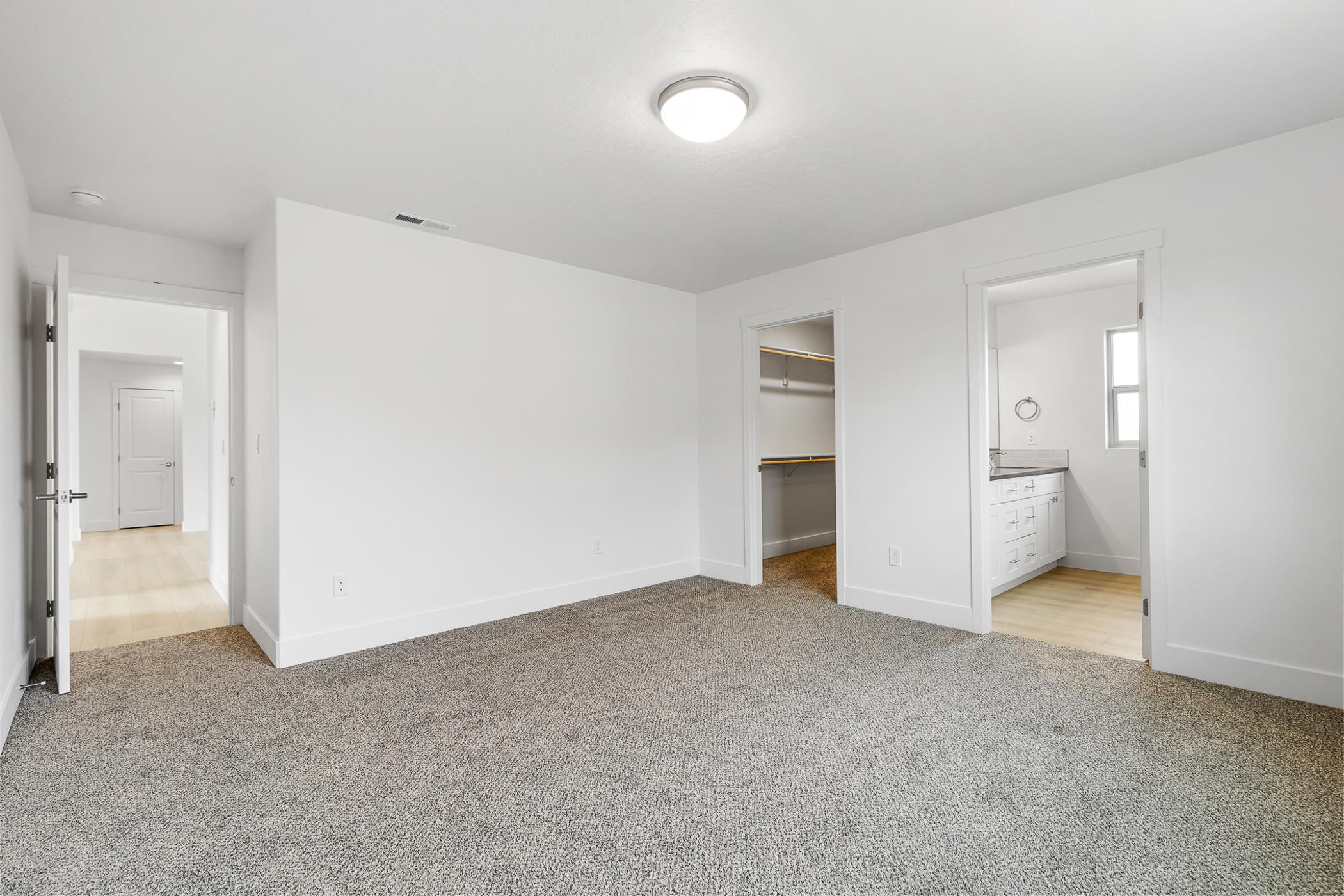 Retreat to the main suite featuring a dual vanity bathroom with options for a fiberglass shower or customizable tiled walls. Plus, indulge in the dream-worthy walk-in closet. At the opposite end, two bedrooms share a well-appointed bathroom.