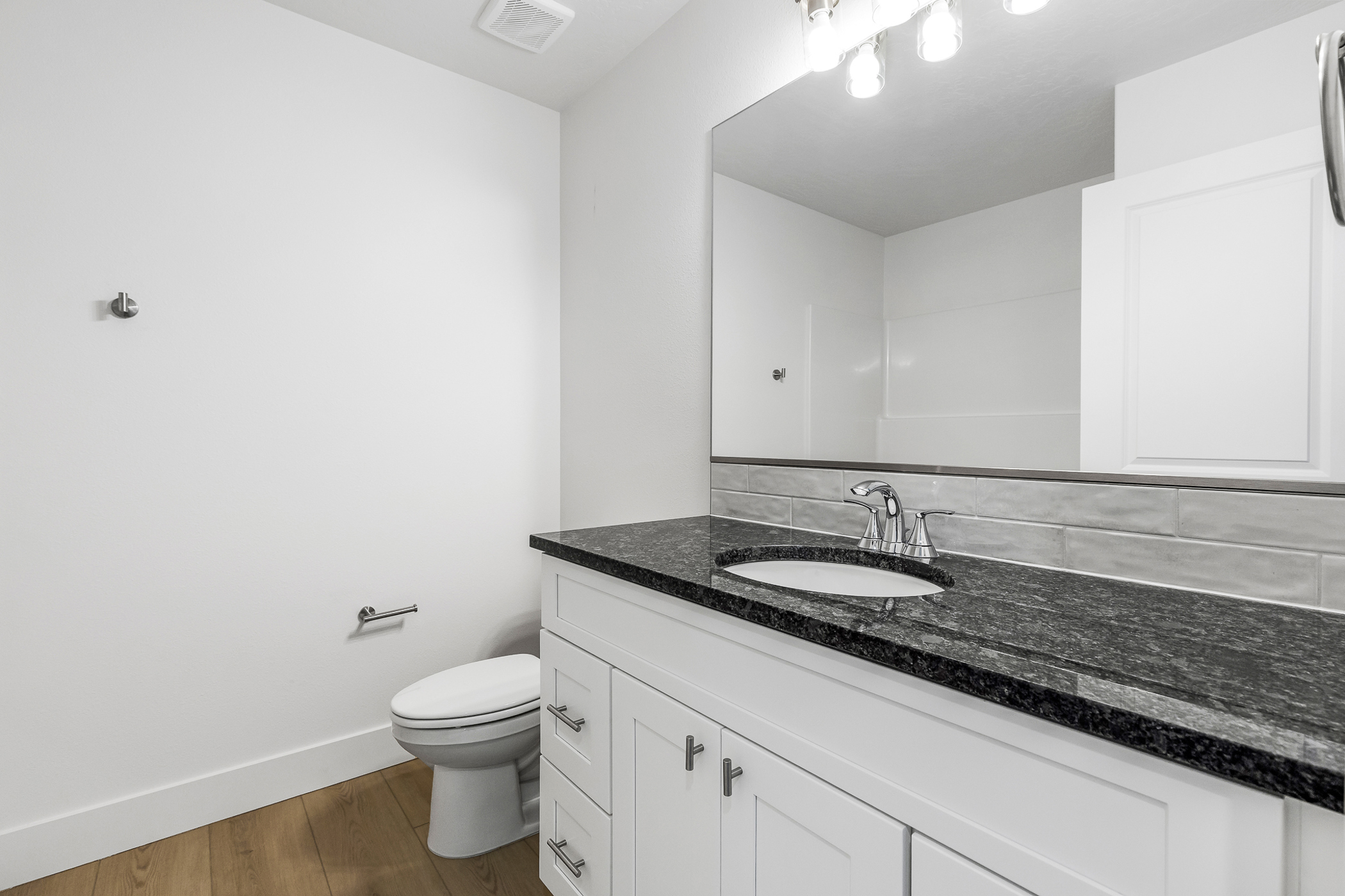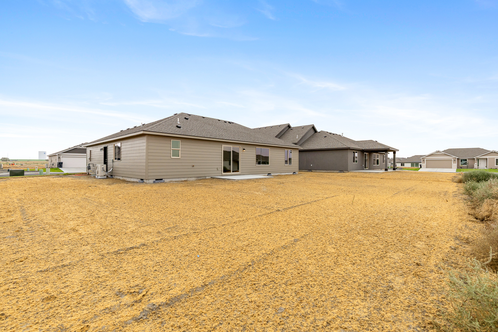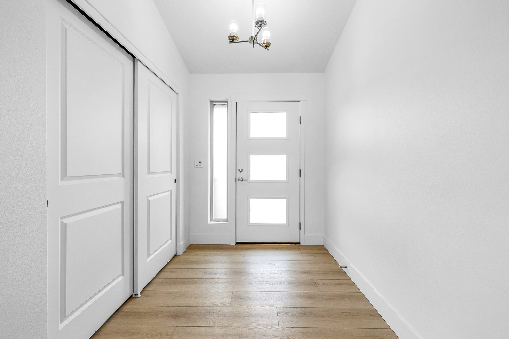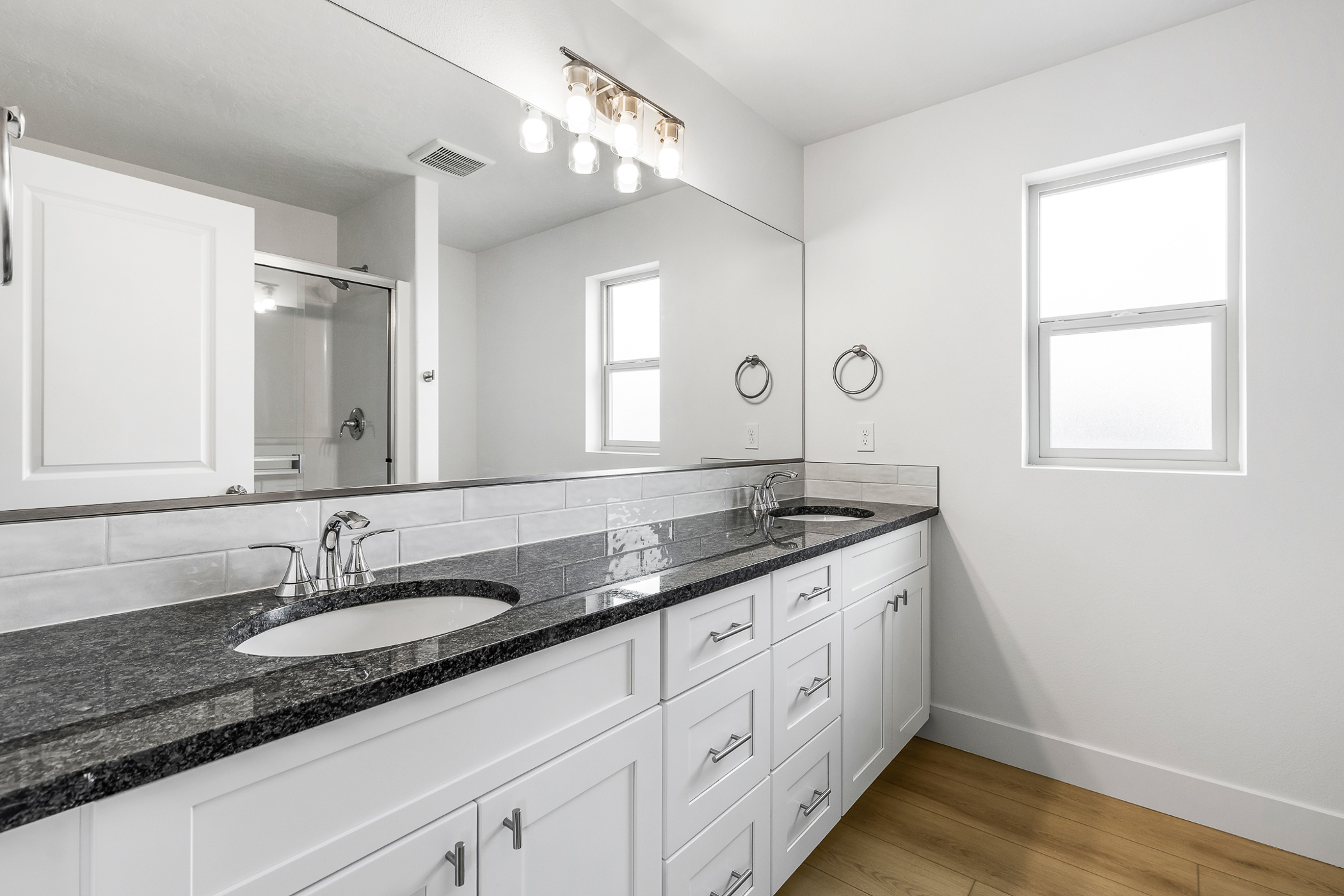Retreat to the main suite featuring a dual vanity bathroom with options for a fiberglass shower or customizable tiled walls. Plus, indulge in the dream-worthy walk-in closet. At the opposite end, two bedrooms share a well-appointed bathroom.