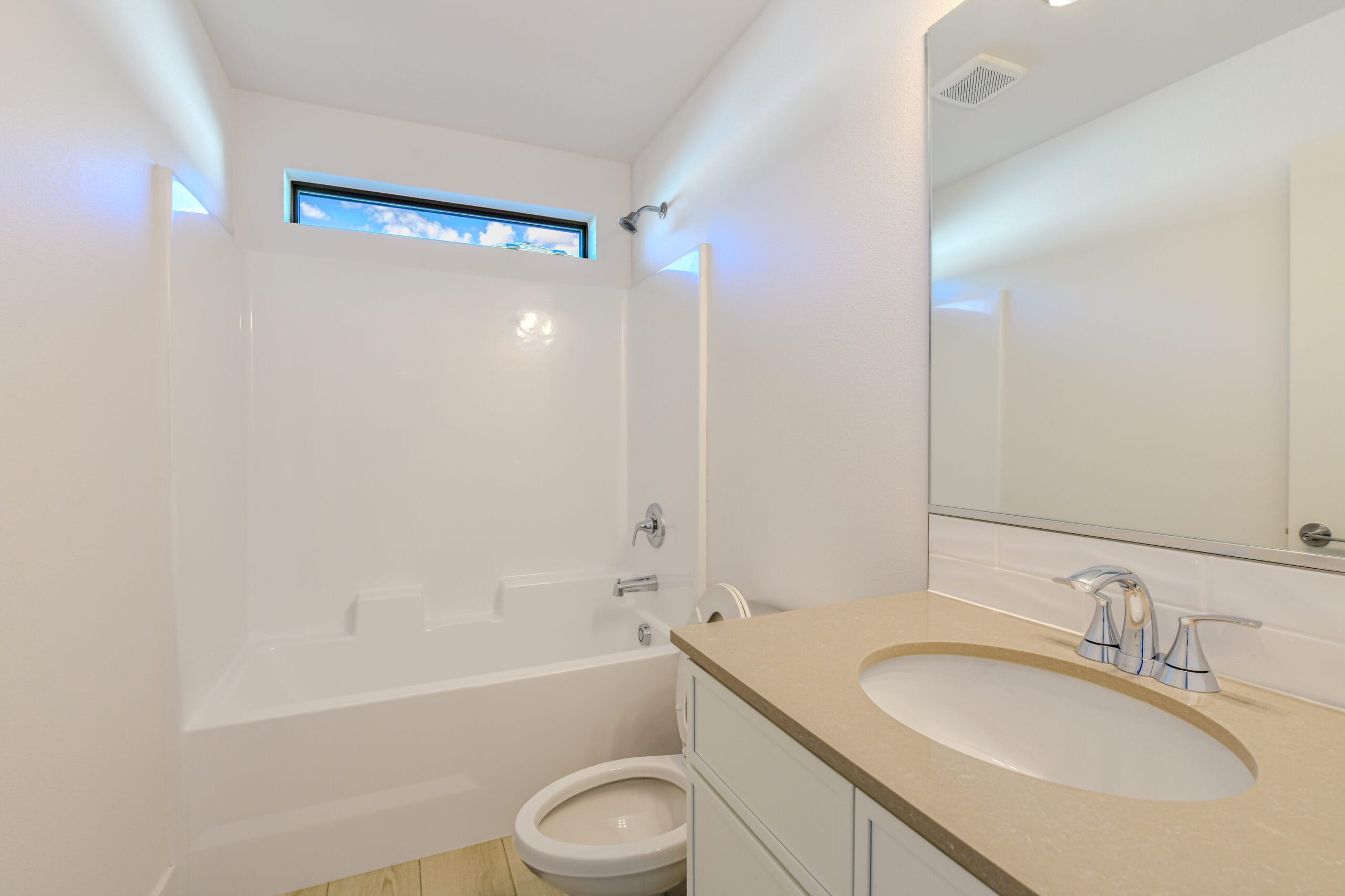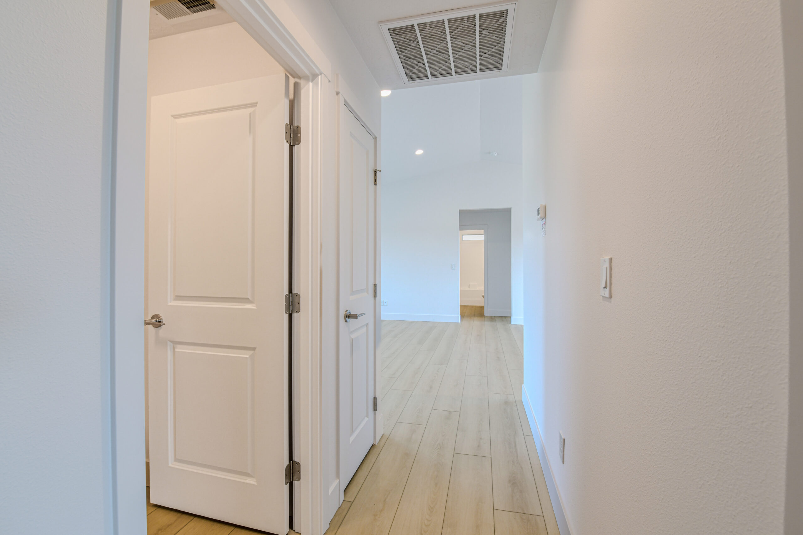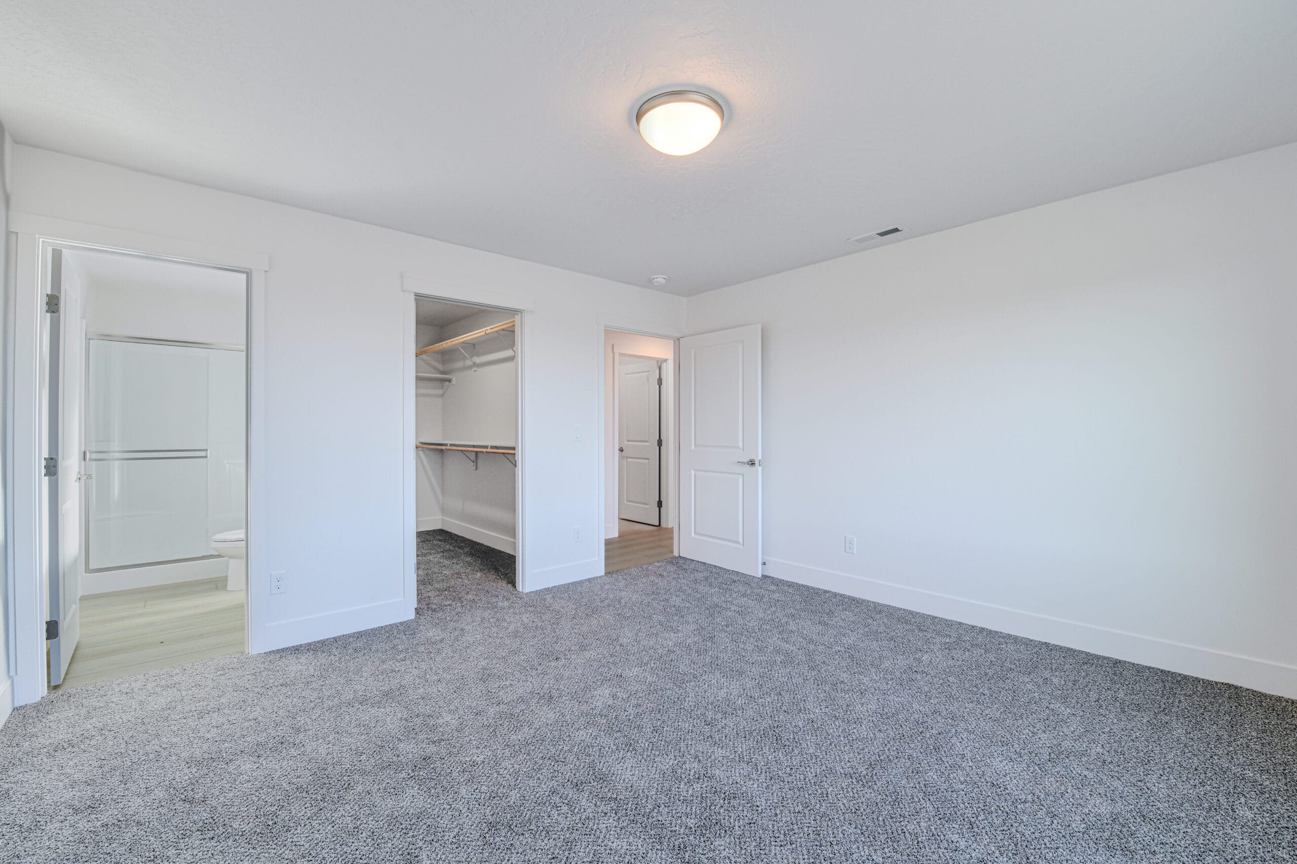 The main suite offers a luxurious walk-in closet and a private bathroom with a spacious walk-in shower. Two bedrooms are situated at the opposite end of the home, with a bathroom conveniently nestled between them.