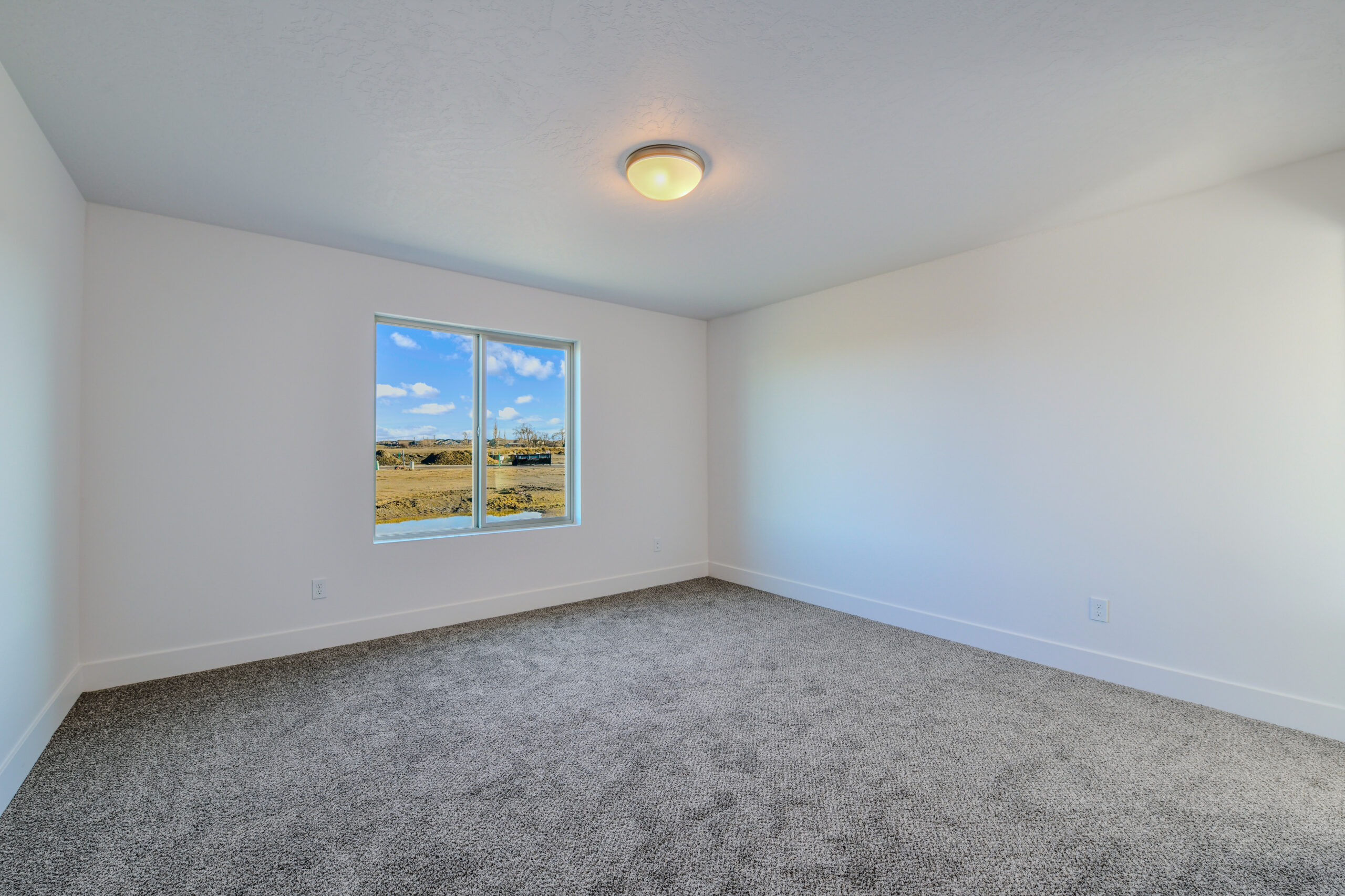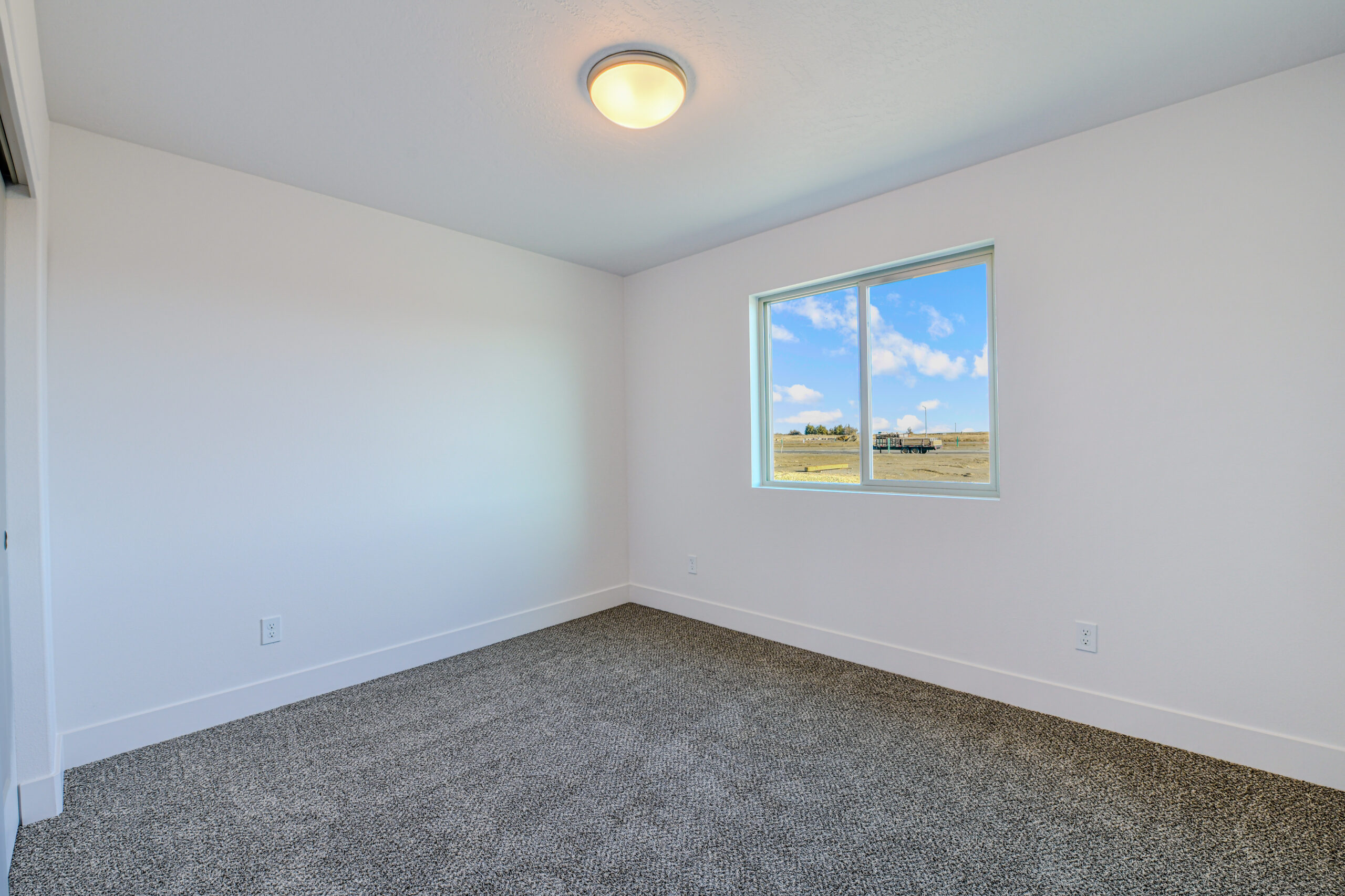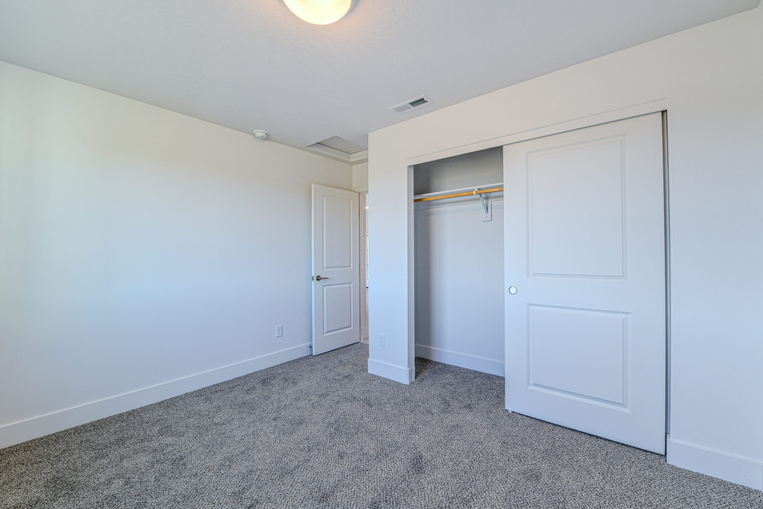 The main suite offers a luxurious walk-in closet and a private bathroom with a spacious walk-in shower. Two bedrooms are situated at the opposite end of the home, with a bathroom conveniently nestled between them.