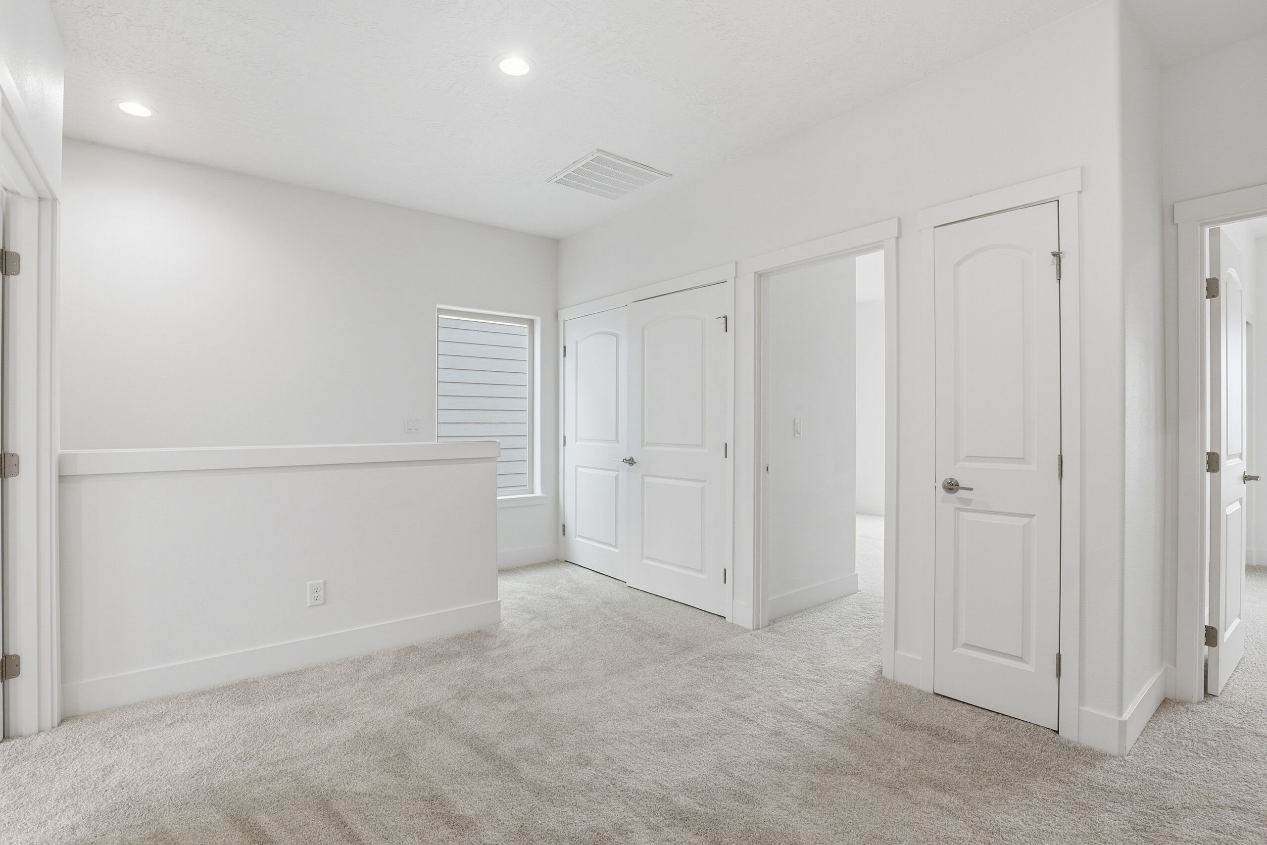 Upstairs, three bedrooms and two bathrooms maximize comfort and privacy. The primary bedroom is set apart for added seclusion, while a central hallway connects all rooms. A linen closet and laundry area enhance convenience for modern living.