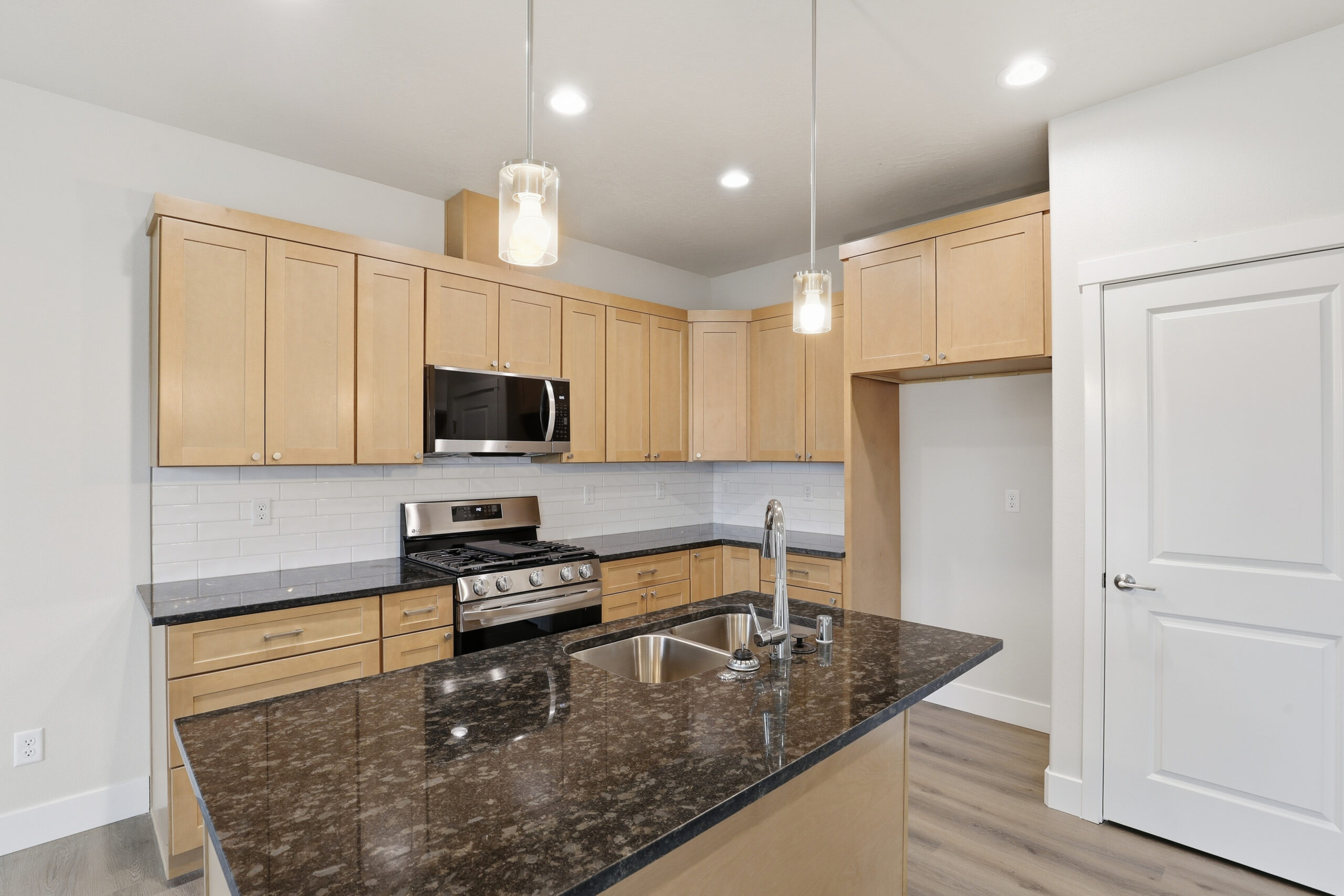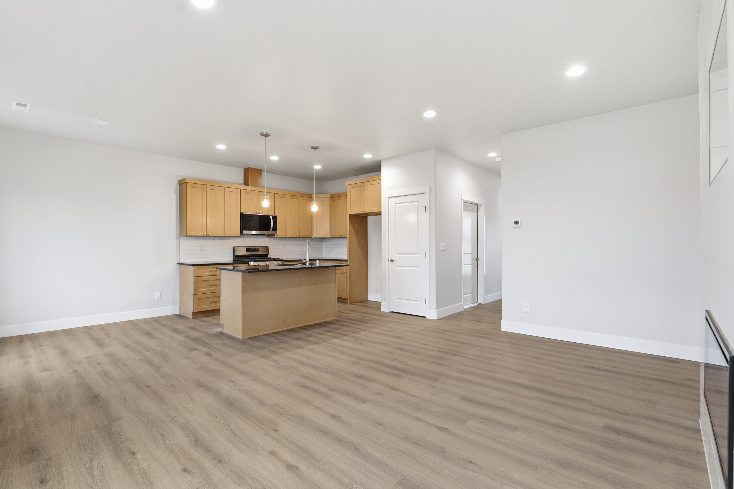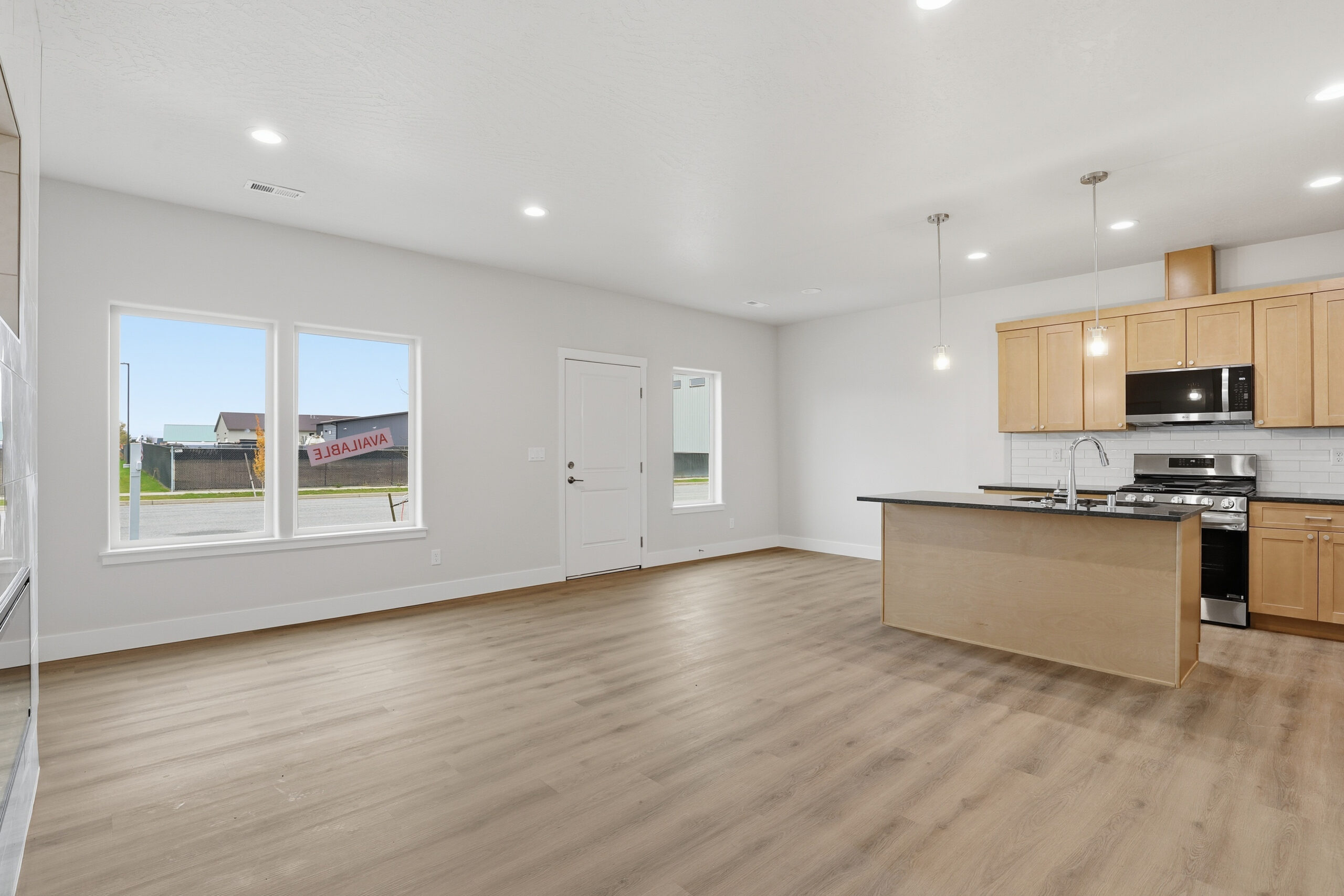 This 1593 townhouse plan highlights a spacious, open-concept design. The living room flows seamlessly into the dining area and a U-shaped kitchen with generous counter space and a pantry. Near the entrance, a powder room and staircase add functionality, along with convenient storage space.