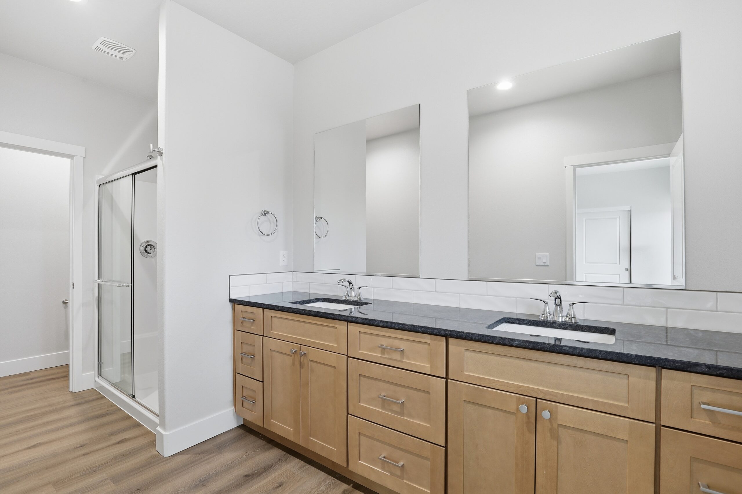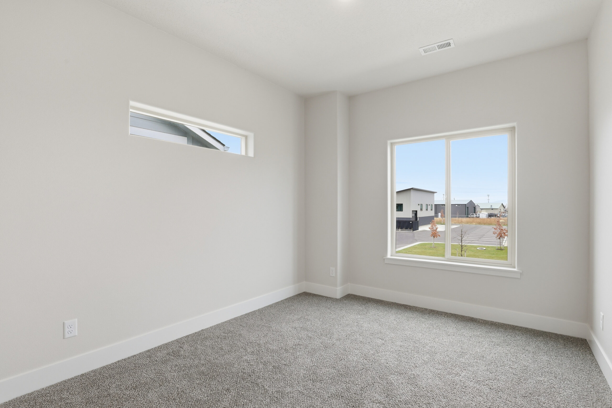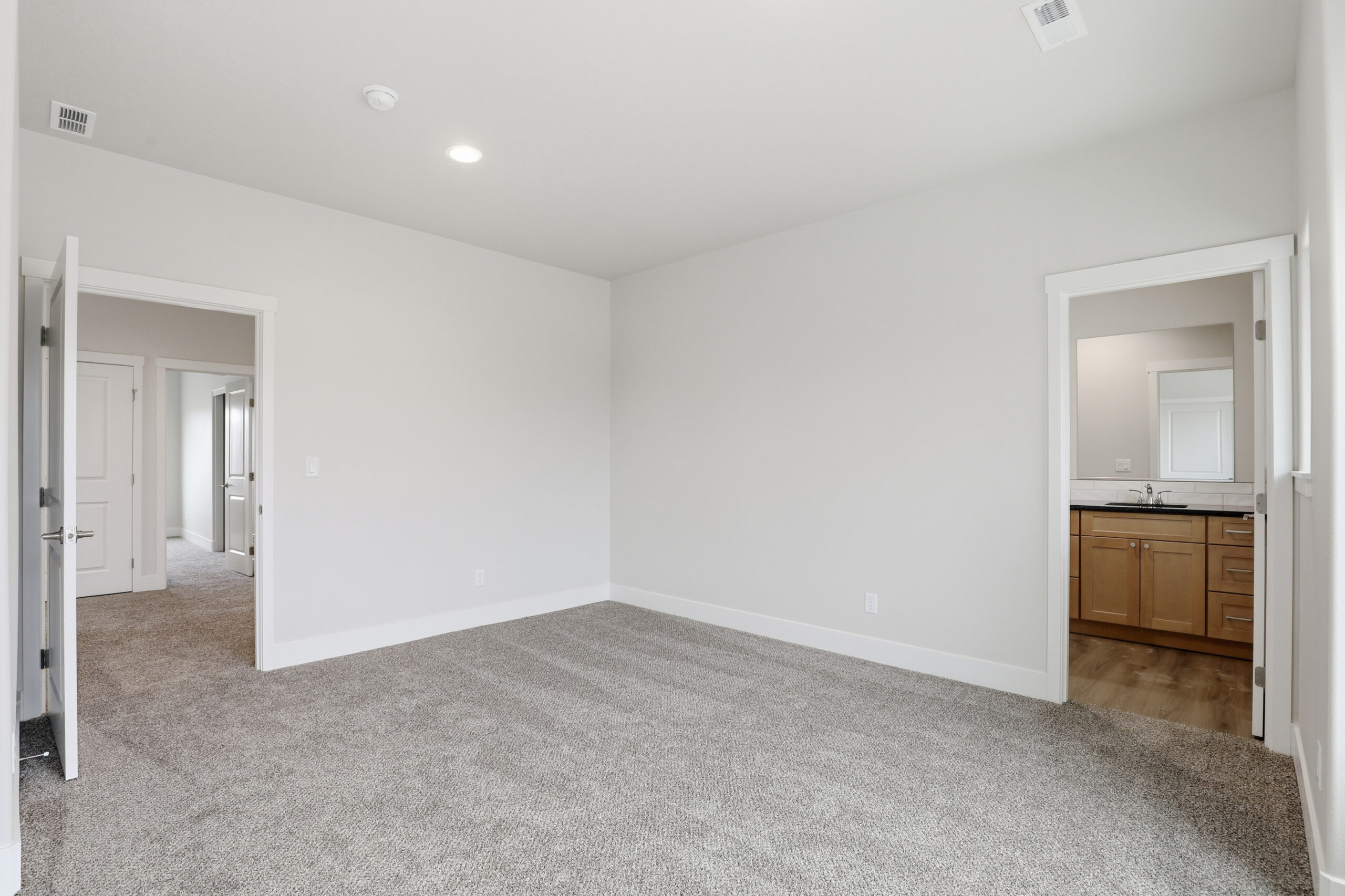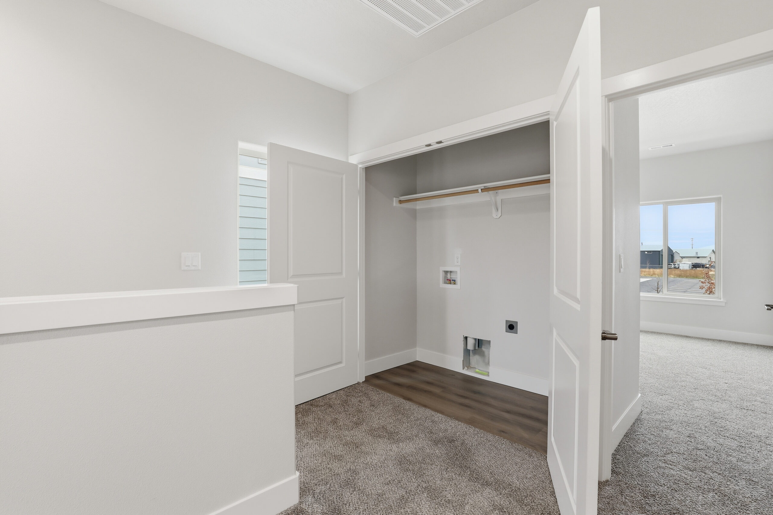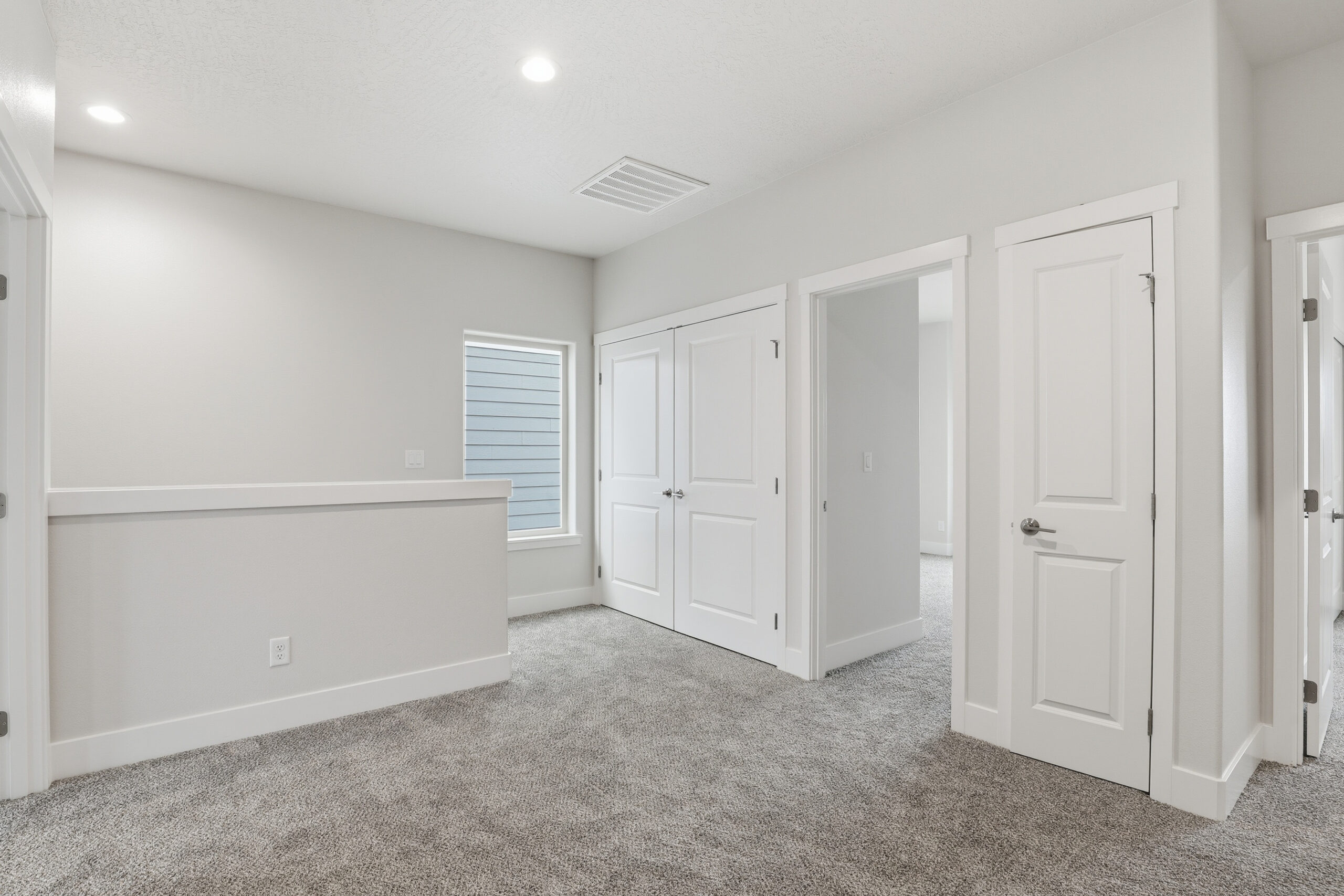 Upstairs, three bedrooms and two bathrooms maximize comfort and privacy. The primary bedroom is set apart for added seclusion, while a central hallway connects all rooms. A linen closet and laundry area enhance convenience for modern living.