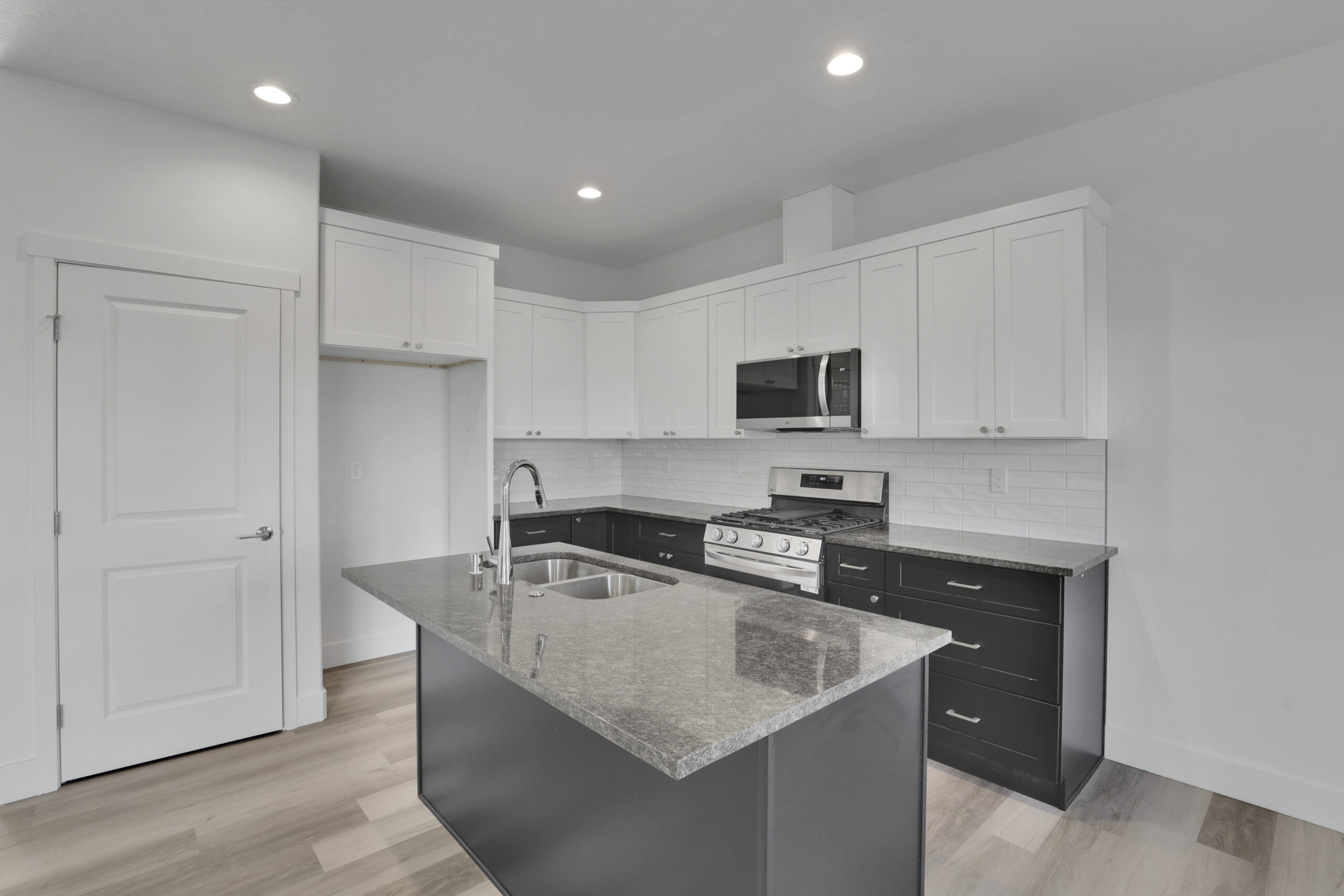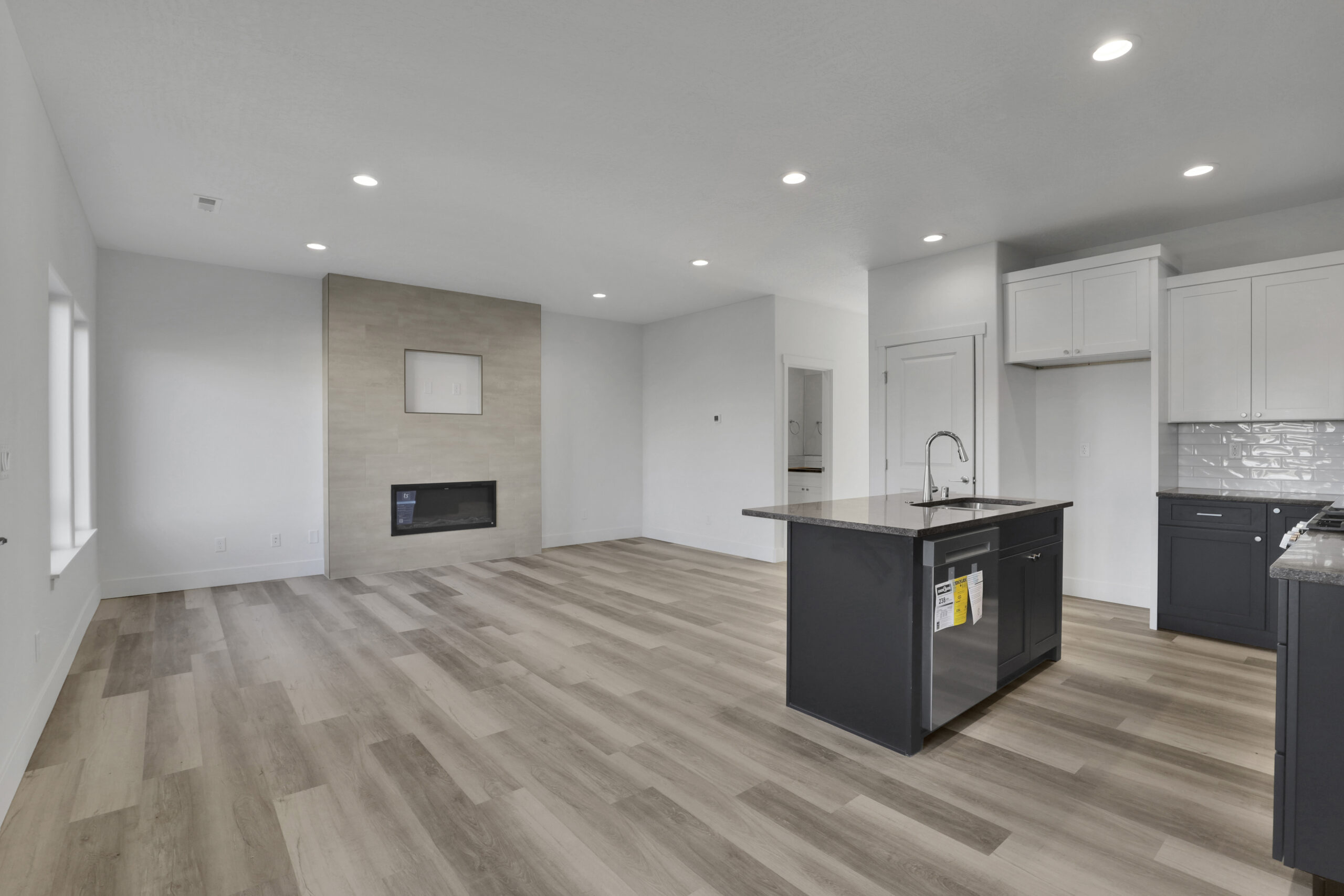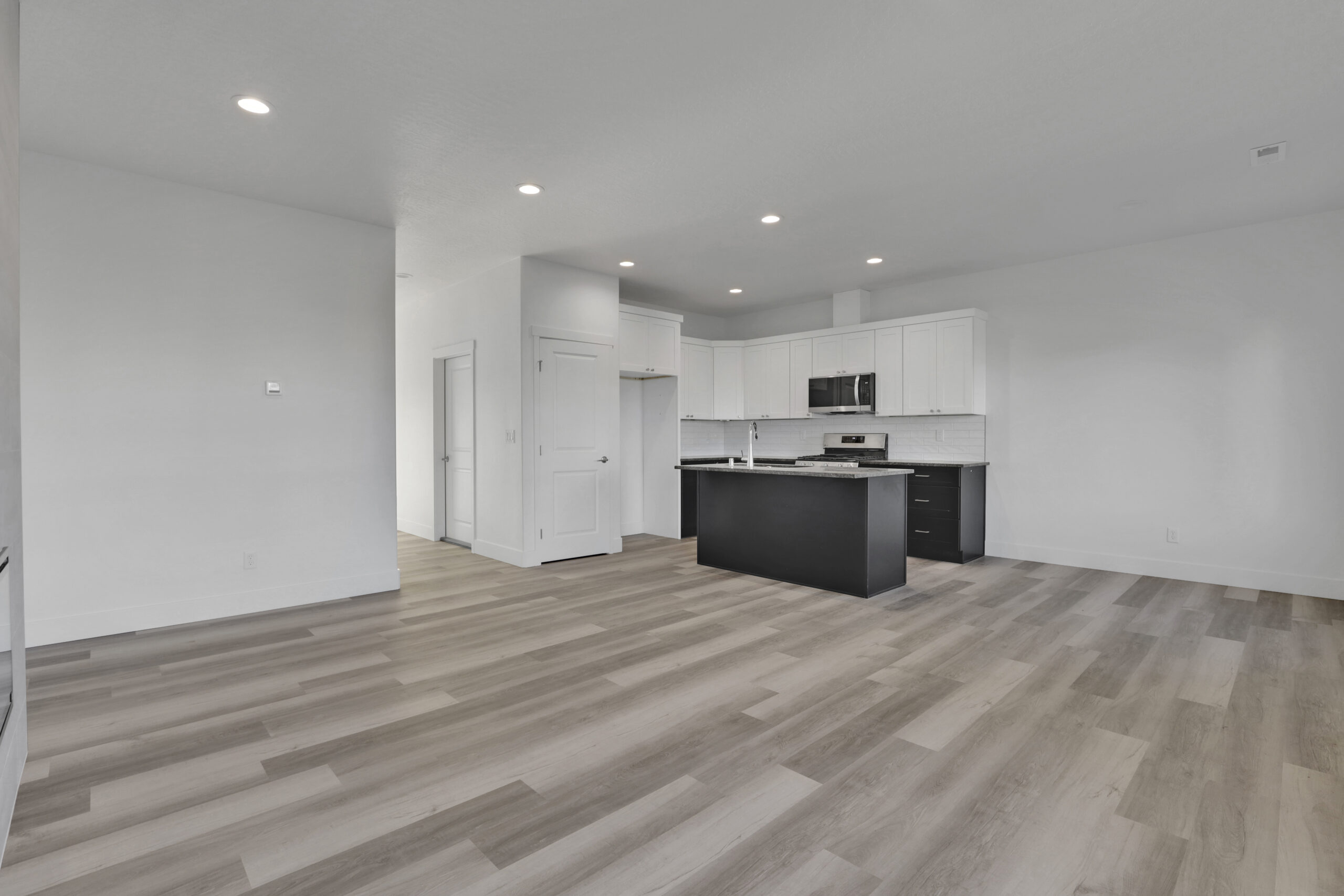 This 1593 townhouse plan highlights a spacious, open-concept design. The living room flows seamlessly into the dining area and a U-shaped kitchen with generous counter space and a pantry. Near the entrance, a powder room and staircase add functionality, along with convenient storage space.