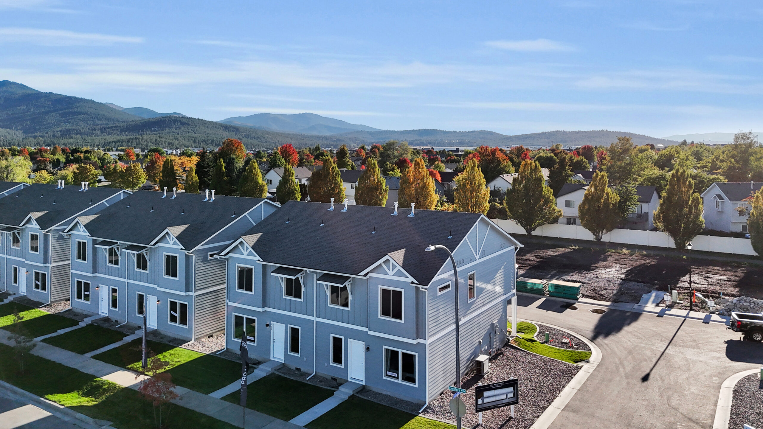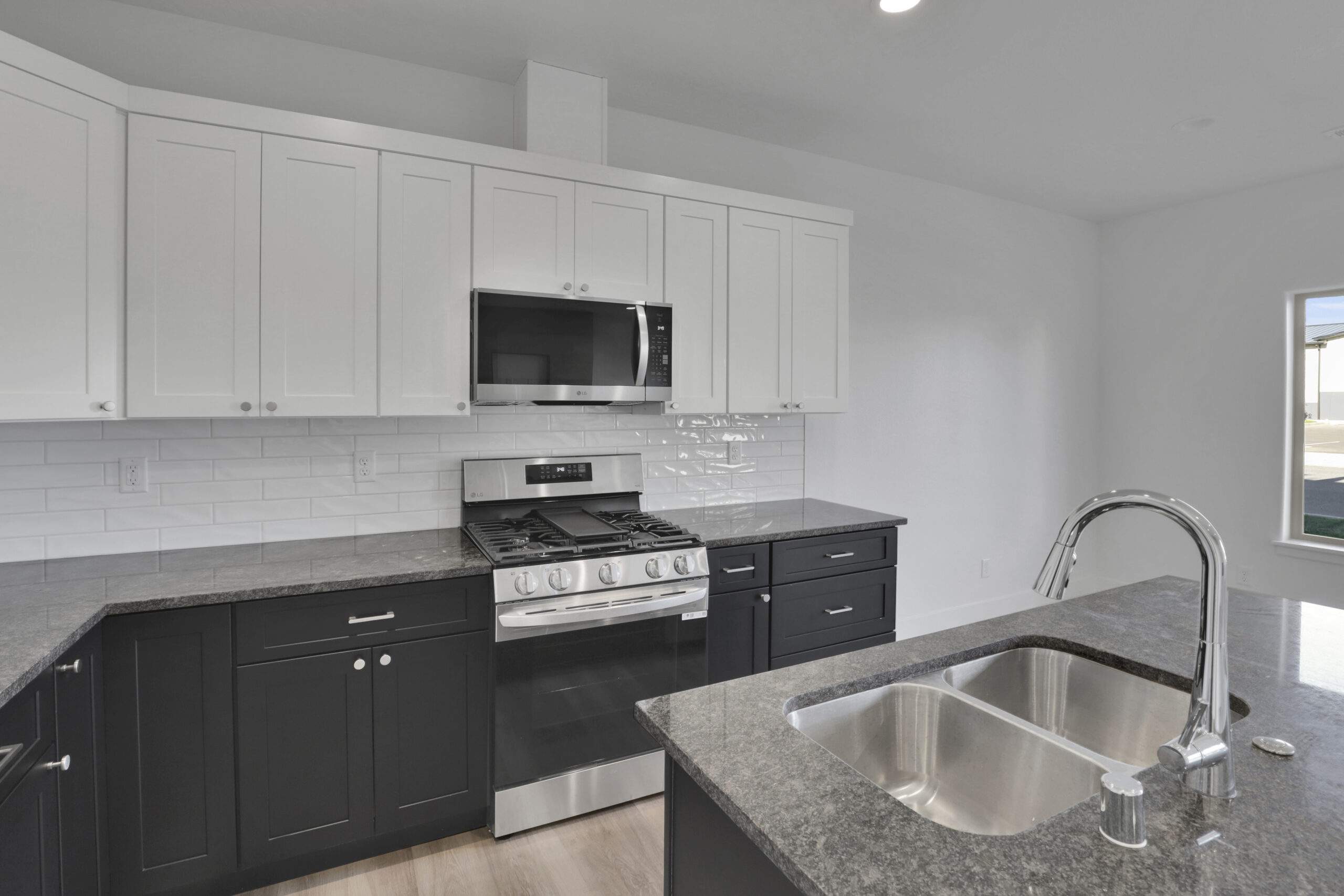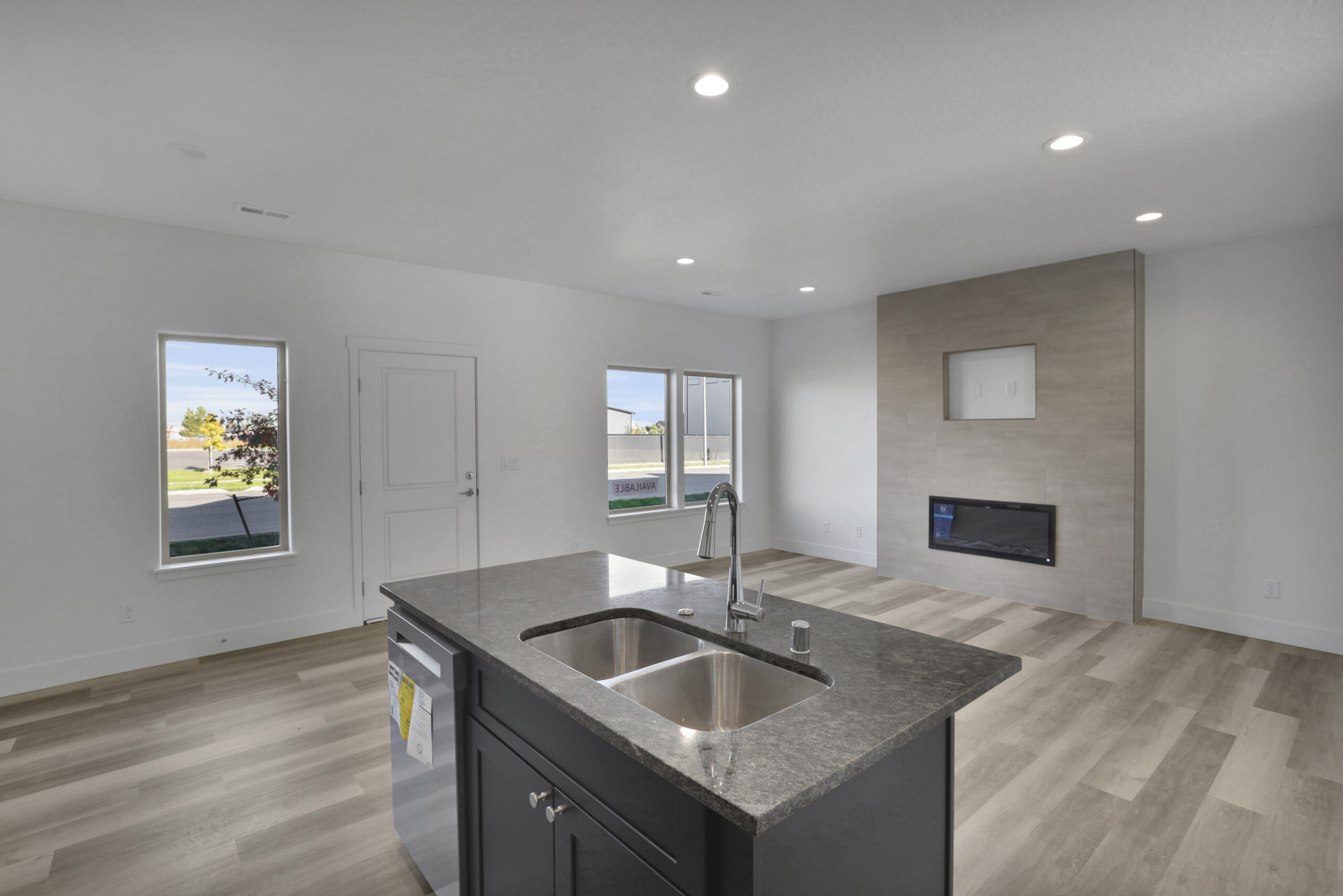 This 1593 townhouse plan highlights a spacious, open-concept design. The living room flows seamlessly into the dining area and a U-shaped kitchen with generous counter space and a pantry. Near the entrance, a powder room and staircase add functionality, along with convenient storage space.
