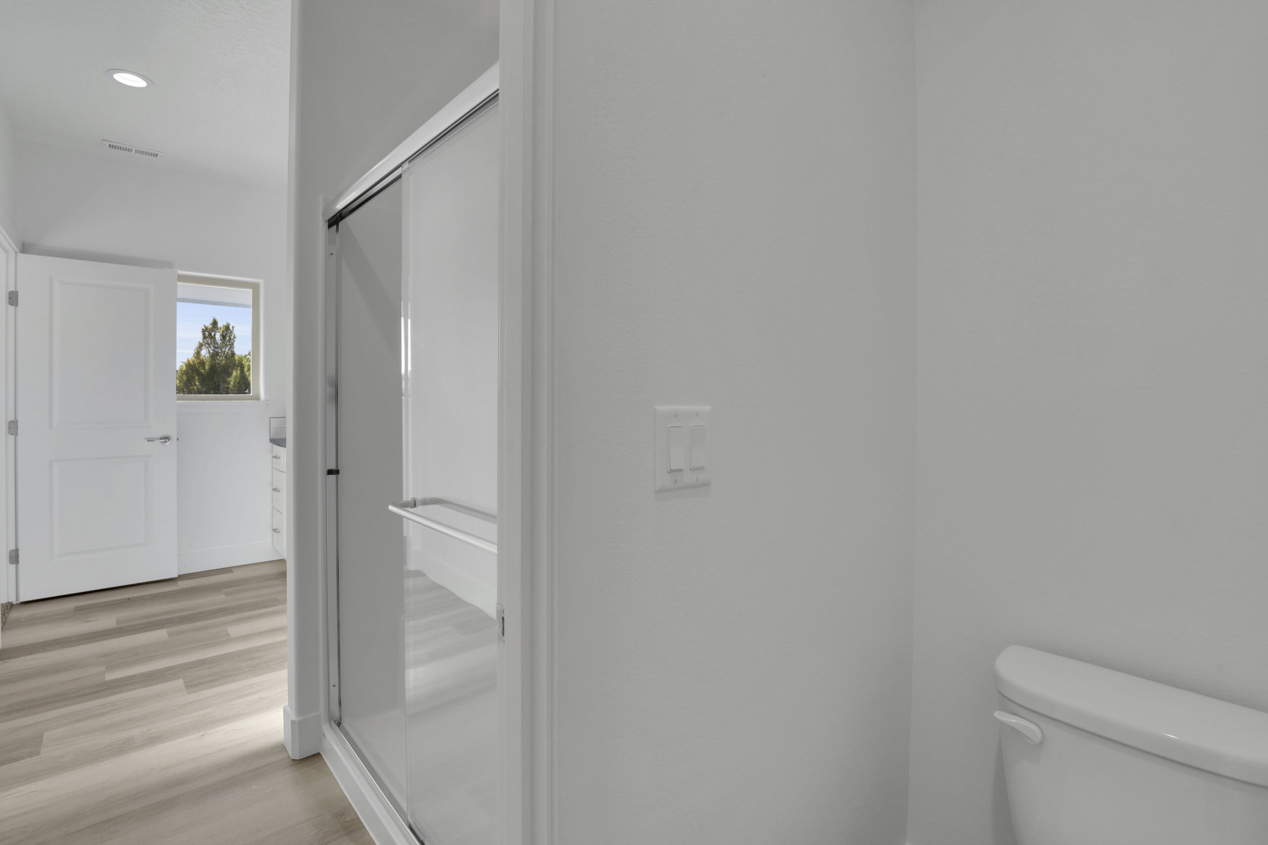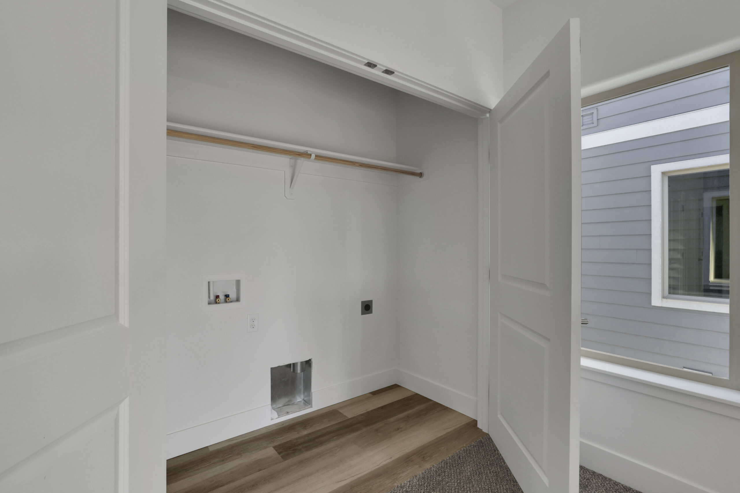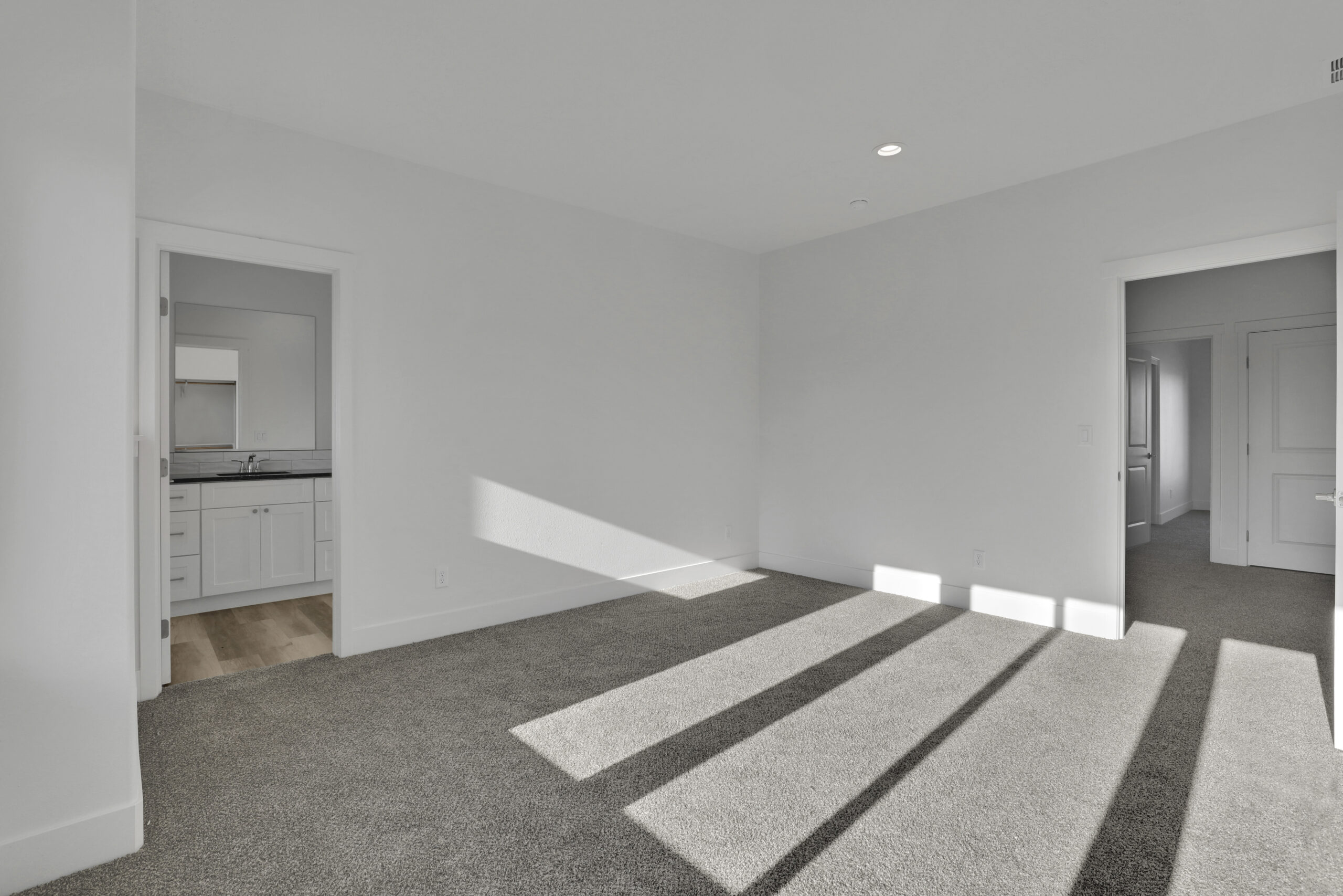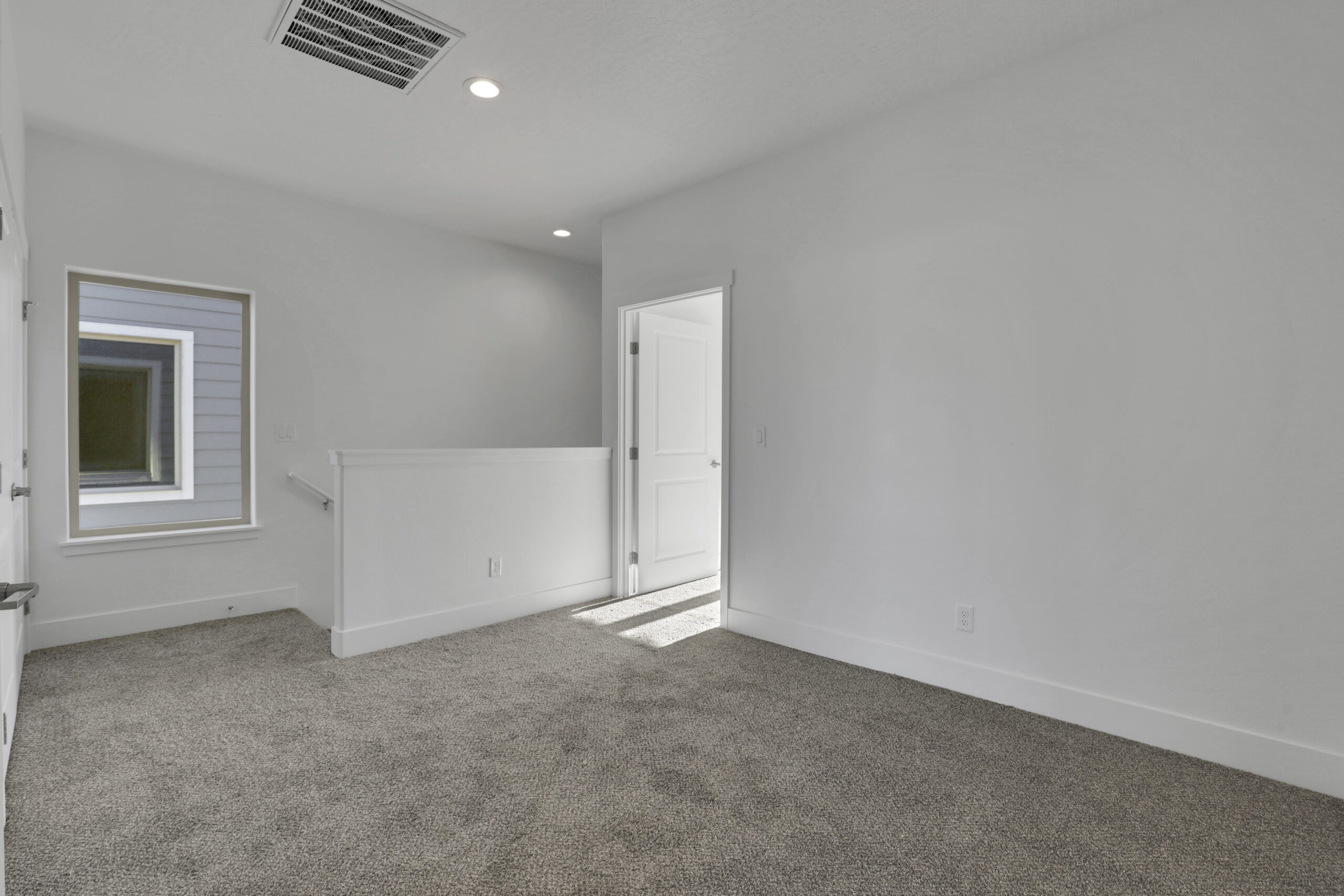 Upstairs, three bedrooms and two bathrooms maximize comfort and privacy. The primary bedroom is set apart for added seclusion, while a central hallway connects all rooms. A linen closet and laundry area enhance convenience for modern living.