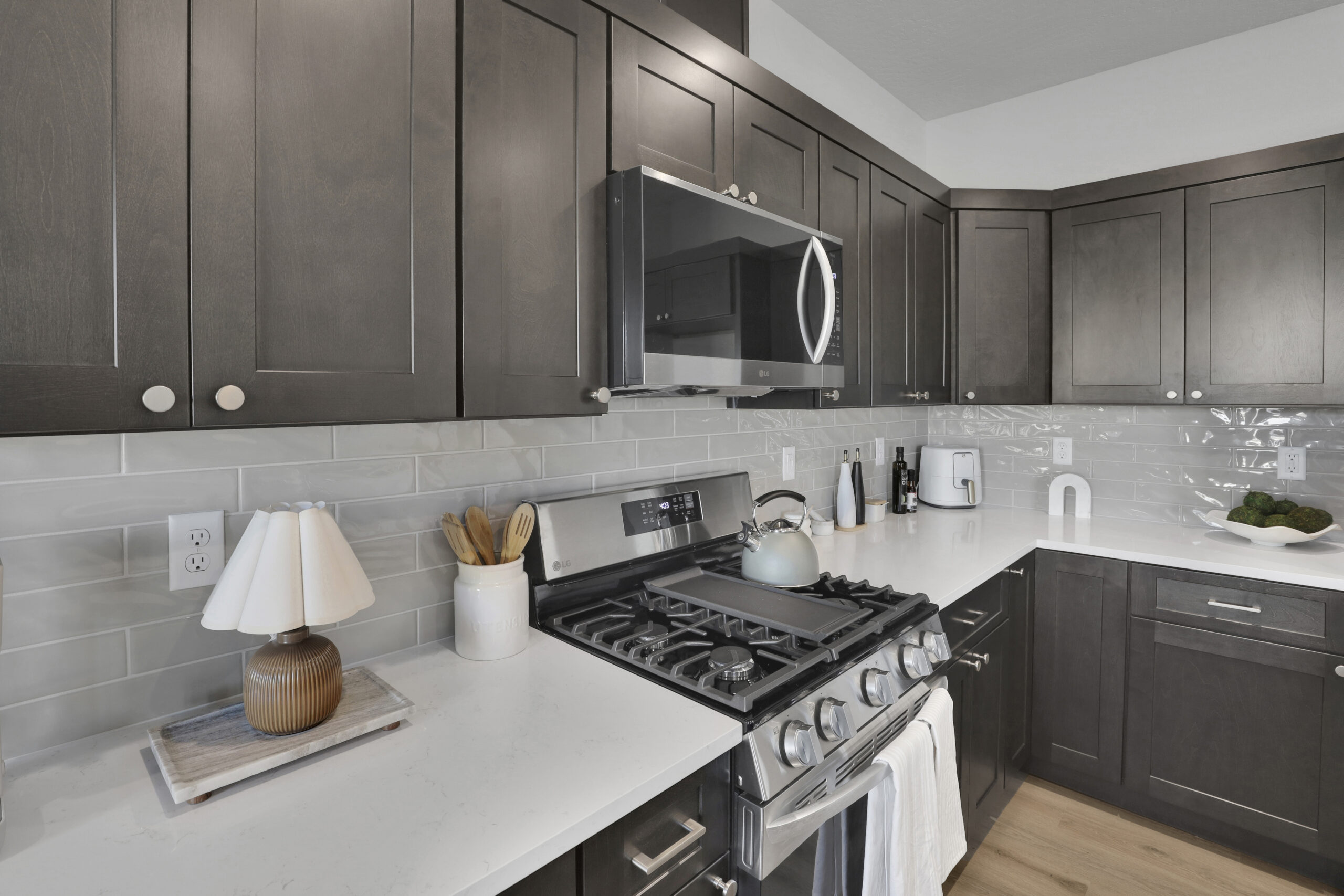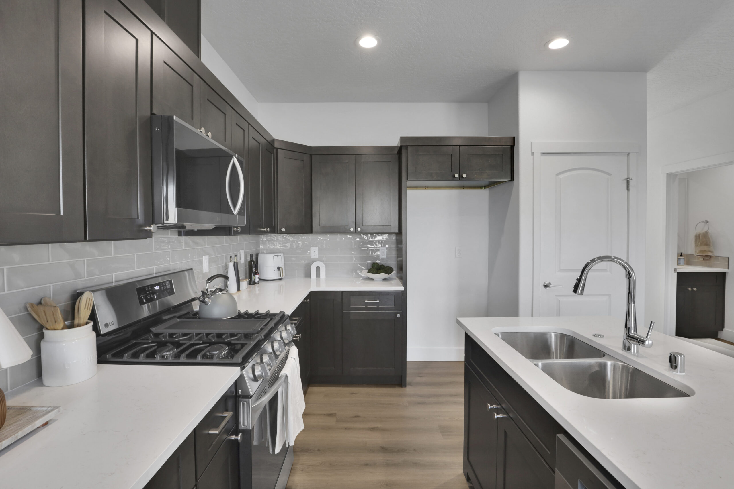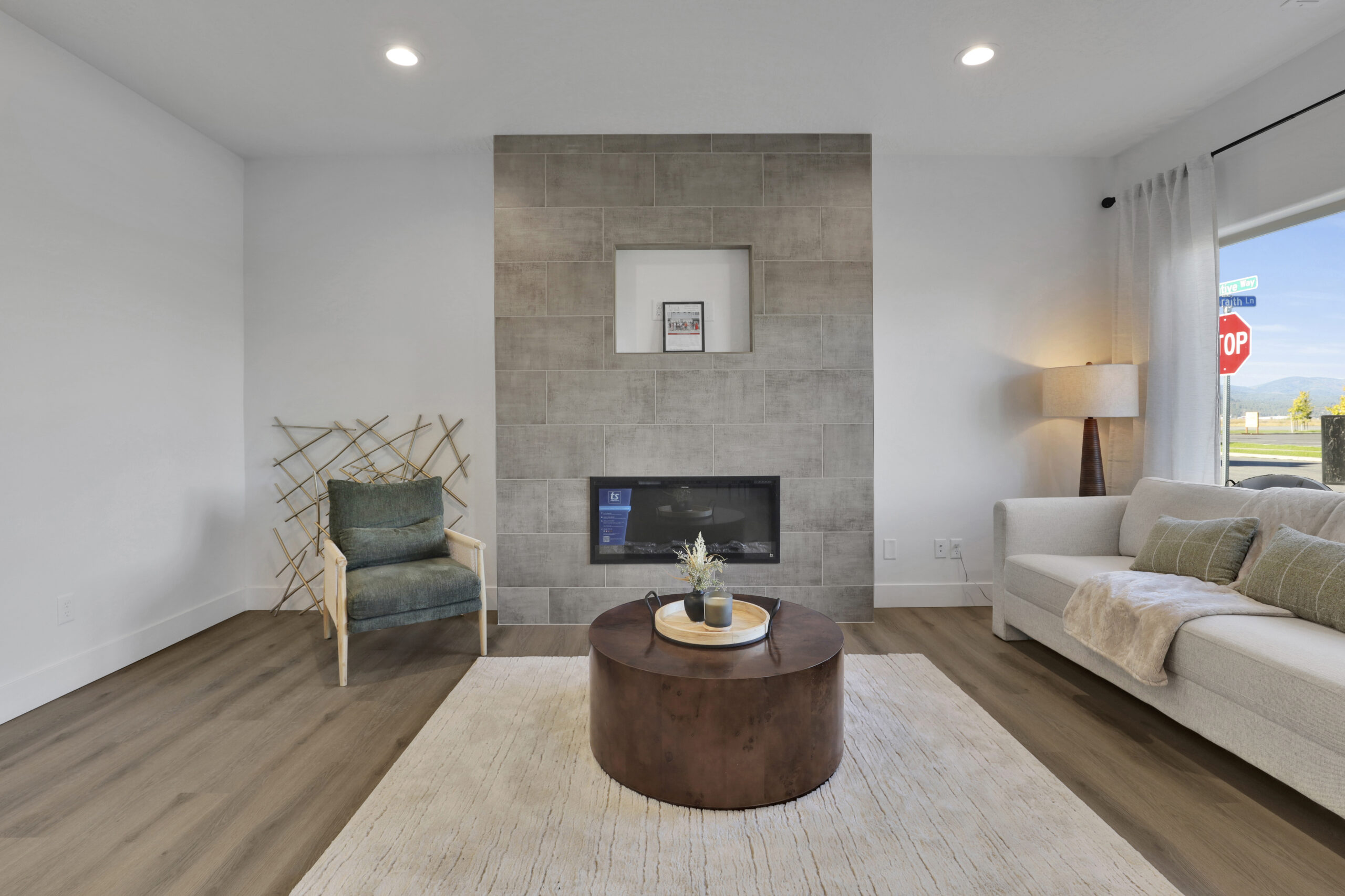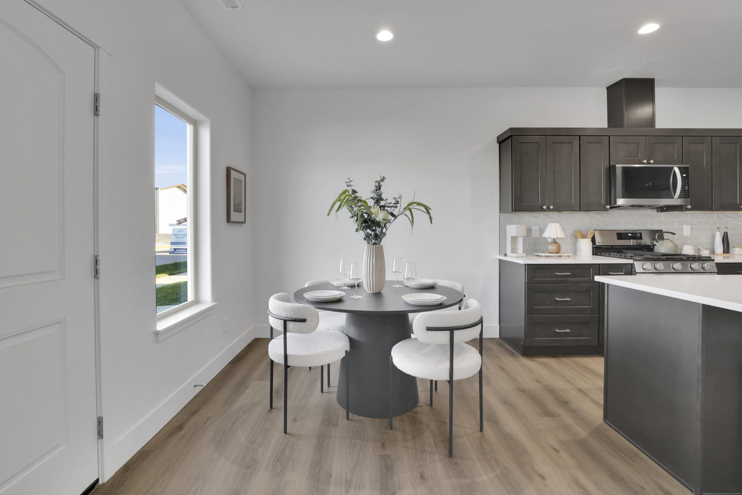 This 1593 townhouse plan highlights a spacious, open-concept design. The living room flows seamlessly into the dining area and a U-shaped kitchen with generous counter space and a pantry. Near the entrance, a powder room and staircase add functionality, along with convenient storage space.