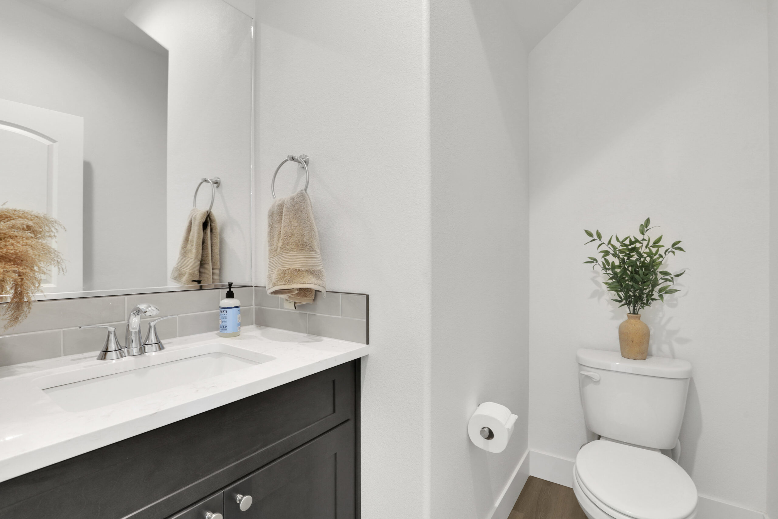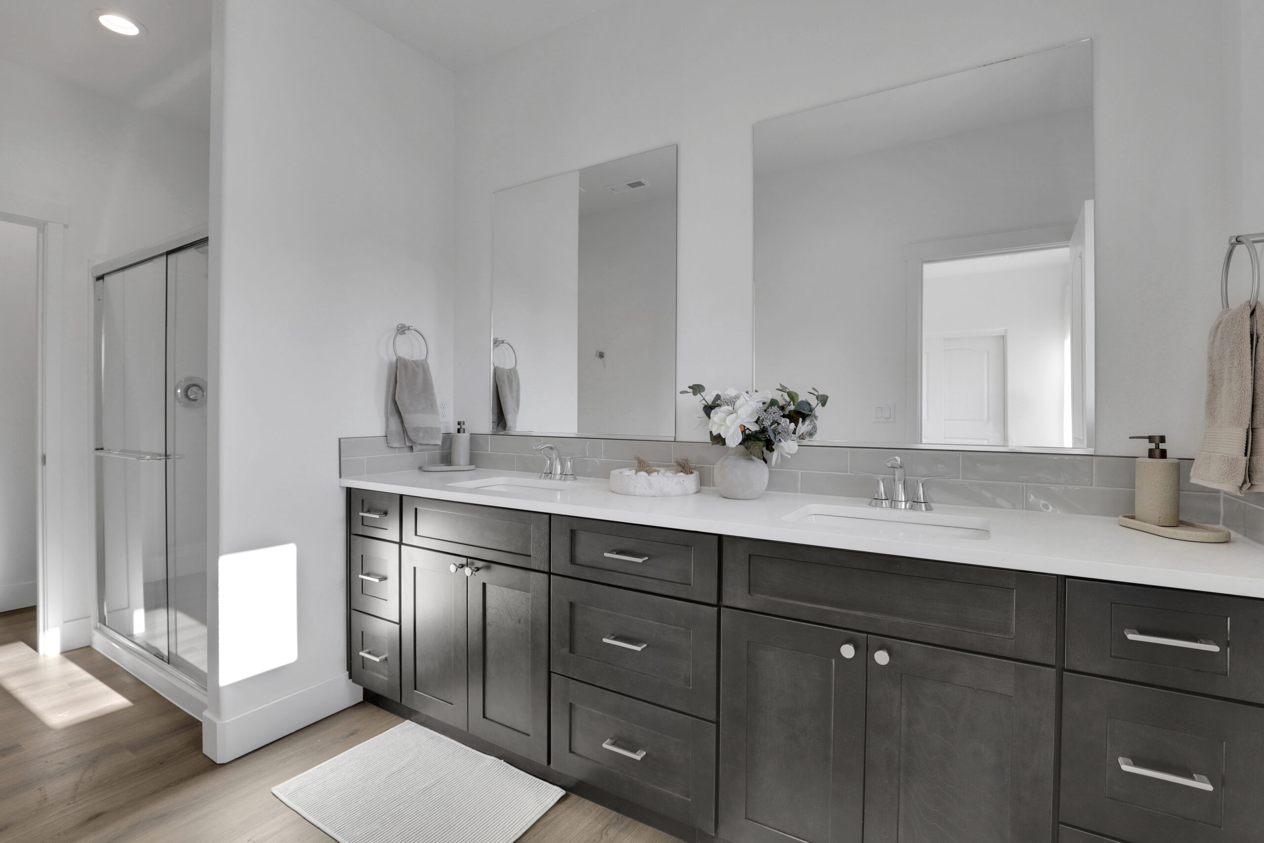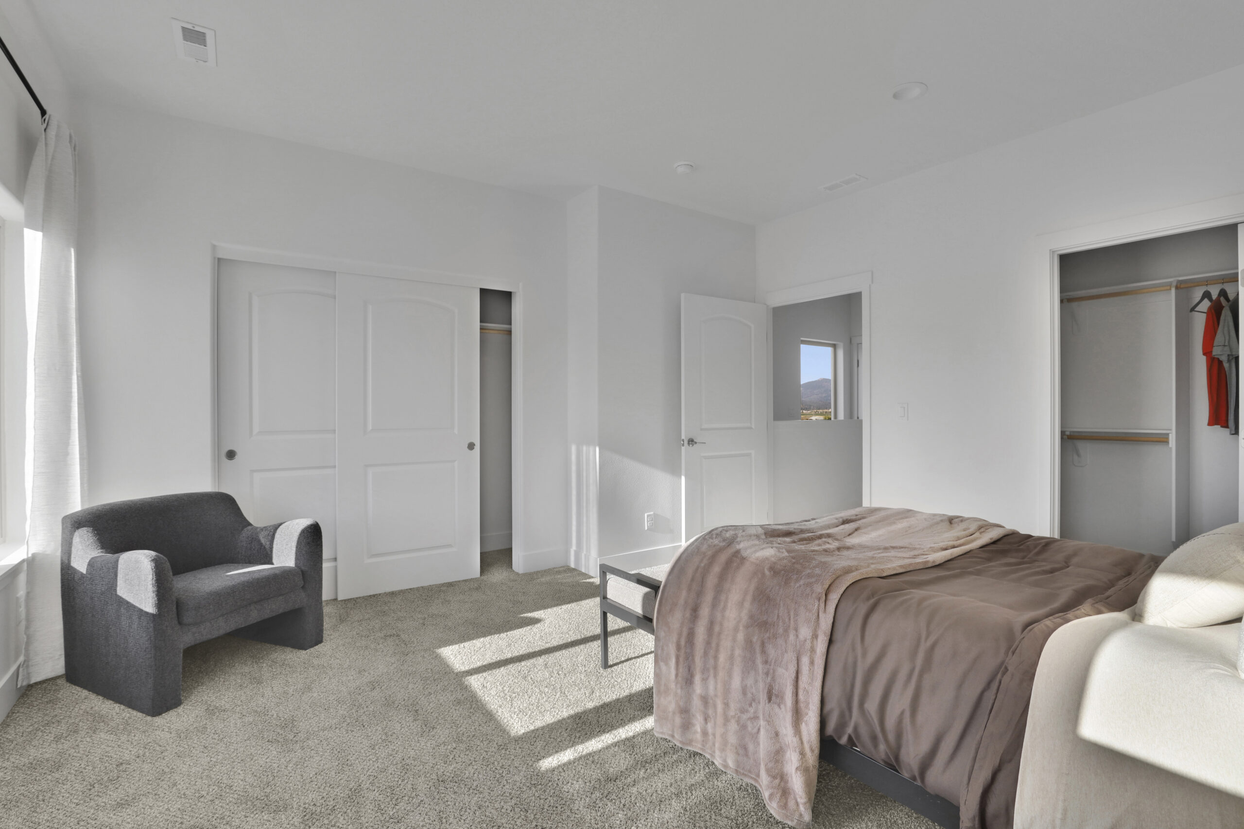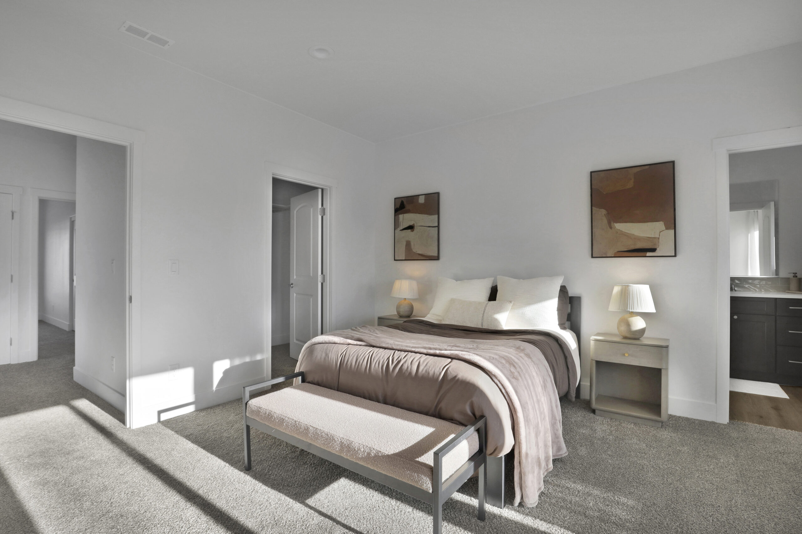 Upstairs, three bedrooms and two bathrooms maximize comfort and privacy. The primary bedroom is set apart for added seclusion, while a central hallway connects all rooms. A linen closet and laundry area enhance convenience for modern living.