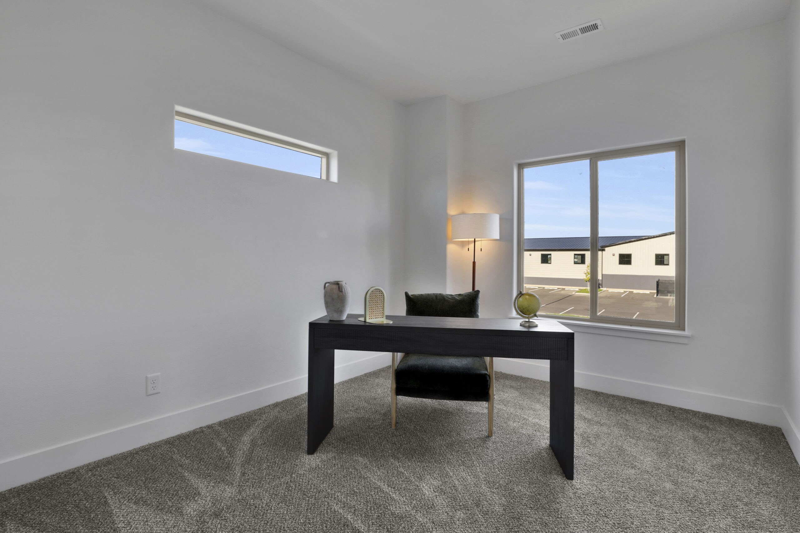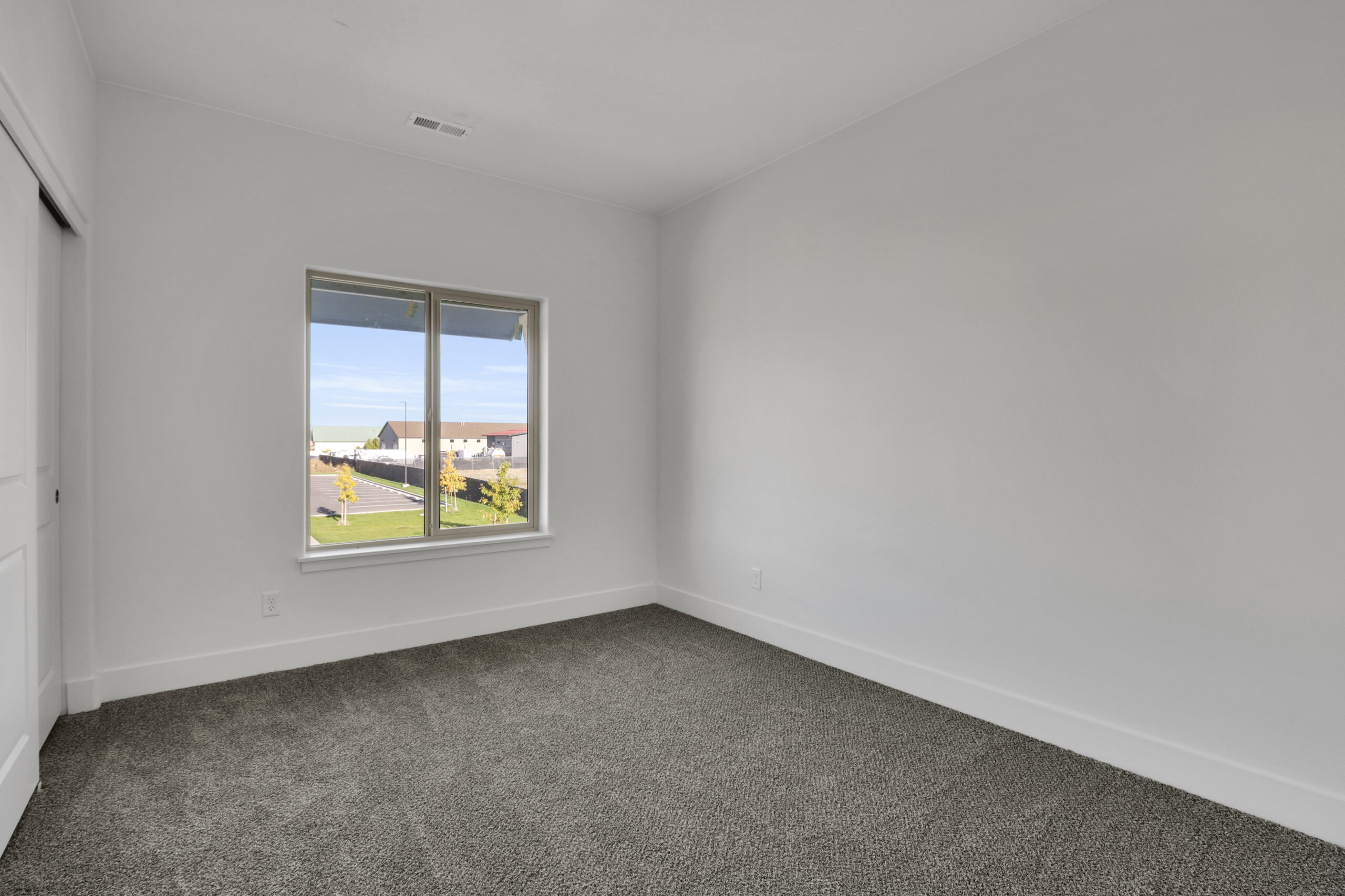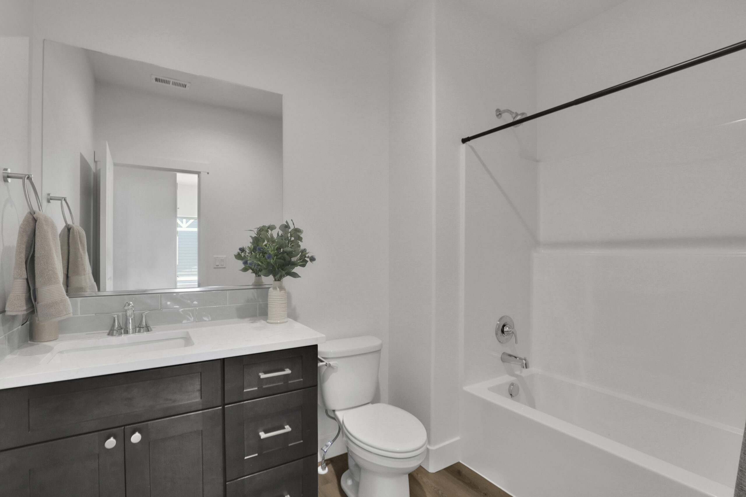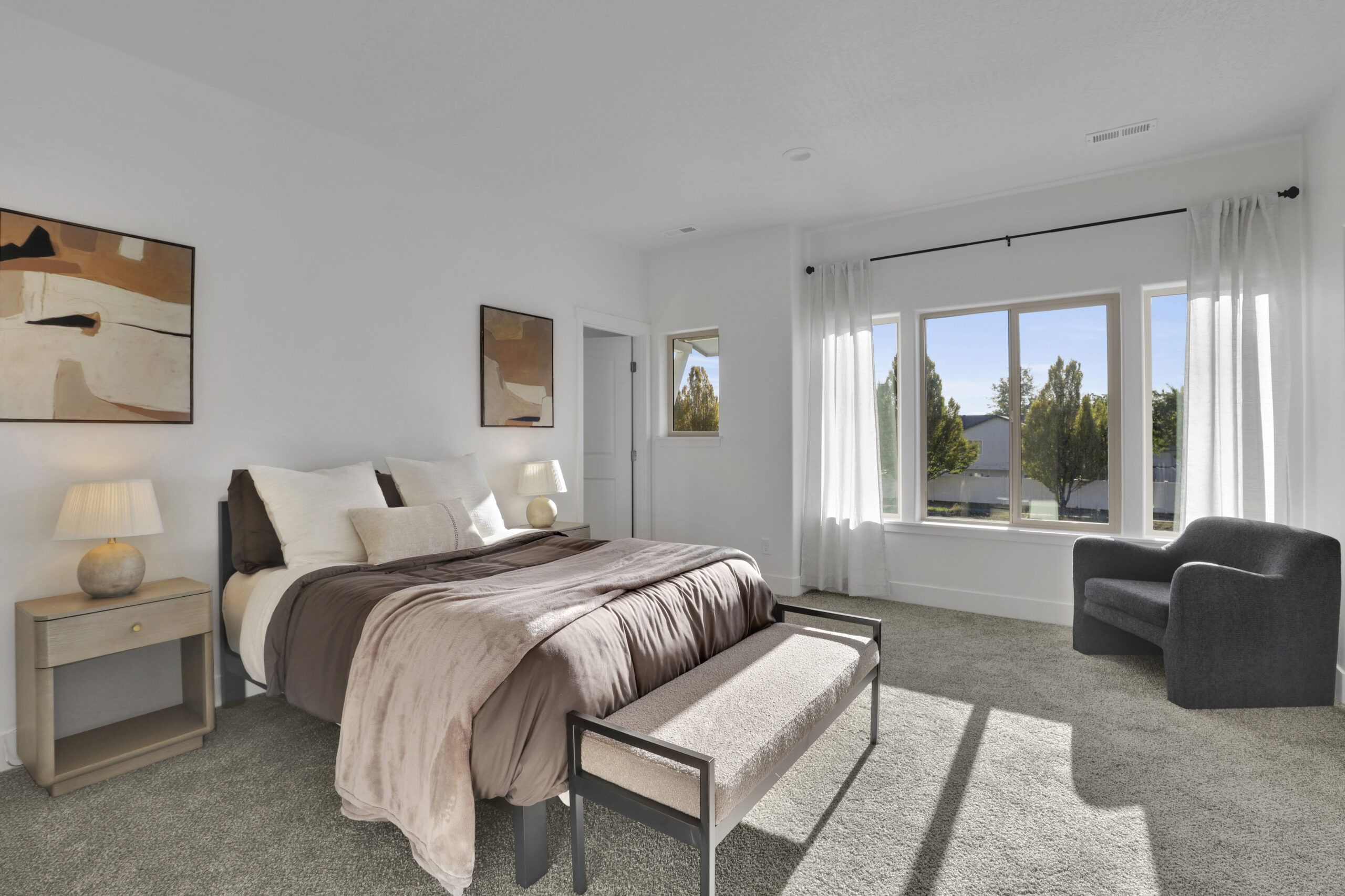 Upstairs, three bedrooms and two bathrooms maximize comfort and privacy. The primary bedroom is set apart for added seclusion, while a central hallway connects all rooms. A linen closet and laundry area enhance convenience for modern living.