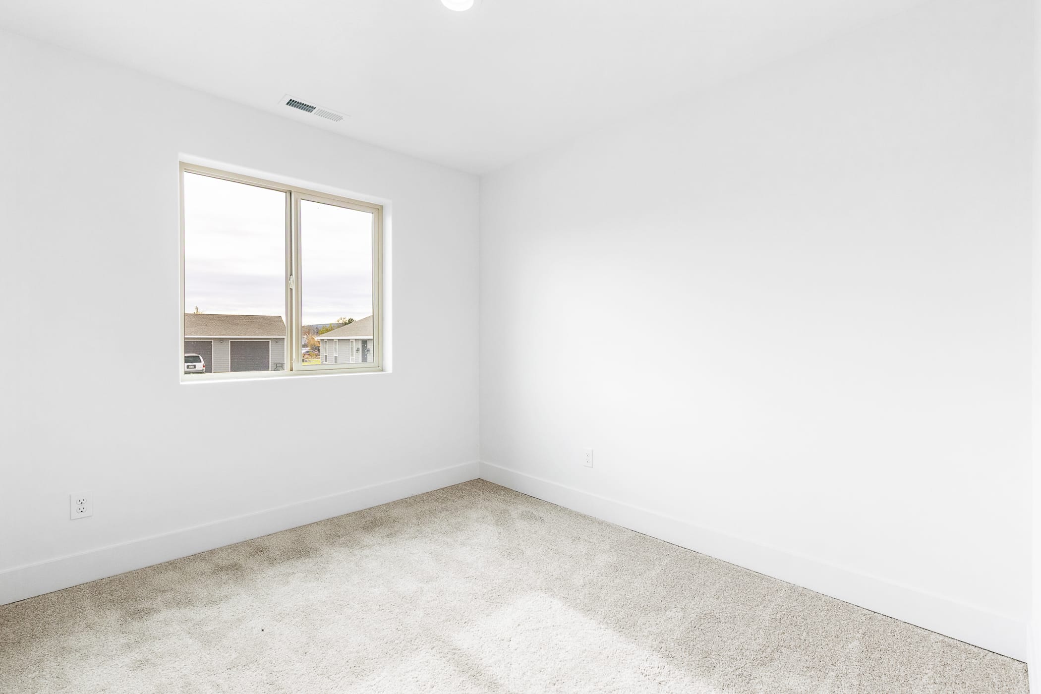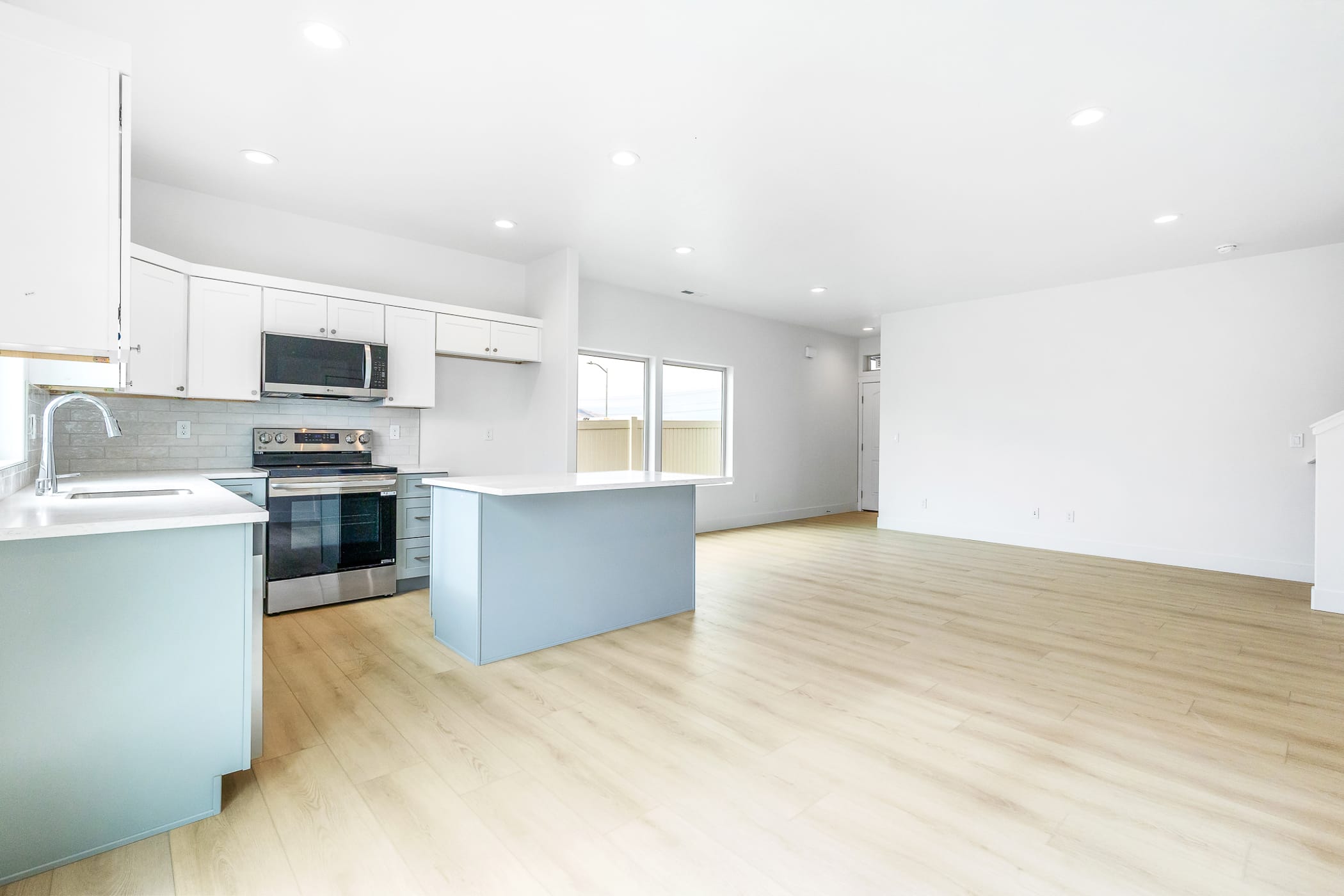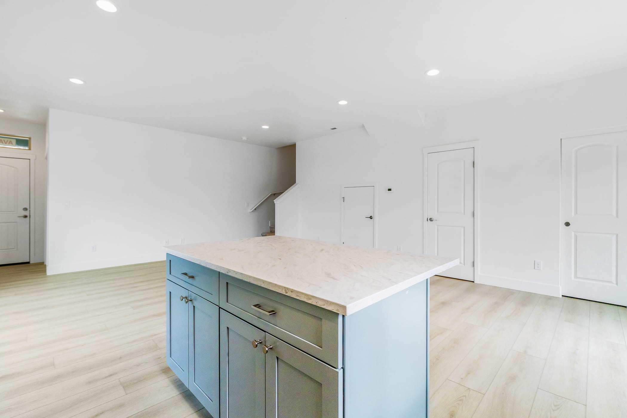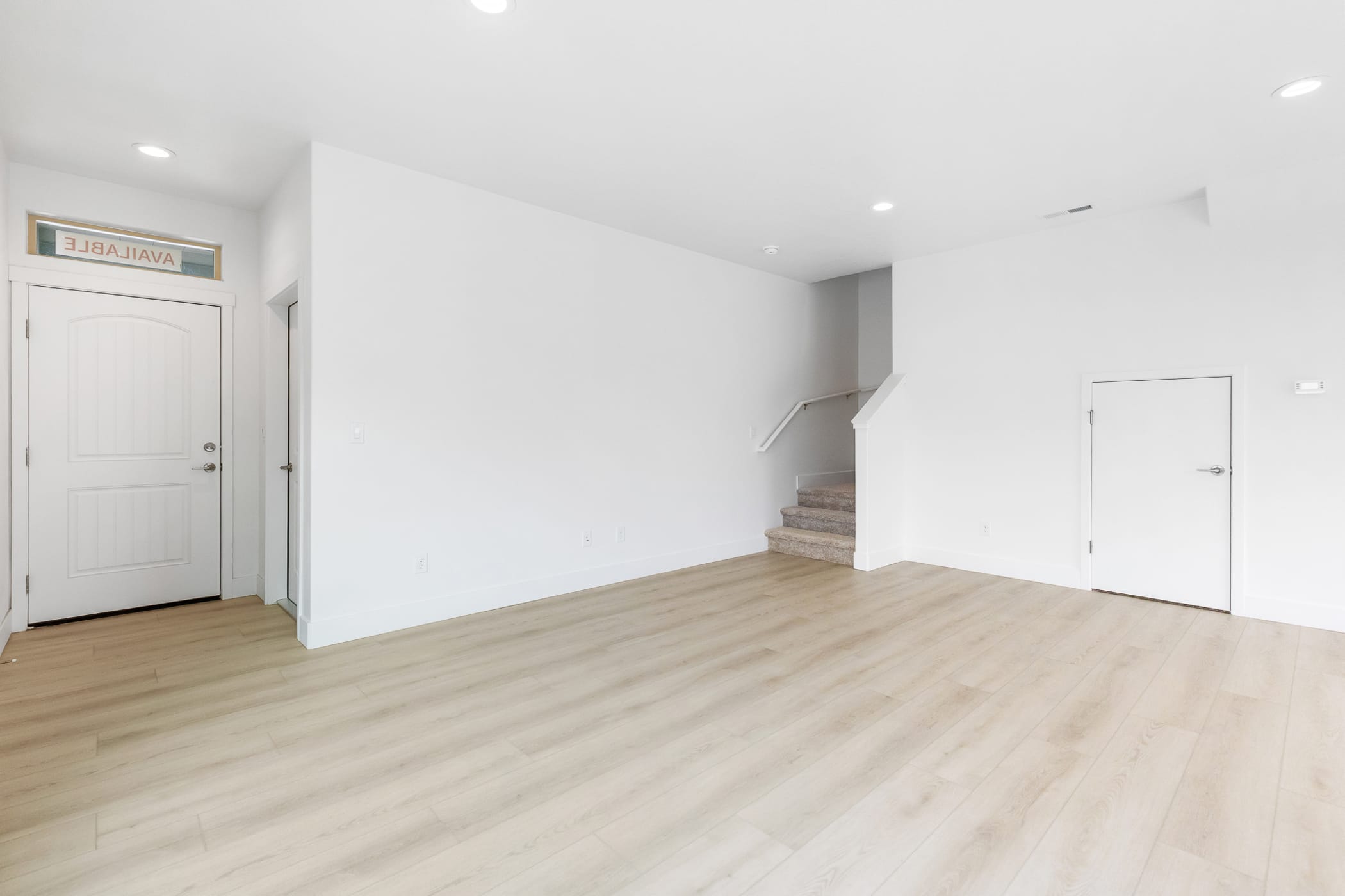 The 1193 townhouse plan offers an inviting open-concept design, where the kitchen seamlessly connects to the great room and dining area. Custom wooden shelving enhances the discreet pantry, adding style and functionality. Upstairs, the primary suite features a luxurious en-suite bathroom and a spacious closet. Two additional bedrooms share a well-appointed bathroom with a tub and shower combo, ensuring comfort for all. Every detail of this home is designed for effortless modern living.