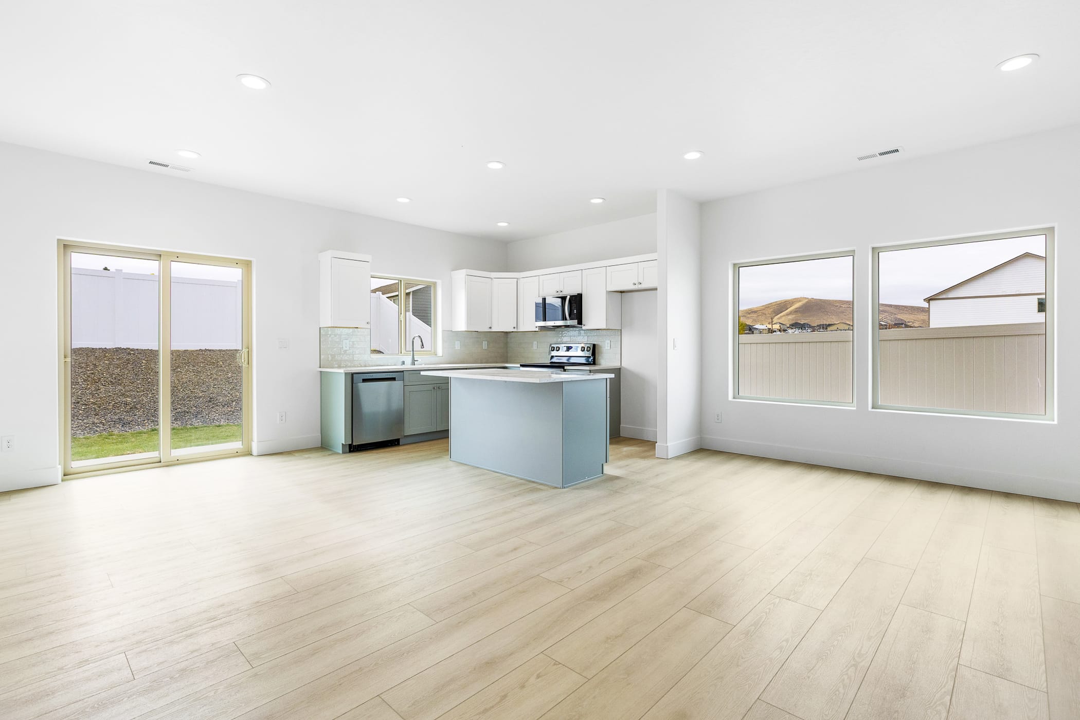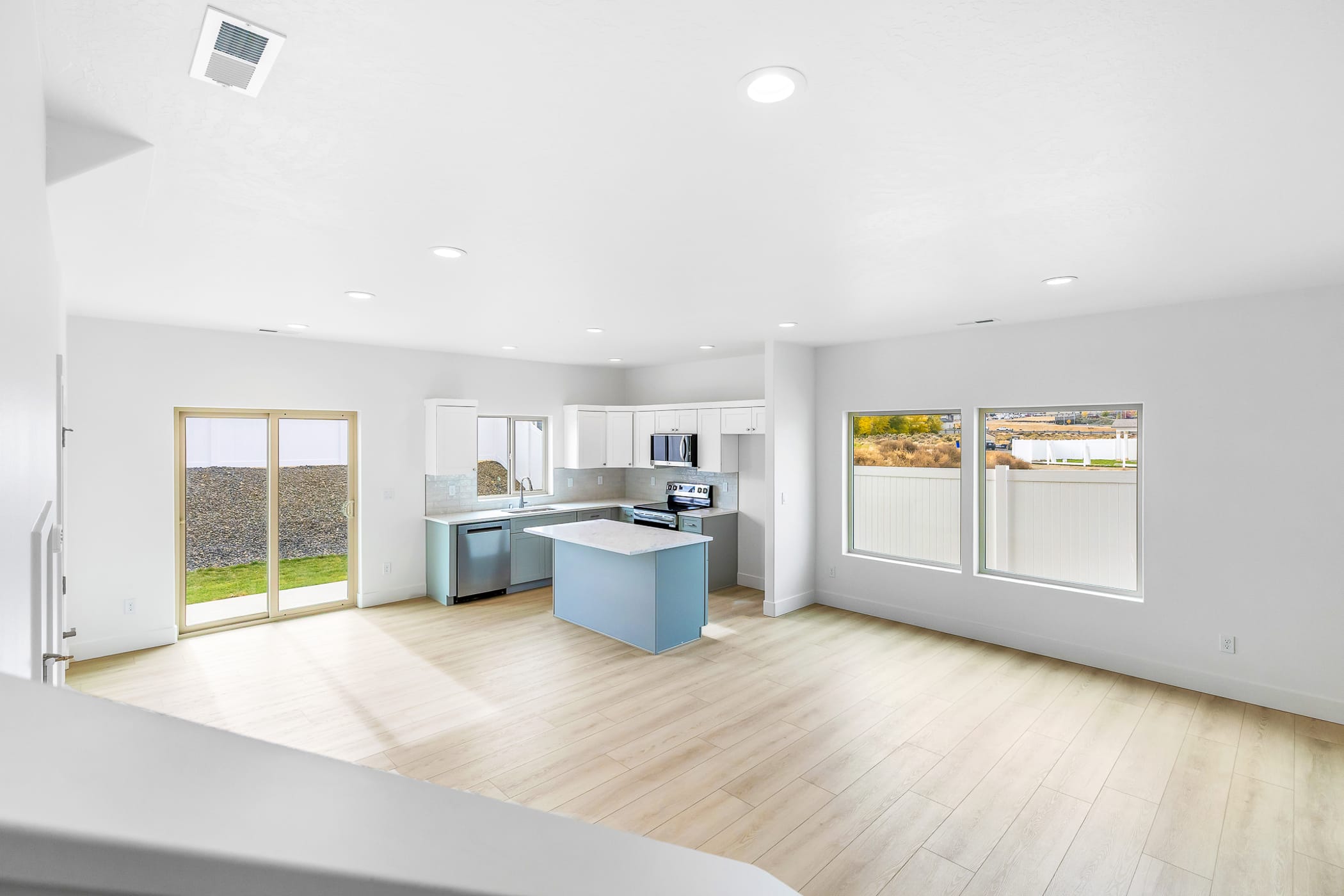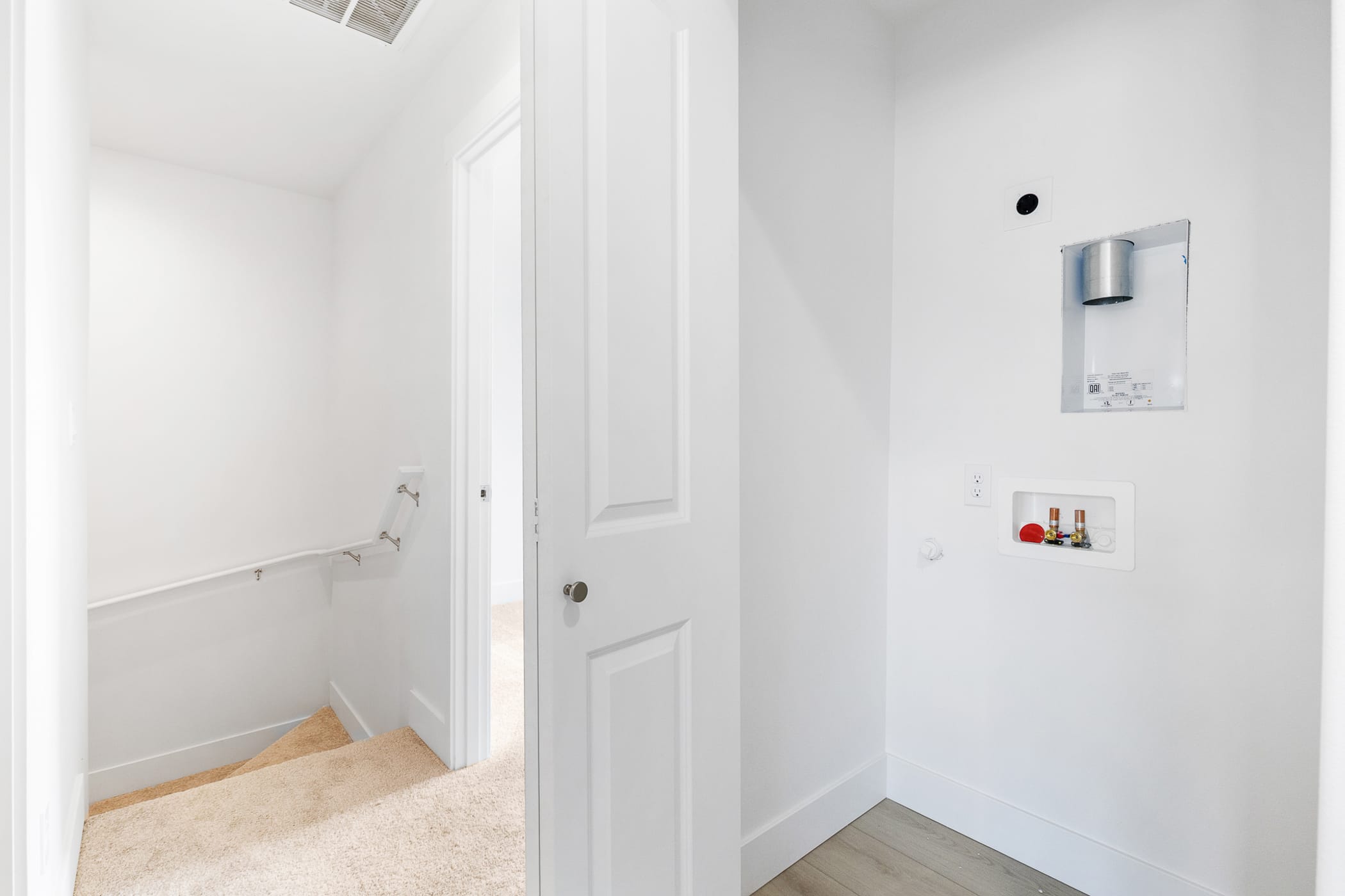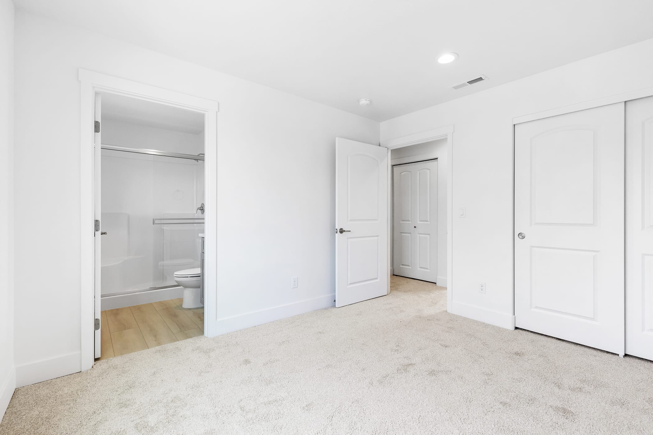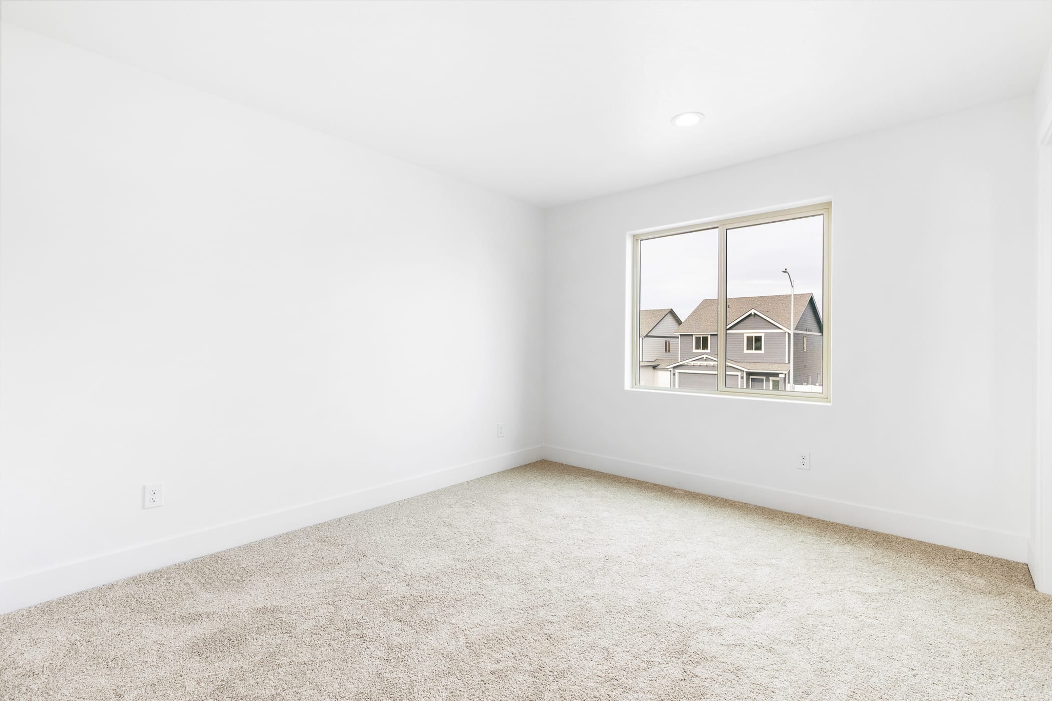 The 1193 townhouse plan offers an inviting open-concept design, where the kitchen seamlessly connects to the great room and dining area. Custom wooden shelving enhances the discreet pantry, adding style and functionality. Upstairs, the primary suite features a luxurious en-suite bathroom and a spacious closet. Two additional bedrooms share a well-appointed bathroom with a tub and shower combo, ensuring comfort for all. Every detail of this home is designed for effortless modern living.