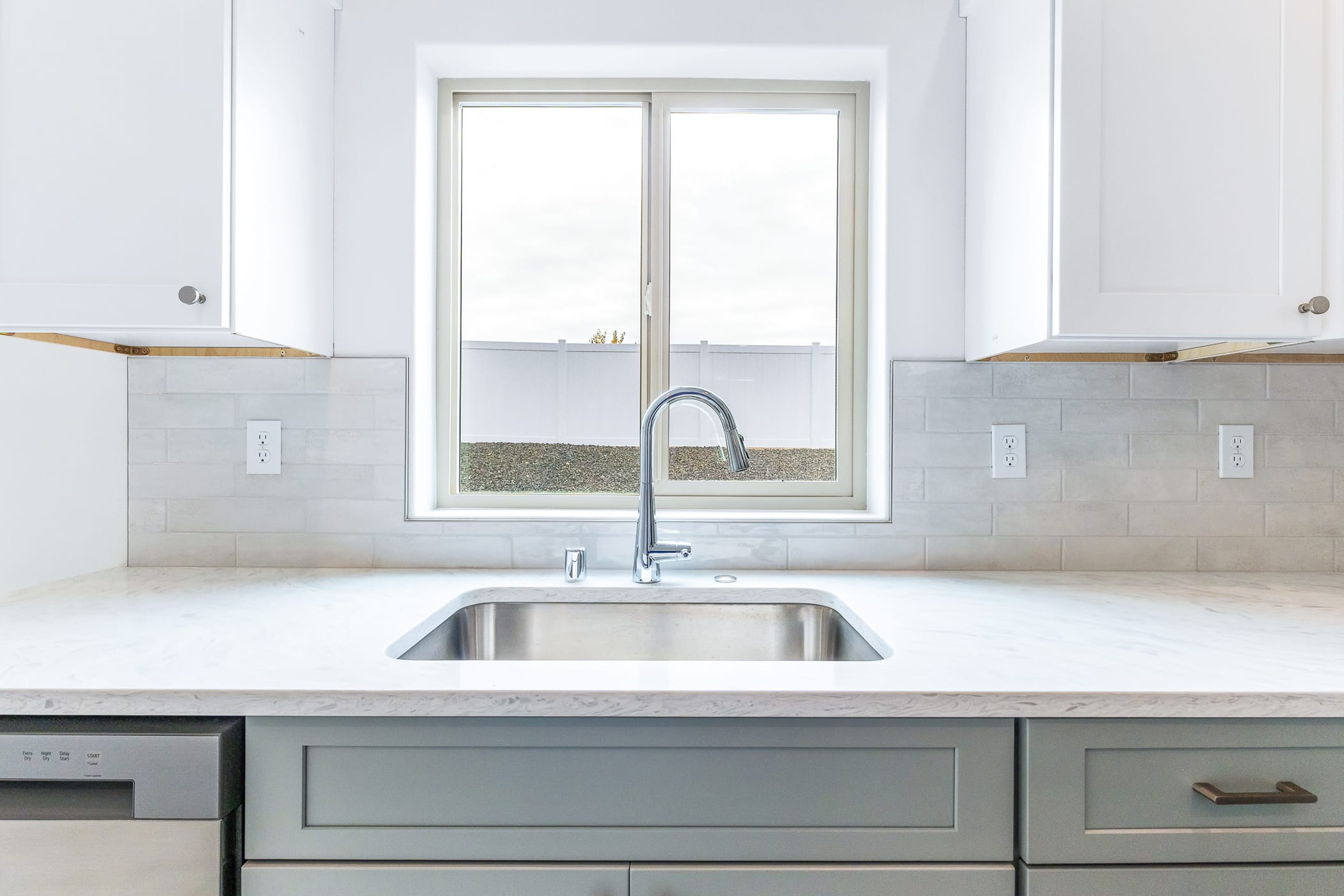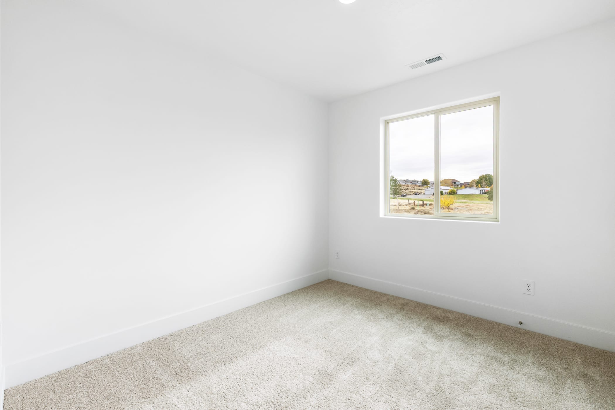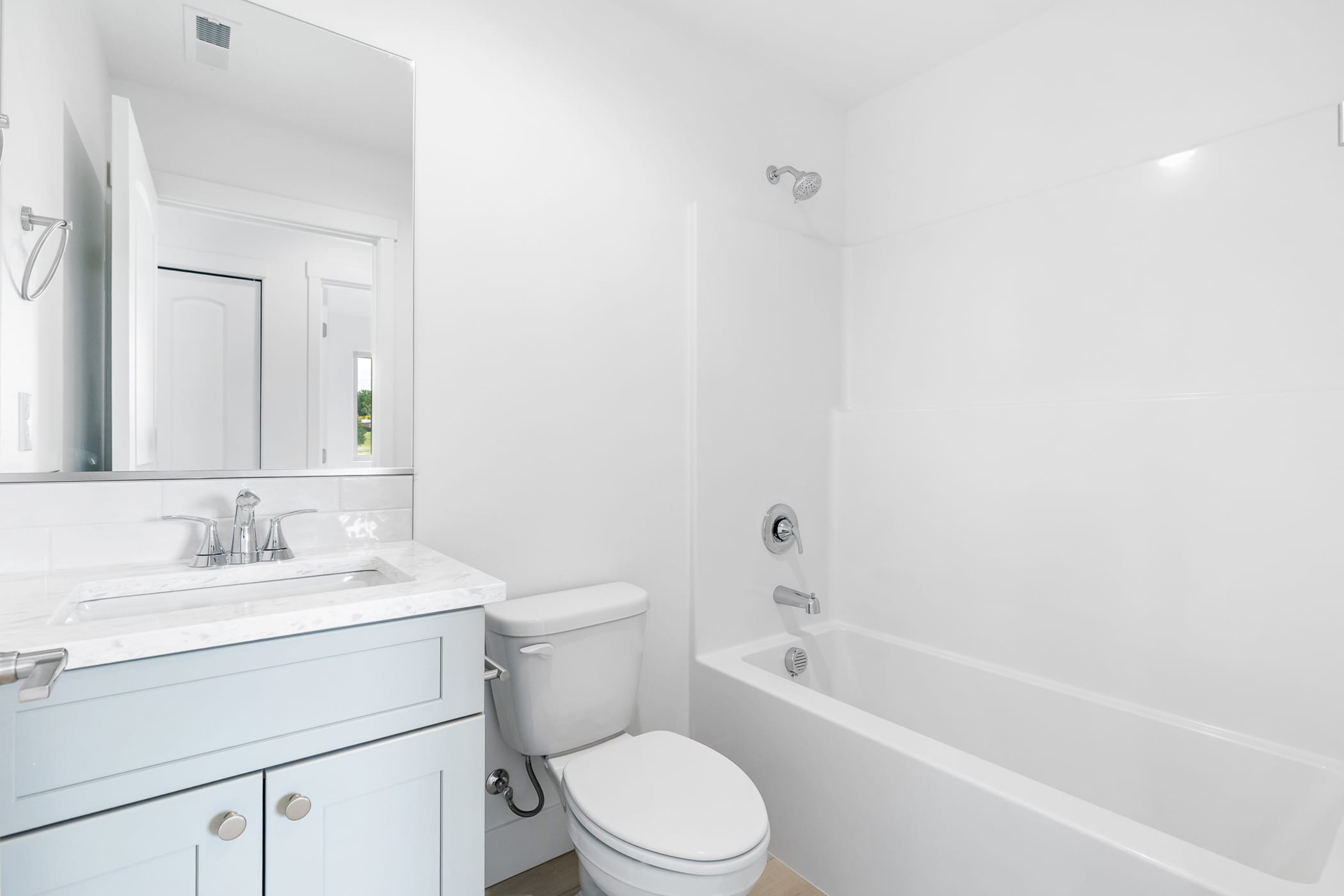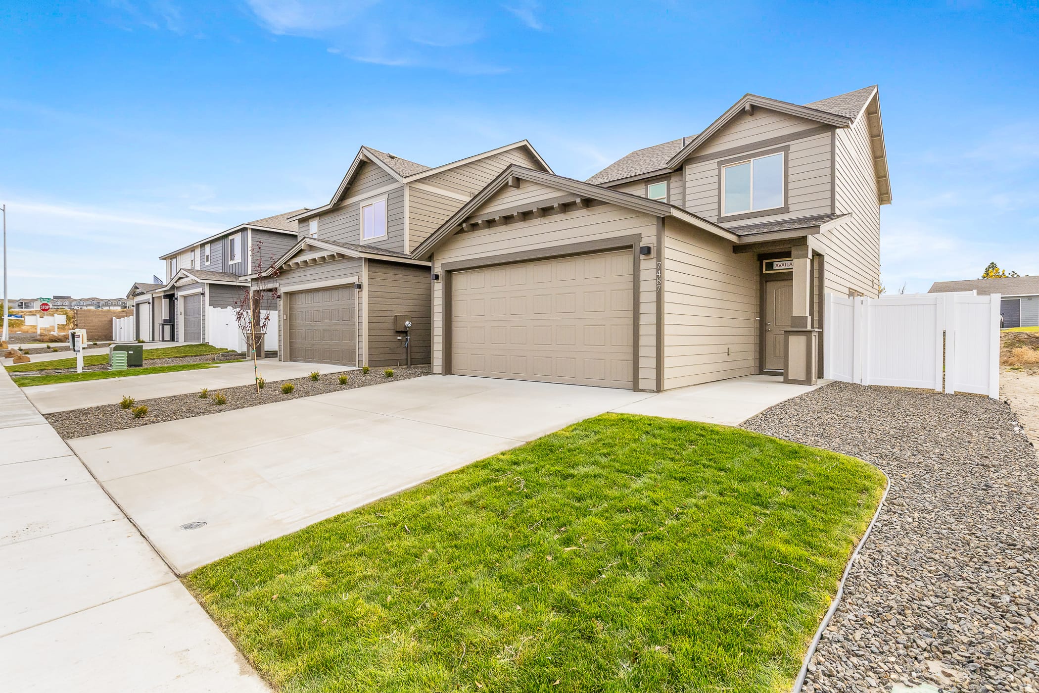 The 1193 townhouse plan offers an inviting open-concept design, where the kitchen seamlessly connects to the great room and dining area. Custom wooden shelving enhances the discreet pantry, adding style and functionality. Upstairs, the primary suite features a luxurious en-suite bathroom and a spacious closet. Two additional bedrooms share a well-appointed bathroom with a tub and shower combo, ensuring comfort for all. Every detail of this home is designed for effortless modern living.