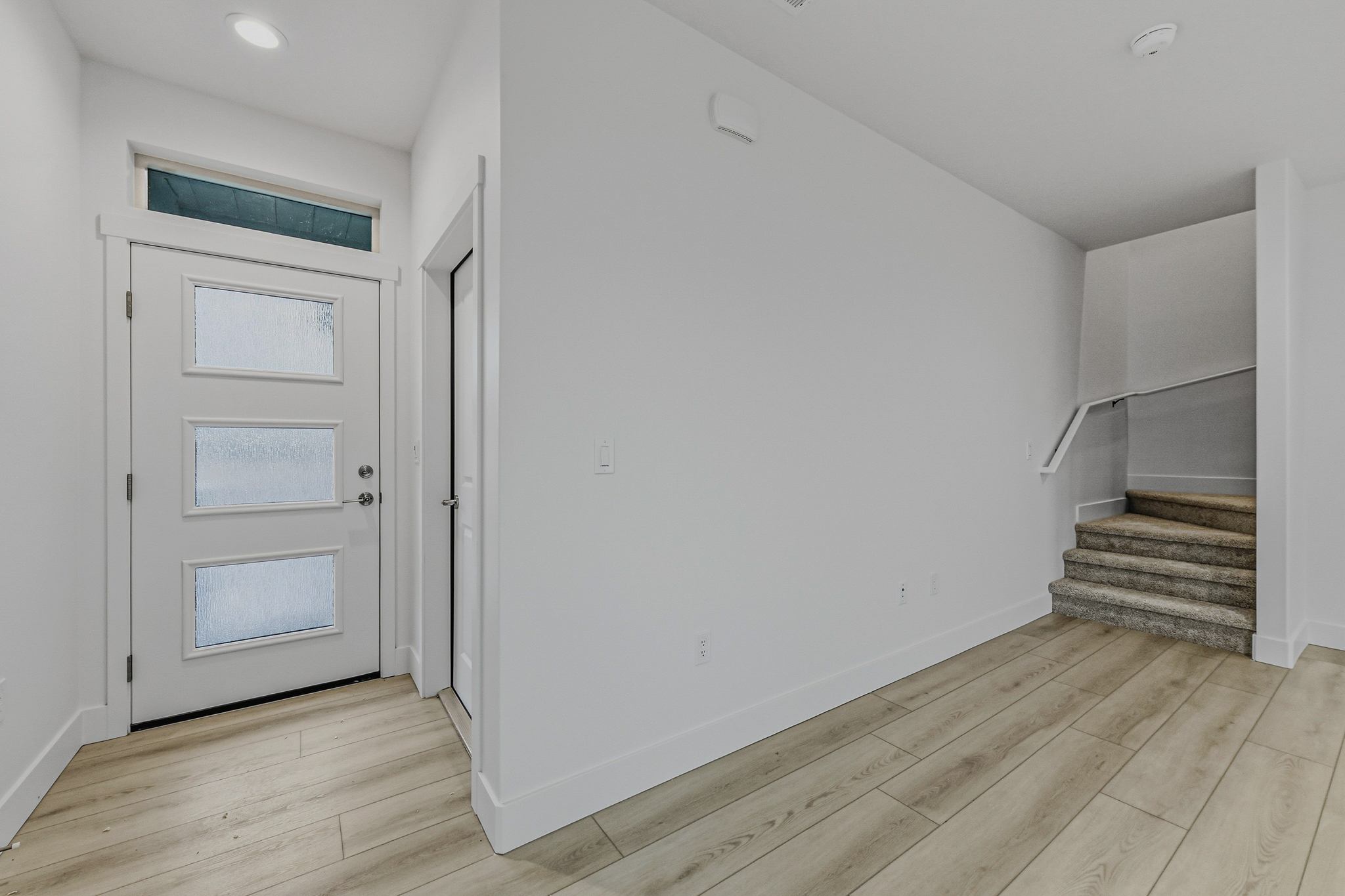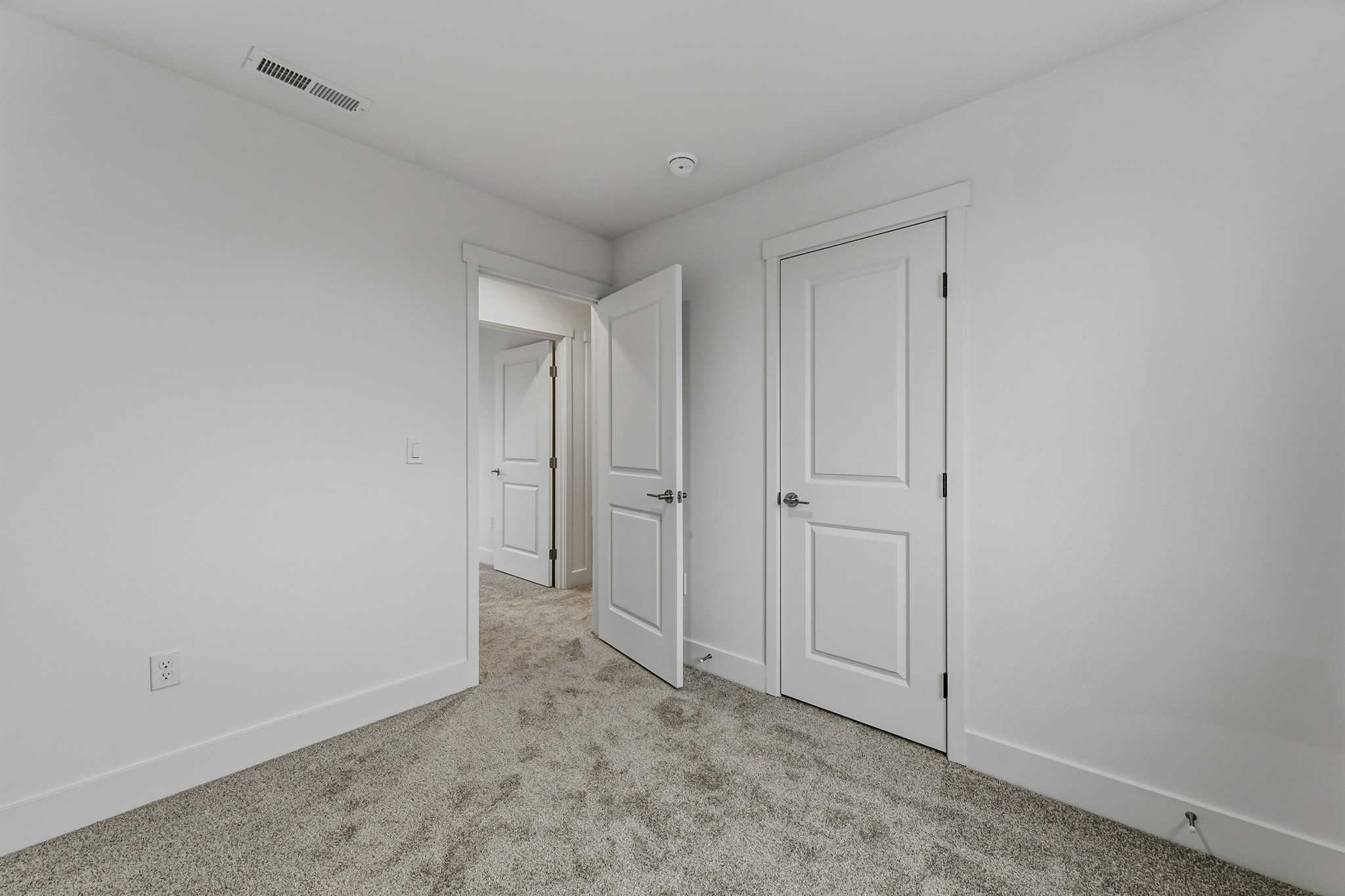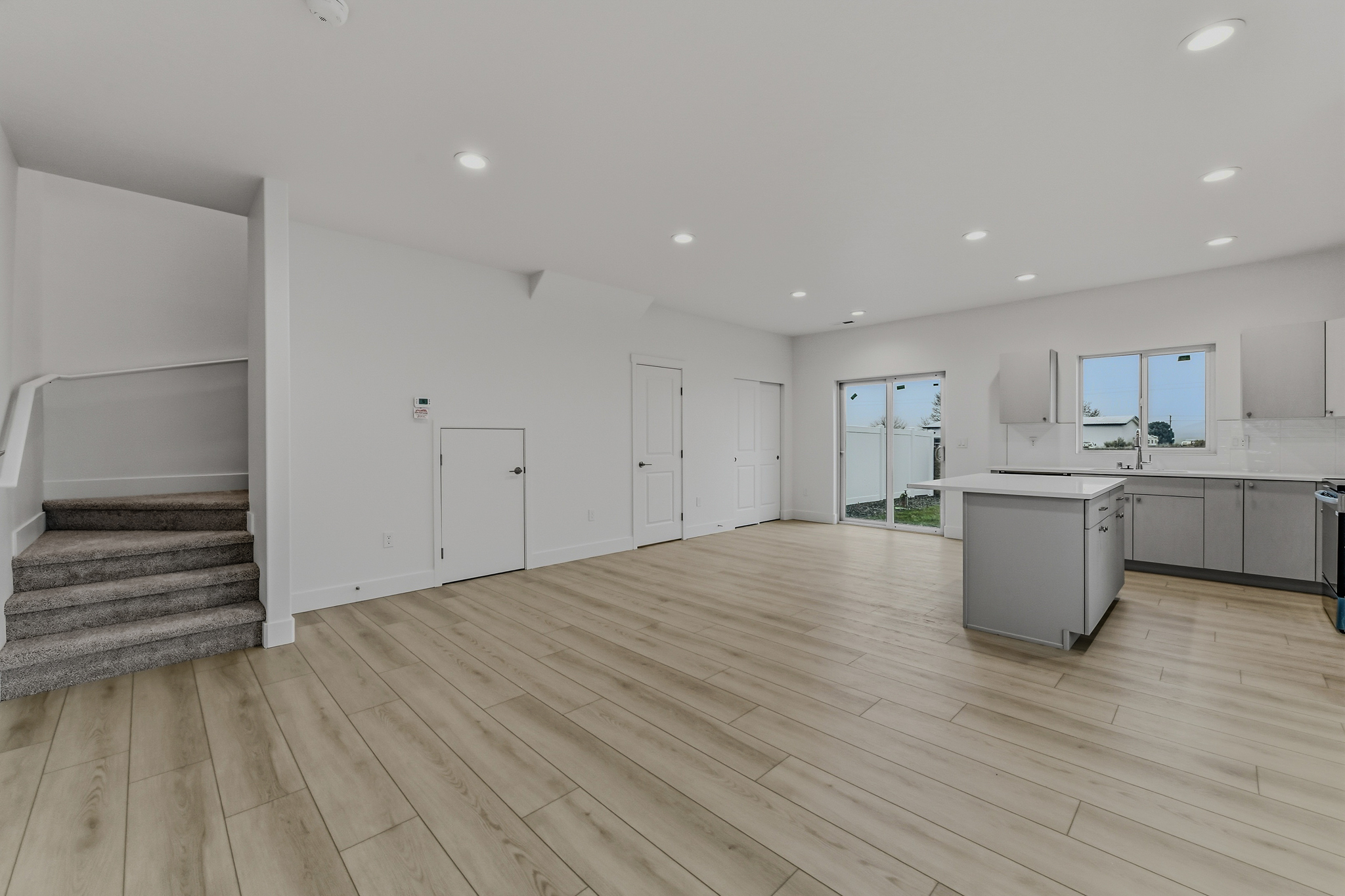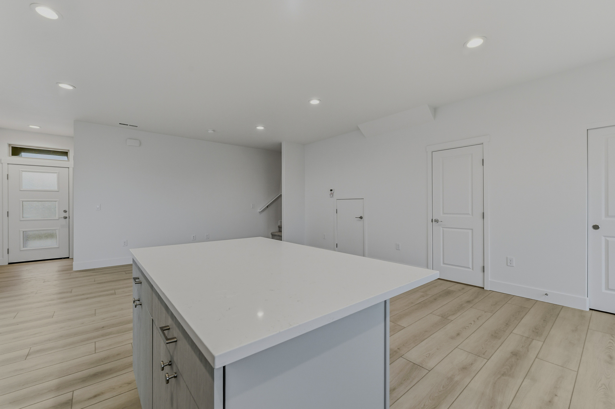 The 1193 townhouse plan offers an inviting open-concept design, where the kitchen seamlessly connects to the great room and dining area. Custom wooden shelving enhances the discreet pantry, adding style and functionality. Upstairs, the primary suite features a luxurious en-suite bathroom and a spacious closet. Two additional bedrooms share a well-appointed bathroom with a tub and shower combo, ensuring comfort for all. Every detail of this home is designed for effortless modern living.