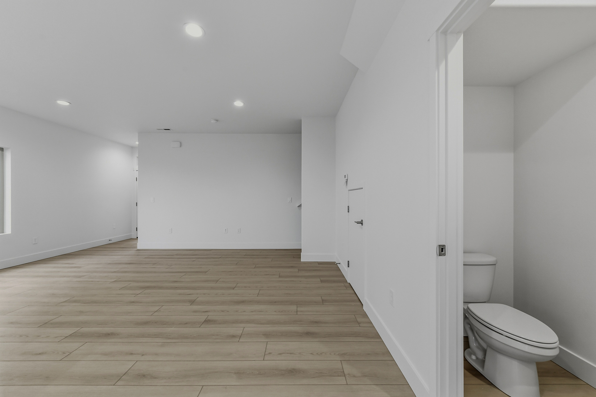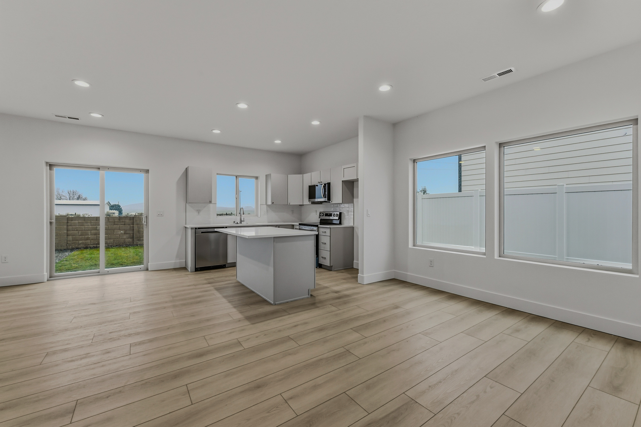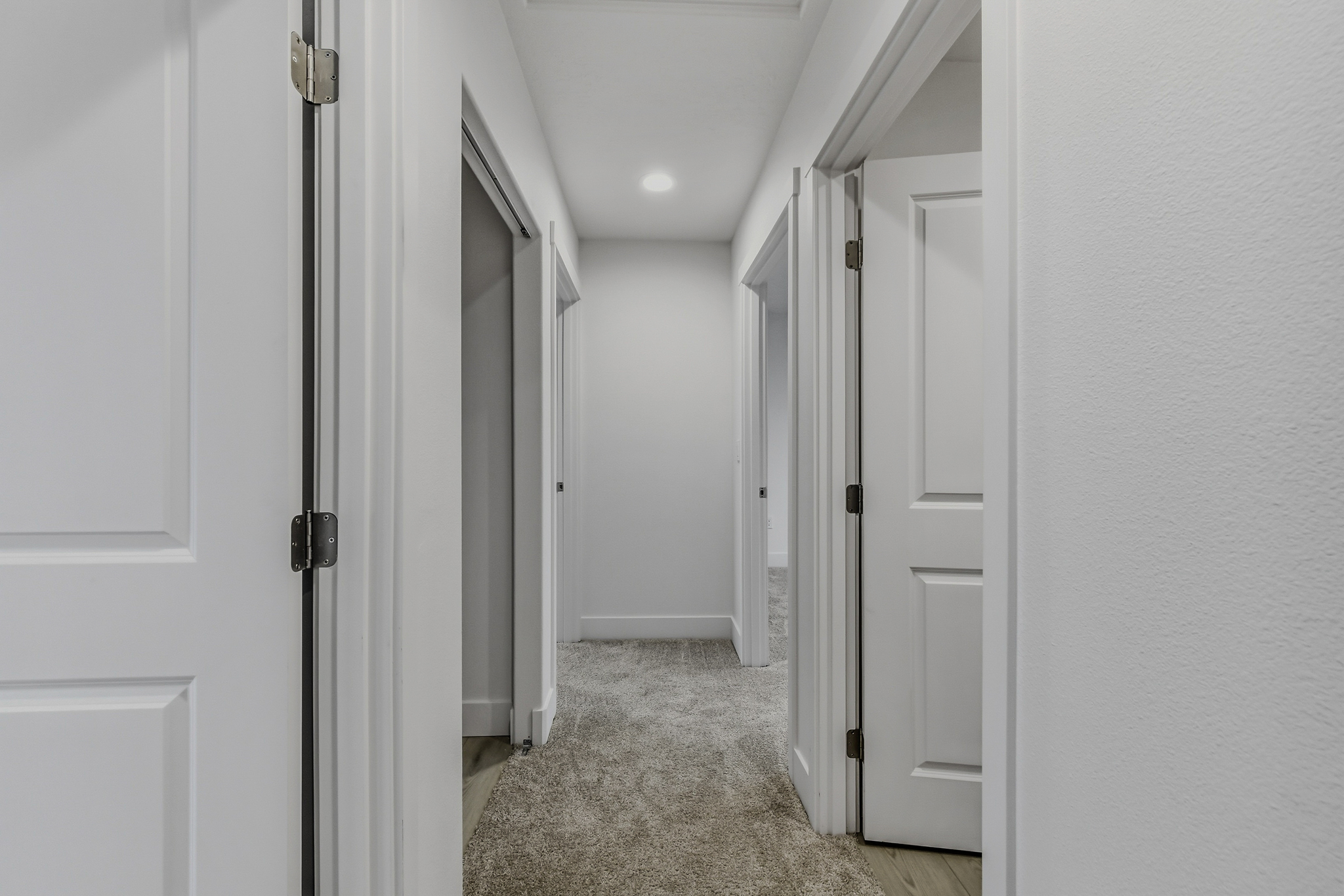 The 1193 townhouse plan offers an inviting open-concept design, where the kitchen seamlessly connects to the great room and dining area. Custom wooden shelving enhances the discreet pantry, adding style and functionality. Upstairs, the primary suite features a luxurious en-suite bathroom and a spacious closet. Two additional bedrooms share a well-appointed bathroom with a tub and shower combo, ensuring comfort for all. Every detail of this home is designed for effortless modern living.