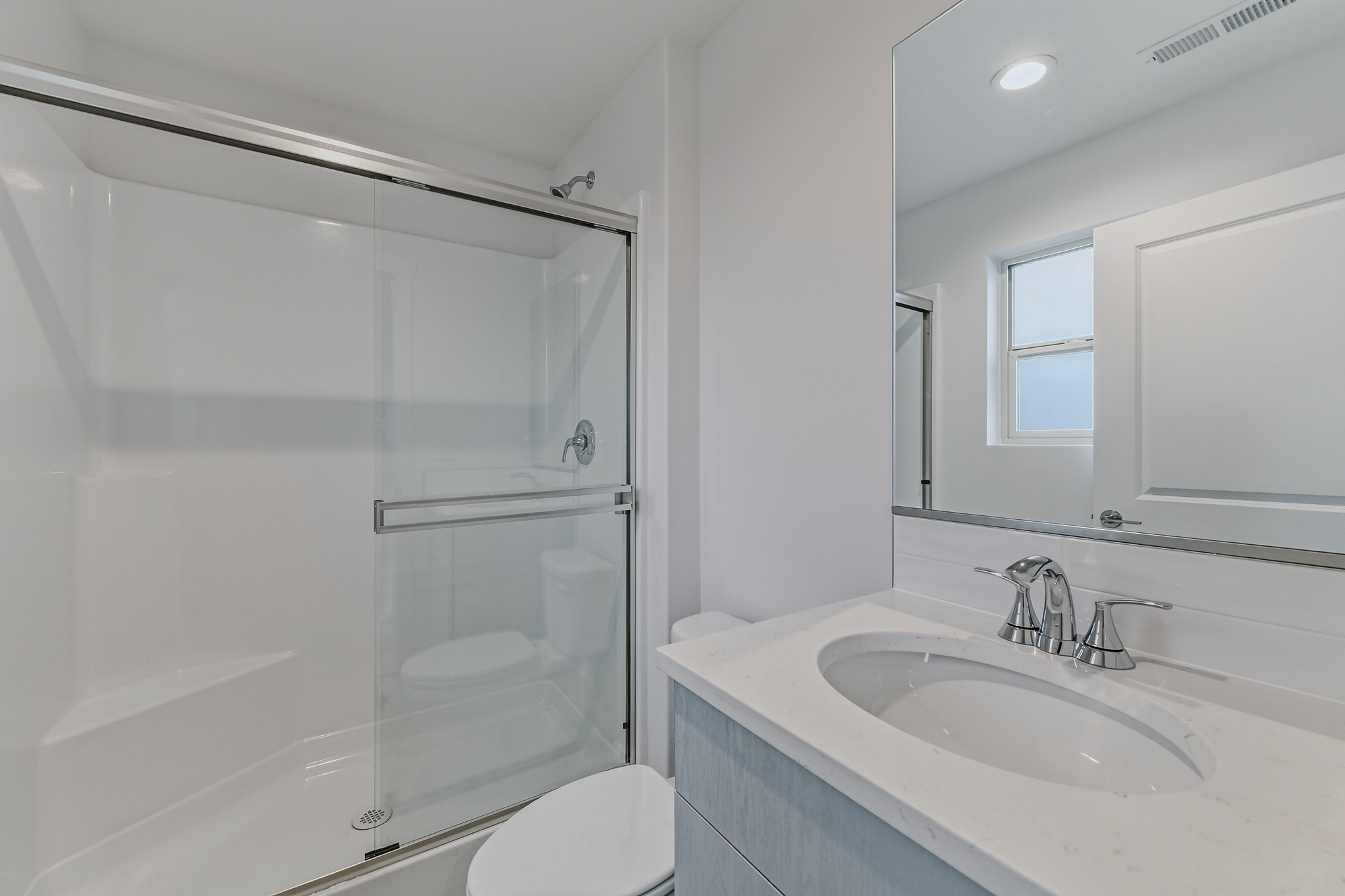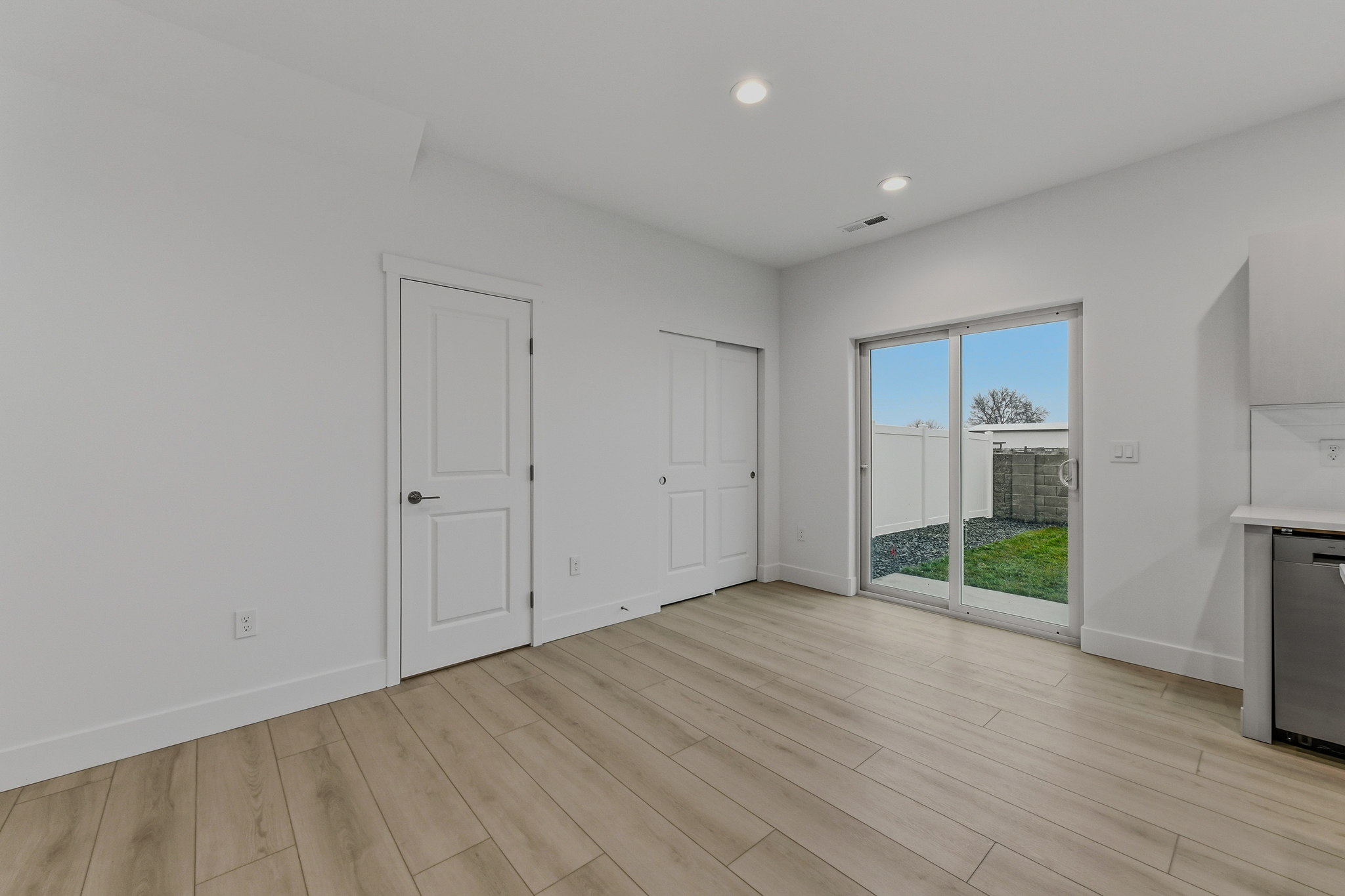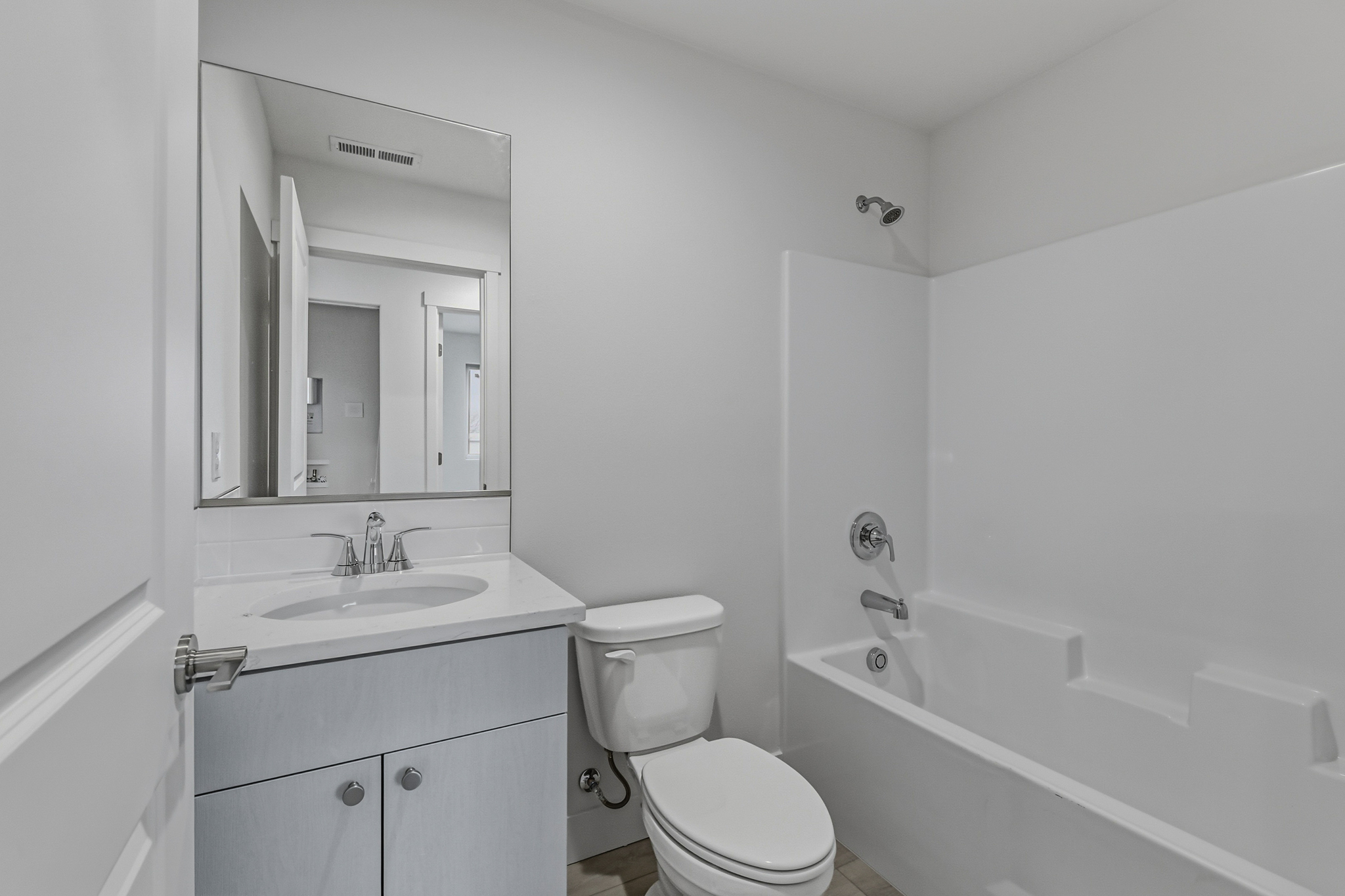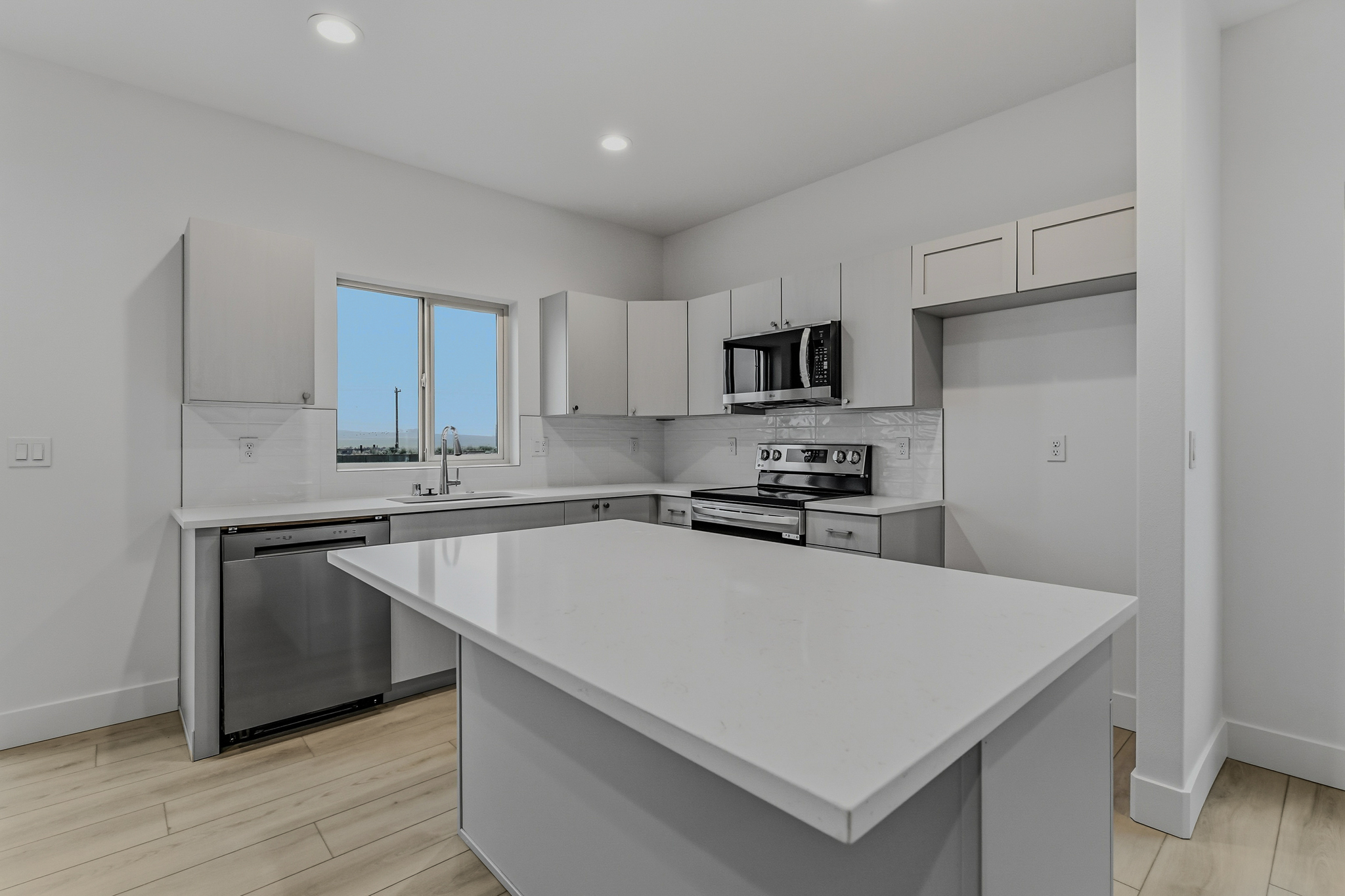 The 1193 townhouse plan offers an inviting open-concept design, where the kitchen seamlessly connects to the great room and dining area. Custom wooden shelving enhances the discreet pantry, adding style and functionality. Upstairs, the primary suite features a luxurious en-suite bathroom and a spacious closet. Two additional bedrooms share a well-appointed bathroom with a tub and shower combo, ensuring comfort for all. Every detail of this home is designed for effortless modern living.