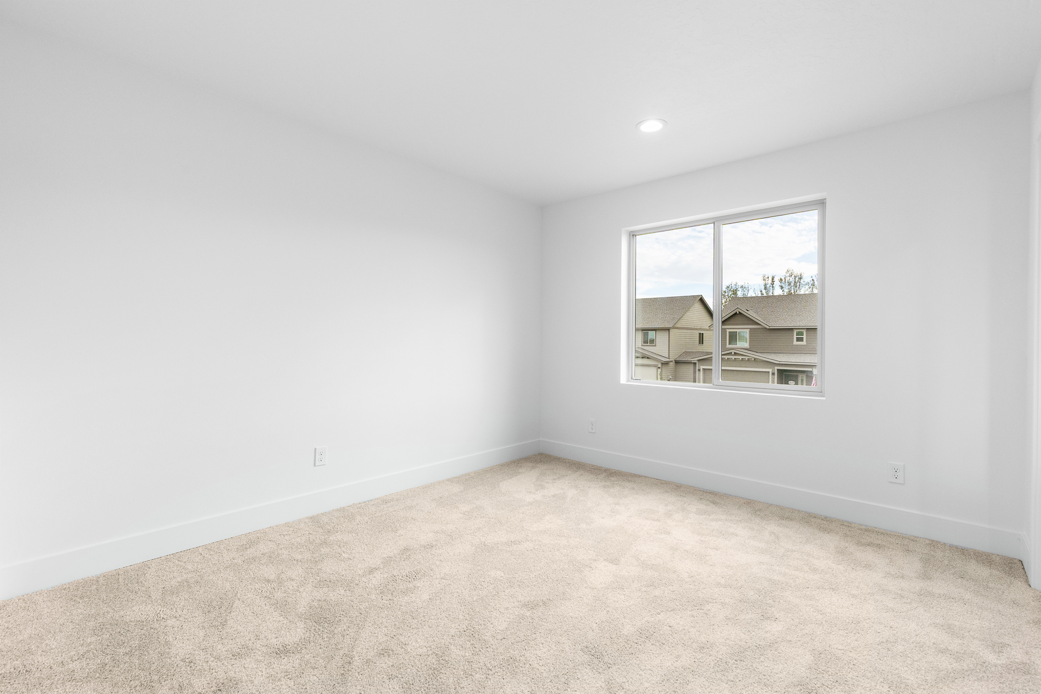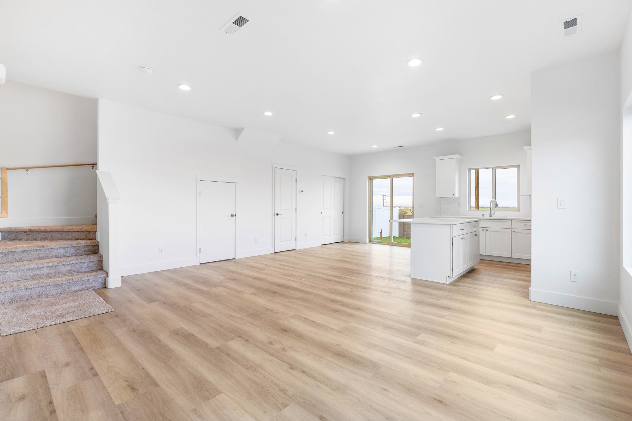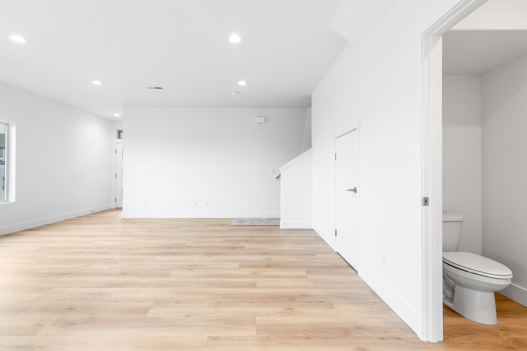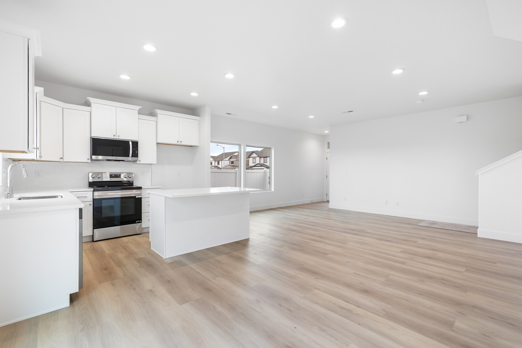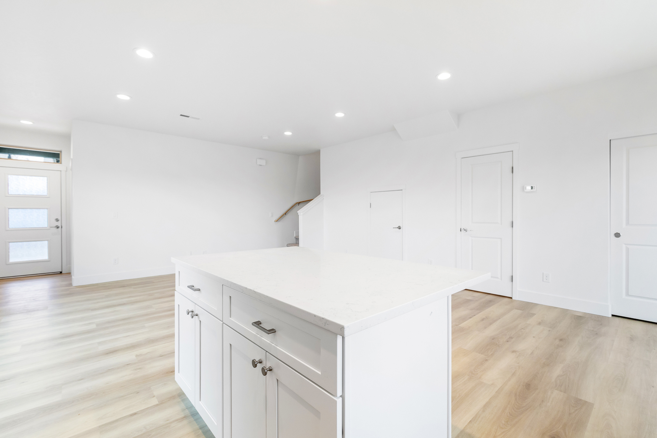 The 1193 townhouse plan offers an inviting open-concept design, where the kitchen seamlessly connects to the great room and dining area. Custom wooden shelving enhances the discreet pantry, adding style and functionality. Upstairs, the primary suite features a luxurious en-suite bathroom and a spacious closet. Two additional bedrooms share a well-appointed bathroom with a tub and shower combo, ensuring comfort for all. Every detail of this home is designed for effortless modern living.
