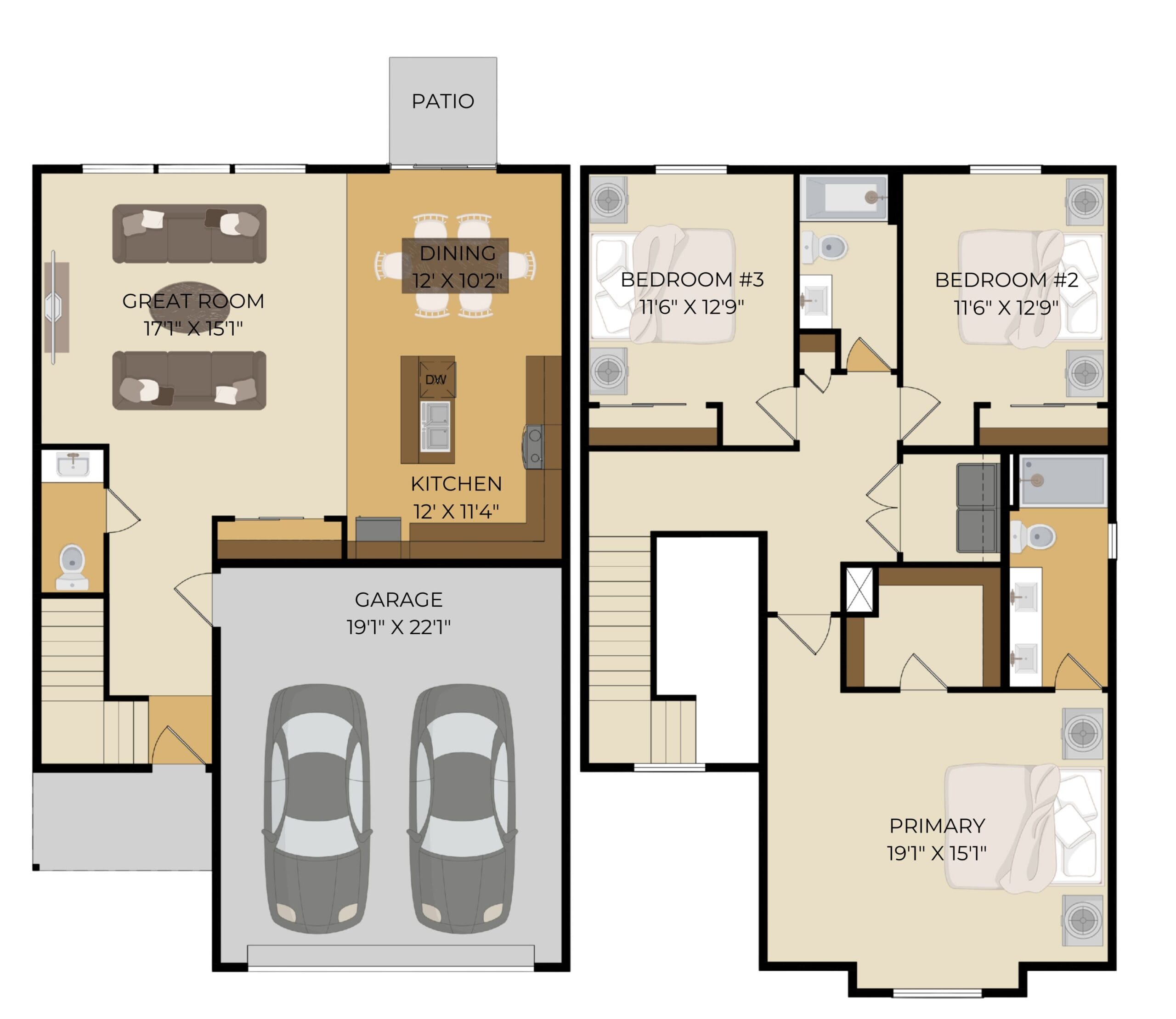 The 1926 floor plan offers a spacious and well-balanced design with an open main level that brings the great room, kitchen, and dining area together for easy everyday living. The kitchen features ample counter space, a central island, and direct access to the patio, making it ideal for both entertaining and casual meals.